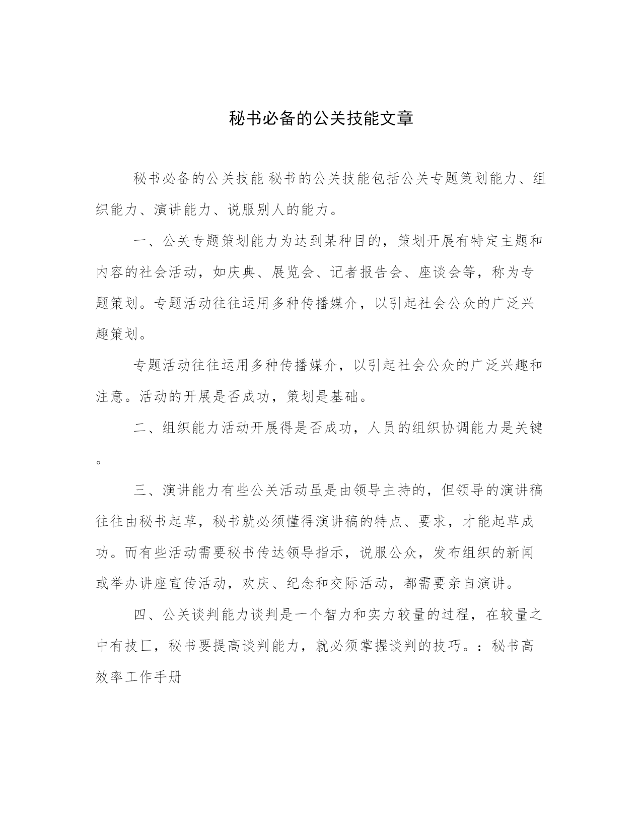 秘书必备的公关技能文章秘书必备的公关技能秘书的公关技能包括公关专题策划能力、组织能力、演讲能力、说服别人的能力。一、公关专题策划能力为达到某种目的,策划开展有特定主题和内容的社会活动,如庆典、展览会、记者报告会、座谈会等,称为专题策划。专题活动往往运用多种传播媒介,以引起社会公众的广泛兴趣策划。专题活动往往运用多种传播媒介,以引起社会公众的广泛兴趣和注意。活动的开展是否成功,策划是基础。二、组织能力活动开展得是否成功,人员的组织协调能力是关键。三、演讲能力有些公关活动虽是由领导主持的,但领导的演讲稿往往由秘书起草,秘书就必须懂得演讲稿的特点、要求,才能起草成功。而有些活动需要秘书传达领导指示,说服公众,发布组织的新闻或举办讲座宣传活动,欢庆、纪念和交际活动,都需要亲自演讲。四、公关谈判能力谈判是一个智力和实力较量的过程,在较量之中有技匚,秘书要提高谈判能力,就必须掌握谈判的技巧。:秘书高效率工作手册