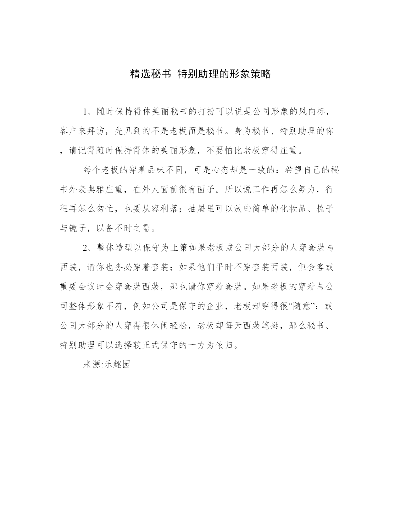 精选秘书特别助理的形象策略1、随时保持得体美丽秘书的打扮可以说是公司形象的风向标,客户来拜访,先见到的不是老板而是秘书。身为秘书、特别助理的你,请记得随时保持得体的美丽形象,不要怕比老板穿得庄重。每个老板的穿着品味不同,可是心态却是一致的:希望自己的秘书外表典雅庄重,在外人面前很有面子。所以说工作再怎么努力,行程再怎么匆忙,也要从容利落;抽屉里可以放些简单的化妆品、梳子与镜子,以备不时之需。2、整体造型以保守为上策如果老板或公司大部分的人穿套装与西装,请你也务必穿着套装;如果他们平时不穿套装西装,但会客或重要会议时会穿套装西装,那也请你穿着套装。如果老板的穿着与公司整体形象不符,例如公司是保守的企业,老板却穿得很“随意”;或公司大部分的人穿得很休闲轻松,老板却每天西装笔挺,那么秘书、特别助理可以选择较正式保守的一方为依归。来源:乐趣园