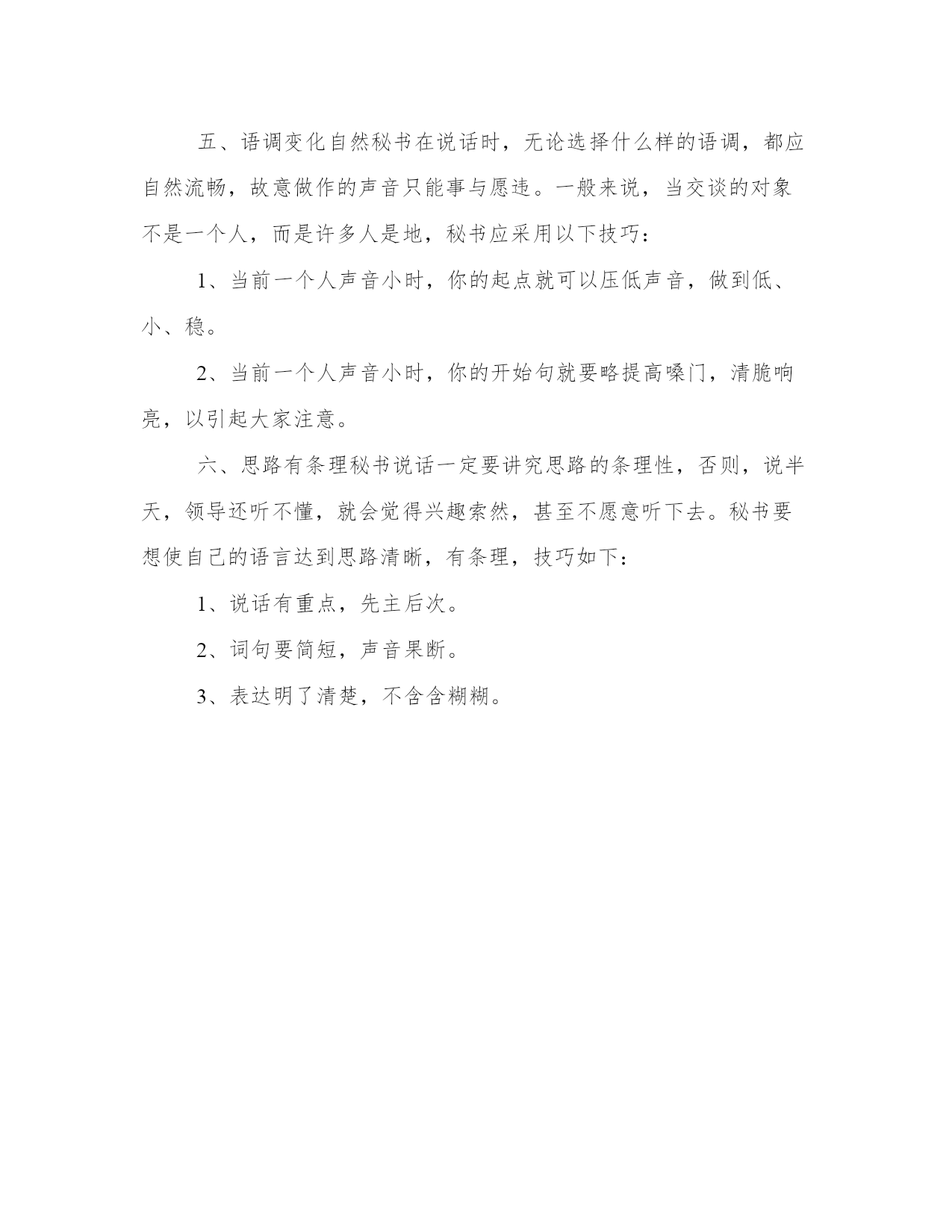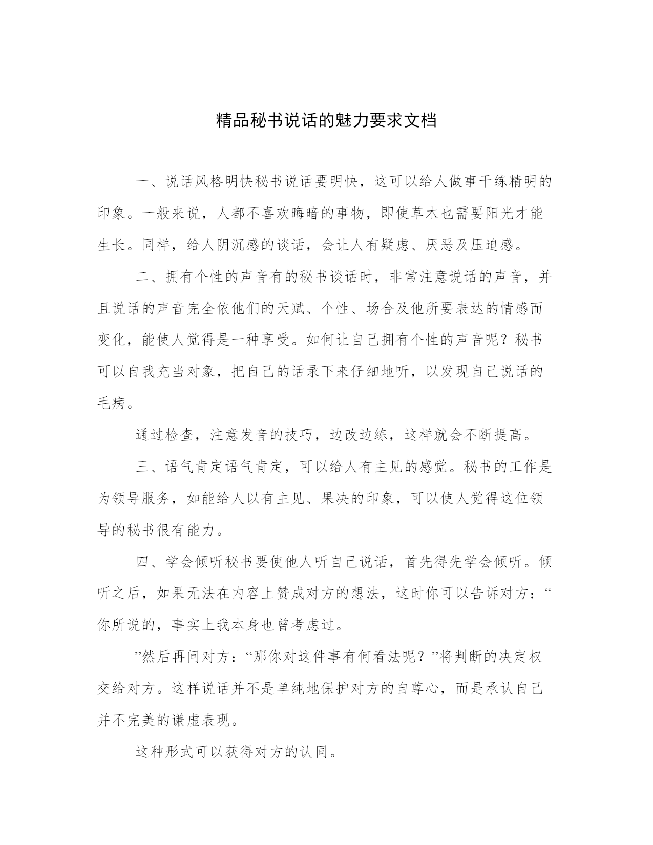 精品秘书说话的魅力要求文档一、说话风格明快秘书说话要明快,这可以给人做事干练精明的印象。一般来说,人都不喜欢晦暗的事物,即使草木也需要阳光才能生长。同样,给人阴沉感的谈话,会让人有疑虑、厌恶及压迫感。二、拥有个性的声音有的秘书谈话时,非常注意说话的声音,并且说话的声音完全依他们的天赋、个性、场合及他所要表达的情感而变化,能使人觉得是一种享受。如何让自己拥有个性的声音呢?秘书可以自我充当对象,把自己的话录下来仔细地听,以发现自己说话的毛病。通过检查,注意发音的技巧,边改边练,这样就会不断提高。三、语气肯定语气肯定,可以给人有主见的感觉。秘书的工作是为领导服务,如能给人以有主见、果决的印象,可以使人觉得这位领导的秘书很有能力。四、学会倾听秘书要使他人听自己说话,首先得先学会倾听。倾听之后,如果无法在内容上赞成对方的想法,这时你可以告诉对方:“你所说的,事实上我本身也曾考虑过。”然后再问对方:“那你对这件事有何看法呢?”将判断的决定权交给对方。这样说话并不是单纯地保护对方的自尊心,而是承认自己并不完美的谦虚表现。这种形式可以获得对方的认同。五、语调变化自然秘书在说话时,无论选择什么样的语调,都应自然流畅,故意做作的声音只能事与愿违。一般来说,当交谈的对象不是一个人,而是许多人是地,秘书应采用以下技巧:1、当前一个人声音小时,你的起点就可以压低声音,做到低、小、稳。2、当前一个人声音小时,你的开始句就要略提高嗓门,清脆响亮,以引起大家注意。六、思路有条理秘书说话一定要讲究思路的条理性,否则,说半天,领导还听不懂,就会觉得兴趣索然,甚至不愿意听下去。秘书要想使自己的语言达到思路清晰,有条理,技巧如下:1、说话有重点,先主后次。2、词句要简短,声音果断。3、表达明了清楚,不含含糊糊。