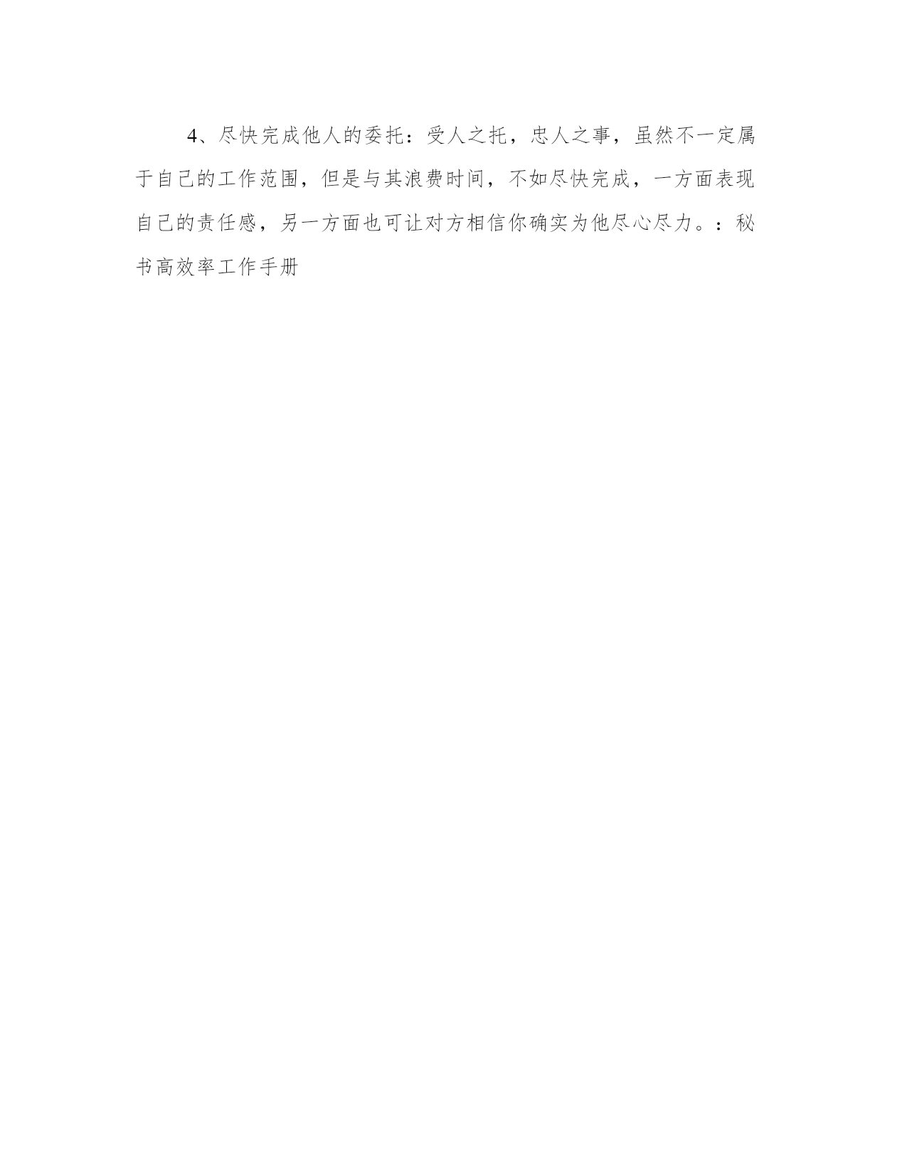 秘书如何安排工作2做为一名先进秘书,只要每次做好上级交代的各项工作,便算是完成任务,什么也不必多想,最重要的是谨守本份,逐一完成差事。可是到了第二年或第三年,就再也无法如昆轻松。不但责任范围扩大,工作累积繁杂,往往第天加班还不见得能够做完工作,结果不是事情没有办法,便是错误不断。既然如此,怎样才使工作顺利进行呢?答案很简单,从一开始便做到计划的调配,即有条不紊的安排一切,以便循序渐进的完成工作。1、掌握工作的整体情况:若是忽略了这一点,而错把目光集中于特定细节,会忽略真正重要的部分。惟有对工作有通盘的了解,才能进行有效率的规划。2、善于借助他人的力量:这里指的是他人,包括后辈、资深同事和上司等,借助他人的力量运用在工作上。为了便于得到他人的帮助,平时待人处世的态度非常重要。若能建立良好的人际关系,广结人缘,那么办起事来自然方便许多。3、了解自己的实力:譬如准备熬夜是否能完成工作,需要多少睡眠才能恢复精神等等,知道自己的能力极限,方可有效地建立工作进度表。4、尽快完成他人的委托:受人之托,忠人之事,虽然不一定属于自己的工作范围,但是与其浪费时间,不如尽快完成,一方面表现自己的责任感,另一方面也可让对方相信你确实为他尽心尽力。:秘书高效率工作手册