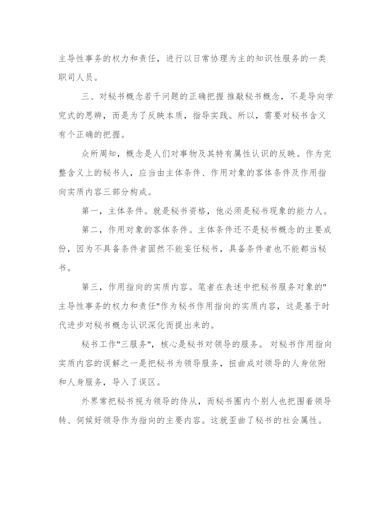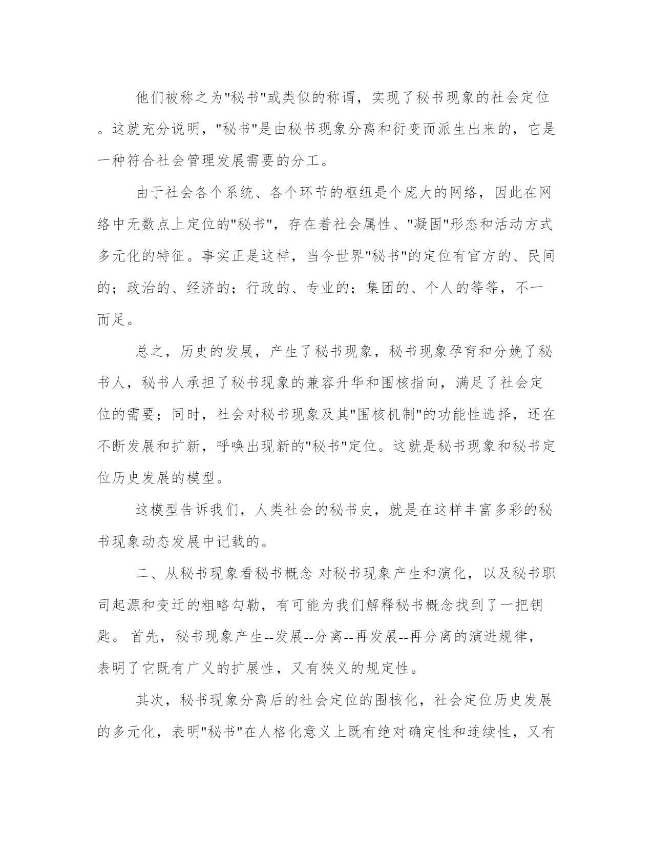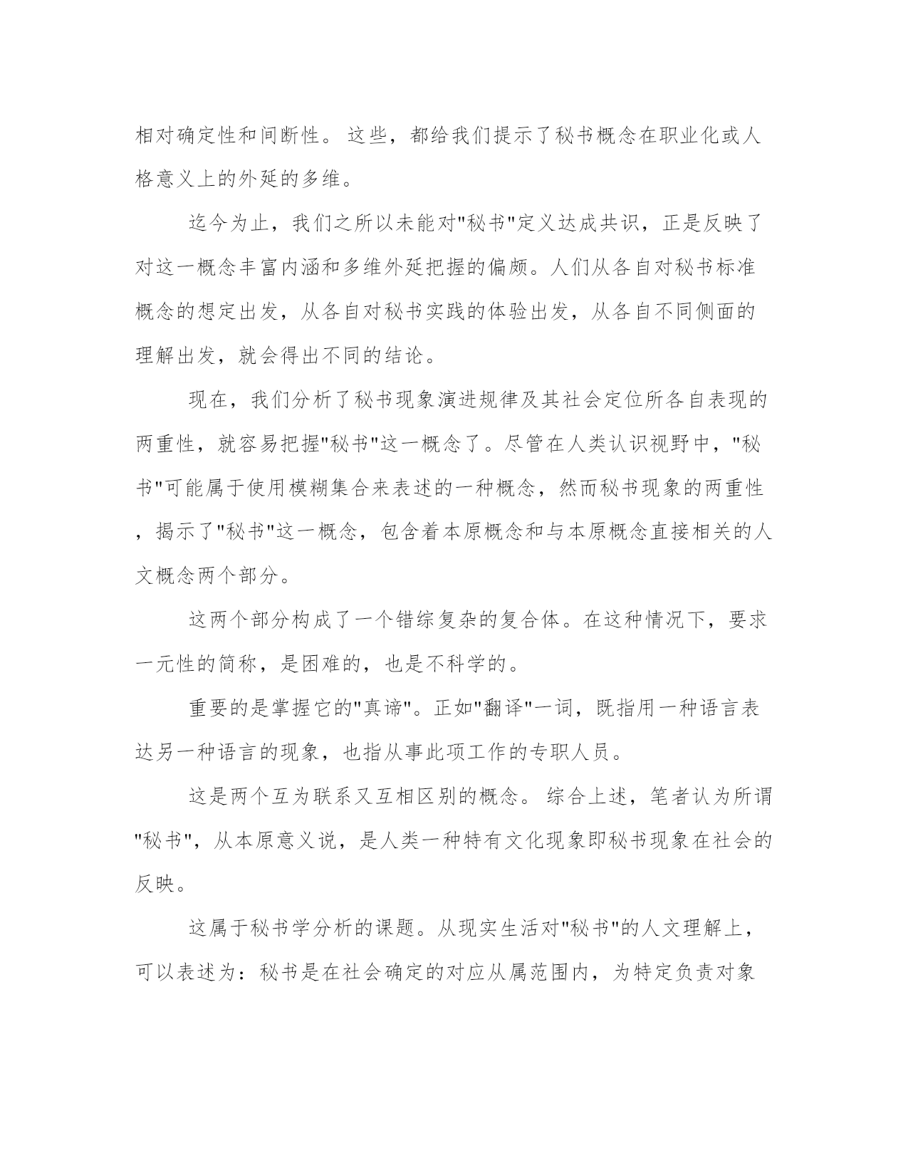优选秘书现象与秘书概念例文一、秘书现象和秘书现象的社会定位秘书和秘书工作,作为客观存在的社会事物和社会现象,是历史发展的必然产物。秘书学的分析,不应从历史上什么时候出现秘书职务开始,而应当从为什么会出现"秘书"这一本原开始。文字的产生和发展,从五千多年前用兽骨占卜问神,到商朝甲骨卜问后刻写卜辞,体现了人在为权力服务中总结文字经验和发挥文字作用的本领,以文字为工具的社会服务随之寻偶。向当事人释解占卜凶吉,记录生产技术,记载个人秘密,提出某种建议,充当传递信使等秘书现象不断出现。这些现象的抽象,就是孕育"秘书"含义的本原。秘书现象的应用价值,首先被氏族公社末期的贵族统治者所认识。他们对秘书现象进行了政治性和归属性的改造。随着社会的发展,这种"围核机制"被模拟和扩散。表现为"核"的模拟和"围"的扩散。这样,在我们的脑海中浮现了一幅图景。在社会前进的脚步中,以"围核机制"为特征的秘书现象不断地以一定的存在形态被凝固在社会各个系统、各个环节的枢纽之中。凝固点上的人就成为秘书现象的人格化身,成为"秘书人"。他们被称之为"秘书"或类似的称谓,实现了秘书现象的社会定位。这就充分说明,"秘书"是由秘书现象分离和衍变而派生出来的,它是一种符合社会管理发展需要的分工。由于社会各个系统、各个环节的枢纽是个庞大的网络,因此在网络中无数点上定位的"秘书",存在着社会属性、"凝固"形态和活动方式多元化的特征。事实正是这样,当今世界"秘书"的定位有官方的、民间的;政治的、经济的;行政的、专业的;集团的、个人的等等,不一而足。总之,历史的发展,产生了秘书现象,秘书现象孕育和分娩了秘书人,秘书人承担了秘书现象的兼容升华和围核指向,满足了社会定位的需要;同时,社会对秘书现象及其"围核机制"的功能性选择,还在不断发展和扩新,呼唤出现新的"秘书"定位。这就是秘书现象和秘书定位历史发展的模型。这模型告诉我们,人类社会的秘书史,就是在这样丰富多彩的秘书现象动态发展中记载的。二、从秘书现象看秘书概念对秘书现象产生和演化,以及秘书职司起源和变迁的粗略勾勒,有可能为我们解释秘书概念找到了一把钥匙。首先,秘书现象产生--发展--分离--再发展--再分离的演进规律,表明了它既有广义的扩展性,又有狭义的规定性。其次,秘书现象分离后的社会定位的围核化,社会定位历史发展的多元化,表明"秘书"在人格化意义上既有绝对确定性和连续性,又有相对确定性和间断性。这些,都给我们提示了秘书概念在职业化或人格意义上的外延的多维。迄今为止,我们之所以未能对"秘书"定义达成共识,正是反映了对这一概念丰富内涵和多维外延把握的偏颇。人们从各自对秘书标准概念的想定出发,从各自对秘书实践的体验出发,从各自不同侧面的理解出发,就会得出不同的结论。现在,我们分析了秘书现象演进规律及其社会定位所各自表现的两重性,就容易把握"秘书"这一概念了。尽管在人类认识视野中,"秘书"可能属于使用模糊集合来表述的一种概念,然而秘书现象的两重性,揭示了"秘书"这一概念,包含着本原概念和与本原概念直接相关的人文概念两个部分。这两个部分构成了一个错综复杂的复合体。在这种情况下,要求一元性的简称,是困难的,也是不科学的。重要的是掌握它的"真谛"。正如"翻译"一词,既指用一种语言表达另一种语言的现象,也指从事此项工作的专职人员。这是两个互为联系又互相区别的概念。综合上述,笔者认为所谓"秘书",从本原意义说,是人类一种特有文化现象即秘书现象在社会的反映。这属于秘书学分析的课题。从现实生活对"秘书"的人文理解上,可以表述为:秘书是在社会确定的对应从属范围内,为特定负责对象主导性事务的权力和责任,进行以日常协理为主的知识性服务的一类职司人员。三、对秘书概念若干问题的正确把握推敲秘书概念,不是导向学究式的思辨,而是为了反映本质,指导实践。所以,需要对秘书含义有个正确的把握。众所周知,概念是人们对事物及其特有属性认识的反映。作为完整含义上的秘书人,应当由主体条件、作用对象的客体条件及作用指向实质内容三部分构成。第一,主体条件。就是秘书资格,他必须是秘书现象的能力人。第二,作用对象的客体条件。主体条件还不是秘书概念的主要成份,因为不具备条件者固然不能妄任秘书,具备条件者也不能都当秘书。第三,作用指向的实质内容。笔者在表述中把秘书服务对象的"主导性事务的权力和责任"作为秘书作用指向的实质内容,这是基于时代进步对秘书概念认识深化而提出来的。秘书工作"三服务",核心是秘书对领导的服务。对秘书作用指向实质内容的误解之一是把秘书为领导服务,扭曲成对领导的人身依附和人身服务,导入了误区。外界常把秘书视为领导的侍从,而秘书圈内个别人也把围着领导转、伺候好领导作为指向的主要内容。这就歪曲了秘书的社会属性。对秘书作用指向实质内容的误解之二是把秘书为领导服务只理解为权力运行意
