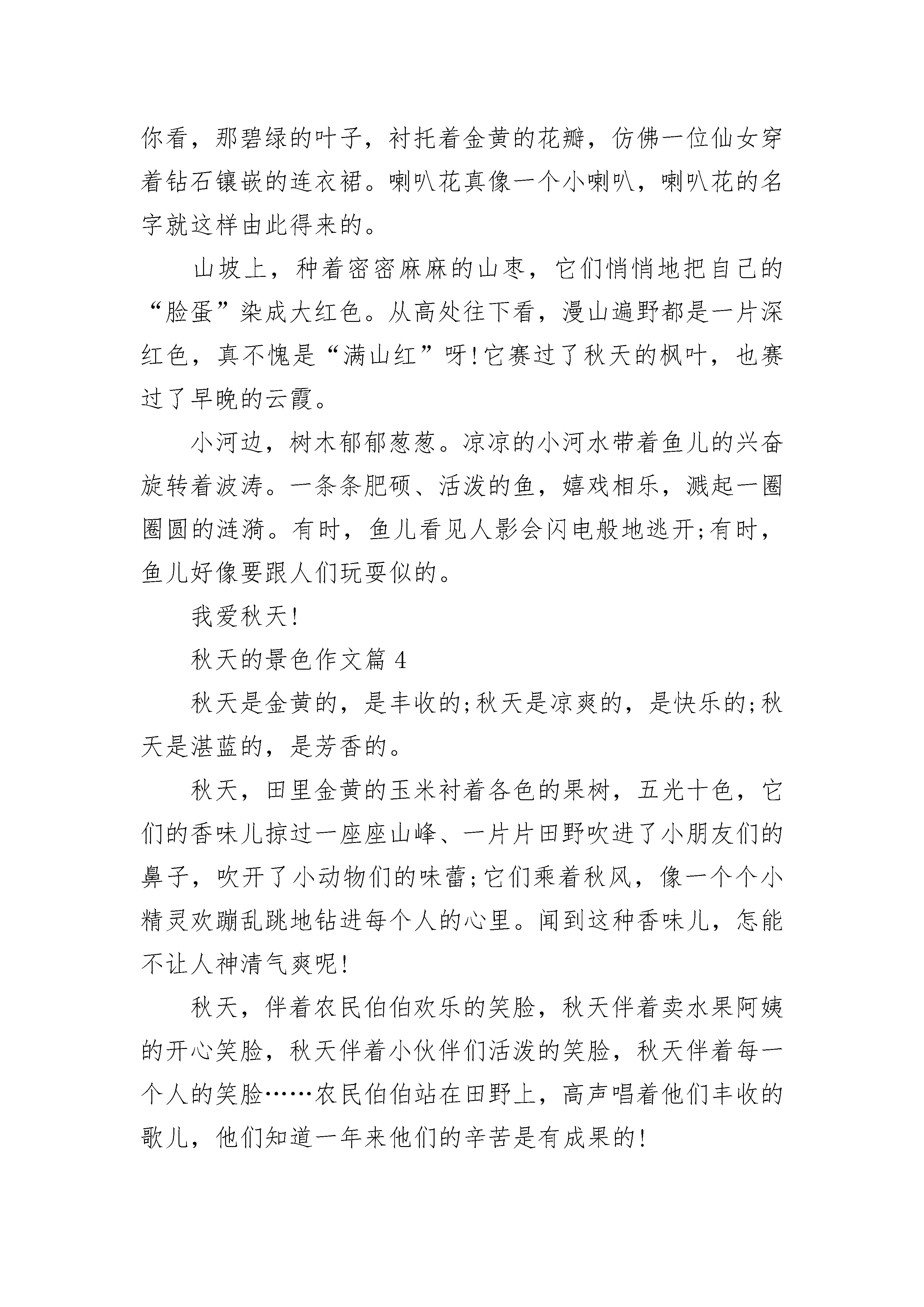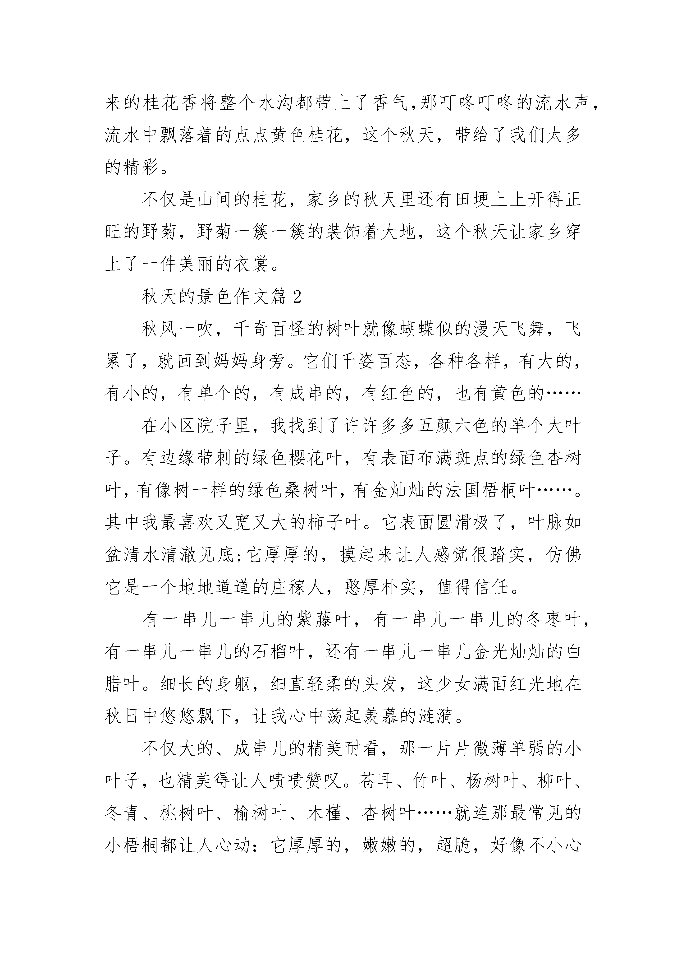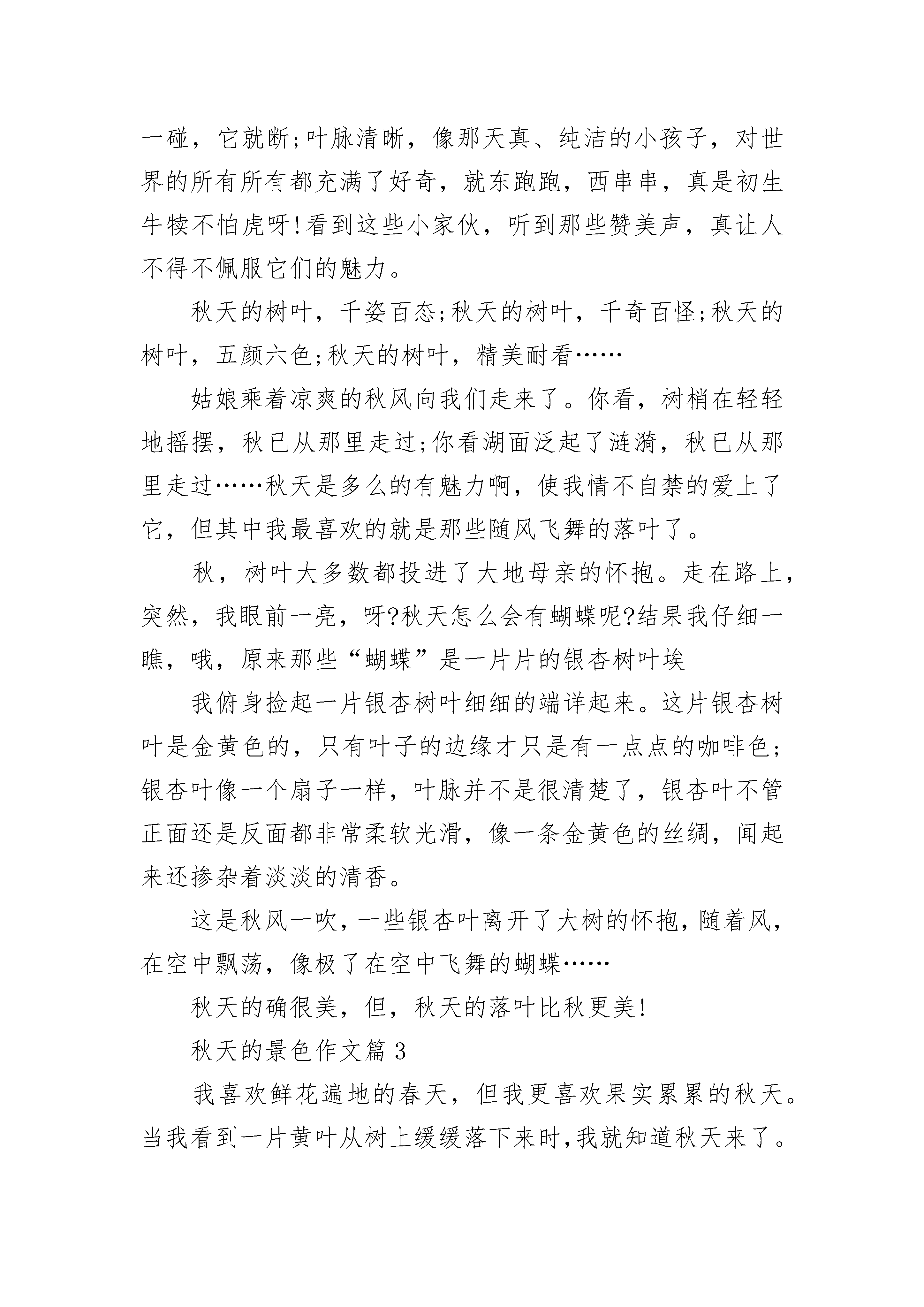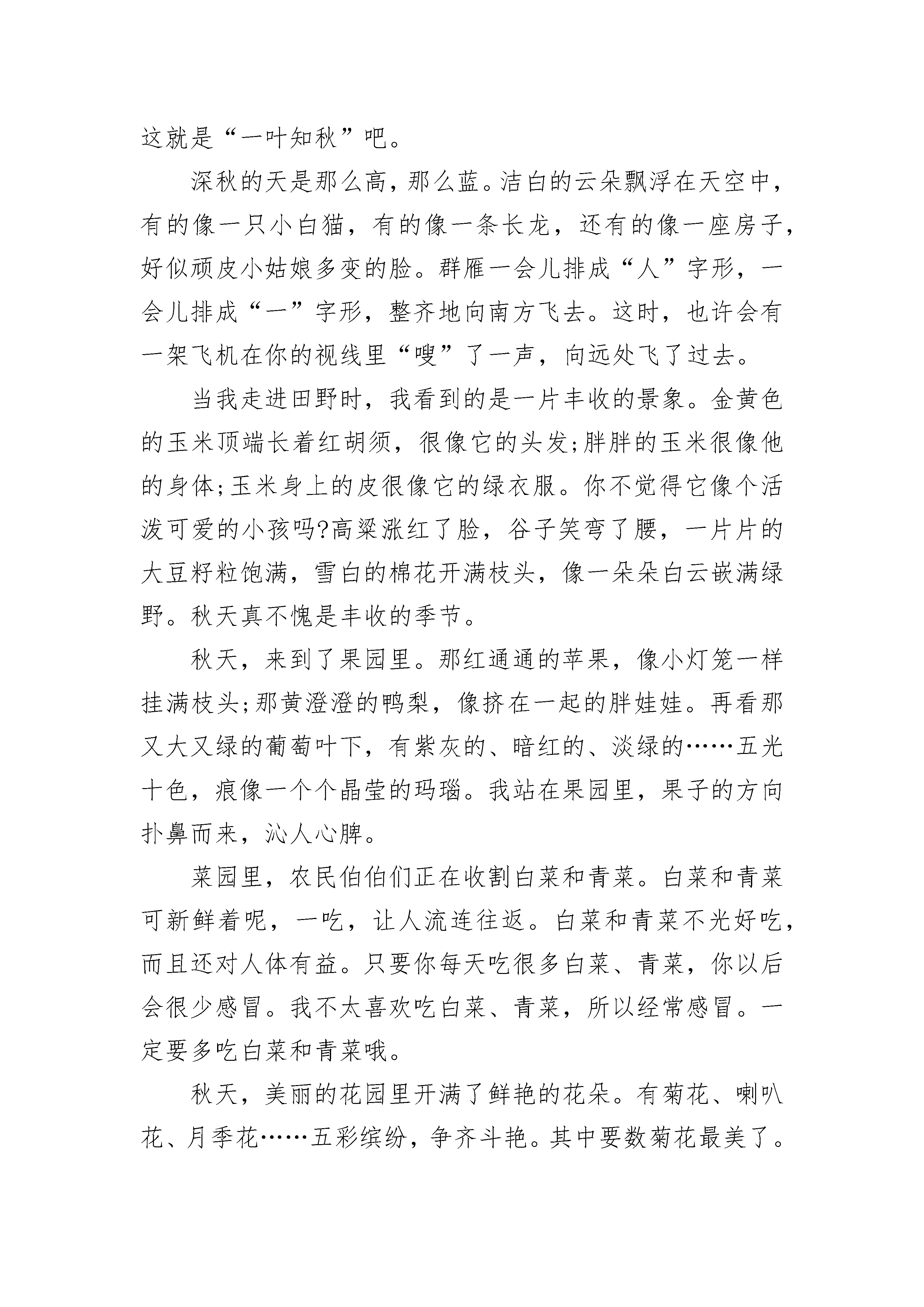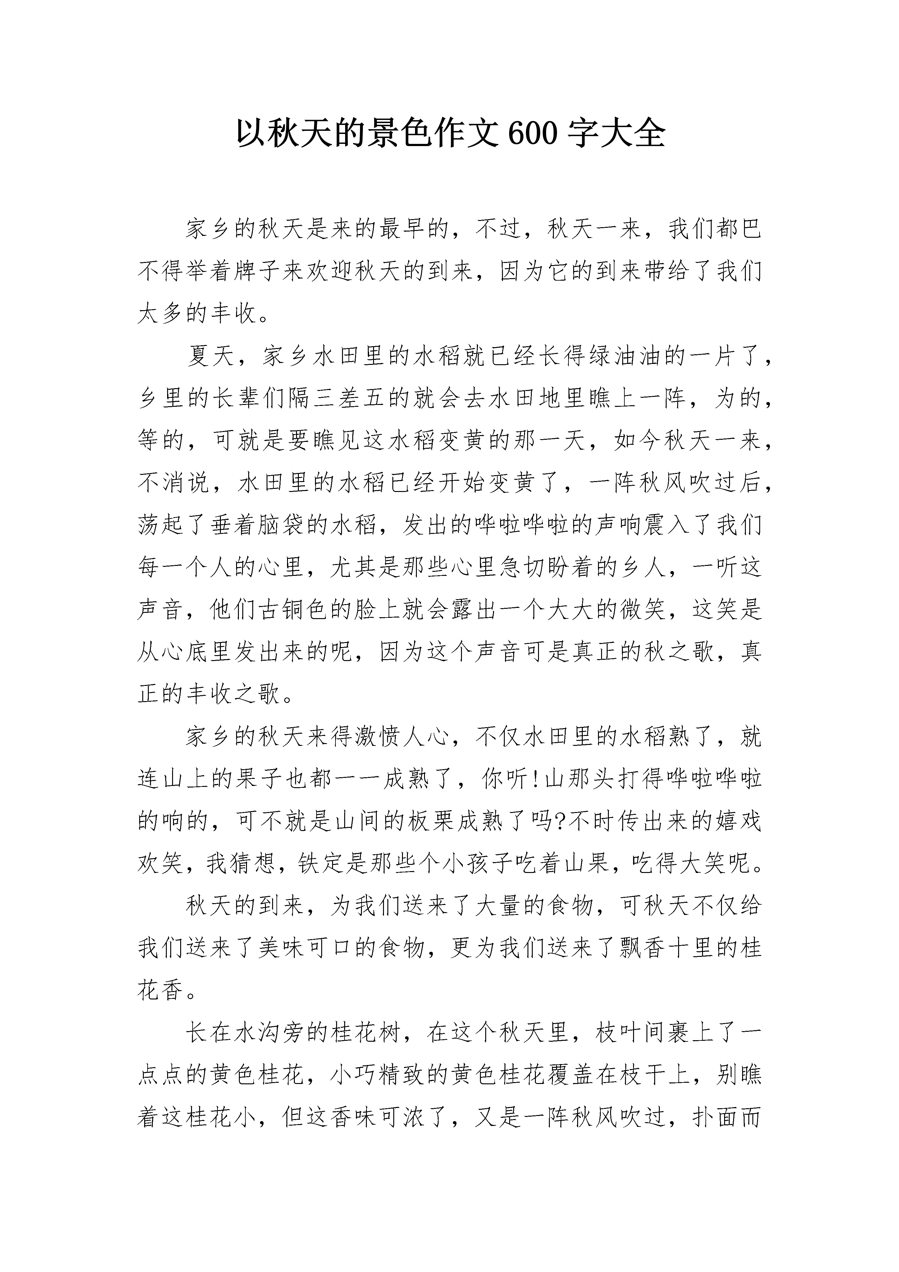 以秋天的景色作文600字大全家乡的秋天是来的最早的,不过,秋天一来,我们都巴不得举着牌子来欢迎秋天的到来,因为它的到来带给了我们太多的丰收。夏天,家乡水田里的水稻就已经长得绿油油的一片了,乡里的长辈们隔三差五的就会去水田地里瞧上一阵,为的,等的,可就是要瞧见这水稻变黄的那一天,如今秋天一来,不消说,水田里的水稻已经开始变黄了,一阵秋风吹过后,荡起了垂着脑袋的水稻,发出的哗啦哗啦的声响震入了我们每一个人的心里,尤其是那些心里急切盼着的乡人,一听这声音,他们古铜色的脸上就会露出一个大大的微笑,这笑是从心底里发出来的呢,因为这个声音可是真正的秋之歌,真正的丰收之歌。家乡的秋天来得激愤人心,不仅水田里的水稻熟了,就连山上的果子也都一一成熟了,你听!山那头打得哗啦哗啦的响的,可不就是山间的板栗成熟了吗?不时传出来的嬉戏欢笑,我猜想,铁定是那些个小孩子吃着山果,吃得大笑呢。秋天的到来,为我们送来了大量的食物,可秋天不仅给我们送来了美味可口的食物,更为我们送来了飘香十里的桂花香。长在水沟旁的桂花树,在这个秋天里,枝叶间裹上了一点点的黄色桂花,小巧精致的黄色桂花覆盖在枝干上,别瞧着这桂花小,但这香味可浓了,又是一阵秋风吹过,扑面而来的桂花香将整个水沟都带上了香气,那叮咚叮咚的流水声,流水中飘落着的点点黄色桂花,这个秋天,带给了我们太多的精彩。不仅是山间的桂花,家乡的秋天里还有田埂上上开得正旺的野菊,野菊一簇一簇的装饰着大地,这个秋天让家乡穿上了一件美丽的衣裳。秋天的景色作文篇2秋风一吹,千奇百怪的树叶就像蝴蝶似的漫天飞舞,飞累了,就回到妈妈身旁。它们千姿百态,各种各样,有大的,有小的,有单个的,有成串的,有红色的,也有黄色的……在小区院子里,我找到了许许多多五颜六色的单个大叶子。有边缘带刺的绿色樱花叶,有表面布满斑点的绿色杏树叶,有像树一样的绿色桑树叶,有金灿灿的法国梧桐叶……。其中我最喜欢又宽又大的柿子叶。它表面圆滑极了,叶脉如盆清水清澈见底;它厚厚的,摸起来让人感觉很踏实,仿佛它是一个地地道道的庄稼人,憨厚朴实,值得信任。有一串儿一串儿的紫藤叶,有一串儿一串儿的冬枣叶,有一串儿一串儿的石榴叶,还有一串儿一串儿金光灿灿的白腊叶。细长的身躯,细直轻柔的头发,这少女满面红光地在秋日中悠悠飘下,让我心中荡起羡慕的涟漪。不仅大的、成串儿的精美耐看,那一片片微薄单弱的小叶子,也精美得让人啧啧赞叹。苍耳、竹叶、杨树叶、柳叶、冬青、桃树叶、榆树叶、木槿、杏树叶……就连那最常见的小梧桐都让人心动:它厚厚的,嫩嫩的,超脆,好像不小心一碰,它就断;叶脉清晰,像那天真、纯洁的小孩子,对世界的所有所有都充满了好奇,就东跑跑,西串串,真是初生牛犊不怕虎呀!看到这些小家伙,听到那些赞美声,真让人不得不佩服它们的魅力。秋天的树叶,千姿百态;秋天的树叶,千奇百怪;秋天的树叶,五颜六色;秋天的树叶,精美耐看……姑娘乘着凉爽的秋风向我们走来了。你看,树梢在轻轻地摇摆,秋已从那里走过;你看湖面泛起了涟漪,秋已从那里走过……秋天是多么的有魅力啊,使我情不自禁的爱上了它,但其中我最喜欢的就是那些随风飞舞的落叶了。秋,树叶大多数都投进了大地母亲的怀抱。走在路上,突然,我眼前一亮,呀?秋天怎么会有蝴蝶呢?结果我仔细一瞧,哦,原来那些“蝴蝶”是一片片的银杏树叶埃我俯身捡起一片银杏树叶细细的端详起来。这片银杏树叶是金黄色的,只有叶子的边缘才只是有一点点的咖啡色;银杏叶像一个扇子一样,叶脉并不是很清楚了,银杏叶不管正面还是反面都非常柔软光滑,像一条金黄色的丝绸,闻起来还掺杂着淡淡的清香。这是秋风一吹,一些银杏叶离开了大树的怀抱,随着风,在空中飘荡,像极了在空中飞舞的蝴蝶……秋天的确很美,但,秋天的落叶比秋更美!秋天的景色作文篇3我喜欢鲜花遍地的春天,但我更喜欢果实累累的秋天。当我看到一片黄叶从树上缓缓落下来时,我就知道秋天来了。这就是“一叶知秋”吧。深秋的天是那么高,那么蓝。洁白的云朵飘浮在天空中,有的像一只小白猫,有的像一条长龙,还有的像一座房子,好似顽皮小姑娘多变的脸。群雁一会儿排成“人”字形,一会儿排成“一”字形,整齐地向南方飞去。这时,也许会有一架飞机在你的视线里“嗖”了一声,向远处飞了过去。当我走进田野时,我看到的是一片丰收的景象。金黄色的玉米顶端长着红胡须,很像它的头发;胖胖的玉米很像他的身体;玉米身上的皮很像它的绿衣服。你不觉得它像个活泼可爱的小孩吗?高粱涨红了脸,谷子笑弯了腰,一片片的大豆籽粒饱满,雪白的棉花开满枝头,像一朵朵白云嵌满绿野。秋天真不愧是丰收的季节。秋天,来到了果园里。那红通通的苹果,像小灯笼一样挂满枝头;那黄澄澄的鸭梨,像挤在一起的胖娃娃。再看那又大又绿的葡萄叶下,有紫灰的、暗红的、淡绿的……五光十色,痕像一个个晶莹的玛瑙。我站在果园里,果子的方向扑鼻而来