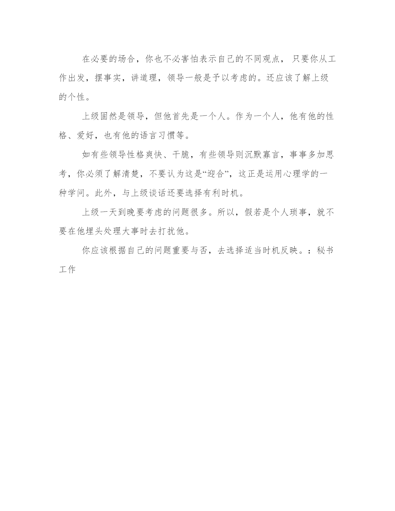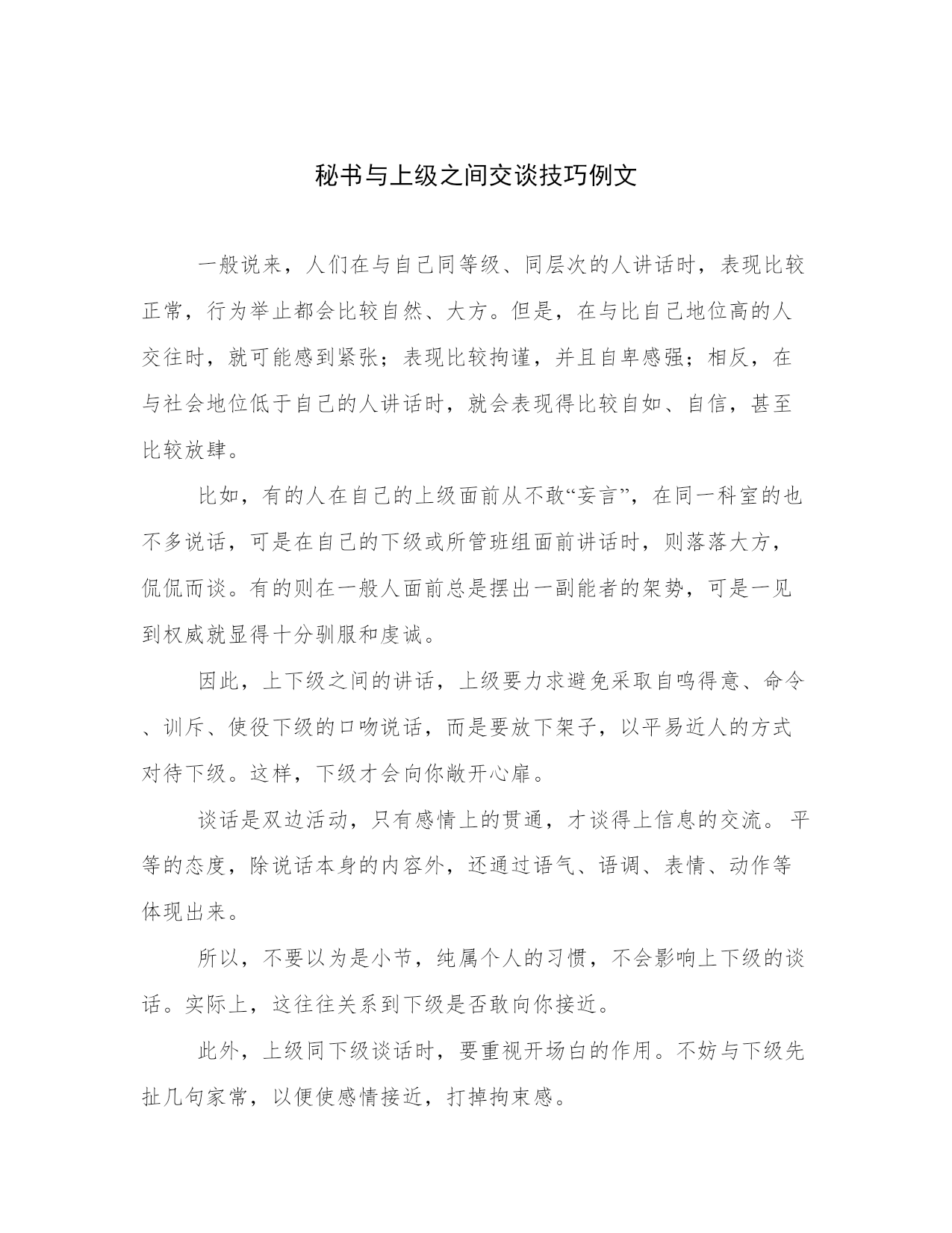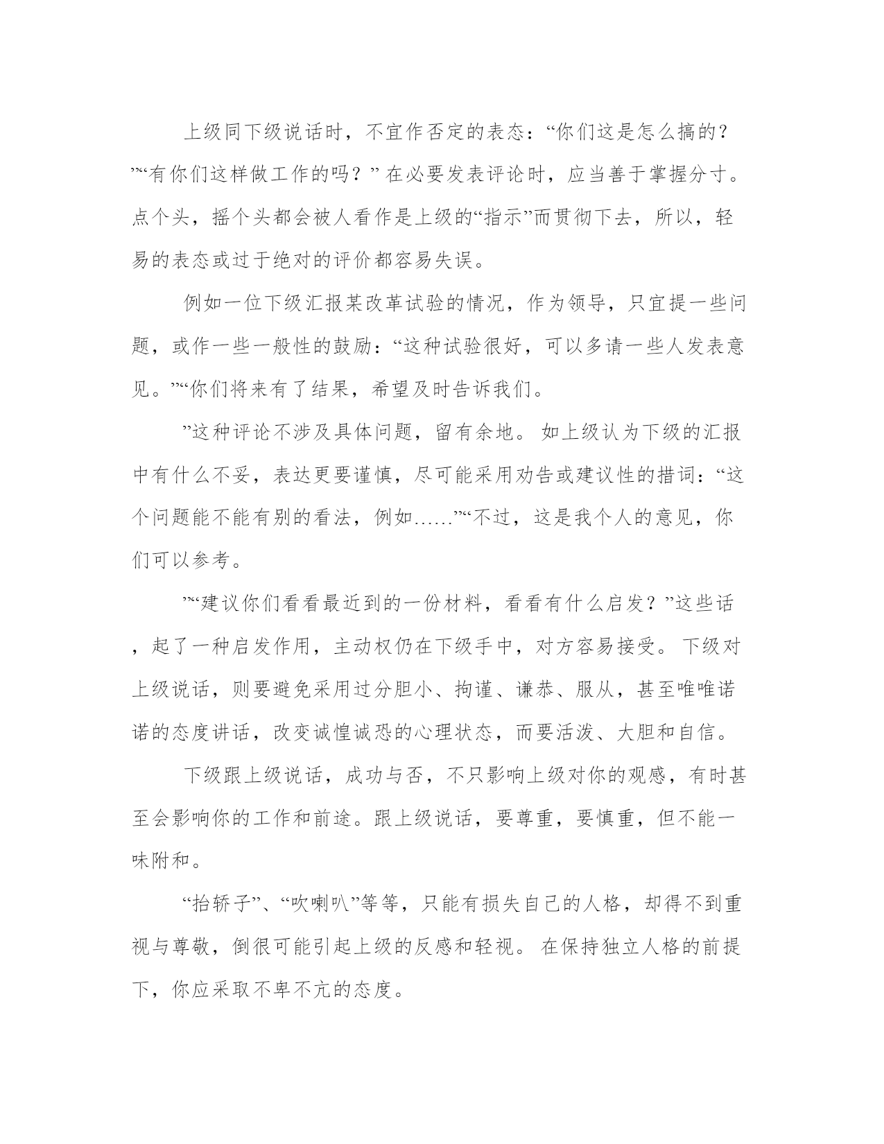 秘书与上级之间交谈技巧例文一般说来,人们在与自己同等级、同层次的人讲话时,表现比较正常,行为举止都会比较自然、大方。但是,在与比自己地位高的人交往时,就可能感到紧张;表现比较拘谨,并且自卑感强;相反,在与社会地位低于自己的人讲话时,就会表现得比较自如、自信,甚至比较放肆。比如,有的人在自己的上级面前从不敢“妄言”,在同一科室的也不多说话,可是在自己的下级或所管班组面前讲话时,则落落大方,侃侃而谈。有的则在一般人面前总是摆出一副能者的架势,可是一见到权威就显得十分驯服和虔诚。因此,上下级之间的讲话,上级要力求避免采取自鸣得意、命令、训斥、使役下级的口吻说话,而是要放下架子,以平易近人的方式对待下级。这样,下级才会向你敞开心扉。谈话是双边活动,只有感情上的贯通,才谈得上信息的交流。平等的态度,除说话本身的内容外,还通过语气、语调、表情、动作等体现出来。所以,不要以为是小节,纯属个人的习惯,不会影响上下级的谈话。实际上,这往往关系到下级是否敢向你接近。此外,上级同下级谈话时,要重视开场白的作用。不妨与下级先扯几句家常,以便使感情接近,打掉拘束感。上级同下级说话时,不宜作否定的表态:“你们这是怎么搞的?”“有你们这样做工作的吗?”在必要发表评论时,应当善于掌握分寸。点个头,摇个头都会被人看作是上级的“指示”而贯彻下去,所以,轻易的表态或过于绝对的评价都容易失误。例如一位下级汇报某改革试验的情况,作为领导,只宜提一些问题,或作一些一般性的鼓励:“这种试验很好,可以多请一些人发表意见。”“你们将来有了结果,希望及时告诉我们。”这种评论不涉及具体问题,留有余地。如上级认为下级的汇报中有什么不妥,表达更要谨慎,尽可能采用劝告或建议性的措词:“这个问题能不能有别的看法,例如……”“不过,这是我个人的意见,你们可以参考。”“建议你们看看最近到的一份材料,看看有什么启发?”这些话,起了一种启发作用,主动权仍在下级手中,对方容易接受。下级对上级说话,则要避免采用过分胆小、拘谨、谦恭、服从,甚至唯唯诺诺的态度讲话,改变诚惶诚恐的心理状态,而要活泼、大胆和自信。下级跟上级说话,成功与否,不只影响上级对你的观感,有时甚至会影响你的工作和前途。跟上级说话,要尊重,要慎重,但不能一味附和。“抬轿子”、“吹喇叭”等等,只能有损失自己的人格,却得不到重视与尊敬,倒很可能引起上级的反感和轻视。在保持独立人格的前提下,你应采取不卑不亢的态度。在必要的场合,你也不必害怕表示自己的不同观点,只要你从工作出发,摆事实,讲道理,领导一般是予以考虑的。还应该了解上级的个性。上级固然是领导,但他首先是一个人。作为一个人,他有他的性格、爱好,也有他的语言习惯等。如有些领导性格爽快、干脆,有些领导则沉默寡言,事事多加思考,你必须了解清楚,不要认为这是“迎合”,这正是运用心理学的一种学问。此外,与上级谈话还要选择有利时机。上级一天到晚要考虑的问题很多。所以,假若是个人琐事,就不要在他埋头处理大事时去打扰他。你应该根据自己的问题重要与否,去选择适当时机反映。:秘书工作