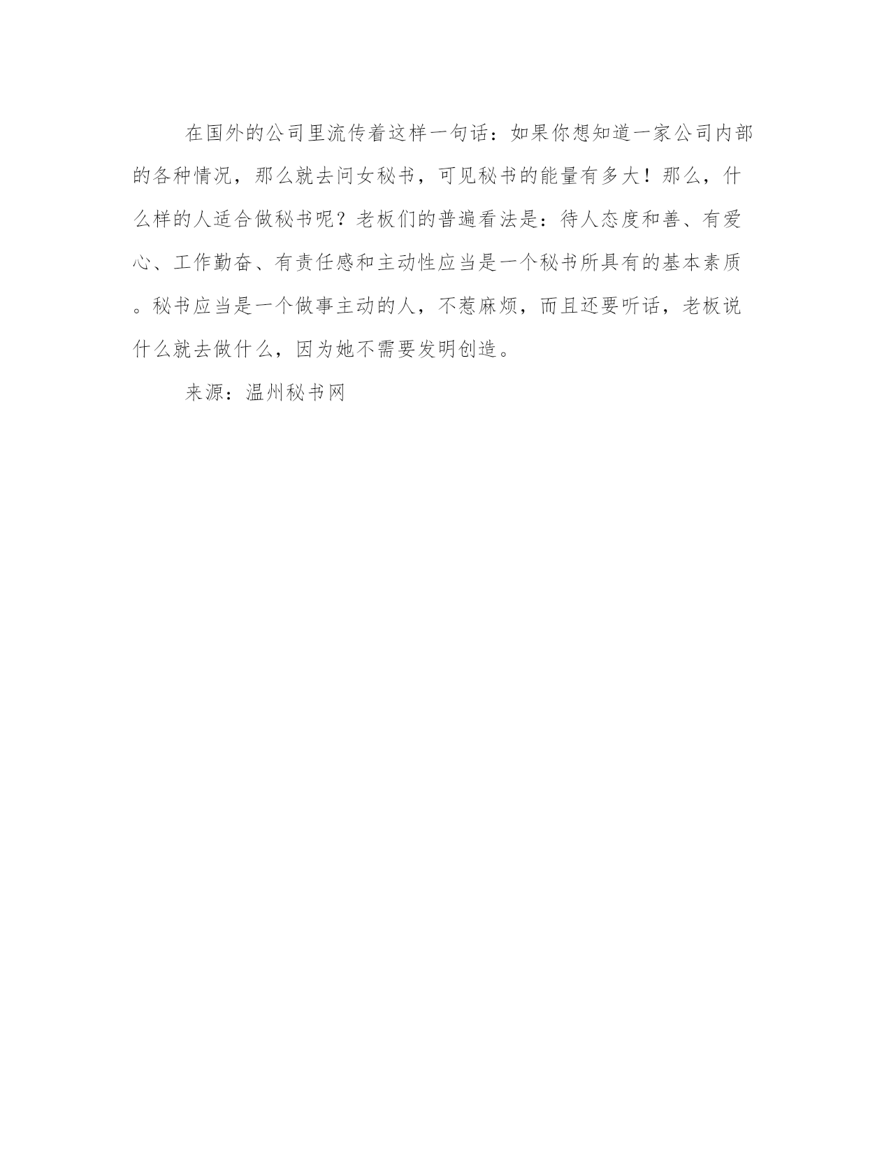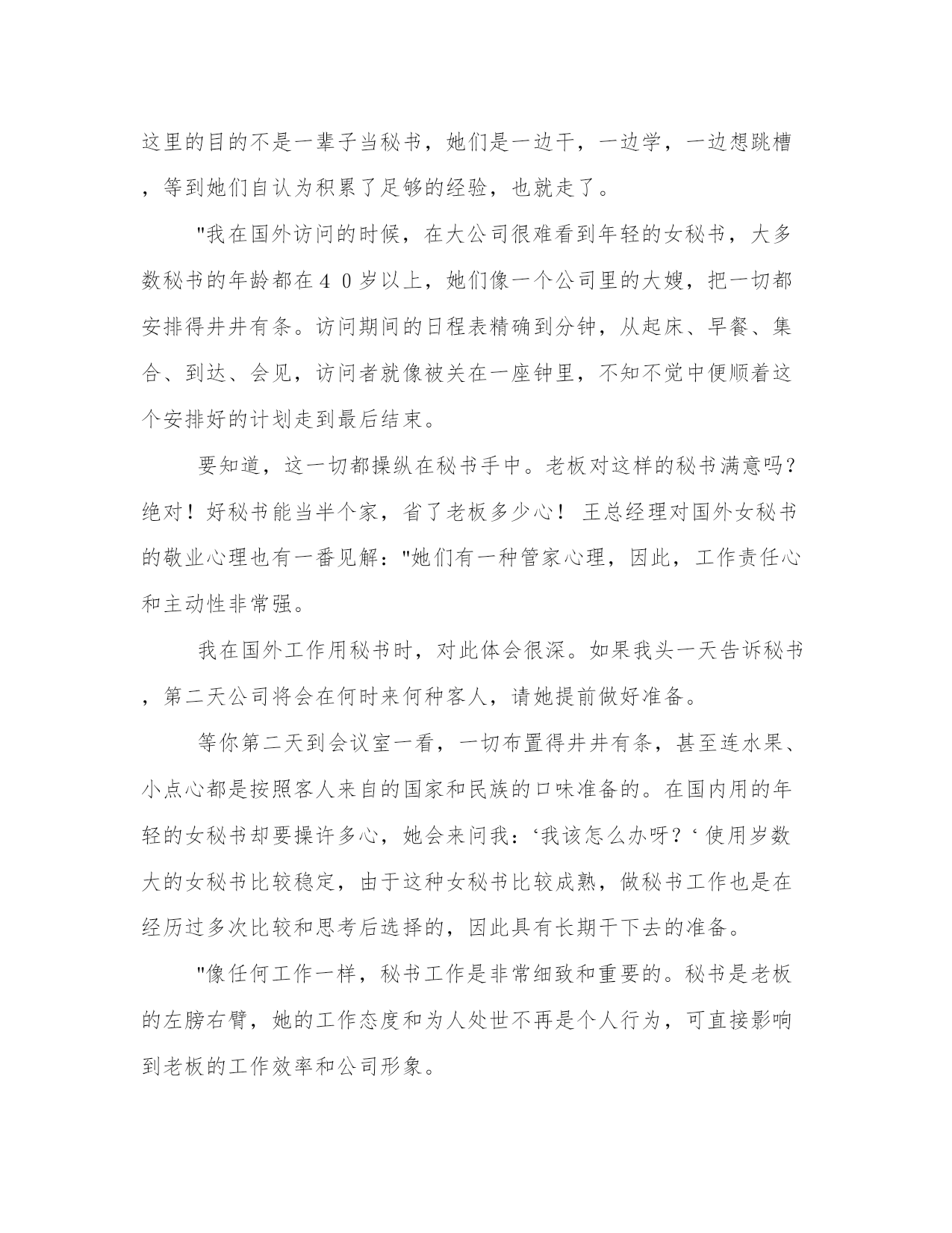 秘书要漂亮还是要精明朋友托我为他的孩子在外企找份秘书工作,"我女儿大学英语专业毕业,成绩优秀、聪明能干、活泼大方,是块做秘书的好材料。"我找到一位在美国公司作合伙人的朋友,他回答说:"我们最希望找的秘书是30岁以上,比较成熟的女性,工作踏实也肯干。太年轻的留不住,麻烦的事情反而会很多。我最近刚找到一个36岁的女秘书,用起来很顺手。"常有外语专业毕业的年轻女孩希望我在外企为她们找份工作。"你想做什么又能做什么?"我问。"先当个秘书凑合着干,有了合适的位置再跳。"这些自信心很强的姑娘们认为,秘书是晋升的第一个台阶,我想,最好还是听听公司的老板是如何选择女秘书再给自己做定位吧。在外企干了十几年的王先生是一家跨国公司驻华某企业的总经理,先后用过许多秘书,凡是到他那里找工作的人都要经过他面试。他对中国女秘书的特点有很精辟的看法:"国内的女秘书大都年轻漂亮,个性较强又任性,多数未经过培训,欠专业化,被动性工作,责任心较差,工作起来像个闹钟,拧一下,转一下。这其中最主要的原因是短期工作心理问题。她们大都把担任秘书作为跳板,特别是现在来应聘的女秘书有许多是双学历的,她们来你这里的目的不是一辈子当秘书,她们是一边干,一边学,一边想跳槽,等到她们自认为积累了足够的经验,也就走了。"我在国外访问的时候,在大公司很难看到年轻的女秘书,大多数秘书的年龄都在40岁以上,她们像一个公司里的大嫂,把一切都安排得井井有条。访问期间的日程表精确到分钟,从起床、早餐、集合、到达、会见,访问者就像被关在一座钟里,不知不觉中便顺着这个安排好的计划走到最后结束。要知道,这一切都操纵在秘书手中。老板对这样的秘书满意吗?绝对!好秘书能当半个家,省了老板多少心!王总经理对国外女秘书的敬业心理也有一番见解:"她们有一种管家心理,因此,工作责任心和主动性非常强。我在国外工作用秘书时,对此体会很深。如果我头一天告诉秘书,第二天公司将会在何时来何种客人,请她提前做好准备。等你第二天到会议室一看,一切布置得井井有条,甚至连水果、小点心都是按照客人来自的国家和民族的口味准备的。在国内用的年轻的女秘书却要操许多心,她会来问我:‘我该怎么办呀?‘使用岁数大的女秘书比较稳定,由于这种女秘书比较成熟,做秘书工作也是在经历过多次比较和思考后选择的,因此具有长期干下去的准备。"像任何工作一样,秘书工作是非常细致和重要的。秘书是老板的左膀右臂,她的工作态度和为人处世不再是个人行为,可直接影响到老板的工作效率和公司形象。在国外的公司里流传着这样一句话:如果你想知道一家公司内部的各种情况,那么就去问女秘书,可见秘书的能量有多大!那么,什么样的人适合做秘书呢?老板们的普遍看法是:待人态度和善、有爱心、工作勤奋、有责任感和主动性应当是一个秘书所具有的基本素质。秘书应当是一个做事主动的人,不惹麻烦,而且还要听话,老板说什么就去做什么,因为她不需要发明创造。来源:温州秘书网