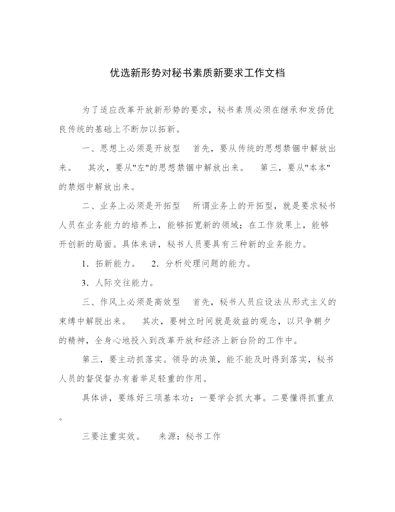 优选新形势对秘书素质新要求工作文档为了适应改革开放新形势的要求,秘书素质必须在继承和发扬优良传统的基础上不断加以拓新。一、思想上必须是开放型首先,要从传统的思想禁锢中解放出来。其次,要从"左"的思想禁锢中解放出来。第三,要从"本本"的禁烟中解放出来。二、业务上必须是开拓型所谓业务上的开拓型,就是要求秘书人员在业务能力的培养上,能够拓宽新的领域;在工作效果上,能够开创新的局面。具体来讲,秘书人员要具有三种新的业务能力。1.拓新能力。2.分析处理问题的能力。3.人际交往能力。三、作风上必须是高效型首先,秘书人员应设法从形式主义的束缚中解脱出来。其次,要树立时间就是效益的观念,以只争朝夕的精神,全身心地投入到改革开放和经济上新台阶的工作中。第三,要主动抓落实。领导的决策,能不能及时得到落实,秘书人员的督促督办有着举足轻重的作用。具体讲,要练好三项基本功:一要学会抓大事。二要懂得抓重点。三要注重实效。来源:秘书工作