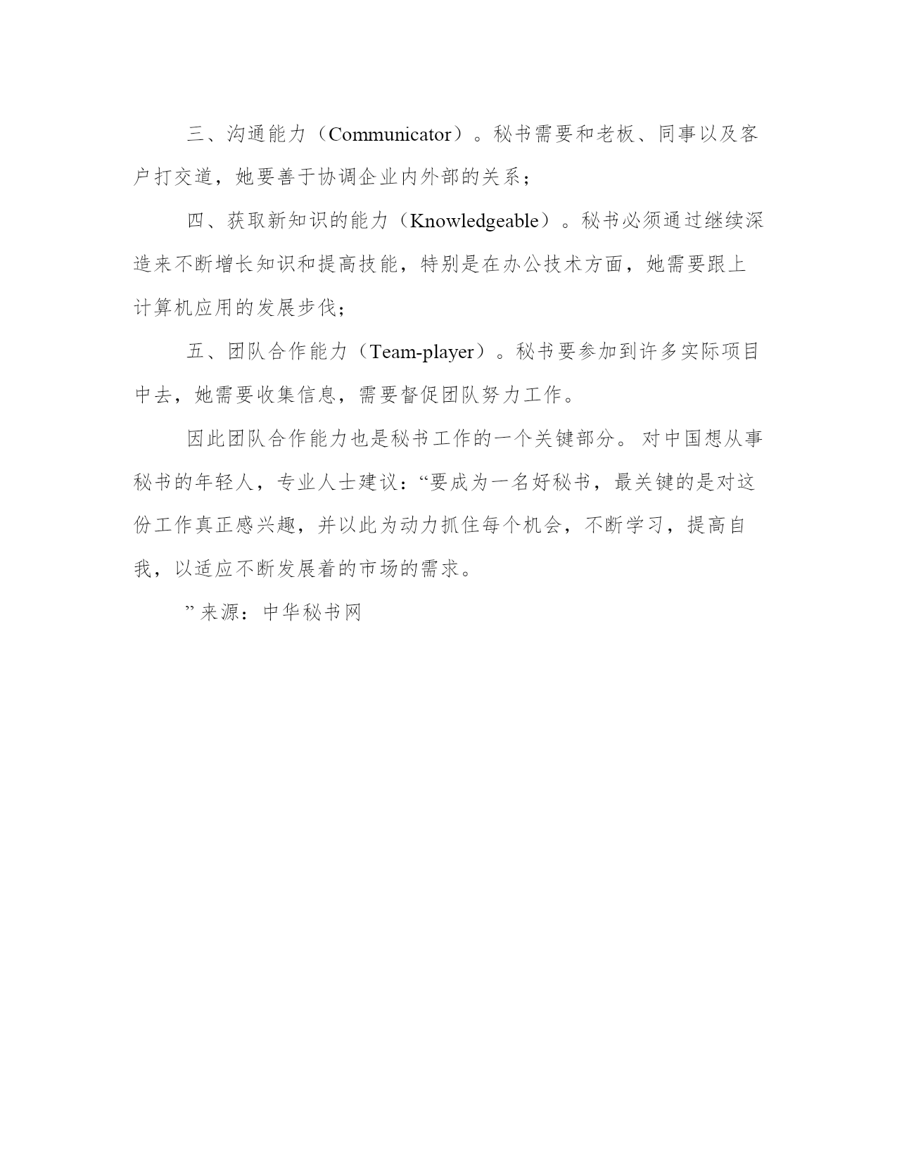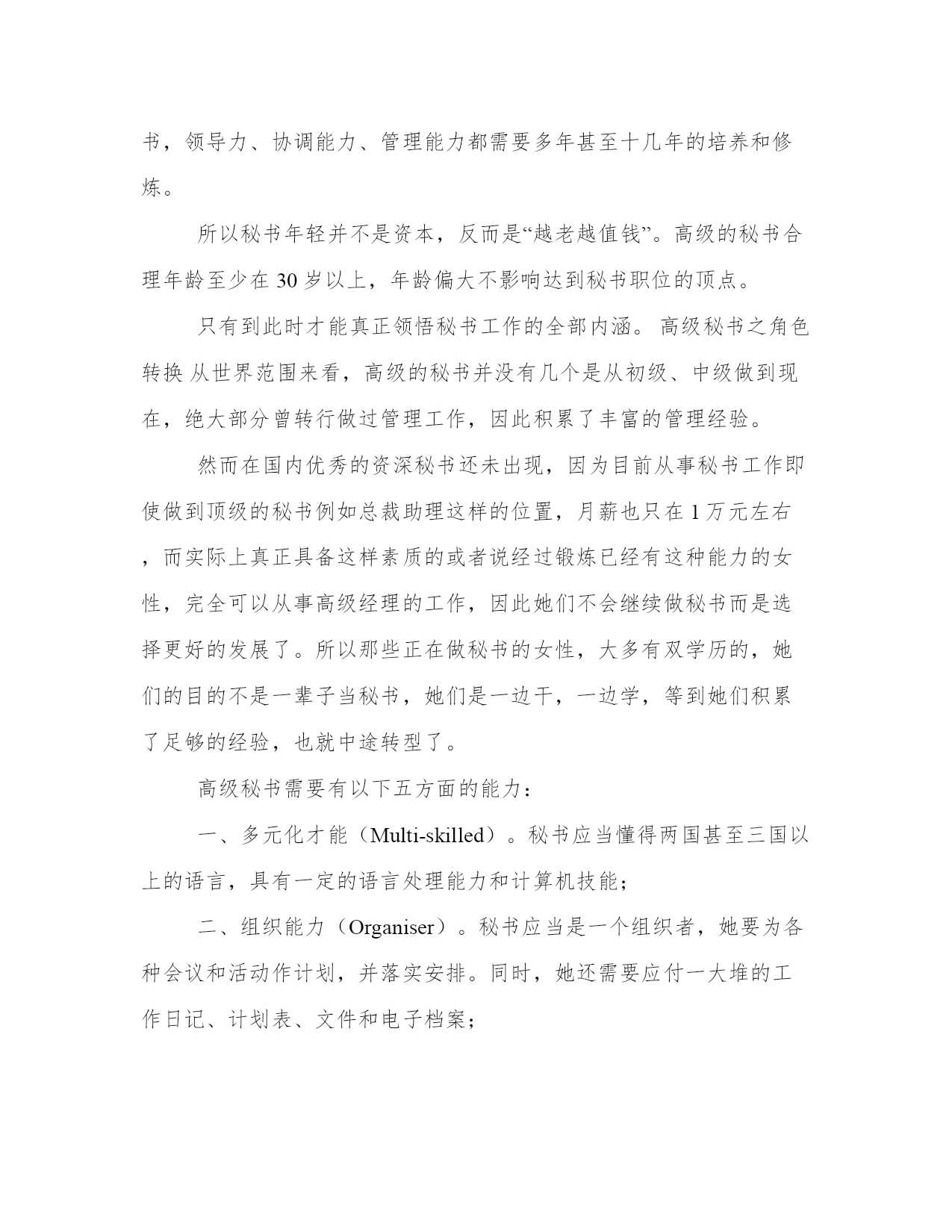 优秀秘书职业的成长规则工作文档提起秘书多数人会想到年轻漂亮的女孩子,也会认为那是她们吃“青春饭”的专利。实际上秘书作为一个行业已经形成了独特的行业特色,在国外顶级的秘书有两种:一种是高级决策层的成员,另一种被称为“PA”(personalassistant)私人助理。所以秘书并不是吃“青春饭”,而是捧着“金饭碗”。当你从前台秘书—部门初级秘书—中级秘书—高级秘书甚至升至助理、行政总监等位置时,秘书的发展空间实在很大。初级秘书之“七种武器”秘书并不像想象的那么轻松。所以,如果有意做秘书这行,那就必须先审视一下自己是否具备必要的素质:(1)具有细致、周到的思考习惯,一丝不苟的工作作风;(2)办事条理清楚、记忆准确;(3)忠心、诚实、不喧宾夺主;(4)了解企业和公司的部门机构和人员配置,精通文秘工作的基本知识;(5)具有较高的外语水平和文字能力;(6)具有中英文打字等现代化办公手段;(7)具有一定的公关能力,懂得一定的社交礼仪。中级秘书之“越老越值钱”仅仅是具备秘书的基本素质,远远不够,要想成为高级秘书,领导力、协调能力、管理能力都需要多年甚至十几年的培养和修炼。所以秘书年轻并不是资本,反而是“越老越值钱”。高级的秘书合理年龄至少在30岁以上,年龄偏大不影响达到秘书职位的顶点。只有到此时才能真正领悟秘书工作的全部内涵。高级秘书之角色转换从世界范围来看,高级的秘书并没有几个是从初级、中级做到现在,绝大部分曾转行做过管理工作,因此积累了丰富的管理经验。然而在国内优秀的资深秘书还未出现,因为目前从事秘书工作即使做到顶级的秘书例如总裁助理这样的位置,月薪也只在1万元左右,而实际上真正具备这样素质的或者说经过锻炼已经有这种能力的女性,完全可以从事高级经理的工作,因此她们不会继续做秘书而是选择更好的发展了。所以那些正在做秘书的女性,大多有双学历的,她们的目的不是一辈子当秘书,她们是一边干,一边学,等到她们积累了足够的经验,也就中途转型了。高级秘书需要有以下五方面的能力:一、多元化才能(Multi-skilled)。秘书应当懂得两国甚至三国以上的语言,具有一定的语言处理能力和计算机技能;二、组织能力(Organiser)。秘书应当是一个组织者,她要为各种会议和活动作计划,并落实安排。同时,她还需要应付一大堆的工作日记、计划表、文件和电子档案;三、沟通能力(Communicator)。秘书需要和老板、同事以及客户打交道,她要善于协调企业内外部的关系;四、获取新知识的能力(Knowledgeable)。秘书必须通过继续深造来不断增长知识和提高技能,特别是在办公技术方面,她需要跟上计算机应用的发展步伐;五、团队合作能力(Team-player)。秘书要参加到许多实际项目中去,她需要收集信息,需要督促团队努力工作。因此团队合作能力也是秘书工作的一个关键部分。对中国想从事秘书的年轻人,专业人士建议:“要成为一名好秘书,最关键的是对这份工作真正感兴趣,并以此为动力抓住每个机会,不断学习,提高自我,以适应不断发展着的市场的需求。”来源:中华秘书网