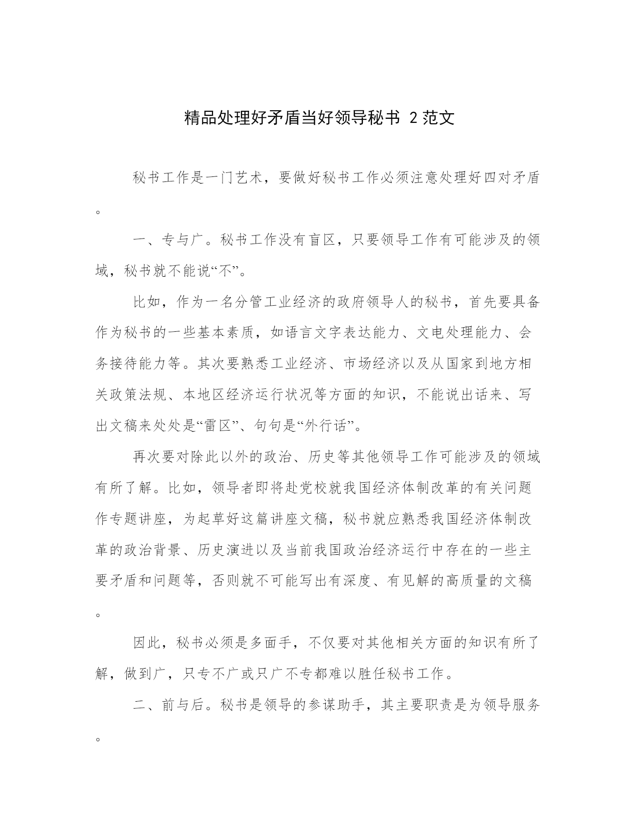 精品处理好矛盾当好领导秘书2范文秘书工作是一门艺术,要做好秘书工作必须注意处理好四对矛盾。一、专与广。秘书工作没有盲区,只要领导工作有可能涉及的领域,秘书就不能说“不”。比如,作为一名分管工业经济的政府领导人的秘书,首先要具备作为秘书的一些基本素质,如语言文字表达能力、文电处理能力、会务接待能力等。其次要熟悉工业经济、市场经济以及从国家到地方相关政策法规、本地区经济运行状况等方面的知识,不能说出话来、写出文稿来处处是“雷区”、句句是“外行话”。再次要对除此以外的政治、历史等其他领导工作可能涉及的领域有所了解。比如,领导者即将赴党校就我国经济体制改革的有关问题作专题讲座,为起草好这篇讲座文稿,秘书就应熟悉我国经济体制改革的政治背景、历史演进以及当前我国政治经济运行中存在的一些主要矛盾和问题等,否则就不可能写出有深度、有见解的高质量的文稿。因此,秘书必须是多面手,不仅要对其他相关方面的知识有所了解,做到广,只专不广或只广不专都难以胜任秘书工作。二、前与后。秘书是领导的参谋助手,其主要职责是为领导服务。为此,就要做到前与后的协调统一。所谓前,就是对与领导有关的工作要超前考虑、提前完成,留有一定的提前量。这其中包括两方面含义:一是领导布置的工作要赶在领导规定的时间之前完成,以给领导一个缓冲的时间;二是领导尚未布置但根据自己判断即将要开展的工作,要超前谋划,想在领导前面,走在领导前面。比如,对即将进入汛期的防洪问题,如果该地区每年的防洪形势都较为严峻的话,就应该尽早给领导提个醒,必要时还应该提出初步工作方案。再如,领导参加会议时,要提前进入会场,检查包括音响在内的各项会务准备情况。诸如此类的问题,都应该有超前意识。与此相反,有些工作秘书不能超前而必须做在后面。比如,领导面对新闻镜头时,秘书要主动靠后,把镜头让给领导,而不能跑到领导前面,与领导抢镜头。领导参加完一个活动时,秘书要在领导退出现场之后,详细检查领导是否还有文件等物品遗留在现场,然后才能离开。该前则前,该后则后,对秘书而言两者同样重要,切不可前后倒置,那样必然会乱成一团。三、内与外。由于秘书往往跟领导走得很近,不仅在许多方面直接参与领导决策,而且还掌握着包括领导个人隐私在内的一些鲜为人知的秘密。所以,秘书在公共场合活动时要注意内外有别,把握分寸,对什么该说什么不该说必须心中有数,不能为了哗众取宠、一时兴趣而口无遮拦什么都往外说。这样,不仅会泄露一些工作秘密,而且还可能会损害领导者的形象,于工作、于己都不利。比如,一位领导正在召开工商、质量监督等部门负责人会议,准备对市场上热销的某种假冒伪劣商品进行突击检查。如果秘书提前把会议内容透露了出去,就会使这次检查落空,让不法商贩继续逍遥法外,给工作造成被动。泄露秘密不仅仅是违反工作纪律的问题,有时还会酿成严重后果,作为秘书必须让住这一点。四、高与矮。这里主要指形象问题。作为秘书,要注意在各种场合维护好、塑造好领导形象,使领导始终给人民大众留下美好形象。相比之下,秘书在必要时要适当矮化自己,万不可与领导比高矮。一是对生活中人们矮化领导形象的各种议论,要利用自己的特殊身份主动为领导辩护,摆事实、摆论据,以澄清人们在这些问题的错误认识。二是对工作中有可能展现领导形象的地方,要多为领导考虑,多做设计,努力把一个好的领导形象留给大家。三是对自己的形象也要关注,因为大部分人很难有机会直接见到领导,他们心目中的领导形象很大程度上是通过综合领导秘书在各种场合的表现而形成的。四是对有可能损害领导形象但又非大是大非的错误,秘书要主动揽过;对一些经过自己参谋而形成的正确决策,秘书要主动推功,为领导增彩。一句话,秘书要尽可能多地把各种美丽的光环聚集到领导身上。来源:秘书工作