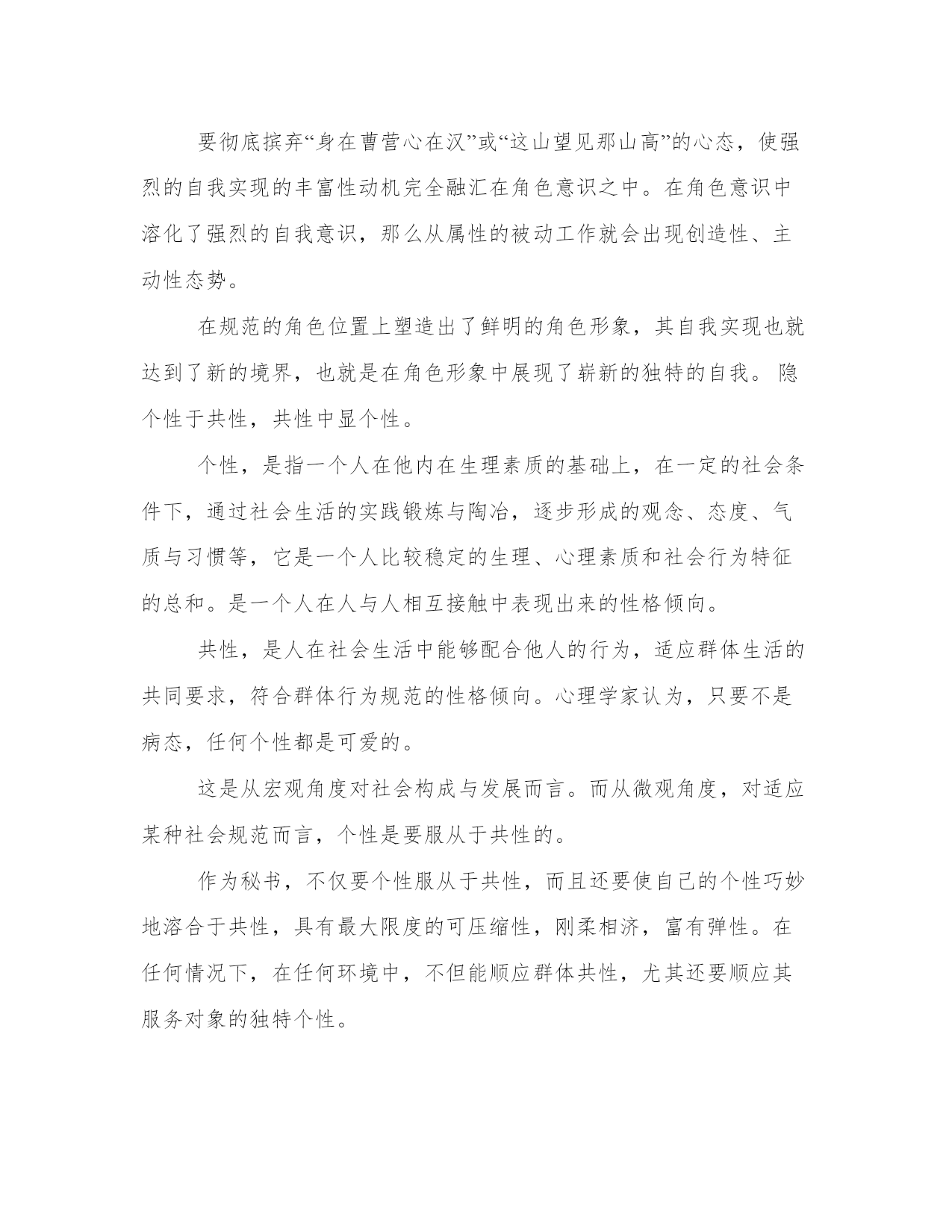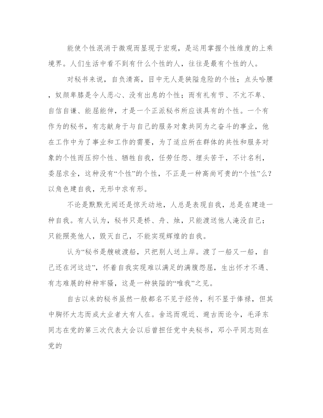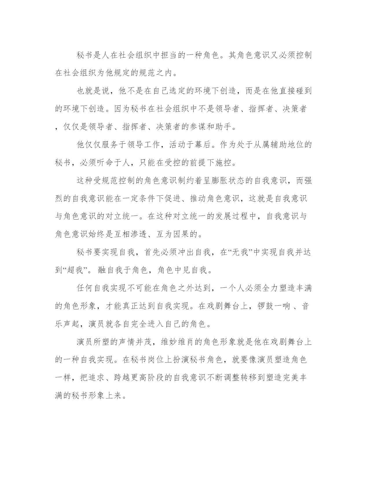 优秀论秘书意识与气质的修养(1)文章古时君王视秘书为股肱之臣。当今领导人用秘书如左膀右臂。秘书是领导人的智囊和助手。他辅助领导人从事各项管理工作,负有参政设谋,协调综合,督促检查,拾遗补缺等重大责任。秘书素质的强弱直接关系到工作质量与效率的高低,关系到党和国家方针政策的正确贯彻与各项事业的兴衰成败。因此,秘书人员必须具备较高的政治、思想、品德、智能、身心等方面的素质。但是,仅仅具备这些基本的素质,还不是合格的秘书人才,还不能说是一个精明能干的秘书。秘书要在领会贯彻领导意图的过程中与领导配合默契,使领导得心应手,并达到心领神会,挥洒自如的境界,仅有其基本素质显然是不行的,欲达到完成秘书使命的优化标准,还必须具备和培养良好的秘书意识和气质。自我意识与角色意识的对立统一唯物主义认为,存在决定意识。人们的自我意识是在社会实践中产生的发展的,它表现愿望、意向、兴趣、理想、信念等。自我意识的高层次表现为一种丰富性动机,就是在社会生活中不断推进提高的自我实现的精神支柱,每个人在进入自我实现的某个阶段以后,又会出现新的更高的自我实现的追求。这种时时更新的自我意识总呈膨胀之势。秘书是人在社会组织中担当的一种角色。其角色意识又必须控制在社会组织为他规定的规范之内。也就是说,他不是在自己选定的环境下创造,而是在他直接碰到的环境下创造。因为秘书在社会组织中不是领导者、指挥者、决策者,仅仅是领导者、指挥者、决策者的参谋和助手。他仅仅服务于领导工作,活动于幕后。作为处于从属辅助地位的秘书,必须听命于人,只能在受控的前提下施控。这种受规范控制的角色意识制约着呈膨胀状态的自我意识,而强烈的自我意识能在一定条件下促进、推动角色意识,这就是自我意识与角色意识的对立统一。在这种对立统一的发展过程中,自我意识与角色意识始终是互相渗透、互为因果的。秘书要实现自我,首先必须冲出自我,在“无我”中实现自我并达到“超我”。融自我于角色,角色中见自我。任何自我实现不可能在角色之外达到,一个人必须全力塑造丰满的角色形象,才能真正达到自我实现。在戏剧舞台上,锣鼓一响、音乐声起,演员就各自完全进入自己的角色。演员所塑的声情并茂,维妙维肖的角色形象就是他在戏剧舞台上的一种自我实现。在秘书岗位上扮演秘书角色,就要像演员塑造角色一样,把追求、跨越更高阶段的自我意识不断调整转移到塑造完美丰满的秘书形象上来。要彻底摈弃“身在曹营心在汉”或“这山望见那山高”的心态,使强烈的自我实现的丰富性动机完全融汇在角色意识之中。在角色意识中溶化了强烈的自我意识,那么从属性的被动工作就会出现创造性、主动性态势。在规范的角色位置上塑造出了鲜明的角色形象,其自我实现也就达到了新的境界,也就是在角色形象中展现了崭新的独特的自我。隐个性于共性,共性中显个性。个性,是指一个人在他内在生理素质的基础上,在一定的社会条件下,通过社会生活的实践锻炼与陶冶,逐步形成的观念、态度、气质与习惯等,它是一个人比较稳定的生理、心理素质和社会行为特征的总和。是一个人在人与人相互接触中表现出来的性格倾向。共性,是人在社会生活中能够配合他人的行为,适应群体生活的共同要求,符合群体行为规范的性格倾向。心理学家认为,只要不是病态,任何个性都是可爱的。这是从宏观角度对社会构成与发展而言。而从微观角度,对适应某种社会规范而言,个性是要服从于共性的。作为秘书,不仅要个性服从于共性,而且还要使自己的个性巧妙地溶合于共性,具有最大限度的可压缩性,刚柔相济,富有弹性。在任何情况下,在任何环境中,不但能顺应群体共性,尤其还要顺应其服务对象的独特个性。能使个性泯消于微观而显现于宏观,是运用掌握个性维度的上乘境界。人们生活中看不到有什么个性的人,往往是最有个性的人。对秘书来说,自负清高,目中无人是狭隘危险的个性;点头哈腰,奴颜卑膝是令人恶心、没有出息的个性;而有礼有节、不亢不卑、自信自谦、能屈能伸,才是一个正派秘书所应该具有的个性。一个有作为的秘书,有志献身于与自己的服务对象共同为之奋斗的事业,他在工作中为了事业和工作的需要,为了适应所在群体的共性和服务对象的个性而压抑个性、牺牲自我,任劳任怨、埋头苦干,不计名利,委屈求全,这种没有“个性”的个性,不正是一种高尚可贵的“个性”么?以角色建自我,无形中求有形。不论是默默无闻还是惊天动地,人总是表现自我,总是在建造一种自我。有人认为,秘书只是桥、舟、烛,只能渡送他人淹没自己;只能照亮他人,毁灭自己,不能实现辉煌的自我。认为“秘书是艘破渡船,只把别人送上岸。渡了一船又一船,自己还在河这边”,怀着自我实现难以满足的满腹怨屈,生出怀才不遇、有志难展的种种牢骚,这是一种狭隘的“唯我”之见。自古以来的秘书虽然一般都名不见于经传,利不显于俸禄,但其中胸怀大志而成大业者大有人在。舍远而观近、避古而论今,毛泽东同志在党的第三次代表