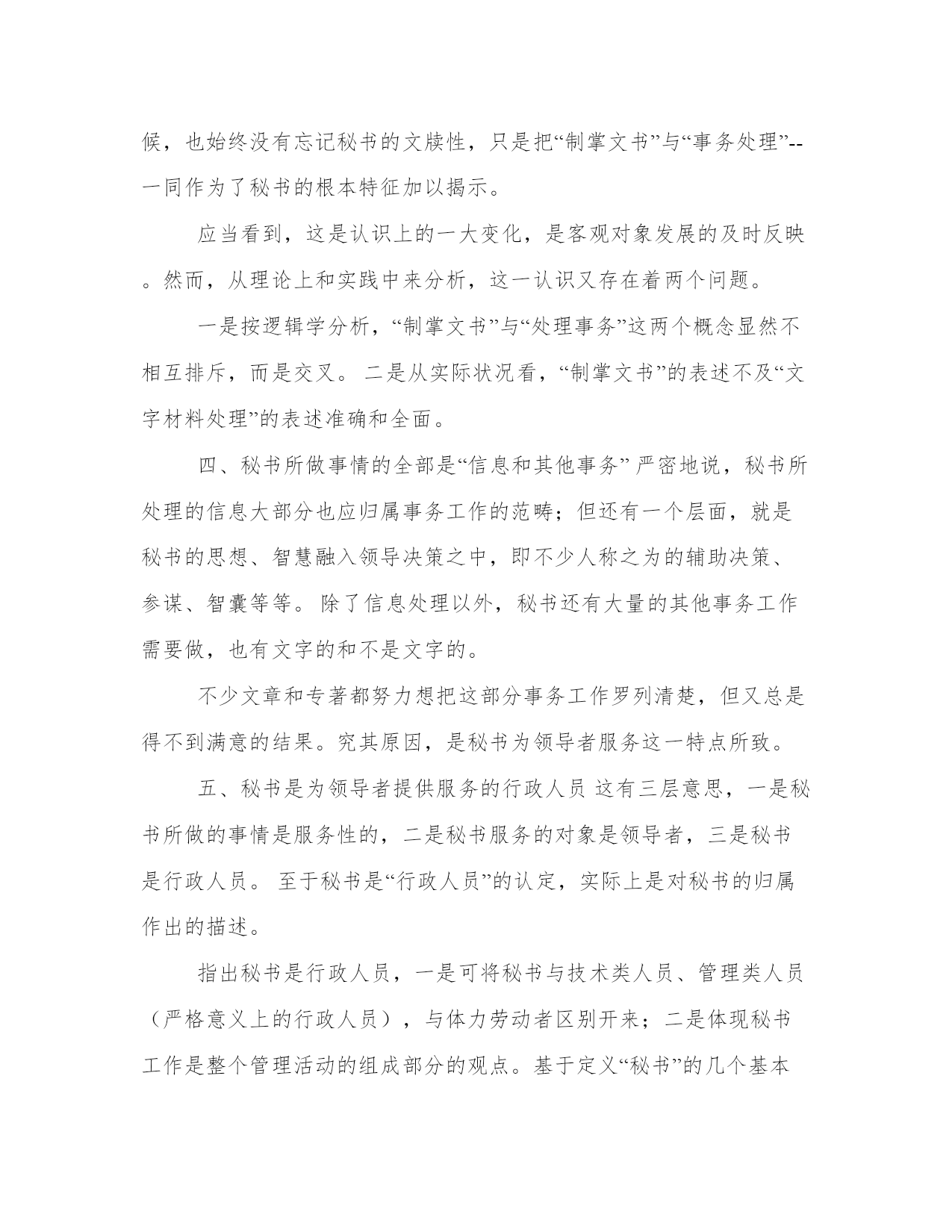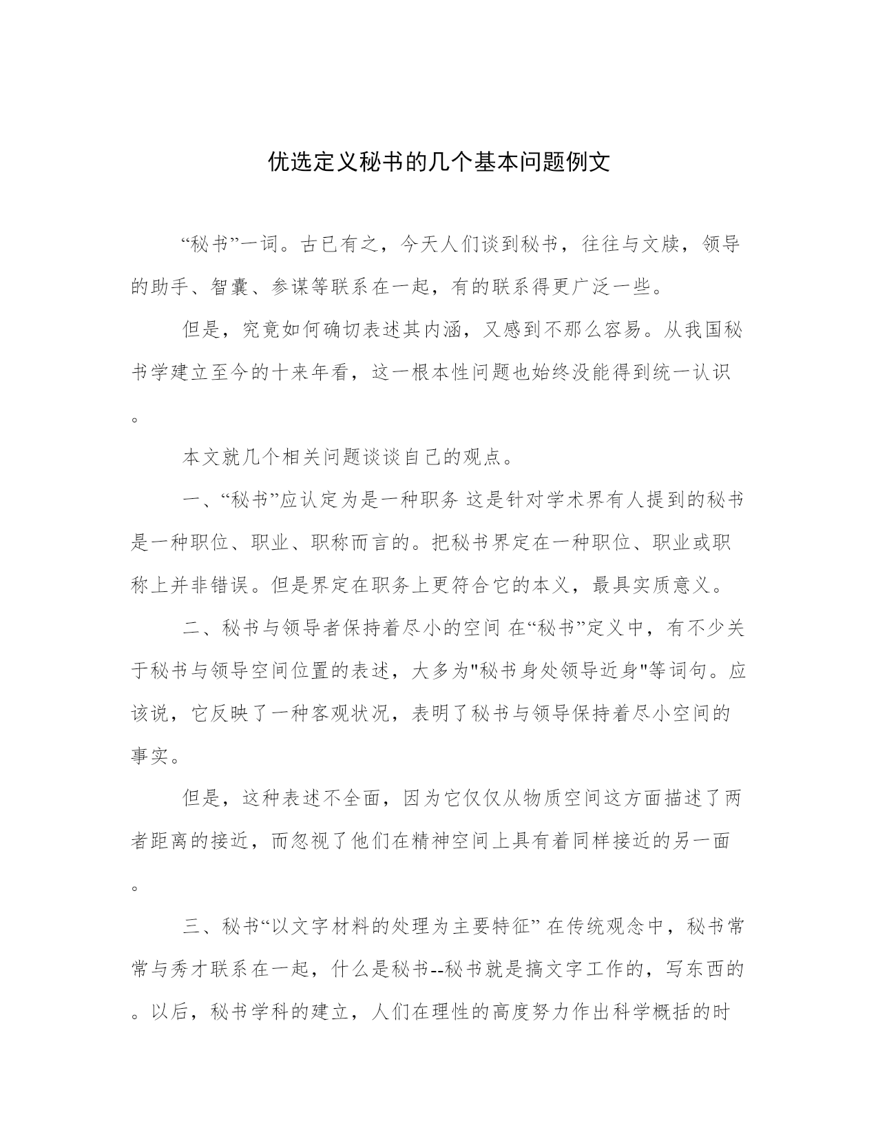 优选定义秘书的几个基本问题例文“秘书”一词。古已有之,今天人们谈到秘书,往往与文牍,领导的助手、智囊、参谋等联系在一起,有的联系得更广泛一些。但是,究竟如何确切表述其内涵,又感到不那么容易。从我国秘书学建立至今的十来年看,这一根本性问题也始终没能得到统一认识。本文就几个相关问题谈谈自己的观点。一、“秘书”应认定为是一种职务这是针对学术界有人提到的秘书是一种职位、职业、职称而言的。把秘书界定在一种职位、职业或职称上并非错误。但是界定在职务上更符合它的本义,最具实质意义。二、秘书与领导者保持着尽小的空间在“秘书”定义中,有不少关于秘书与领导空间位置的表述,大多为"秘书身处领导近身"等词句。应该说,它反映了一种客观状况,表明了秘书与领导保持着尽小空间的事实。但是,这种表述不全面,因为它仅仅从物质空间这方面描述了两者距离的接近,而忽视了他们在精神空间上具有着同样接近的另一面。三、秘书“以文字材料的处理为主要特征”在传统观念中,秘书常常与秀才联系在一起,什么是秘书--秘书就是搞文字工作的,写东西的。以后,秘书学科的建立,人们在理性的高度努力作出科学概括的时候,也始终没有忘记秘书的文牍性,只是把“制掌文书”与“事务处理”--一同作为了秘书的根本特征加以揭示。应当看到,这是认识上的一大变化,是客观对象发展的及时反映。然而,从理论上和实践中来分析,这一认识又存在着两个问题。一是按逻辑学分析,“制掌文书”与“处理事务”这两个概念显然不相互排斥,而是交叉。二是从实际状况看,“制掌文书”的表述不及“文字材料处理”的表述准确和全面。四、秘书所做事情的全部是“信息和其他事务”严密地说,秘书所处理的信息大部分也应归属事务工作的范畴;但还有一个层面,就是秘书的思想、智慧融入领导决策之中,即不少人称之为的辅助决策、参谋、智囊等等。除了信息处理以外,秘书还有大量的其他事务工作需要做,也有文字的和不是文字的。不少文章和专著都努力想把这部分事务工作罗列清楚,但又总是得不到满意的结果。究其原因,是秘书为领导者服务这一特点所致。五、秘书是为领导者提供服务的行政人员这有三层意思,一是秘书所做的事情是服务性的,二是秘书服务的对象是领导者,三是秘书是行政人员。至于秘书是“行政人员”的认定,实际上是对秘书的归属作出的描述。指出秘书是行政人员,一是可将秘书与技术类人员、管理类人员(严格意义上的行政人员),与体力劳动者区别开来;二是体现秘书工作是整个管理活动的组成部分的观点。基于定义“秘书”的几个基本问题的如上认识,笔者认为,所谓“秘书”是一种职务,指与领导者保持尽小的空间,专为其提供以文字材料处理为主要特征的信息和其他事务服务的行政人员。来源:中国考试学习网