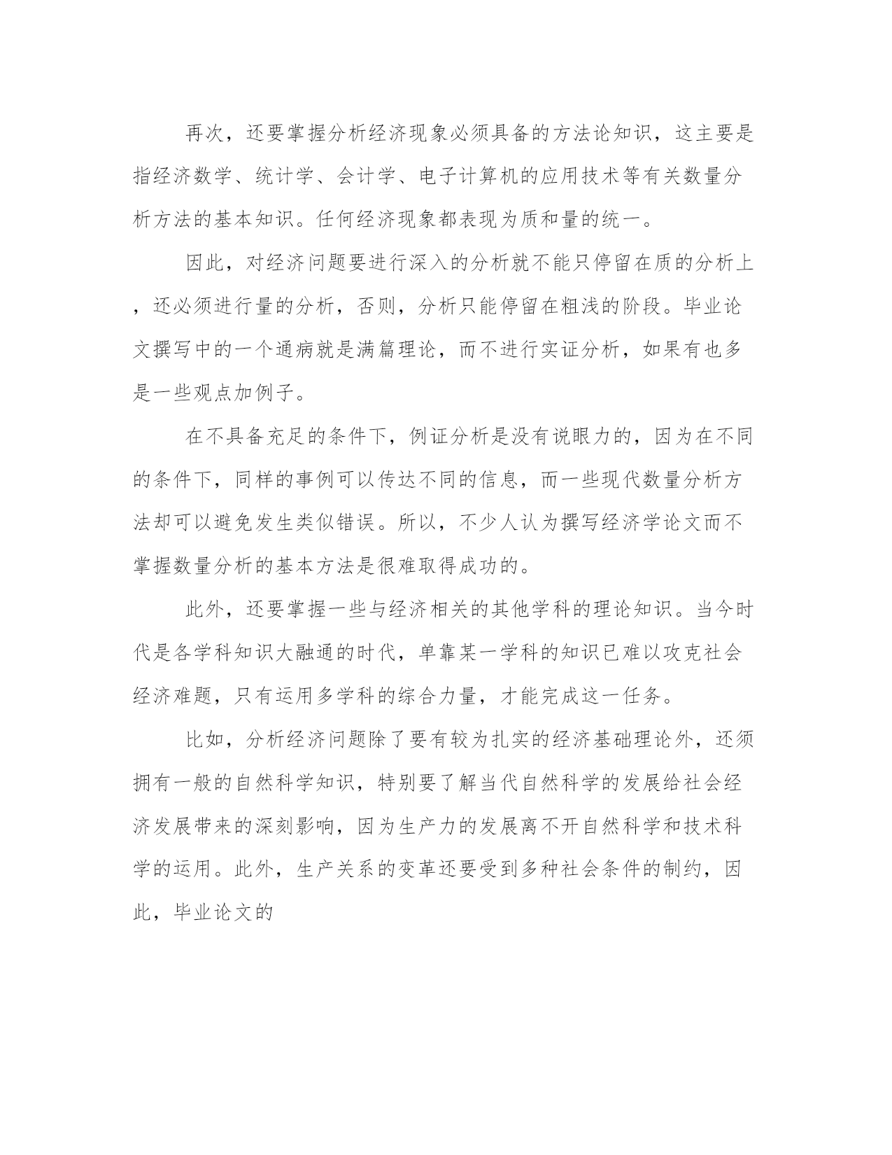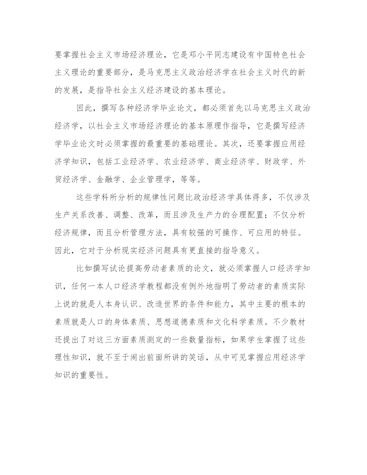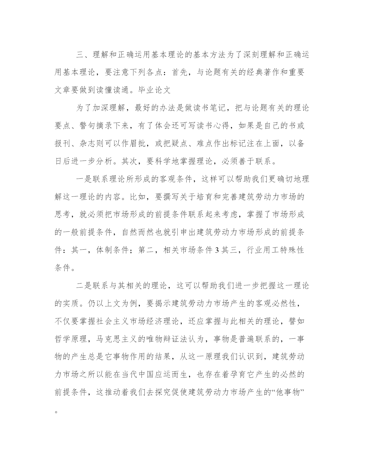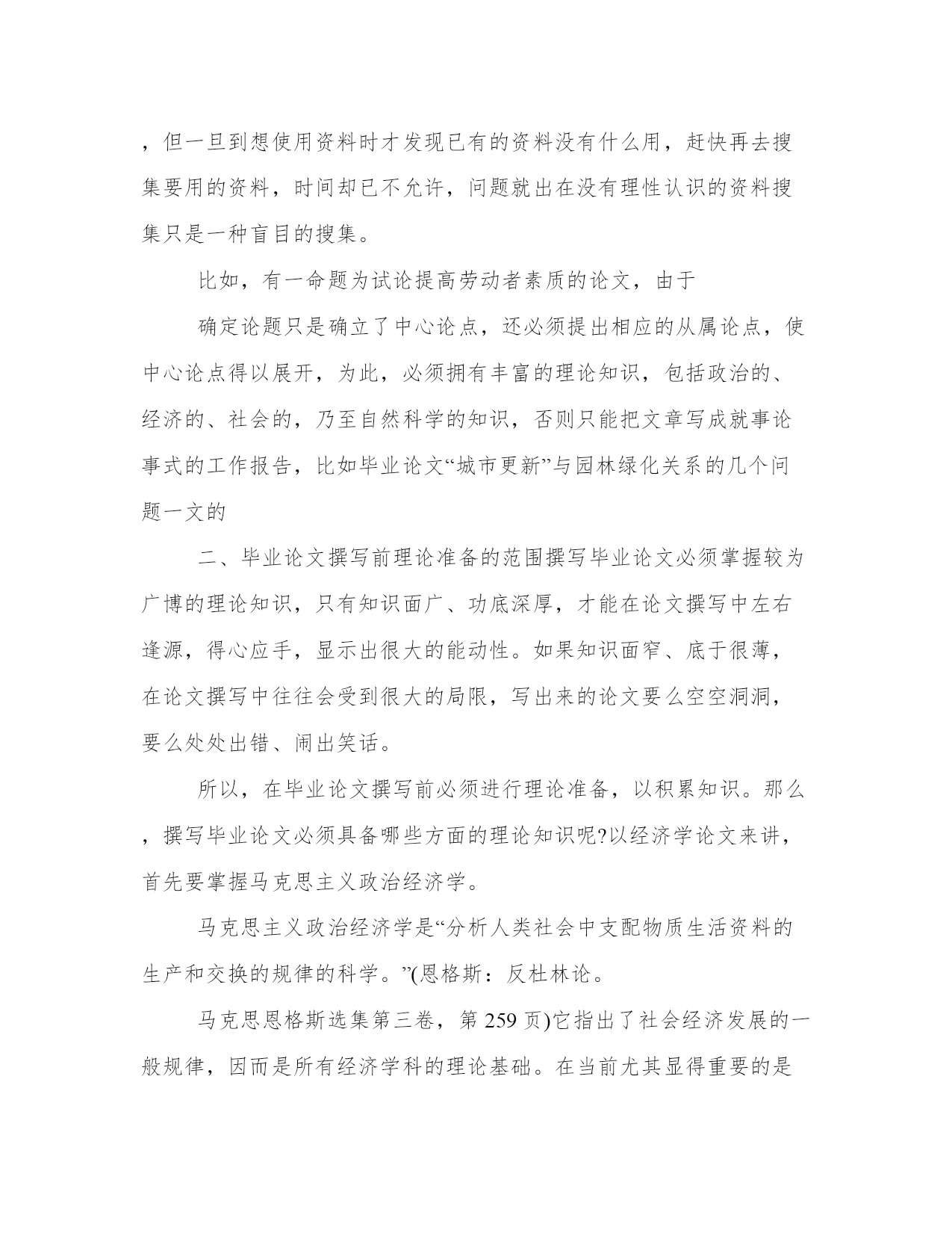 优选论文理论的方法工作文档一、毕业论文撰写前理论准备的重要性由于毕业论文具有较高的学术价值,是检验学生数年学习中掌握知识的程度、运用所学知识分析和解决问题能力的水平的一份综合性答卷,所以毕业论文撰写前的理论准备显得十分重要。首先,毕业论文撰写前的理论准备是毕业论文撰写的基础。选好了毕业论文的题目,必须进行理论准备,否则积累资料、形成论点和论据都会迷失方向。以对发展和完善建筑市场的有关问题思考一文为例,论题一旦确定,必须接着实施理论准备,对什么是市场?什么是建筑市场?建筑市场的地位和作用是什么?发展和完善建筑市场的条件和基础是什么?等等,必须先进行理论回答,然后再按照理论思路去搜集资料,再形成论点和论据。有人以为这种做法违背了“结论产生于调查分析的末尾”的惯例,其实,学生所选的一般都是自己比较熟悉的,已有相当程度感性接触的领域的论题,从已有的感性认识上升到理性认识,这是毕业论文撰写的重要一步,只有这样才能在以后的调查分析、搜集资料阶段来验证这种理性认识的正确与否。其次,毕业论文撰写前的理论准备是积累资料的向导。毕业论文的撰写应积累什么资料?这是极大多数没有毕业论文撰写经验的学生所碰到的最大难题。有许多学生在那里盲目地搜集资料,但一旦到想使用资料时才发现已有的资料没有什么用,赶快再去搜集要用的资料,时间却已不允许,问题就出在没有理性认识的资料搜集只是一种盲目的搜集。比如,有一命题为试论提高劳动者素质的论文,由于确定论题只是确立了中心论点,还必须提出相应的从属论点,使中心论点得以展开,为此,必须拥有丰富的理论知识,包括政治的、经济的、社会的,乃至自然科学的知识,否则只能把文章写成就事论事式的工作报告,比如毕业论文“城市更新”与园林绿化关系的几个问题一文的二、毕业论文撰写前理论准备的范围撰写毕业论文必须掌握较为广博的理论知识,只有知识面广、功底深厚,才能在论文撰写中左右逢源,得心应手,显示出很大的能动性。如果知识面窄、底于很薄,在论文撰写中往往会受到很大的局限,写出来的论文要么空空洞洞,要么处处出错、闹出笑话。所以,在毕业论文撰写前必须进行理论准备,以积累知识。那么,撰写毕业论文必须具备哪些方面的理论知识呢?以经济学论文来讲,首先要掌握马克思主义政治经济学。马克思主义政治经济学是“分析人类社会中支配物质生活资料的生产和交换的规律的科学。”(恩格斯:反杜林论。马克思恩格斯选集第三卷,)它指出了社会经济发展的一般规律,因而是所有经济学科的理论基础。在当前尤其显得重要的是要掌握社会主义市场经济理论,它是邓小平同志建设有中国特色社会主义理论的重要部分,是马克思主义政治经济学在社会主义时代的新的发展,是指导社会主义经济建设的基本理论。因此,撰写各种经济学毕业论文,都必须首先以马克思主义政治经济学,以社会主义市场经济理论的基本原理作指导,它是撰写经济学毕业论文时必须掌握的最重要的基础理论。其次,还要掌握应用经济学知识,包括工业经济学、农业经济学、商业经济学、财政学、外贸经济学、金融学、企业管理学,等等。这些学科所分析的规律性问题比政治经济学具体得多,不仅涉及生产关系改善、调整、改革,而且涉及生产力的合理配置;不仅分析经济规律,而且分析管理方法,具有较强的可操作、可应用的特征。因此,它对于分析现实经济问题具有更直接的指导意义。比如撰写试论提高劳动者素质的论文,就必须掌握人口经济学知识,任何一本人口经济学教程都没有例外地指明了劳动者的素质实际上说的就是人本身认识、改造世界的条件和能力,其中主要的根本的素质就是人口的身体素质、思想道德素质和文化科学素质。不少教材还提出了对这三方面素质测定的一些数量指标,如果学生掌握了这些理性知识,就不至于闹出前面所讲的笑话,从中可见掌握应用经济学知识的重要性。再次,还要掌握分析经济现象必须具备的方法论知识,这主要是指经济数学、统计学、会计学、电子计算机的应用技术等有关数量分析方法的基本知识。任何经济现象都表现为质和量的统一。因此,对经济问题要进行深入的分析就不能只停留在质的分析上,还必须进行量的分析,否则,分析只能停留在粗浅的阶段。毕业论文撰写中的一个通病就是满篇理论,而不进行实证分析,如果有也多是一些观点加例子。在不具备充足的条件下,例证分析是没有说眼力的,因为在不同的条件下,同样的事例可以传达不同的信息,而一些现代数量分析方法却可以避免发生类似错误。所以,不少人认为撰写经济学论文而不掌握数量分析的基本方法是很难取得成功的。此外,还要掌握一些与经济相关的其他学科的理论知识。当今时代是各学科知识大融通的时代,单靠某一学科的知识已难以攻克社会经济难题,只有运用多学科的综合力量,才能完成这一任务。比如,分析经济问题除了要有较为扎实的经济基础理论外,还须拥有一般的自然科学知识,特别要了解当代自然科学的发展给社会经济发展带来的