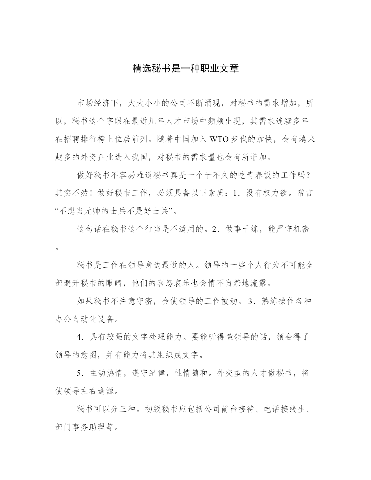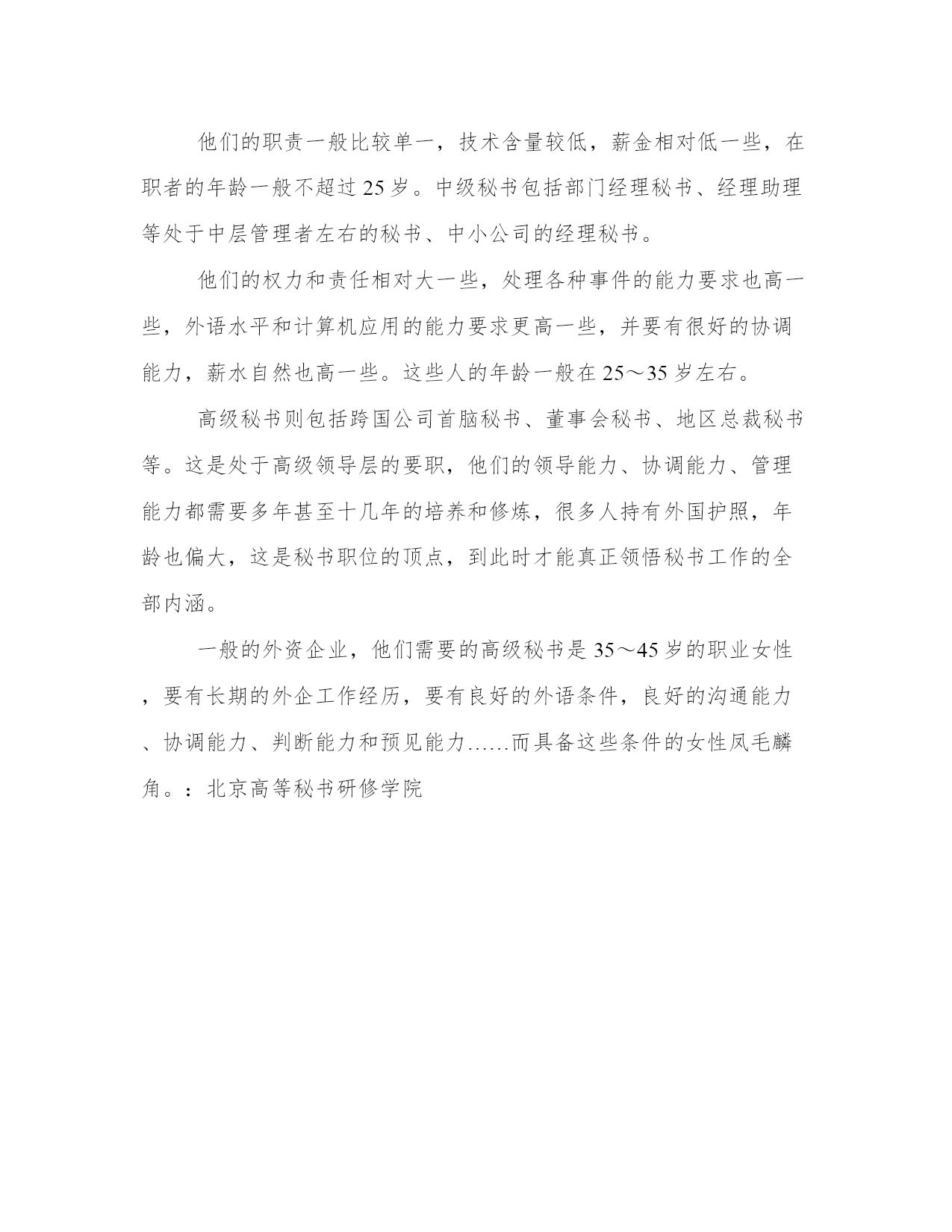 精选秘书是一种职业文章市场经济下,大大小小的公司不断涌现,对秘书的需求增加,所以,秘书这个字眼在最近几年人才市场中频频出现,其需求连续多年在招聘排行榜上位居前列。随着中国加入WTO步伐的加快,会有越来越多的外资企业进入我国,对秘书的需求量也会有所增加。做好秘书不容易难道秘书真是一个干不久的吃青春饭的工作吗?其实不然!做好秘书工作,必须具备以下素质:1.没有权力欲。常言“不想当元帅的士兵不是好士兵”。这句话在秘书这个行当是不适用的。2.做事干练,能严守机密。秘书是工作在领导身边最近的人。领导的一些个人行为不可能全部避开秘书的眼睛,他们的喜怒哀乐也会情不自禁地流露。如果秘书不注意守密,会使领导的工作被动。3.熟练操作各种办公自动化设备。4.具有较强的文字处理能力。要能听得懂领导的话,领会得了领导的意图,并有能力将其组织成文字。5.主动热情,遵守纪律,性情随和。外交型的人才做秘书,将使领导左右逢源。秘书可以分三种。初级秘书应包括公司前台接待、电话接线生、部门事务助理等。他们的职责一般比较单一,技术含量较低,薪金相对低一些,在职者的年龄一般不超过25岁。中级秘书包括部门经理秘书、经理助理等处于中层管理者左右的秘书、中小公司的经理秘书。他们的权力和责任相对大一些,处理各种事件的能力要求也高一些,外语水平和计算机应用的能力要求更高一些,并要有很好的协调能力,薪水自然也高一些。这些人的年龄一般在25~35岁左右。高级秘书则包括跨国公司首脑秘书、董事会秘书、地区总裁秘书等。这是处于高级领导层的要职,他们的领导能力、协调能力、管理能力都需要多年甚至十几年的培养和修炼,很多人持有外国护照,年龄也偏大,这是秘书职位的顶点,到此时才能真正领悟秘书工作的全部内涵。一般的外资企业,他们需要的高级秘书是35~45岁的职业女性,要有长期的外企工作经历,要有良好的外语条件,良好的沟通能力、协调能力、判断能力和预见能力……而具备这些条件的女性凤毛麟角。:北京高等秘书研修学院