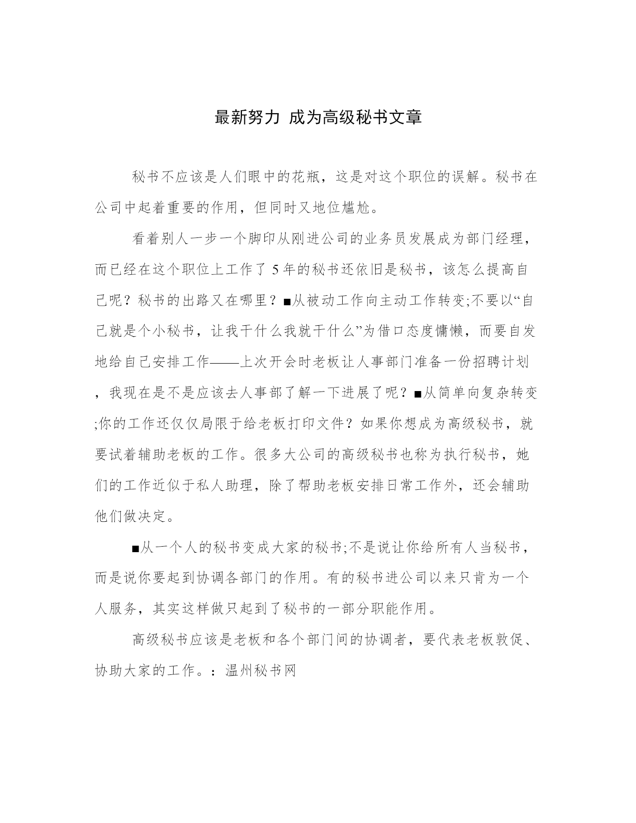 最新努力成为高级秘书文章秘书不应该是人们眼中的花瓶,这是对这个职位的误解。秘书在公司中起着重要的作用,但同时又地位尴尬。看着别人一步一个脚印从刚进公司的业务员发展成为部门经理,而已经在这个职位上工作了5年的秘书还依旧是秘书,该怎么提高自己呢?秘书的出路又在哪里?■从被动工作向主动工作转变;不要以“自己就是个小秘书,让我干什么我就干什么”为借口态度慵懒,而要自发地给自己安排工作——上次开会时老板让人事部门准备一份招聘计划,我现在是不是应该去人事部了解一下进展了呢?■从简单向复杂转变;你的工作还仅仅局限于给老板打印文件?如果你想成为高级秘书,就要试着辅助老板的工作。很多大公司的高级秘书也称为执行秘书,她们的工作近似于私人助理,除了帮助老板安排日常工作外,还会辅助他们做决定。■从一个人的秘书变成大家的秘书;不是说让你给所有人当秘书,而是说你要起到协调各部门的作用。有的秘书进公司以来只肯为一个人服务,其实这样做只起到了秘书的一部分职能作用。高级秘书应该是老板和各个部门间的协调者,要代表老板敦促、协助大家的工作。:温州秘书网
