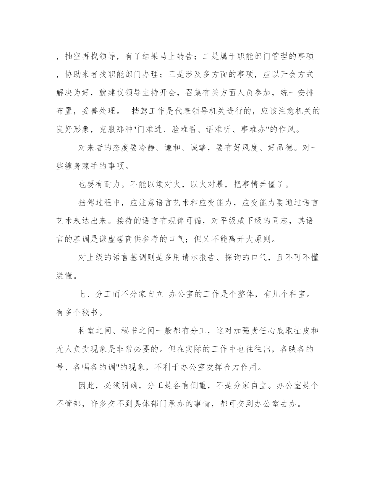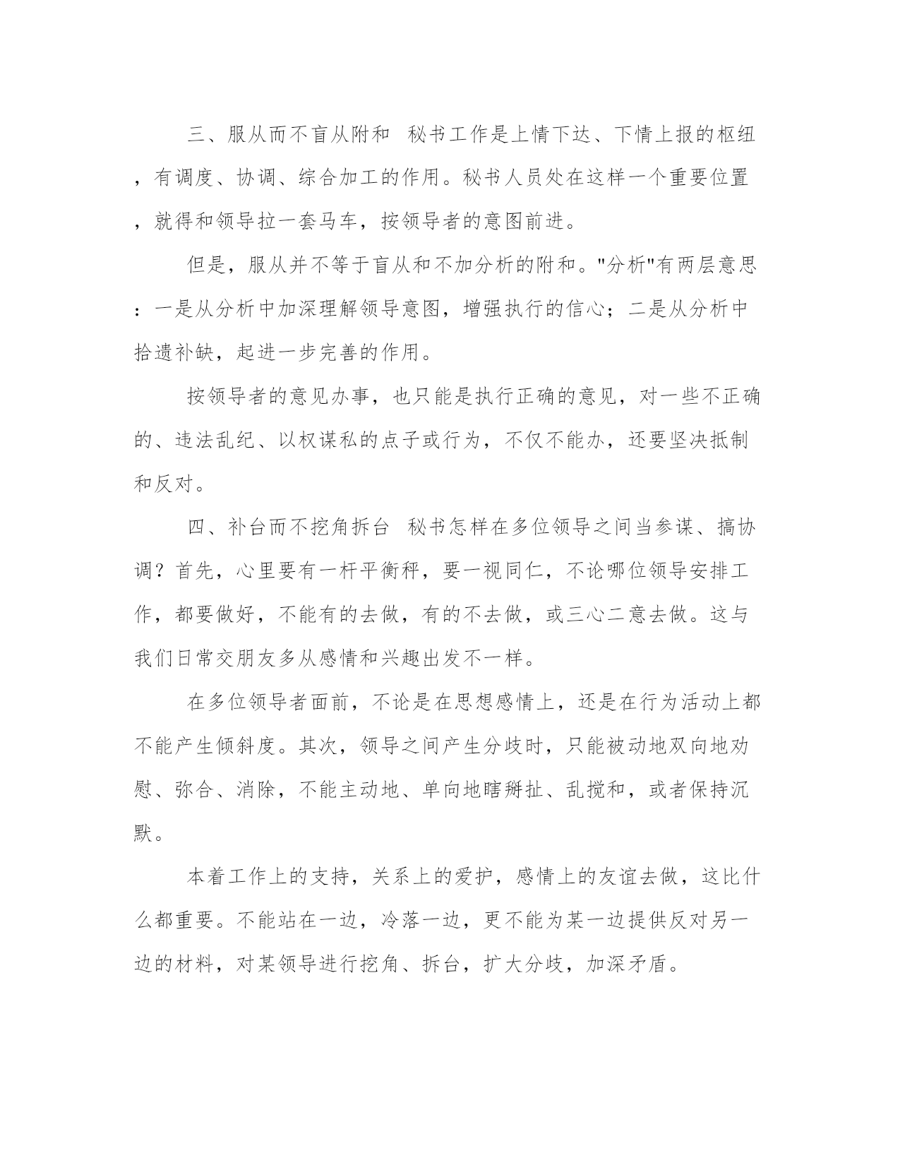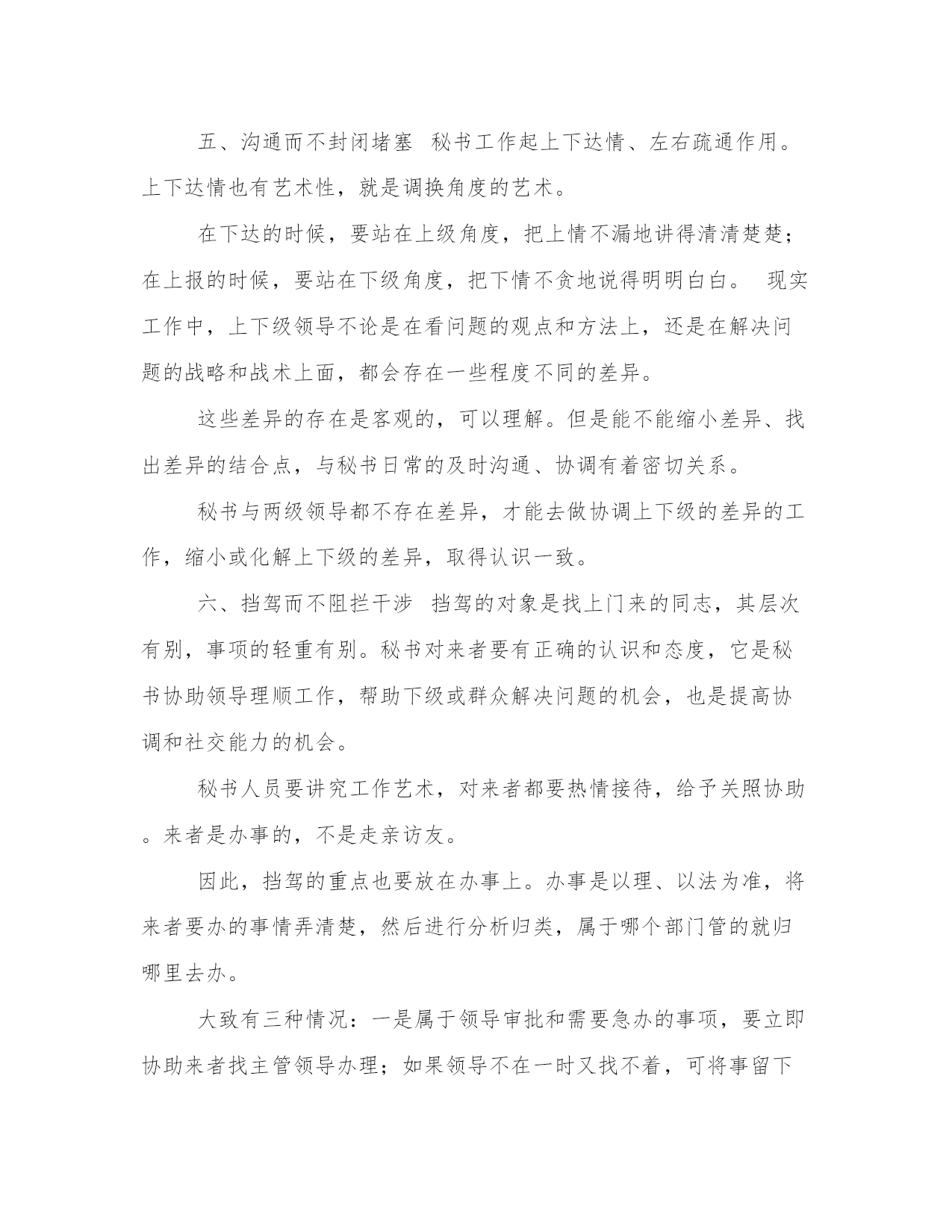 最新秘书工作艺术谈3范文秘书工作的艺术性,表现在技能与技巧的运用上面。要想做一名好秘书,不仅仅要明确认识自己所处的位置,找准自己的坐标,要具备广博的科学知识,还要懂得一系列工作方法和工作艺术。其方法和艺术主要体现在"三服务"方面。那么,怎样表现秘书工作的艺术呢?一、尊重而不奉承吹捧理顺与领导的关系,是秘书工如果某项工作,正职(或常委会)决定由某一副职负责去抓,秘书在配合进行这项工作时就应该以这位负责的副职领导为轴心进行运转。有关这项工作的请示、汇报工作,就直接对这位副职,不要越过他再向正职或其他副职请示、汇报了。关于向正职请示、汇报,或向其他副职沟通情况,那是负责这项工作的副职的责任。秘书如搞多头请示、汇报,就是多余,会把事情弄乱。实践证明,多位领导者,就有多种个性特点或类型。要根据领导者的性格类型相处,逆着来往往会出问题。如内向性格的领导,喜欢独自思考问题与办理事务;外向性格的领导,善于人际交往,喜欢同别人一起商量工作。对待前者,秘书最好是在事前当参谋,事后做助手,当领导在独立思考的时候,就不?quot;参谋"了,否则,就会干扰他的思考。对待后者,要及时协助他组织人员共同商量工作,秘书要有分寸地参与其中,发挥参谋和助手作用。在与多位领导相处时,一定要以事业为重,从工作出发,尽力维护领导班子的团结和威信,不能从感情出发、看人行事;不能表现出靠近谁、疏远谁,听从谁、不听从谁的行为;更不能当甲领导面吹捧乙领导,当乙领导面吹捧丙领导等。要始终与多位领导者保持经得起考验的革命同志式的纯洁、真诚的友谊。二、主动而不越位脱轨秘书工作是以领导工作为轴心,要紧紧围绕这一轴心,进行上下、左右、前后同步运行的辅助性工作。辅助性决定了秘书工作的被动性。怎样变被动为主动,要看秘书的工作艺术。有四个方面:一是争取同领导者一样了解和掌握全局性工作;二是争取同领导者一样了解和掌握一个时期的中心工作,能够分清工作的轻重缓急,主动排除干扰中心工作的事项;三是分析领导工作的思路,分析领导的意图,并加以理解、完善和落实,四是积累和储存有关工作资料,该记住的要记熟,该保存的要保存。有了这四个方面的基础,工作中才能与领导者有一致的认识,才有共同情感和语言,商量工作时,补充和修正的意见,才能提到点子上。日常工作中,要善于将领导的决策内容、实施方案和一个时期的中心工作进行分解、立项,明确先做什么、后做什么和怎样做的措施等,按计划列出个明细运行图。三、服从而不盲从附和秘书工作是上情下达、下情上报的枢纽,有调度、协调、综合加工的作用。秘书人员处在这样一个重要位置,就得和领导拉一套马车,按领导者的意图前进。但是,服从并不等于盲从和不加分析的附和。"分析"有两层意思:一是从分析中加深理解领导意图,增强执行的信心;二是从分析中拾遗补缺,起进一步完善的作用。按领导者的意见办事,也只能是执行正确的意见,对一些不正确的、违法乱纪、以权谋私的点子或行为,不仅不能办,还要坚决抵制和反对。四、补台而不挖角拆台秘书怎样在多位领导之间当参谋、搞协调?首先,心里要有一杆平衡秤,要一视同仁,不论哪位领导安排工作,都要做好,不能有的去做,有的不去做,或三心二意去做。这与我们日常交朋友多从感情和兴趣出发不一样。在多位领导者面前,不论是在思想感情上,还是在行为活动上都不能产生倾斜度。其次,领导之间产生分歧时,只能被动地双向地劝慰、弥合、消除,不能主动地、单向地瞎掰扯、乱搅和,或者保持沉默。本着工作上的支持,关系上的爱护,感情上的友谊去做,这比什么都重要。不能站在一边,冷落一边,更不能为某一边提供反对另一边的材料,对某领导进行挖角、拆台,扩大分歧,加深矛盾。五、沟通而不封闭堵塞秘书工作起上下达情、左右疏通作用。上下达情也有艺术性,就是调换角度的艺术。在下达的时候,要站在上级角度,把上情不漏地讲得清清楚楚;在上报的时候,要站在下级角度,把下情不贪地说得明明白白。现实工作中,上下级领导不论是在看问题的观点和方法上,还是在解决问题的战略和战术上面,都会存在一些程度不同的差异。这些差异的存在是客观的,可以理解。但是能不能缩小差异、找出差异的结合点,与秘书日常的及时沟通、协调有着密切关系。秘书与两级领导都不存在差异,才能去做协调上下级的差异的工作,缩小或化解上下级的差异,取得认识一致。六、挡驾而不阻拦干涉挡驾的对象是找上门来的同志,其层次有别,事项的轻重有别。秘书对来者要有正确的认识和态度,它是秘书协助领导理顺工作,帮助下级或群众解决问题的机会,也是提高协调和社交能力的机会。秘书人员要讲究工作艺术,对来者都要热情接待,给予关照协助。来者是办事的,不是走亲访友。因此,挡驾的重点也要放在办事上。办事是以理、以法为准,将来者要办的事情弄清楚,然后进行分析归类,属于哪个部门管的就归哪里去办。大致有三种情况:一是属于领导审批和需