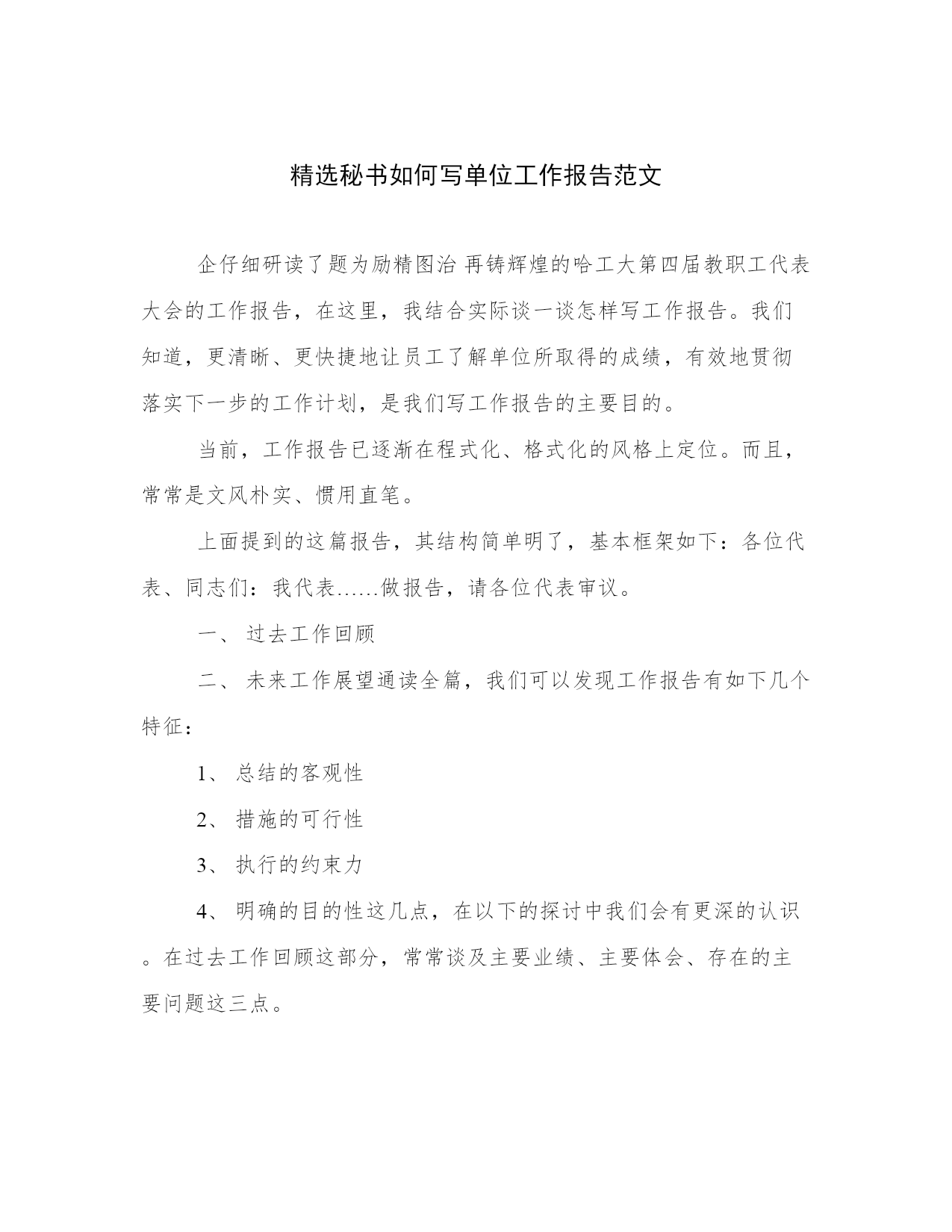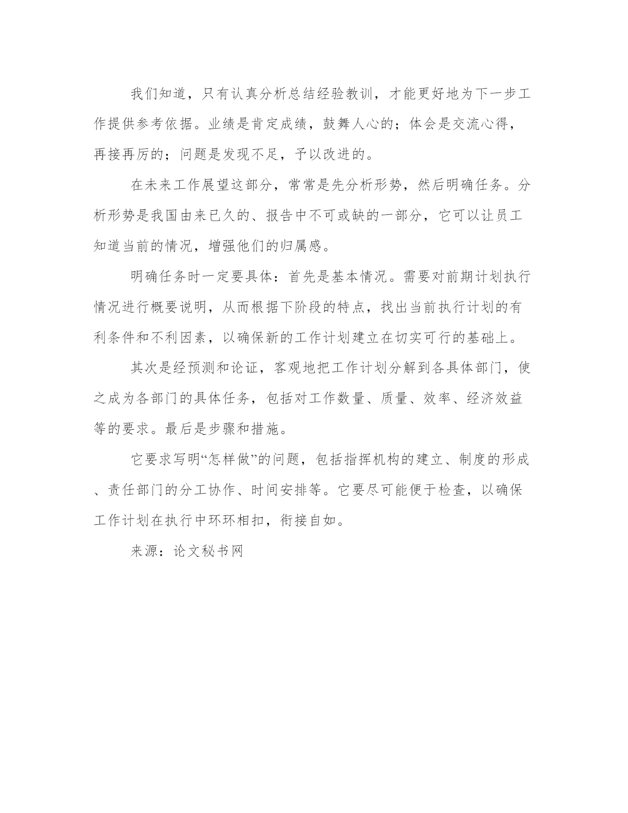 精选秘书如何写单位工作报告范文企仔细研读了题为励精图治再铸辉煌的哈工大第四届教职工代表大会的工作报告,在这里,我结合实际谈一谈怎样写工作报告。我们知道,更清晰、更快捷地让员工了解单位所取得的成绩,有效地贯彻落实下一步的工作计划,是我们写工作报告的主要目的。当前,工作报告已逐渐在程式化、格式化的风格上定位。而且,常常是文风朴实、惯用直笔。上面提到的这篇报告,其结构简单明了,基本框架如下:各位代表、同志们:我代表……做报告,请各位代表审议。一、过去工作回顾二、未来工作展望通读全篇,我们可以发现工作报告有如下几个特征:1、总结的客观性2、措施的可行性3、执行的约束力4、明确的目的性这几点,在以下的探讨中我们会有更深的认识。在过去工作回顾这部分,常常谈及主要业绩、主要体会、存在的主要问题这三点。我们知道,只有认真分析总结经验教训,才能更好地为下一步工作提供参考依据。业绩是肯定成绩,鼓舞人心的;体会是交流心得,再接再厉的;问题是发现不足,予以改进的。在未来工作展望这部分,常常是先分析形势,然后明确任务。分析形势是我国由来已久的、报告中不可或缺的一部分,它可以让员工知道当前的情况,增强他们的归属感。明确任务时一定要具体:首先是基本情况。需要对前期计划执行情况进行概要说明,从而根据下阶段的特点,找出当前执行计划的有利条件和不利因素,以确保新的工作计划建立在切实可行的基础上。其次是经预测和论证,客观地把工作计划分解到各具体部门,使之成为各部门的具体任务,包括对工作数量、质量、效率、经济效益等的要求。最后是步骤和措施。它要求写明“怎样做”的问题,包括指挥机构的建立、制度的形成、责任部门的分工协作、时间安排等。它要尽可能便于检查,以确保工作计划在执行中环环相扣,衔接自如。来源:论文秘书网