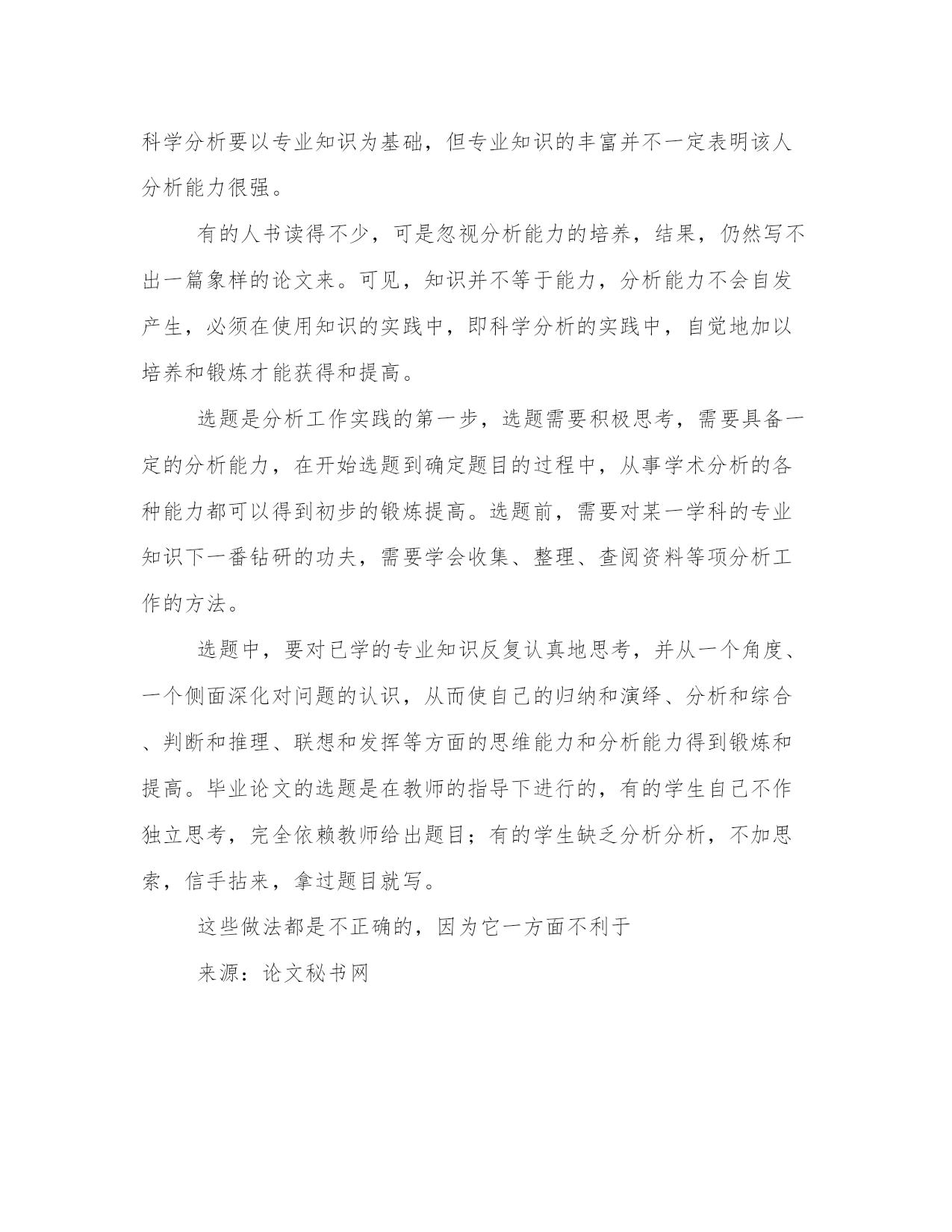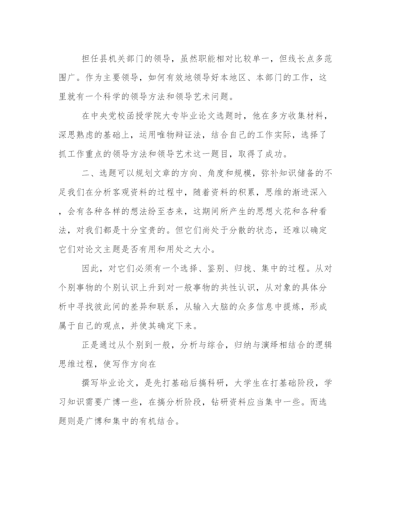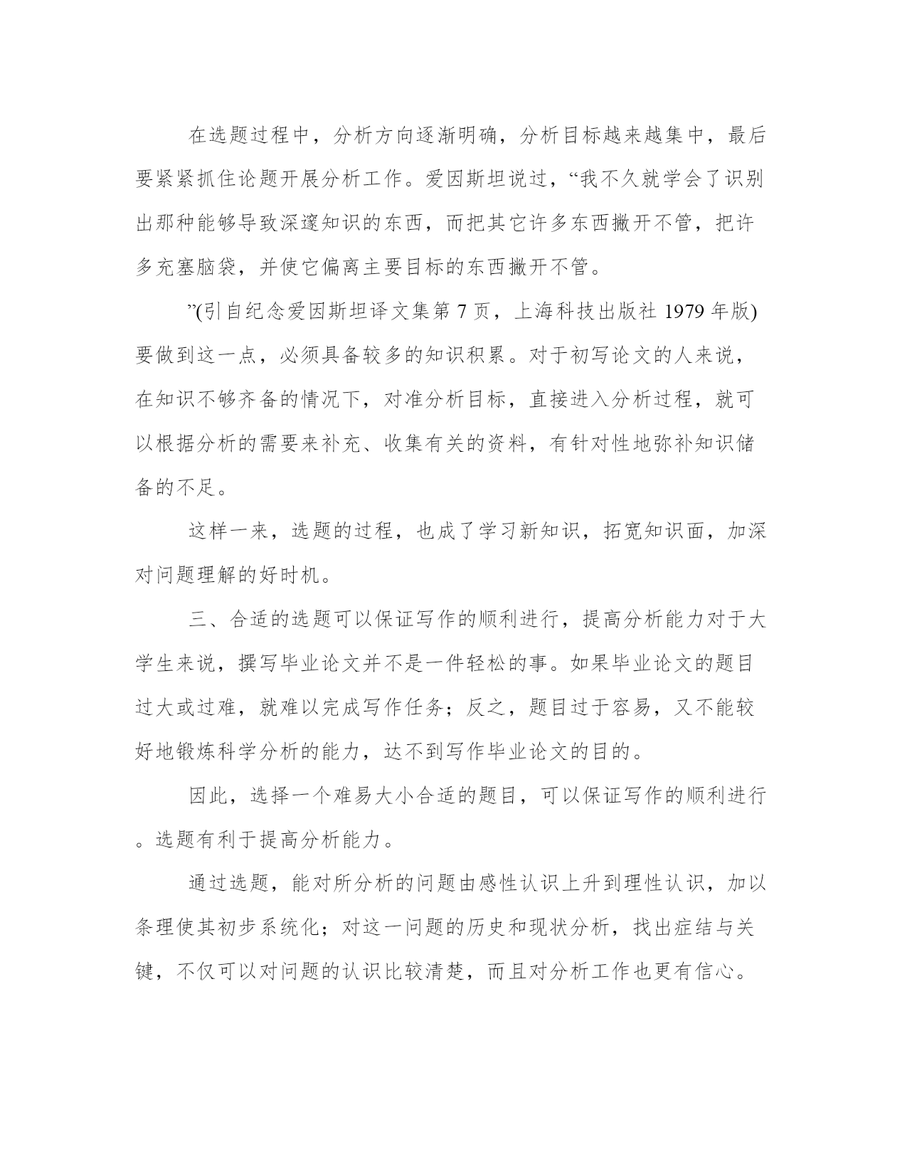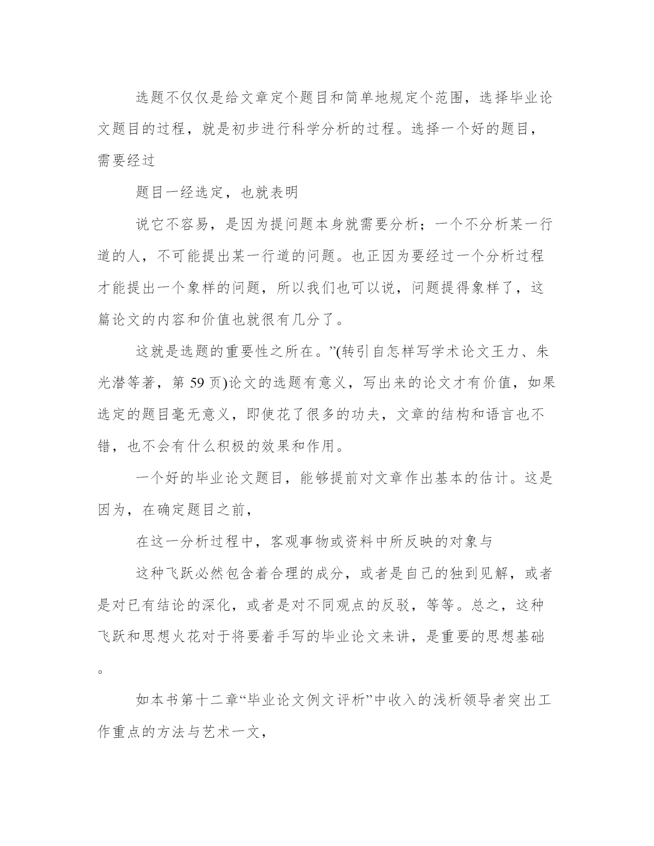 精选论文选题的重要性例文所谓选题,顾名思义,就是选择毕业论文的论题,即在写论文前,选择确定所要分析论证的问题。在论述选题问题时,我们首先应当把课题、论题、题目三个概念搞清楚。这三者同属于某一学科中的学术问题,但又有所区别。首先,论题不同于课题。课题通常是指某一学科重大的科研项目,它的分析范围比论题大得多。比如,社会主义精神文明建设就是一个大课题,其中包括许多论题,如精神文明的地位和作用,精神文明的内容和特点,精神文明和物质文明的关系,精神文明中的文化、教育、科学的发展,思想道德的建设,等等。其次,论题又不同于题目。题目是指论文的标题,它的分析范围一般比论题要小。比如通过选题,可以大体看出提出问题是解决问题的第一步,选准了论题,就等于完成论文写作的一半,题目选得好,可以起到事半功倍的作用。一、选题能够决定毕业论文的价值和效用毕业论文的成果与价值,最终当然要由文章的最后完成和客观效用来评定。但选题对其有重要作用。选题不仅仅是给文章定个题目和简单地规定个范围,选择毕业论文题目的过程,就是初步进行科学分析的过程。选择一个好的题目,需要经过题目一经选定,也就表明说它不容易,是因为提问题本身就需要分析;一个不分析某一行道的人,不可能提出某一行道的问题。也正因为要经过一个分析过程才能提出一个象样的问题,所以我们也可以说,问题提得象样了,这篇论文的内容和价值也就很有几分了。这就是选题的重要性之所在。”(转引自怎样写学术论文王力、朱光潜等著,)论文的选题有意义,写出来的论文才有价值,如果选定的题目毫无意义,即使花了很多的功夫,文章的结构和语言也不错,也不会有什么积极的效果和作用。一个好的毕业论文题目,能够提前对文章作出基本的估计。这是因为,在确定题目之前,在这一分析过程中,客观事物或资料中所反映的对象与这种飞跃必然包含着合理的成分,或者是自己的独到见解,或者是对已有结论的深化,或者是对不同观点的反驳,等等。总之,这种飞跃和思想火花对于将要着手写的毕业论文来讲,是重要的思想基础。如本书第十二章“毕业论文例文评析”中收入的浅析领导者突出工作重点的方法与艺术一文,担任县机关部门的领导,虽然职能相对比较单一,但线长点多范围广。作为主要领导,如何有效地领导好本地区、本部门的工作,这里就有一个科学的领导方法和领导艺术问题。在中央党校函授学院大专毕业论文选题时,他在多方收集材料,深思熟虑的基础上,运用唯物辩证法,结合自己的工作实际,选择了抓工作重点的领导方法和领导艺术这一题目,取得了成功。二、选题可以规划文章的方向、角度和规模,弥补知识储备的不足我们在分析客观资料的过程中,随着资料的积累,思维的渐进深入,会有各种各样的想法纷至杏来,这期间所产生的思想火花和各种看法,对我们都是十分宝贵的。但它们尚处于分散的状态,还难以确定它们对论文主题是否有用和用处之大小。因此,对它们必须有一个选择、鉴别、归拢、集中的过程。从对个别事物的个别认识上升到对一般事物的共性认识,从对象的具体分析中寻找彼此间的差异和联系,从输入大脑的众多信息中提炼,形成属于自己的观点,并使其确定下来。正是通过从个别到一般,分析与综合,归纳与演绎相结合的逻辑思维过程,使写作方向在撰写毕业论文,是先打基础后搞科研,大学生在打基础阶段,学习知识需要广博一些,在搞分析阶段,钻研资料应当集中一些。而选题则是广博和集中的有机结合。在选题过程中,分析方向逐渐明确,分析目标越来越集中,最后要紧紧抓住论题开展分析工作。爱因斯坦说过,“我不久就学会了识别出那种能够导致深邃知识的东西,而把其它许多东西撇开不管,把许多充塞脑袋,并使它偏离主要目标的东西撇开不管。”(引自纪念爱因斯坦译文集,上海科技出版社1979年版)要做到这一点,必须具备较多的知识积累。对于初写论文的人来说,在知识不够齐备的情况下,对准分析目标,直接进入分析过程,就可以根据分析的需要来补充、收集有关的资料,有针对性地弥补知识储备的不足。这样一来,选题的过程,也成了学习新知识,拓宽知识面,加深对问题理解的好时机。三、合适的选题可以保证写作的顺利进行,提高分析能力对于大学生来说,撰写毕业论文并不是一件轻松的事。如果毕业论文的题目过大或过难,就难以完成写作任务;反之,题目过于容易,又不能较好地锻炼科学分析的能力,达不到写作毕业论文的目的。因此,选择一个难易大小合适的题目,可以保证写作的顺利进行。选题有利于提高分析能力。通过选题,能对所分析的问题由感性认识上升到理性认识,加以条理使其初步系统化;对这一问题的历史和现状分析,找出症结与关键,不仅可以对问题的认识比较清楚,而且对分析工作也更有信心。科学分析要以专业知识为基础,但专业知识的丰富并不一定表明该人分析能力很强。有的人书读得不少,可是忽视分析能力的培养,结果,仍然写不出一篇象样的论文来。可见,知识并不等于能力,