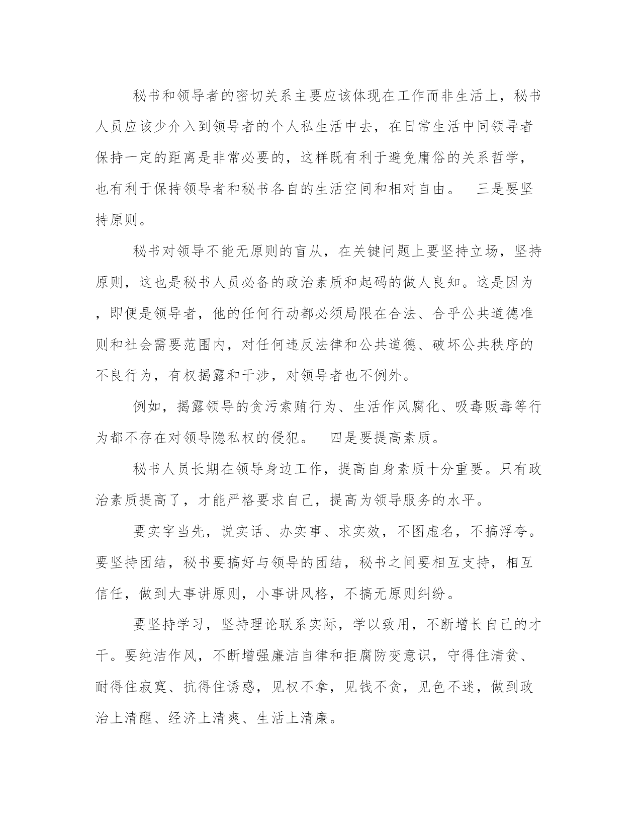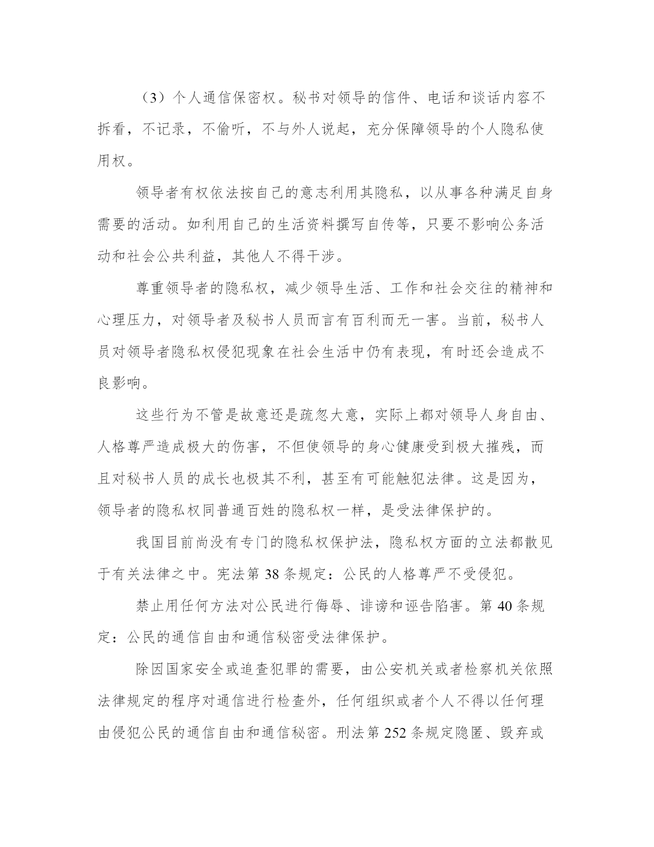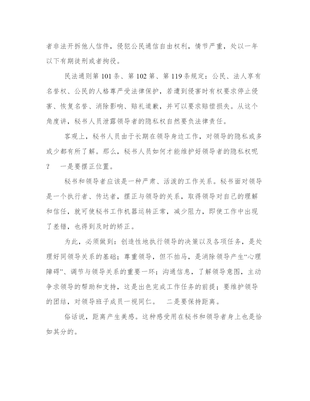 精选秘书如何维护上司的隐私权范文隐私权的概念和理论首先是由美国学者于1890年提出的,隐私权被视为一种民事权利并受法律的保护,完全是现代法律制度的产物。所谓隐私权,实际上就是自己个人私事,个人信息等个人生活领域的事情不为他人知悉,禁止他人干涉的权利。作为领导者,由于其工作身份的特殊,不但是各类传媒而且是大众关注的热点。因此,作为领导者身边的秘书人员,维护好领导的隐私权,不但是工作本身的需要,而且也是对秘书人员的人格要求作为领导者,无论他如何位高权重,仍然是社会意义上的一个人。除了工作之外,仍然需要有自己个人的私秘空间,同时,他也希望这种权利能够充分享有,而不受非法干扰和侵害。一般来说,领导者的隐私权主要包括以下权利内容:(1)个人生活自由。个人能够按照自己的意志从事和不从事某种于社会公共利益无关的活动,不受他人干涉、破坏和支配。(2)个人生活情况保密。有权禁止他人非法利用个人生活有关情况和资料。例如,秘书对领导的日记不能偷看,未经同意不得翻阅领导的抽屉、箱子、个人资料,查看领导的电脑软件资料、银行存款等等,或者宣扬领导的生理缺陷、残疾情况。。(3)个人通信保密权。秘书对领导的信件、电话和谈话内容不拆看,不记录,不偷听,不与外人说起,充分保障领导的个人隐私使用权。领导者有权依法按自己的意志利用其隐私,以从事各种满足自身需要的活动。如利用自己的生活资料撰写自传等,只要不影响公务活动和社会公共利益,其他人不得干涉。尊重领导者的隐私权,减少领导生活、工作和社会交往的精神和心理压力,对领导者及秘书人员而言有百利而无一害。当前,秘书人员对领导者隐私权侵犯现象在社会生活中仍有表现,有时还会造成不良影响。这些行为不管是故意还是疏忽大意,实际上都对领导人身自由、人格尊严造成极大的伤害,不但使领导的身心健康受到极大摧残,而且对秘书人员的成长也极其不利,甚至有可能触犯法律。这是因为,领导者的隐私权同普通百姓的隐私权一样,是受法律保护的。我国目前尚没有专门的隐私权保护法,隐私权方面的立法都散见于有关法律之中。宪法第38条规定:公民的人格尊严不受侵犯。禁止用任何方法对公民进行侮辱、诽谤和诬告陷害。第40条规定:公民的通信自由和通信秘密受法律保护。除因国家安全或追查犯罪的需要,由公安机关或者检察机关依照法律规定的程序对通信进行检查外,任何组织或者个人不得以任何理由侵犯公民的通信自由和通信秘密。刑法第252条规定隐匿、毁弃或者非法开拆他人信件,侵犯公民通信自由权利,情节严重,处以一年以下有期徒刑或者拘役。民法通则第101条、第102第、第119条规定:公民、法人享有名誉权、公民的人格尊严受法律保护,若遭到侵害时有权要求停止侵害、恢复名誉、消除影响、赔礼道歉,并可以要求赔偿损失。从这个角度讲,秘书人员泄露领导者的隐私权自然要负法律责任。客观上,秘书人员由于长期在领导身边工作,对领导的隐私或多或少都有所了解。那么,秘书人员如何才能维护好领导者的隐私权呢?一是要摆正位置。秘书和领导者应该是一种严肃、活泼的工作关系。秘书面对领导是一个执行者、传达者,摆正与领导的关系,取得领导对自己的理解和信任,就可使秘书工作机器运转正常,减少阻力,即使工作中出现了差错,也得到及时的矫正。为此,必须做到:创造性地执行领导的决策以及各项任务,是处理好同领导关系的基础;尊重领导,但不拍马,是消除领导产生“心理障碍”、调节与领导关系的重要一环;沟通信息,了解领导意图,主动争求领导的帮助和支持,这是出色完成工作任务的前提;要维护领导的团结,对领导班子成员一视同仁。二是要保持距离。俗话说,距离产生美感。这种感受用在秘书和领导者身上也是恰如其分的。秘书和领导者的密切关系主要应该体现在工作而非生活上,秘书人员应该少介入到领导者的个人私生活中去,在日常生活中同领导者保持一定的距离是非常必要的,这样既有利于避免庸俗的关系哲学,也有利于保持领导者和秘书各自的生活空间和相对自由。三是要坚持原则。秘书对领导不能无原则的盲从,在关键问题上要坚持立场,坚持原则,这也是秘书人员必备的政治素质和起码的做人良知。这是因为,即便是领导者,他的任何行动都必须局限在合法、合乎公共道德准则和社会需要范围内,对任何违反法律和公共道德、破坏公共秩序的不良行为,有权揭露和干涉,对领导者也不例外。例如,揭露领导的贪污索贿行为、生活作风腐化、吸毒贩毒等行为都不存在对领导隐私权的侵犯。四是要提高素质。秘书人员长期在领导身边工作,提高自身素质十分重要。只有政治素质提高了,才能严格要求自己,提高为领导服务的水平。要实字当先,说实话、办实事、求实效,不图虚名,不搞浮夸。要坚持团结,秘书要搞好与领导的团结,秘书之间要相互支持,相互信任,做到大事讲原则,小事讲风格,不搞无原则纠纷。要坚持学习,坚持理论联系实际,学以致用,不断增长自己的才干。要纯