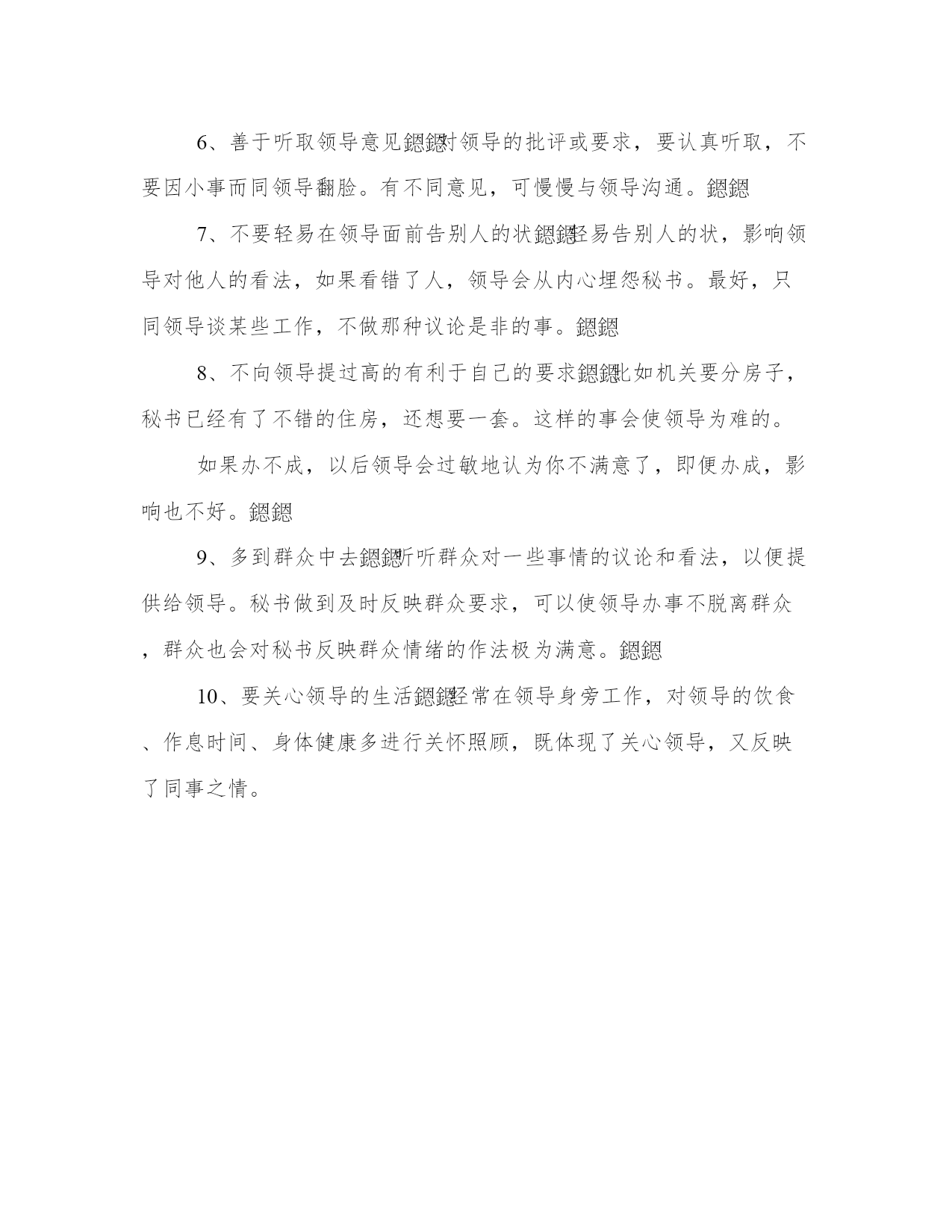 优选秘书宝典十招1、有些事要想到领导前边虽然你要听领导布置工作,但有些事情,秘书要想在领导前边,当好领导参谋。这样做,领导才会感到你是一个好秘书。2、领导布置的工作要提前交卷如写材料、搞调查等,一定争取按领导要求提前一点完成,对于按照要求完不成的任务,要提前向领导打招呼,使领导早有安排,免得被动。3、注意保密工作秘书和在领导身边工作的职员,知道好多机密事情,有的事要比其他群众早一些时候知道,一定注意保密,不能为了显示自己的优越,随意乱说。泄密的秘书是不称职的,而且会给领导添麻烦的。4、负责做领导与他人的沟通工作当领导与另外领导或其他人发生矛盾时,做秘书工作的不能在领导面前火上加油,而要做领导的思想工作,使其消气,并为领导向他人沟通,使矛盾尽快消除,别人会以为秘书的行动是受他的领导指使的。5、平时多给领导提供资料领导比较忙,有一些材料顾不上看,秘书就要将有关资料及时提供给领导,这会对他的决策有参考价值。6、善于听取领导意见对领导的批评或要求,要认真听取,不要因小事而同领导翻脸。有不同意见,可慢慢与领导沟通。7、不要轻易在领导面前告别人的状轻易告别人的状,影响领导对他人的看法,如果看错了人,领导会从内心埋怨秘书。最好,只同领导谈某些工作,不做那种议论是非的事。8、不向领导提过高的有利于自己的要求比如机关要分房子,秘书已经有了不错的住房,还想要一套。这样的事会使领导为难的。如果办不成,以后领导会过敏地认为你不满意了,即便办成,影响也不好。9、多到群众中去听听群众对一些事情的议论和看法,以便提供给领导。秘书做到及时反映群众要求,可以使领导办事不脱离群众,群众也会对秘书反映群众情绪的作法极为满意。10、要关心领导的生活经常在领导身旁工作,对领导的饮食、作息时间、身体健康多进行关怀照顾,既体现了关心领导,又反映了同事之情。