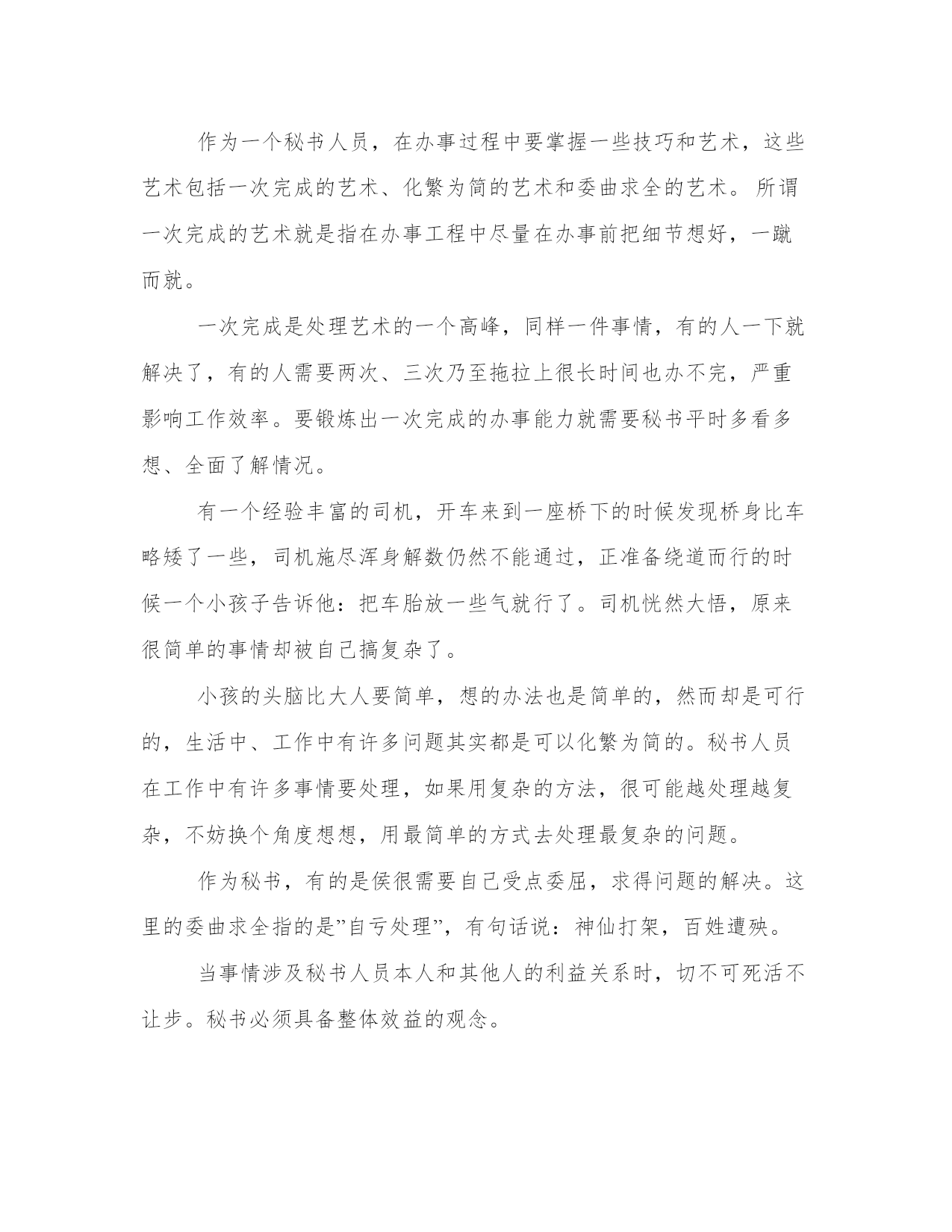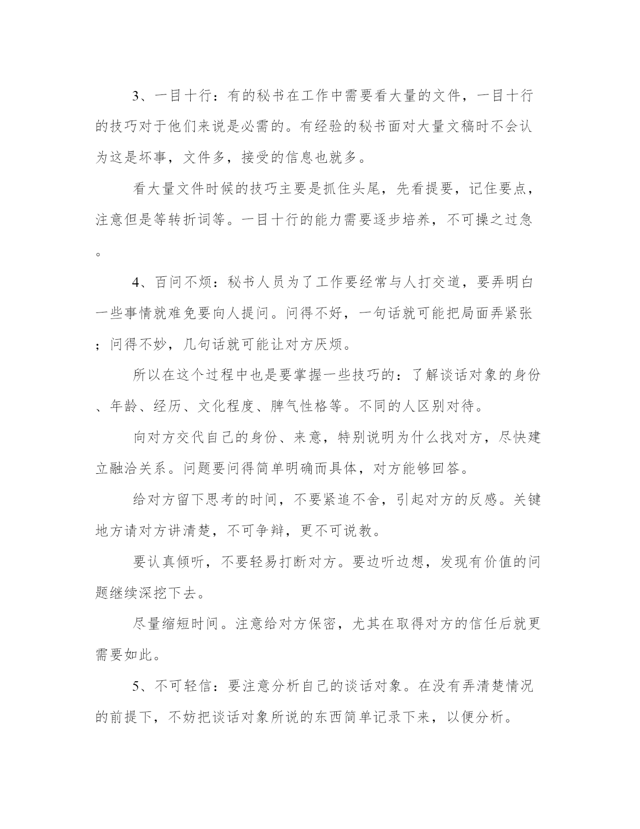优秀做个高效工作的秘书(六)文档社会是复杂的,人也是复杂的。要把一件事情搞清楚是很不容易的。秘书人员由于在工作过程中接触的人多而且杂,所以在处事过程中更需要很多的技巧。这些技巧包括:学会洗耳恭听;处处留心;一目十行;百问不烦;不可轻信等。1、洗耳恭听:秘书是办事的,听懂事情是办好事的前提。在听的过程中秘书要注意不要随便打断别人,不要漫不经心,不要强加于人。这些都是秘书与同事相处时候必须掌握的。作为秘书,经常接触领导,如何倾听领导的谈话,接受指示,领会意图,也是非常重要的。所以秘书要学会注意听,拼命记,听不明白一定要及时请示,以免执行中出现偏差。平时多注意事情的来龙去脉,避免听不明白。此外,秘书还要尽可能站在领导的角度去想问题,这样才能深切领会他们的意图。2、处处留心:越是烦杂的工作就越需要细心。秘书在平时的工作生活中如果不能做到处处留心,办事能力肯定不会提高。3、一目十行:有的秘书在工作中需要看大量的文件,一目十行的技巧对于他们来说是必需的。有经验的秘书面对大量文稿时不会认为这是坏事,文件多,接受的信息也就多。看大量文件时候的技巧主要是抓住头尾,先看提要,记住要点,注意但是等转折词等。一目十行的能力需要逐步培养,不可操之过急。4、百问不烦:秘书人员为了工作要经常与人打交道,要弄明白一些事情就难免要向人提问。问得不好,一句话就可能把局面弄紧张;问得不妙,几句话就可能让对方厌烦。所以在这个过程中也是要掌握一些技巧的:了解谈话对象的身份、年龄、经历、文化程度、脾气性格等。不同的人区别对待。向对方交代自己的身份、来意,特别说明为什么找对方,尽快建立融洽关系。问题要问得简单明确而具体,对方能够回答。给对方留下思考的时间,不要紧追不舍,引起对方的反感。关键地方请对方讲清楚,不可争辩,更不可说教。要认真倾听,不要轻易打断对方。要边听边想,发现有价值的问题继续深挖下去。尽量缩短时间。注意给对方保密,尤其在取得对方的信任后就更需要如此。5、不可轻信:要注意分析自己的谈话对象。在没有弄清楚情况的前提下,不妨把谈话对象所说的东西简单记录下来,以便分析。作为一个秘书人员,在办事过程中要掌握一些技巧和艺术,这些艺术包括一次完成的艺术、化繁为简的艺术和委曲求全的艺术。所谓一次完成的艺术就是指在办事工程中尽量在办事前把细节想好,一蹴而就。一次完成是处理艺术的一个高峰,同样一件事情,有的人一下就解决了,有的人需要两次、三次乃至拖拉上很长时间也办不完,严重影响工作效率。要锻炼出一次完成的办事能力就需要秘书平时多看多想、全面了解情况。有一个经验丰富的司机,开车来到一座桥下的时候发现桥身比车略矮了一些,司机施尽浑身解数仍然不能通过,正准备绕道而行的时候一个小孩子告诉他:把车胎放一些气就行了。司机恍然大悟,原来很简单的事情却被自己搞复杂了。小孩的头脑比大人要简单,想的办法也是简单的,然而却是可行的,生活中、工作中有许多问题其实都是可以化繁为简的。秘书人员在工作中有许多事情要处理,如果用复杂的方法,很可能越处理越复杂,不妨换个角度想想,用最简单的方式去处理最复杂的问题。作为秘书,有的是侯很需要自己受点委屈,求得问题的解决。这里的委曲求全指的是”自亏处理”,有句话说:神仙打架,百姓遭殃。当事情涉及秘书人员本人和其他人的利益关系时,切不可死活不让步。秘书必须具备整体效益的观念。