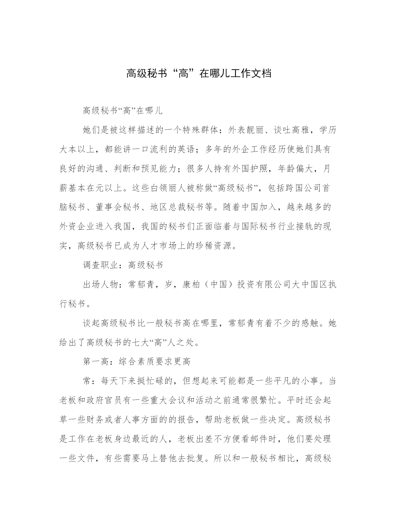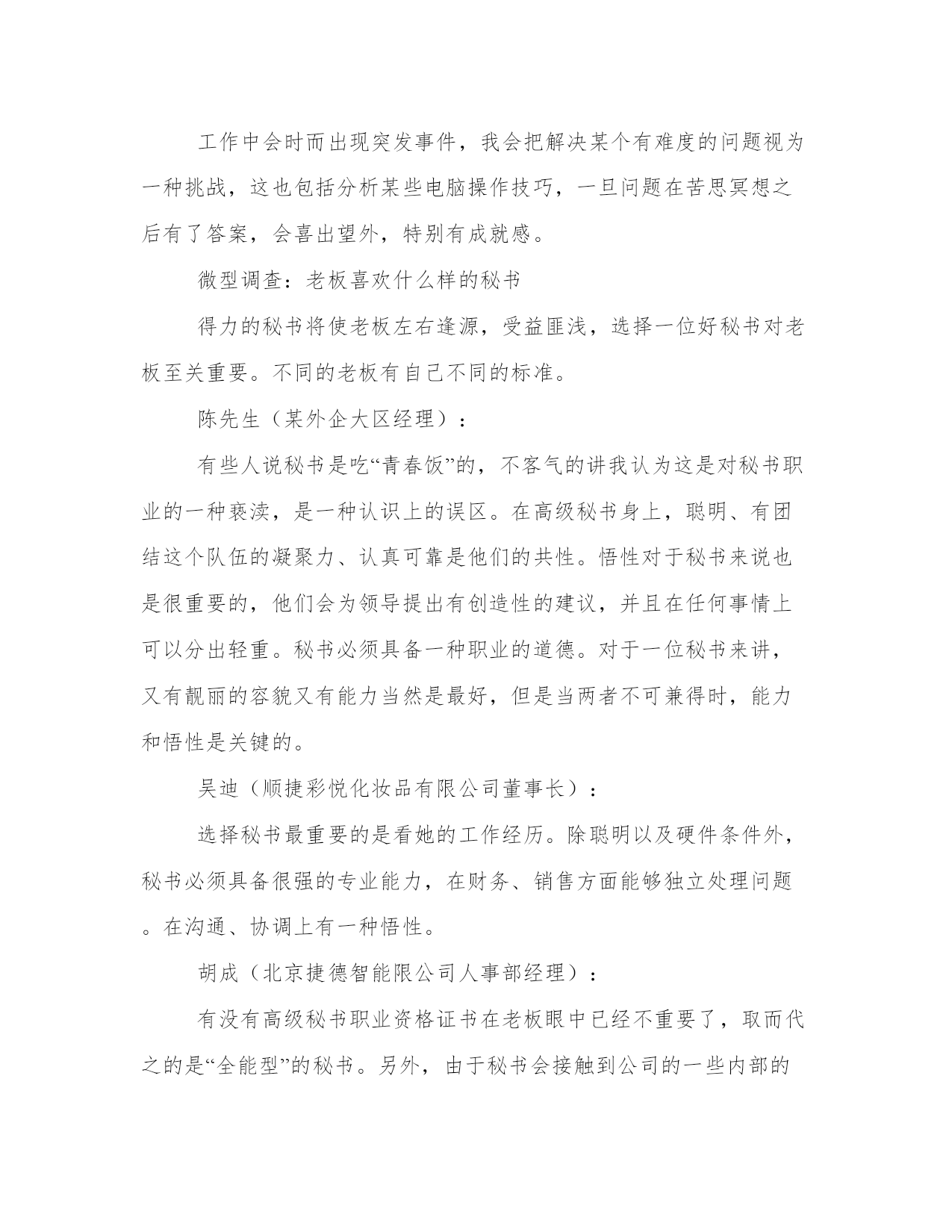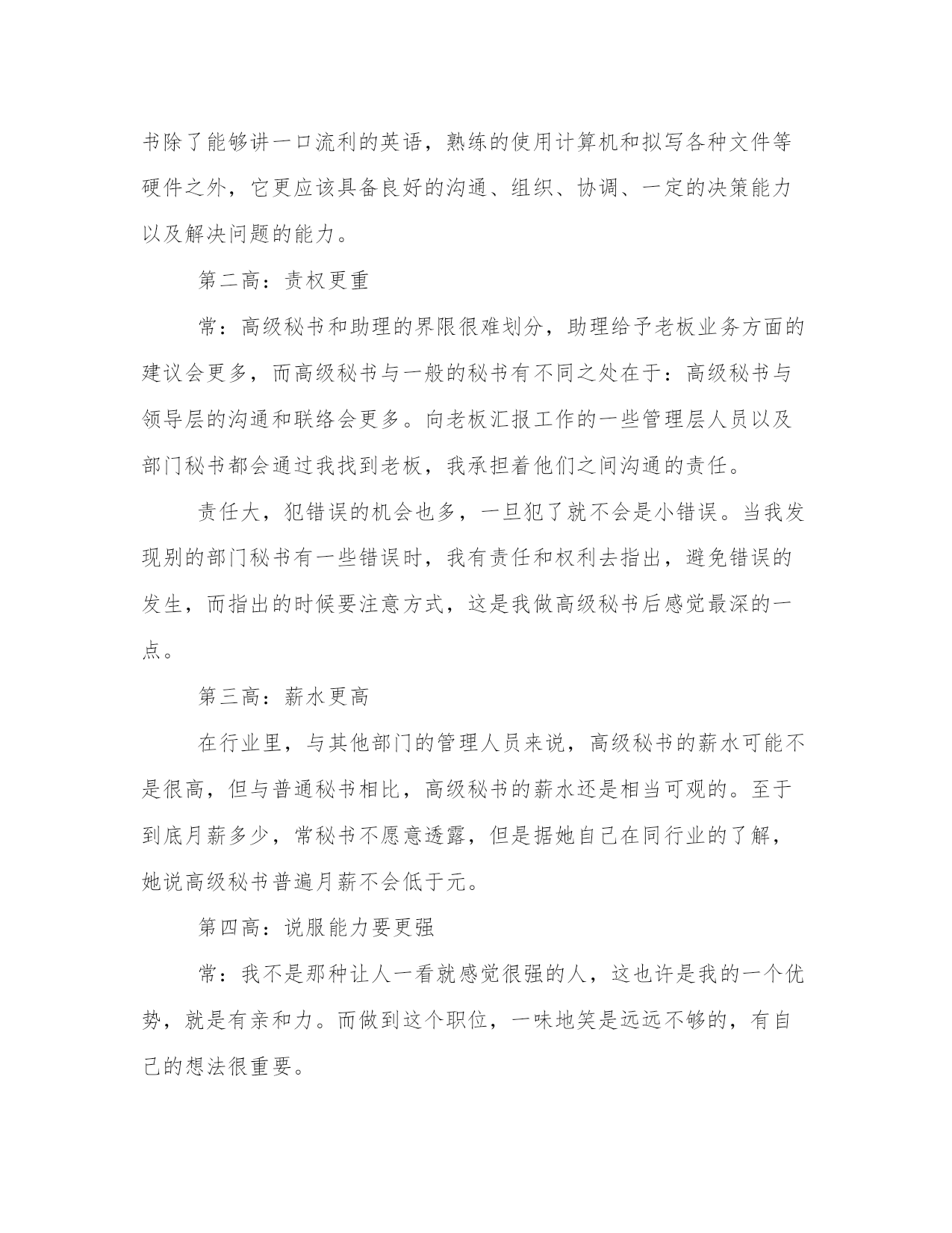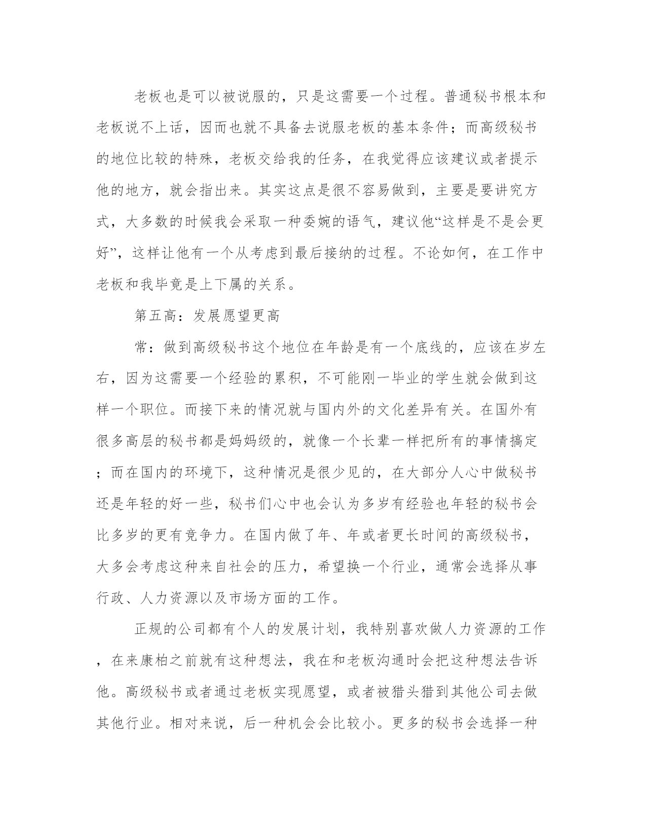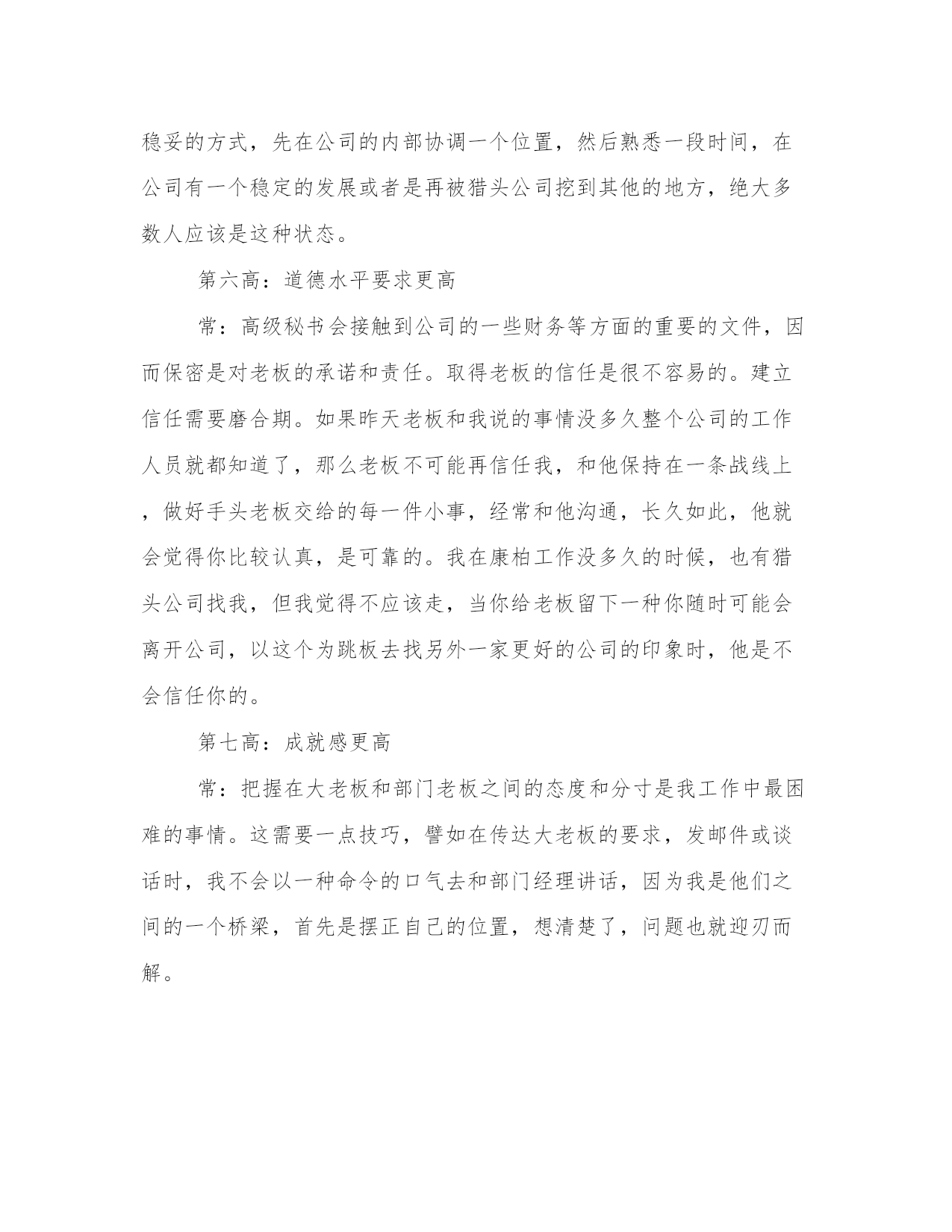 高级秘书“高”在哪儿工作文档高级秘书“高”在哪儿她们是被这样描述的一个特殊群体:外表靓丽、谈吐高雅,学历大本以上,都能讲一口流利的英语;多年的外企工作经历使她们具有良好的沟通、判断和预见能力;很多人持有外国护照,年龄偏大,月薪基本在元以上。这些白领丽人被称做“高级秘书”,包括跨国公司首脑秘书、董事会秘书、地区总裁秘书等。随着中国加入,越来越多的外资企业进入我国,我国的秘书们正面临着与国际秘书行业接轨的现实,高级秘书已成为人才市场上的珍稀资源。调查职业:高级秘书出场人物:常郁青,岁,康柏(中国)投资有限公司大中国区执行秘书。谈起高级秘书比一般秘书高在哪里,常郁青有着不少的感触。她给出了高级秘书的七大“高”人之处。第一高:综合素质要求更高常:每天下来挺忙碌的,但想起来可能都是一些平凡的小事。当老板和政府官员有一些重大会议和活动之前通常很繁忙。平时还会起草一些财务或者人事方面的的报告,帮助老板做一些决定。高级秘书是工作在老板身边最近的人,老板出差不方便看邮件时,他们要处理一些文件,有些需要马上替他去批复。所以和一般秘书相比,高级秘书除了能够讲一口流利的英语,熟练的使用计算机和拟写各种文件等硬件之外,它更应该具备良好的沟通、组织、协调、一定的决策能力以及解决问题的能力。第二高:责权更重常:高级秘书和助理的界限很难划分,助理给予老板业务方面的建议会更多,而高级秘书与一般的秘书有不同之处在于:高级秘书与领导层的沟通和联络会更多。向老板汇报工作的一些管理层人员以及部门秘书都会通过我找到老板,我承担着他们之间沟通的责任。责任大,犯错误的机会也多,一旦犯了就不会是小错误。当我发现别的部门秘书有一些错误时,我有责任和权利去指出,避免错误的发生,而指出的时候要注意方式,这是我做高级秘书后感觉最深的一点。第三高:薪水更高在行业里,与其他部门的管理人员来说,高级秘书的薪水可能不是很高,但与普通秘书相比,高级秘书的薪水还是相当可观的。至于到底月薪多少,常秘书不愿意透露,但是据她自己在同行业的了解,她说高级秘书普遍月薪不会低于元。第四高:说服能力要更强常:我不是那种让人一看就感觉很强的人,这也许是我的一个优势,就是有亲和力。而做到这个职位,一味地笑是远远不够的,有自己的想法很重要。老板也是可以被说服的,只是这需要一个过程。普通秘书根本和老板说不上话,因而也就不具备去说服老板的基本条件;而高级秘书的地位比较的特殊,老板交给我的任务,在我觉得应该建议或者提示他的地方,就会指出来。其实这点是很不容易做到,主要是要讲究方式,大多数的时候我会采取一种委婉的语气,建议他“这样是不是会更好”,这样让他有一个从考虑到最后接纳的过程。不论如何,在工作中老板和我毕竟是上下属的关系。第五高:发展愿望更高常:做到高级秘书这个地位在年龄是有一个底线的,应该在岁左右,因为这需要一个经验的累积,不可能刚一毕业的学生就会做到这样一个职位。而接下来的情况就与国内外的文化差异有关。在国外有很多高层的秘书都是妈妈级的,就像一个长辈一样把所有的事情搞定;而在国内的环境下,这种情况是很少见的,在大部分人心中做秘书还是年轻的好一些,秘书们心中也会认为多岁有经验也年轻的秘书会比多岁的更有竞争力。在国内做了年、年或者更长时间的高级秘书,大多会考虑这种来自社会的压力,希望换一个行业,通常会选择从事行政、人力资源以及市场方面的工作。正规的公司都有个人的发展计划,我特别喜欢做人力资源的工作,在来康柏之前就有这种想法,我在和老板沟通时会把这种想法告诉他。高级秘书或者通过老板实现愿望,或者被猎头猎到其他公司去做其他行业。相对来说,后一种机会会比较小。更多的秘书会选择一种稳妥的方式,先在公司的内部协调一个位置,然后熟悉一段时间,在公司有一个稳定的发展或者是再被猎头公司挖到其他的地方,绝大多数人应该是这种状态。第六高:道德水平要求更高常:高级秘书会接触到公司的一些财务等方面的重要的文件,因而保密是对老板的承诺和责任。取得老板的信任是很不容易的。建立信任需要磨合期。如果昨天老板和我说的事情没多久整个公司的工作人员就都知道了,那么老板不可能再信任我,和他保持在一条战线上,做好手头老板交给的每一件小事,经常和他沟通,长久如此,他就会觉得你比较认真,是可靠的。我在康柏工作没多久的时候,也有猎头公司找我,但我觉得不应该走,当你给老板留下一种你随时可能会离开公司,以这个为跳板去找另外一家更好的公司的印象时,他是不会信任你的。第七高:成就感更高常:把握在大老板和部门老板之间的态度和分寸是我工作中最困难的事情。这需要一点技巧,譬如在传达大老板的要求,发邮件或谈话时,我不会以一种命令的口气去和部门经理讲话,因为我是他们之间的一个桥梁,首先是摆正自己的位置,想清楚了,问题也就迎刃而解。工作中会时而出现突发事件,我会把解决某个有难度的问题