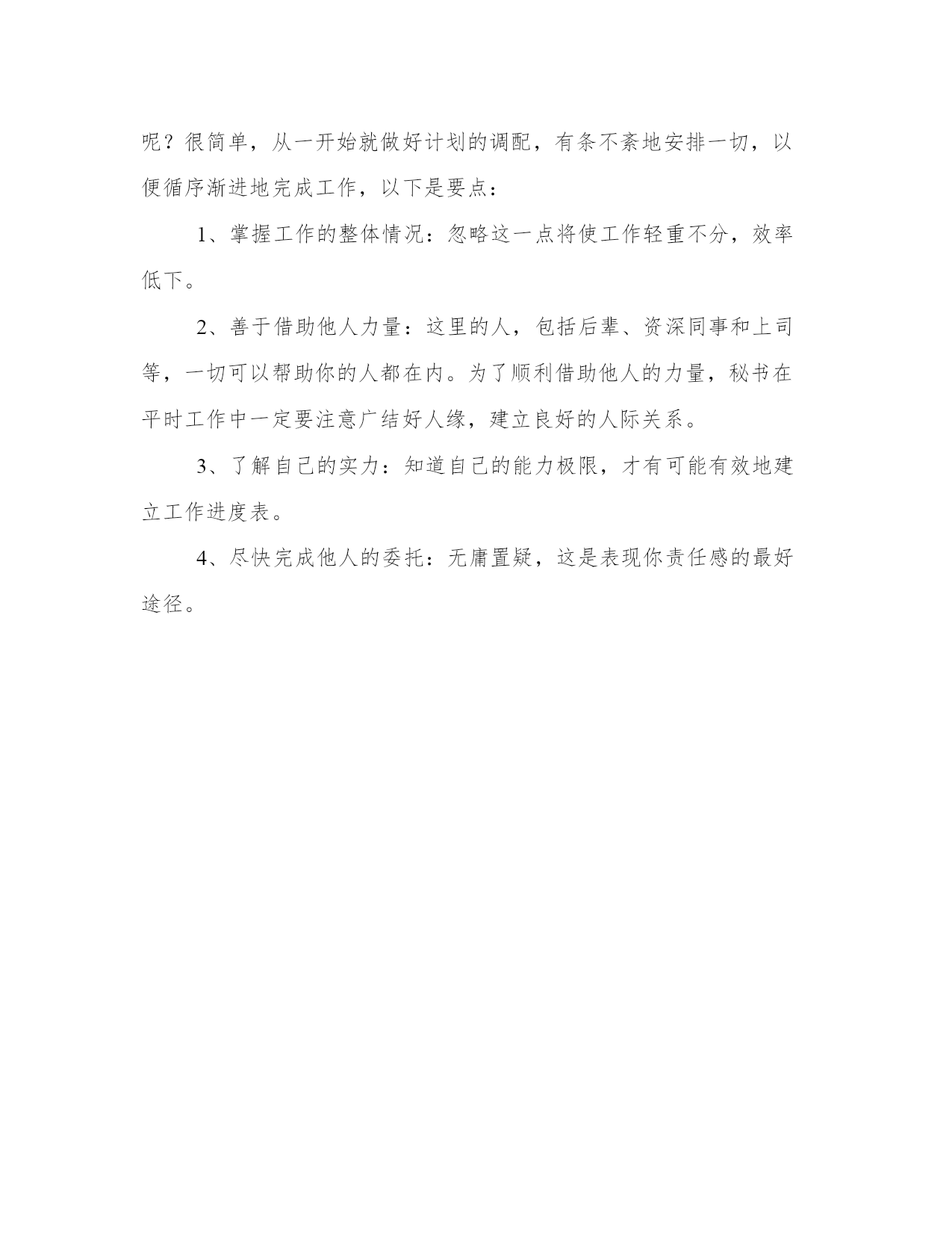精选秘书怎样进行自我调空(四)文档有时候工作一忙,秘书往往容易把老板交代的事情忘了。此时,除了规规矩矩地向上司道歉之外,别无选择。如果因为一时提不起勇气认错而置之不理,反而会使事情更加恶化。道歉也是有学问的。如果道歉时脸上挂着虚假的笑容,或者强词夺理地寻找各种借口和理由,也会使对方更加恼火,不如干脆以真诚的态度,坦白这是因为自己一时不慎而犯下的过错。但是这种情况只许一次,下不为例。如果三番两次地重蹈覆辙,那么不管你如何赔礼道歉,都挽回不了上司对你的评价。每个人的办事效率各有不同,有的人喜欢以平均的速度按部就班进行,有的人却老是拖到有了燃眉之急时才快马加鞭地一气呵成。当然,就一般情形来说,只要能在期限前完成工作,便不至于造成太大的困扰。问题是有些人作风怪异,明明早已经把事情办好了,却把它们压在抽屉里,非得等到有人催促他们才把东西交出来。其实这是非常不好的作风。早一天把工作做好,就早一天交上,不要因为想找清闲就故意积压,给人以不够爽快的感觉。对于秘书,这种作风更不可取。作为一名秘书,把上司交代的事情办好就是本分,但随着工作时间的增加,工作往往越来越多,责任也越来越大,可能加班也完不成当天工作,怎样才能使工作顺利进行呢?很简单,从一开始就做好计划的调配,有条不紊地安排一切,以便循序渐进地完成工作,以下是要点:1、掌握工作的整体情况:忽略这一点将使工作轻重不分,效率低下。2、善于借助他人力量:这里的人,包括后辈、资深同事和上司等,一切可以帮助你的人都在内。为了顺利借助他人的力量,秘书在平时工作中一定要注意广结好人缘,建立良好的人际关系。3、了解自己的实力:知道自己的能力极限,才有可能有效地建立工作进度表。4、尽快完成他人的委托:无庸置疑,这是表现你责任感的最好途径。