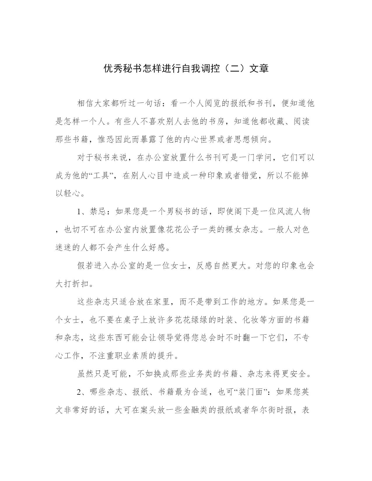 优秀秘书怎样进行自我调控(二)文章相信大家都听过一句话:看一个人阅览的报纸和书刊,便知道他是怎样一个人。有些人不喜欢别人去他的书房,知道他都收藏、阅读那些书籍,惟恐因此而暴露了他的内心世界或者思想倾向。对于秘书来说,在办公室放置什么书刊可是一门学问,它们可以成为他的“工具”,在别人心目中造成一种印象或者错觉,所以不能掉以轻心。1、禁忌:如果您是一个男秘书的话,即使阁下是一位风流人物,也切不可在办公室内放置像花花公子一类的裸女杂志。一般人对色迷迷的人都不会产生什么好感。假若进入办公室的是一位女士,反感自然更大。对您的印象也会大打折扣。这些杂志只适合放在家里,而不是带到工作的地方。如果您是一个女士,也不要在桌子上放许多花花绿绿的时装、化妆等方面的书籍和杂志,这些东西可能会让领导觉得您总会时不时翻一下它们,不专心工作,不注重职业素质的提升。虽然只是可能,不如换成那些业务类的书籍、杂志来得更安全。2、哪些杂志、报纸、书籍最为合适,也可“装门面”:如果您英文非常好的话,大可在案头放一些金融类的报纸或者华尔街时报,表示您是一个很关心经济、金融的行政人员。至于杂志和书籍,以此类推吧。由于格调高,水准高,如果注意到这些,您的上级领导会对你另眼相看的。同时,相信主管们也不会反对把书籍作为道具用,因为这毕竟也代表着公司工作人员的层次和水平,所以,选什么书放在桌子上一定要花些心思。
