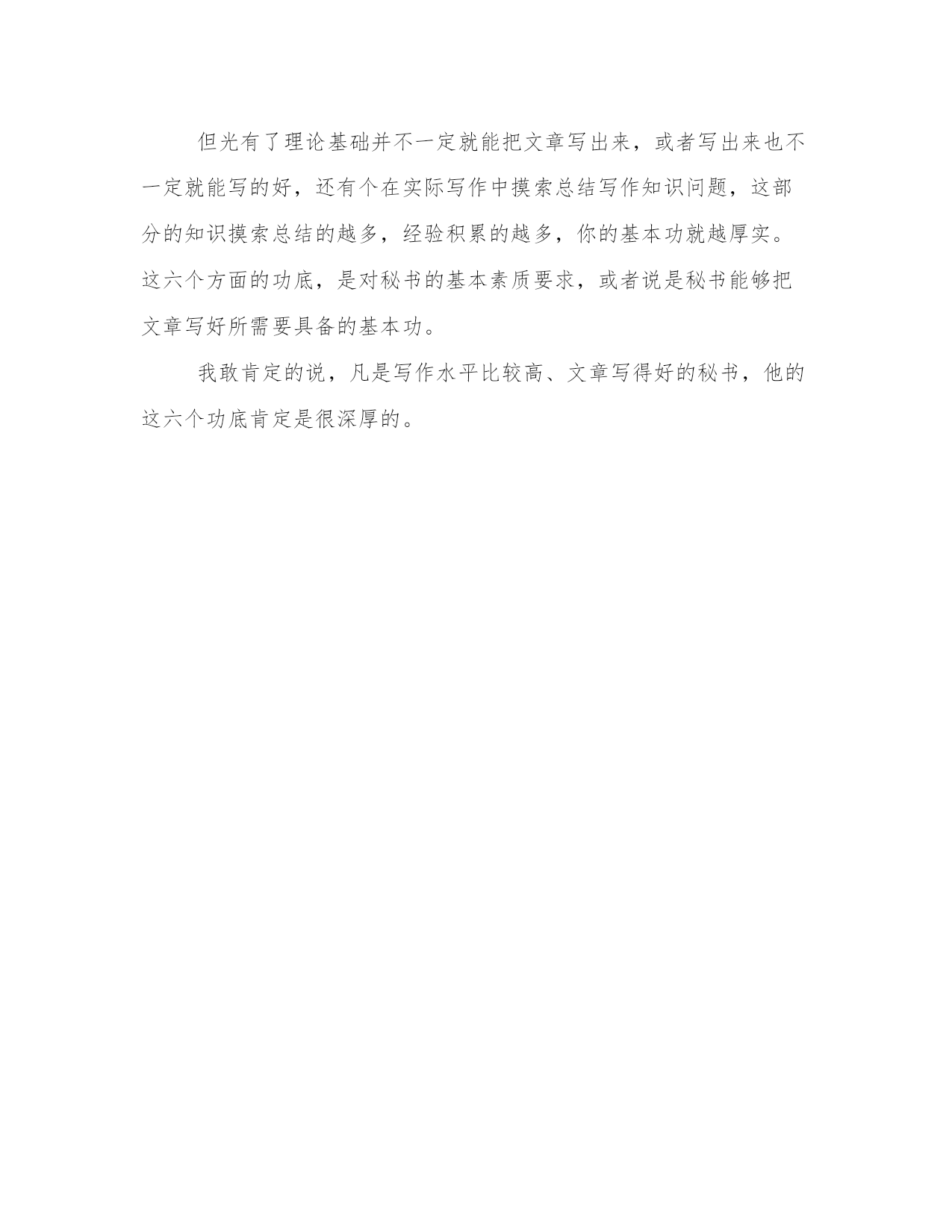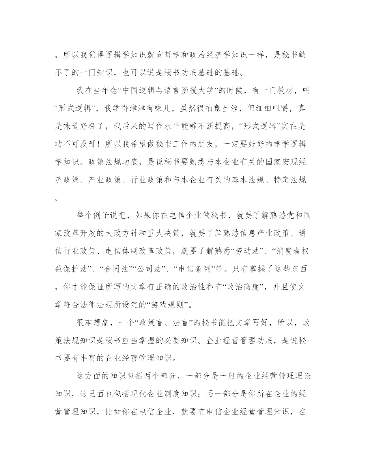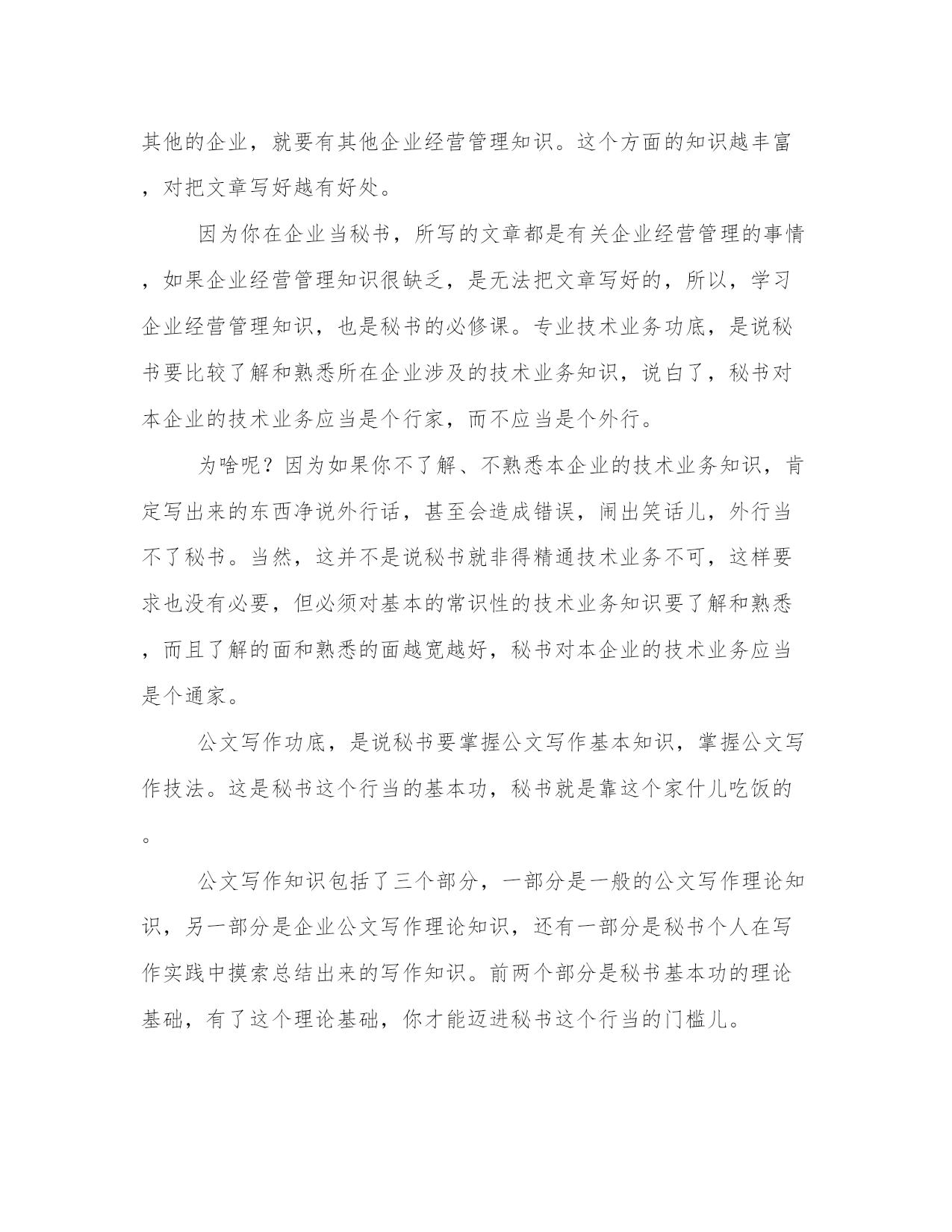 精品做秘书需要哪些基本功底范文做秘书同做其他专业工作一样,需要一些基本功底。这些基本功底,就像盖楼的地基,越厚实越牢固,对做好工作越有利。从我的多年体会看,在秘书这个岗位上,起码要打好六个方面功底,就是政治理论功底、逻辑思维功底、政策法规功底、经营管理功底、专业技术业务功底和公文写作功底。政治理论功底,是说秘书应当懂一点儿哲学和政治经济学的知识。有些人觉得企业秘书懂不懂哲学和政治经济学,对其工作并没有多大关系。我认为这个看法不大正确,我倒觉得秘书必须要懂哲学和政治经济学,这是秘书功底基础的基础。其中的道理很简单,因为秘书是需要有一定思想水平和理论水平的,否则无法把文章写好,而哲学和政治经济,是秘书提高思想水平和理论水平必不可少的知识。我年轻的时候在这方面没少下工夫,主要靠自学,看一些教科书,涉猎一些原著,由于文化低,好多问题弄不明白,但有一股钻劲儿,硬啃,逐渐明白了一些原理。现在回过头看,没有白学,对我做好秘书工作起到了终生受益的作用。所以我劝搞秘书工作的朋友,在学习哲学和政治经济学上应当下一番大的工夫。逻辑思维功底,是说秘书要系统的掌握逻辑知识,有很强的逻辑思维能力。一个文章写得好的秘书,他的脑袋肯定逻辑思维能力很强,所以我觉得逻辑学知识就向哲学和政治经济学知识一样,是秘书缺不了的一门知识,也可以说是秘书功底基础的基础。我在当年念“中国逻辑与语言函授大学”的时候,有一门教材,叫“形式逻辑”,我学得津津有味儿,虽然很抽象生涩,但细细咀嚼,真是味道好极了,我后来的写作水平能够不断提高,“形式逻辑”实在是功不可没呀!所以我希望做秘书工作的朋友,一定要好好的学学逻辑学知识。政策法规功底,是说秘书要熟悉与本企业有关的国家宏观经济政策、产业政策、行业政策和与本企业有关的基本法规、特定法规。举个例子说吧,如果你在电信企业做秘书,就要了解熟悉党和国家改革开放的大政方针和重大决策,就要了解熟悉信息产业政策、通信行业政策、电信体制改革政策,就要了解熟悉“劳动法”、“消费者权益保护法”、“合同法”“公司法”、“电信条列”等。只有掌握了这些东西,你才能保证所写的文章有正确的政治性和有“政治高度”,并且使文章符合法律法规所设定的“游戏规则”。很难想象,一个“政策盲、法盲”的秘书能把文章写好,所以,政策法规知识是秘书应当掌握的必要知识。企业经营管理功底,是说秘书要有丰富的企业经营管理知识。这方面的知识包括两个部分,一部分是一般的企业经营管理理论知识,这里面也包括现代企业制度知识;另一部分是你所在企业的经营管理知识,比如你在电信企业,就要有电信企业经营管理知识,在其他的企业,就要有其他企业经营管理知识。这个方面的知识越丰富,对把文章写好越有好处。因为你在企业当秘书,所写的文章都是有关企业经营管理的事情,如果企业经营管理知识很缺乏,是无法把文章写好的,所以,学习企业经营管理知识,也是秘书的必修课。专业技术业务功底,是说秘书要比较了解和熟悉所在企业涉及的技术业务知识,说白了,秘书对本企业的技术业务应当是个行家,而不应当是个外行。为啥呢?因为如果你不了解、不熟悉本企业的技术业务知识,肯定写出来的东西净说外行话,甚至会造成错误,闹出笑话儿,外行当不了秘书。当然,这并不是说秘书就非得精通技术业务不可,这样要求也没有必要,但必须对基本的常识性的技术业务知识要了解和熟悉,而且了解的面和熟悉的面越宽越好,秘书对本企业的技术业务应当是个通家。公文写作功底,是说秘书要掌握公文写作基本知识,掌握公文写作技法。这是秘书这个行当的基本功,秘书就是靠这个家什儿吃饭的。公文写作知识包括了三个部分,一部分是一般的公文写作理论知识,另一部分是企业公文写作理论知识,还有一部分是秘书个人在写作实践中摸索总结出来的写作知识。前两个部分是秘书基本功的理论基础,有了这个理论基础,你才能迈进秘书这个行当的门槛儿。但光有了理论基础并不一定就能把文章写出来,或者写出来也不一定就能写的好,还有个在实际写作中摸索总结写作知识问题,这部分的知识摸索总结的越多,经验积累的越多,你的基本功就越厚实。这六个方面的功底,是对秘书的基本素质要求,或者说是秘书能够把文章写好所需要具备的基本功。我敢肯定的说,凡是写作水平比较高、文章写得好的秘书,他的这六个功底肯定是很深厚的。