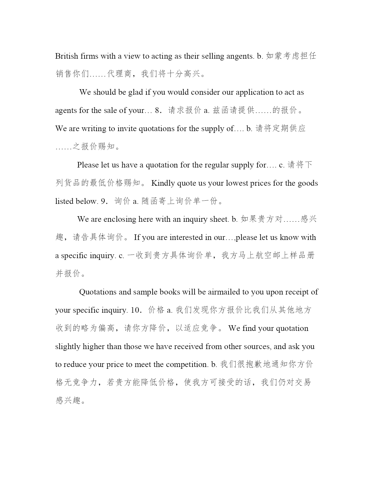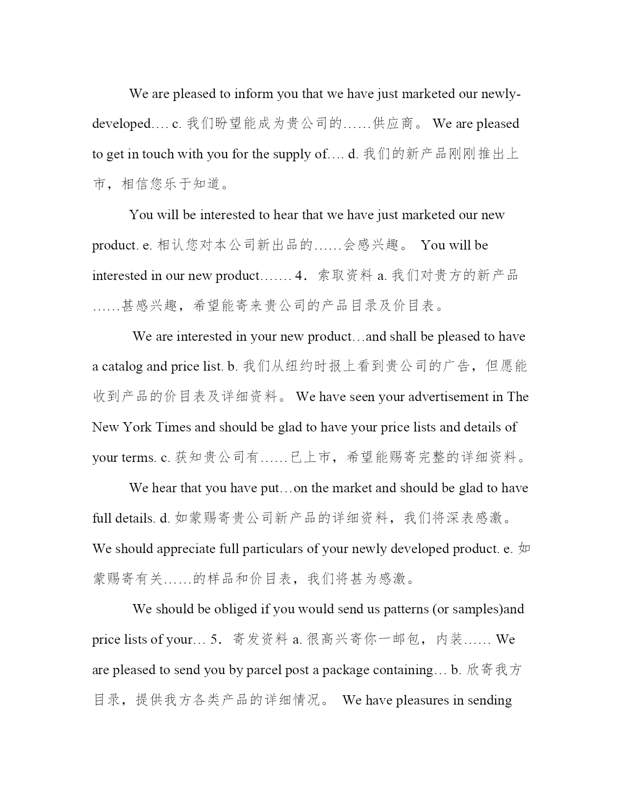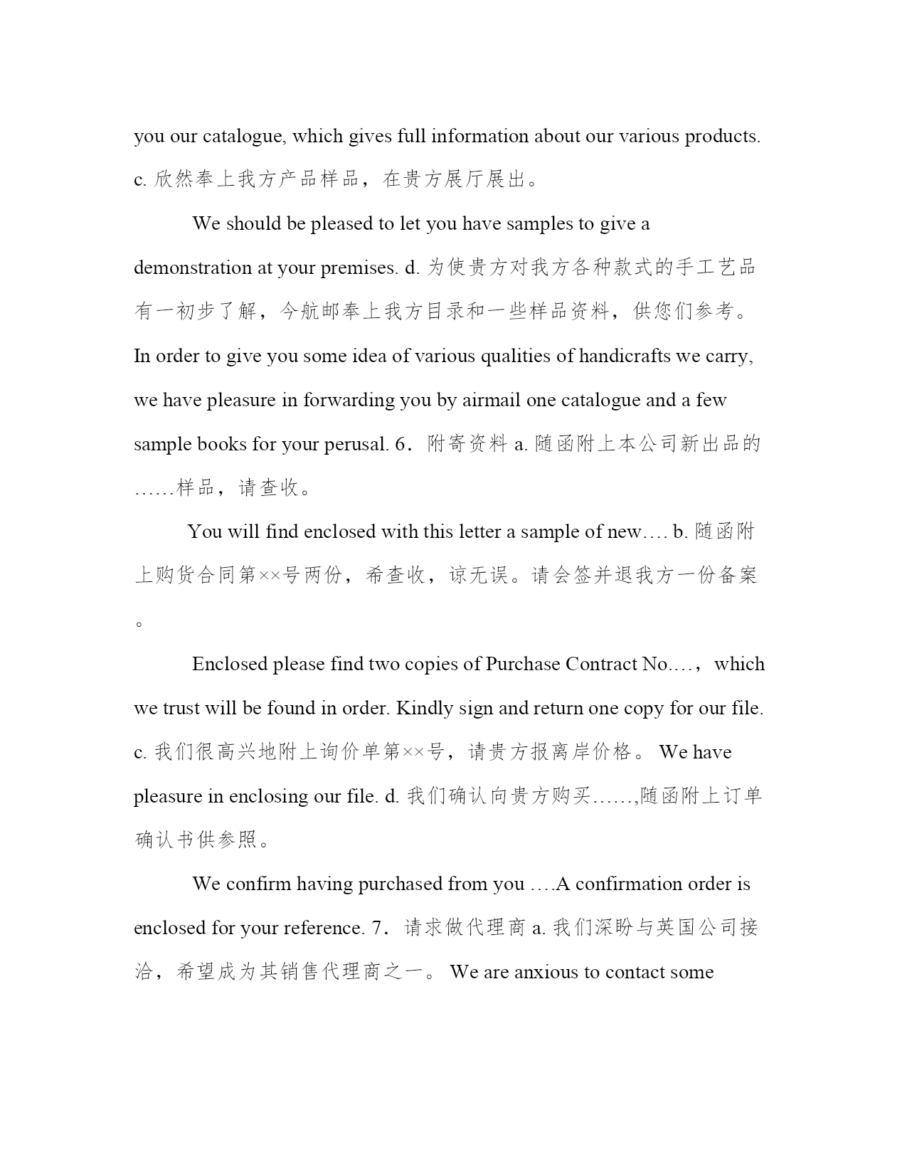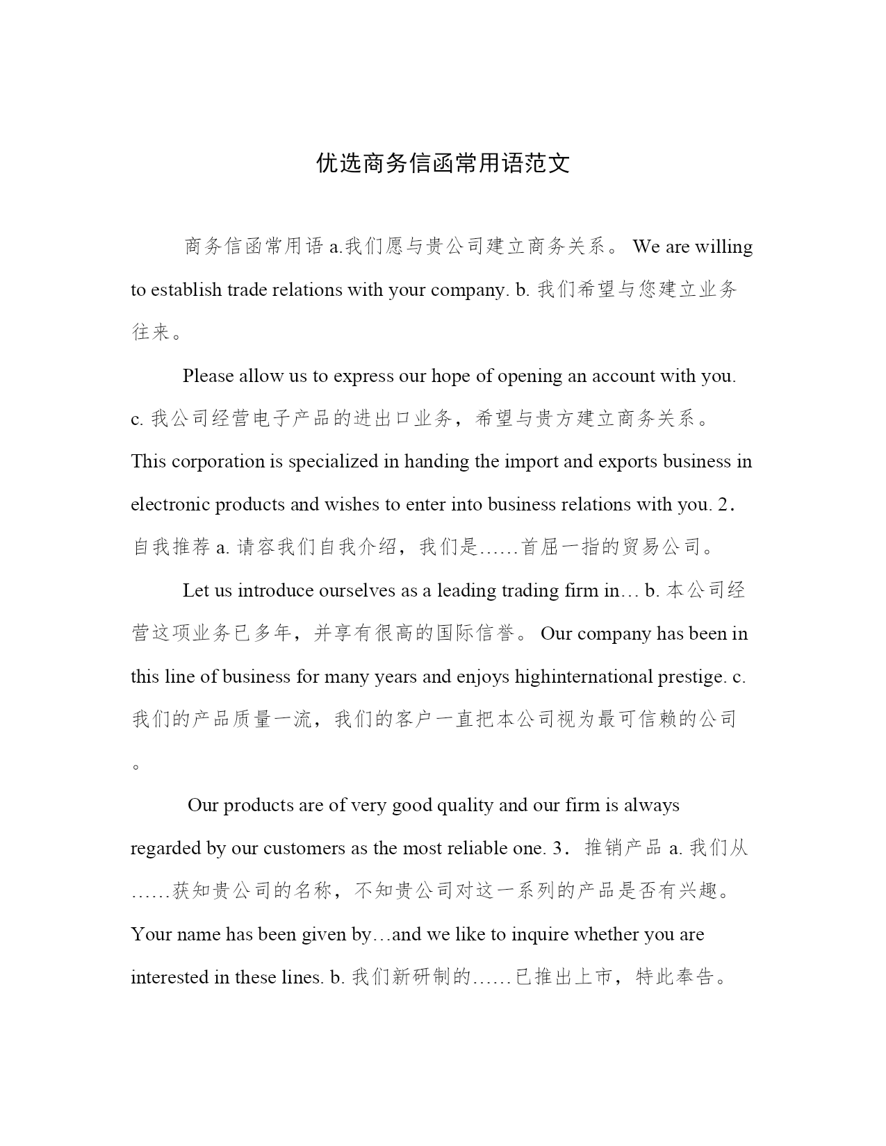 优选商务信函常用语范文商务信函常用语a.我们愿与贵公司建立商务关系。Wearewillingtoestablishtraderelationswithyourcompany.b.我们希望与您建立业务往来。Pleaseallowustoexpressourhopeofopeninganaccountwithyou.c.我公司经营电子产品的进出口业务,希望与贵方建立商务关系。Thiscorporationisspecializedinhandingtheimportandexportsbusinessinelectronicproductsandwishestoenterintobusinessrelationswithyou.2.自我推荐a.请容我们自我介绍,我们是……首屈一指的贸易公司。Letusintroduceourselvesasaleadingtradingfirmin…b.本公司经营这项业务已多年,并享有很高的国际信誉。Ourcompanyhasbeeninthislineofbusinessformanyyearsandenjoyshighinternationalprestige.c.我们的产品质量一流,我们的客户一直把本公司视为最可信赖的公司。Ourproductsareofverygoodqualityandourfirmisalwaysregardedbyourcustomersasthemostreliableone.3.推销产品a.我们从……获知贵公司的名称,不知贵公司对这一系列的产品是否有兴趣。Yournamehasbeengivenby…andweliketoinquirewhetheryouareinterestedintheselines.b.我们新研制的……已推出上市,特此奉告。Wearepleasedtoinformyouthatwehavejustmarketedournewly-developed….c.我们盼望能成为贵公司的……供应商。Wearepleasedtogetintouchwithyouforthesupplyof….d.我们的新产品刚刚推出上市,相信您乐于知道。Youwillbeinterestedtohearthatwehavejustmarketedournewproduct.e.相认您对本公司新出品的……会感兴趣。Youwillbeinterestedinournewproduct…….4.索取资料a.我们对贵方的新产品……甚感兴趣,希望能寄来贵公司的产品目录及价目表。Weareinterestedinyournewproduct…andshallbepleasedtohaveacatalogandpricelist.b.我们从纽约时报上看到贵公司的广告,但愿能收到产品的价目表及详细资料。WehaveseenyouradvertisementinTheNewYorkTimesandshouldbegladtohaveyourpricelistsanddetailsofyourterms.c.获知贵公司有……已上市,希望能赐寄完整的详细资料。Wehearthatyouhaveput…onthemarketandshouldbegladtohavefulldetails.d.如蒙赐寄贵公司新产品的详细资料,我们将深表感激。Weshouldappreciatefullparticularsofyournewlydevelopedproduct.e.如蒙赐寄有关……的样品和价目表,我们将甚为感激。Weshouldbeobligedifyouwouldsenduspatterns(orsamples)andpricelistsofyour…5.寄发资料a.很高兴寄你一邮包,内装……Wearepleasedtosendyoubyparcelpostapackagecontaining…b.欣寄我方目录,提供我方各类产品的详细情况。Wehavepleasuresinsendingyouourcatalogue,whichgivesfullinformationaboutourvariousproducts.c.欣然奉上我方产品样品,在贵方展厅展出。Weshouldbepleasedtoletyouhavesamplestogiveademonstrationatyourpremises.d.为使贵方对我方各种款式的手工艺品有一初步了解,今航邮奉上我方目录和一些样品资料,供您们参考。Inordertogiveyousomeideaofvariousqualitiesofhandicraftswecarry,wehavepleasureinforwardingyoubyairmailo