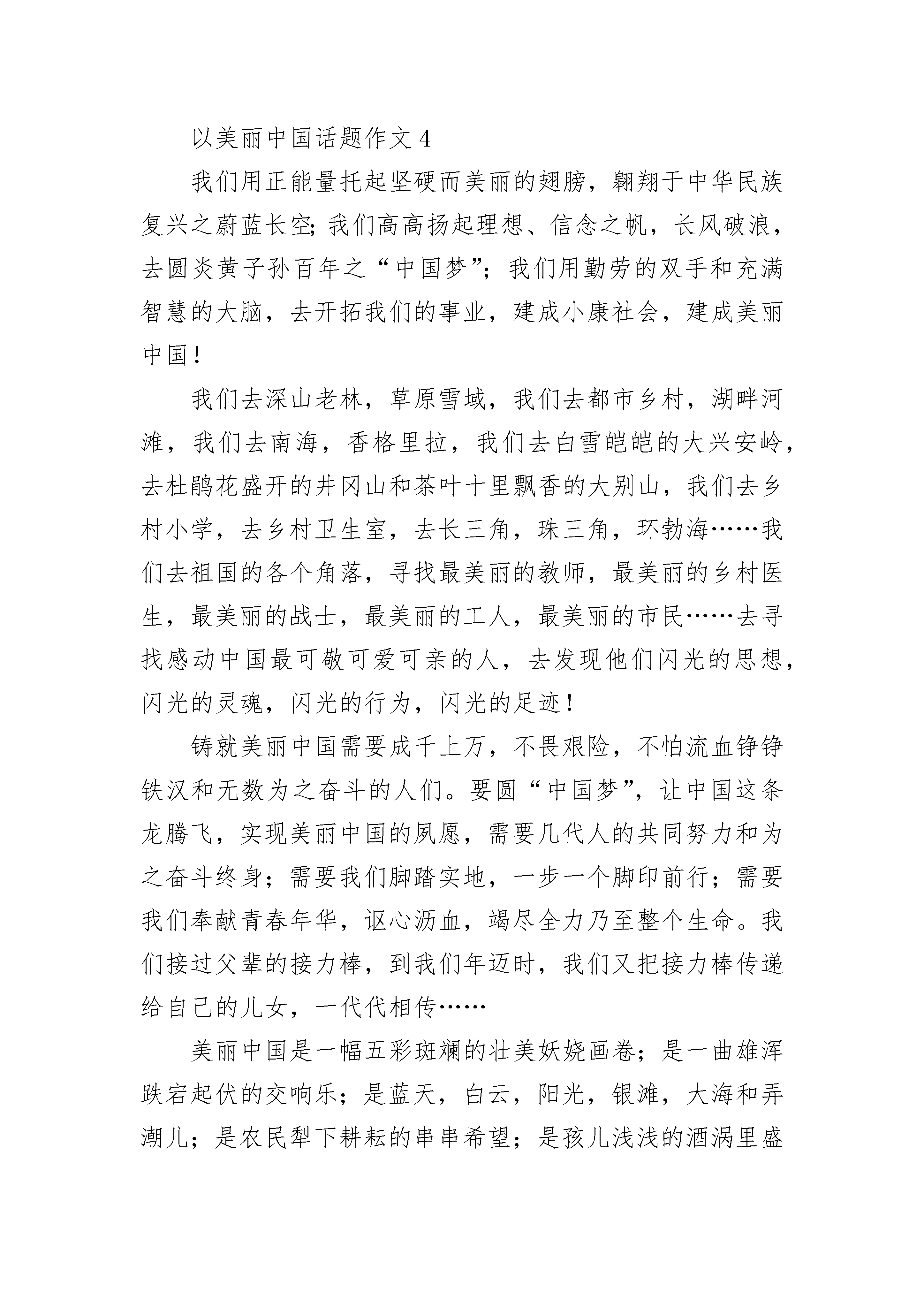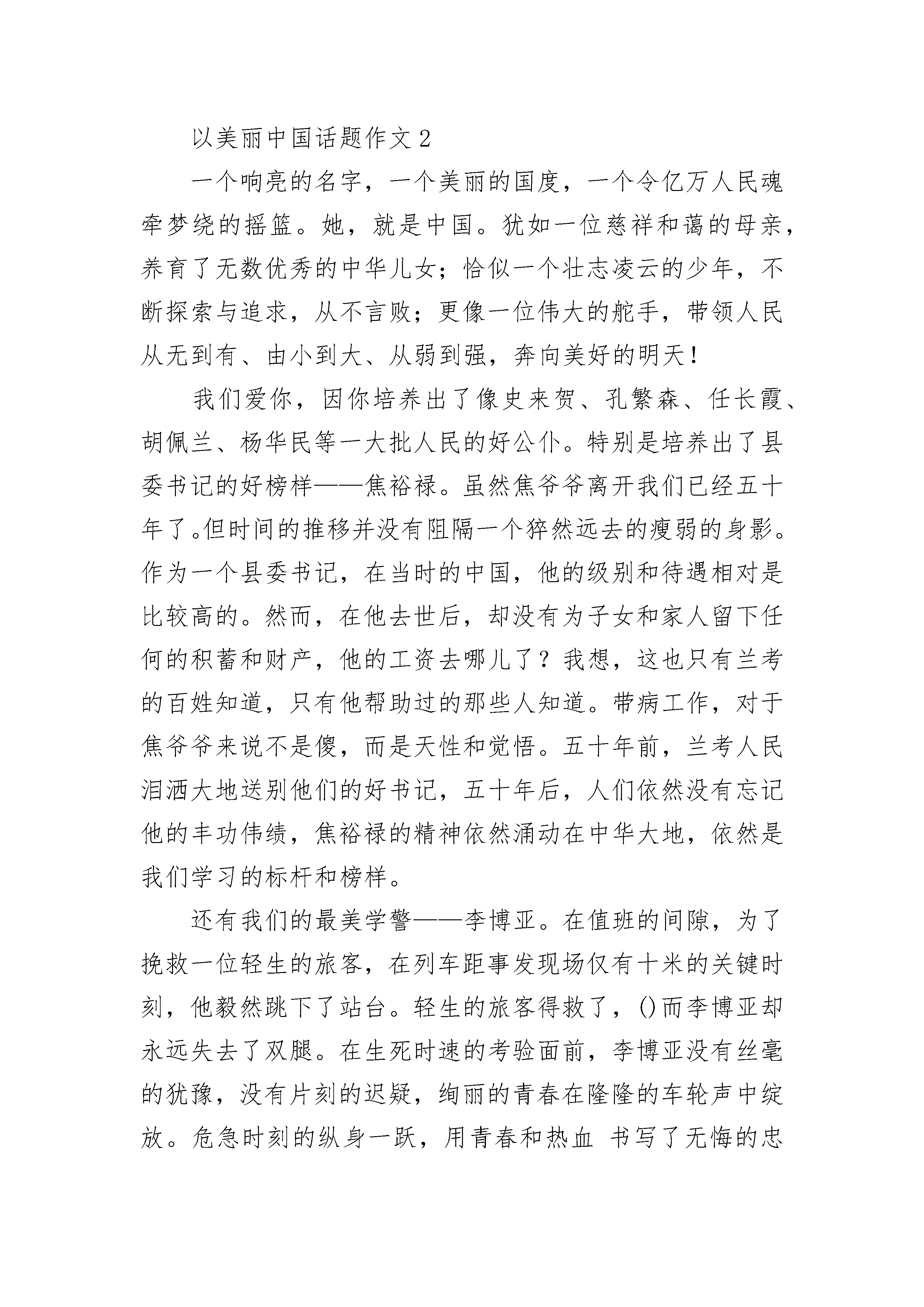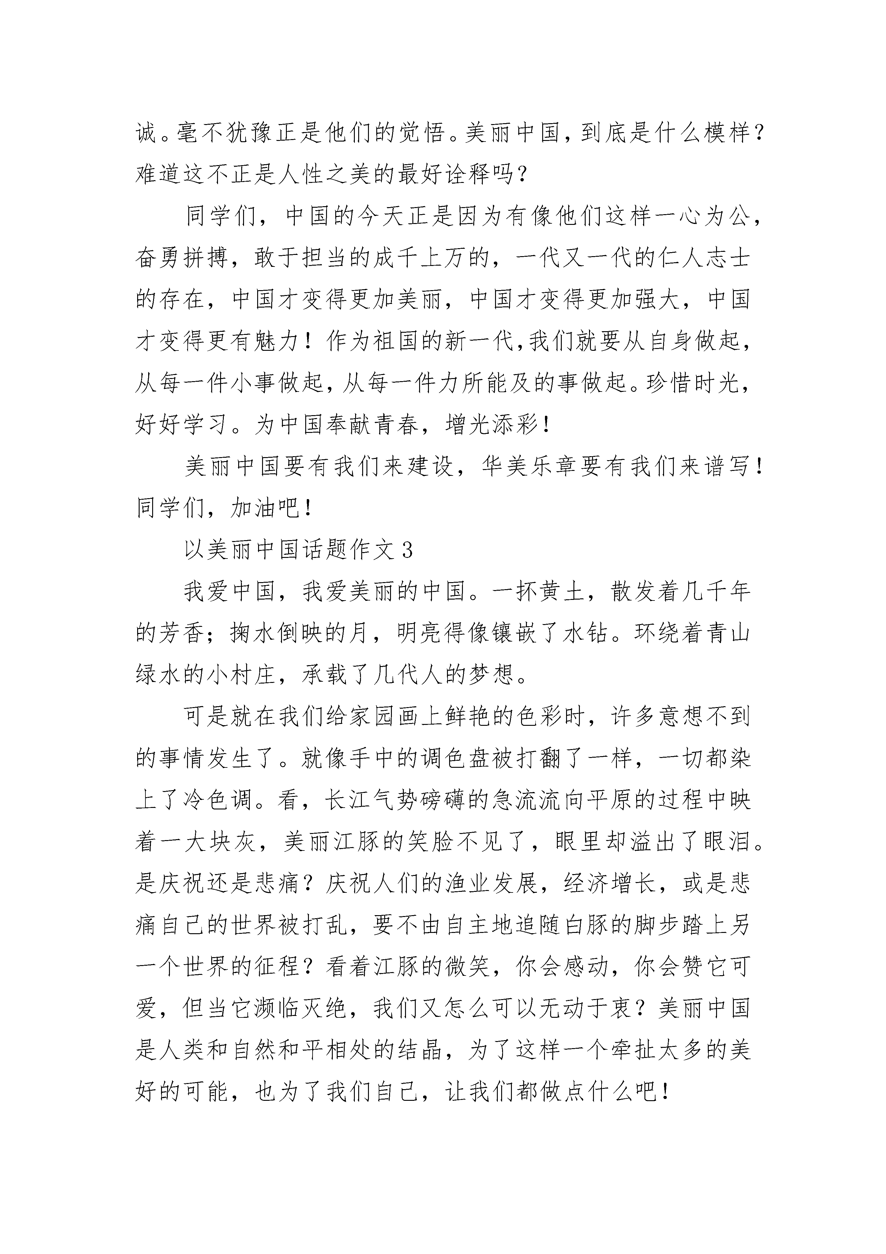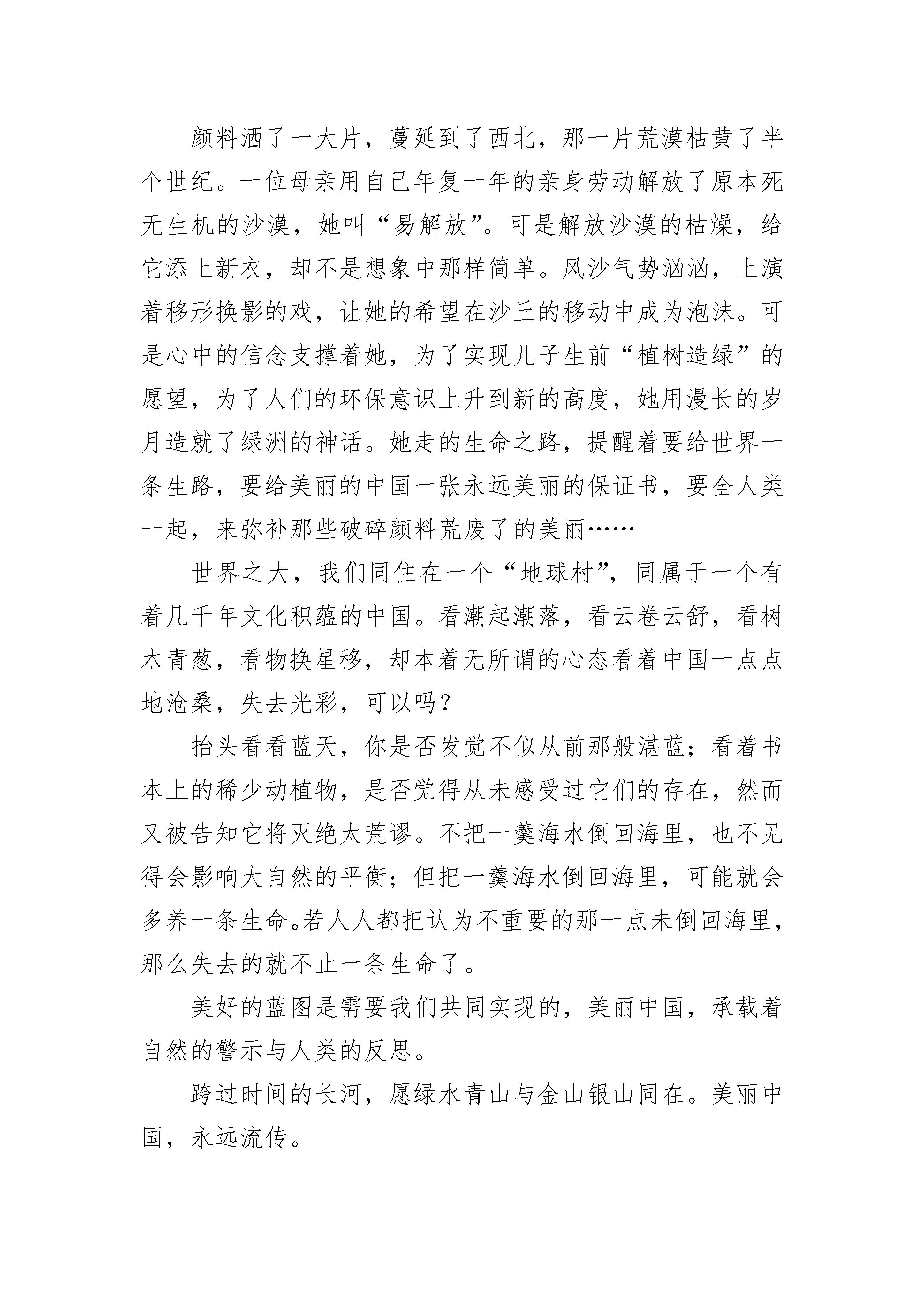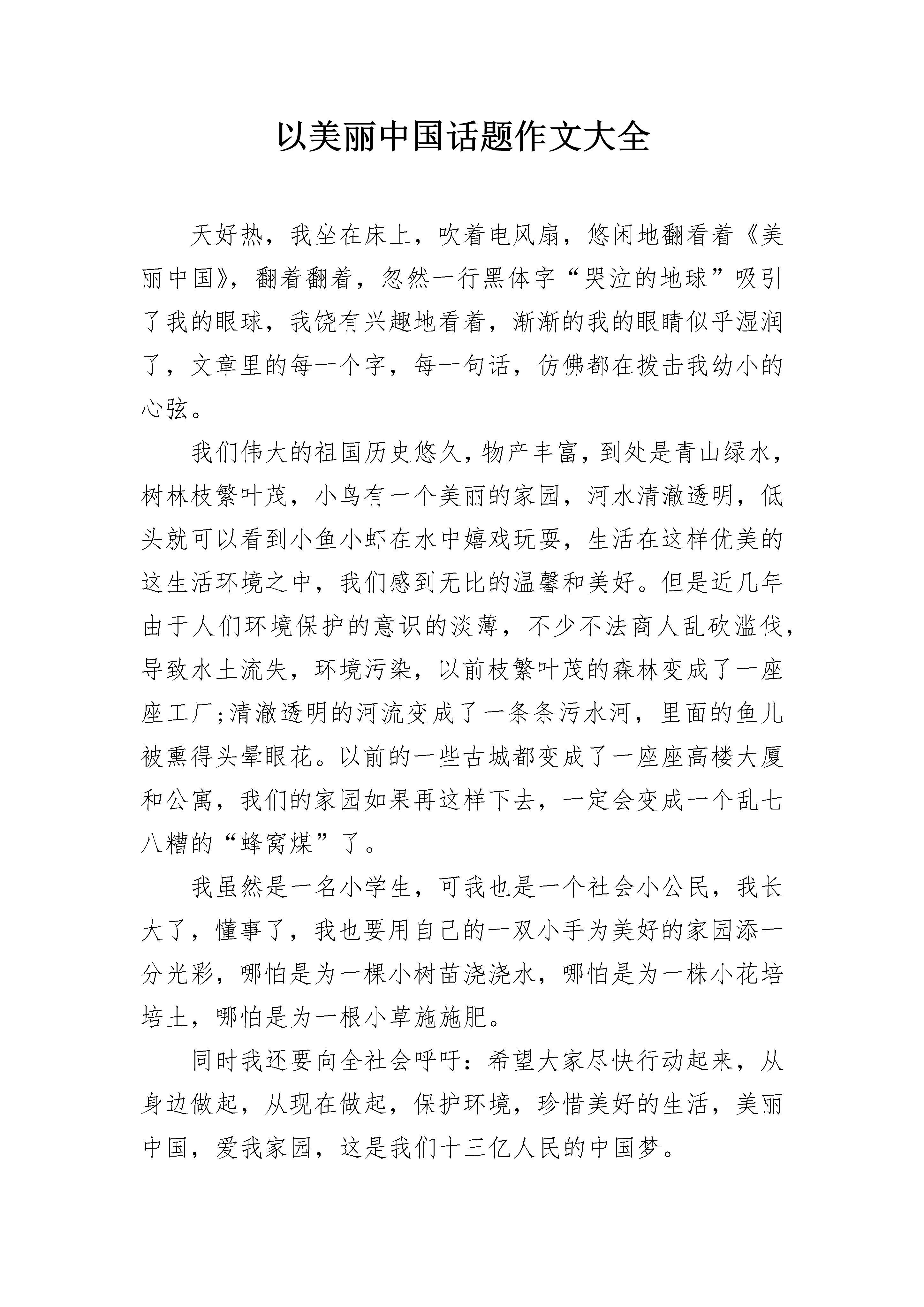 以美丽中国话题作文大全天好热,我坐在床上,吹着电风扇,悠闲地翻看着《美丽中国》,翻着翻着,忽然一行黑体字“哭泣的地球”吸引了我的眼球,我饶有兴趣地看着,渐渐的我的眼睛似乎湿润了,文章里的每一个字,每一句话,仿佛都在拨击我幼小的心弦。我们伟大的祖国历史悠久,物产丰富,到处是青山绿水,树林枝繁叶茂,小鸟有一个美丽的家园,河水清澈透明,低头就可以看到小鱼小虾在水中嬉戏玩耍,生活在这样优美的这生活环境之中,我们感到无比的温馨和美好。但是近几年由于人们环境保护的意识的淡薄,不少不法商人乱砍滥伐,导致水土流失,环境污染,以前枝繁叶茂的森林变成了一座座工厂;清澈透明的河流变成了一条条污水河,里面的鱼儿被熏得头晕眼花。以前的一些古城都变成了一座座高楼大厦和公寓,我们的家园如果再这样下去,一定会变成一个乱七八糟的“蜂窝煤”了。我虽然是一名小学生,可我也是一个社会小公民,我长大了,懂事了,我也要用自己的一双小手为美好的家园添一分光彩,哪怕是为一棵小树苗浇浇水,哪怕是为一株小花培培土,哪怕是为一根小草施施肥。同时我还要向全社会呼吁:希望大家尽快行动起来,从身边做起,从现在做起,保护环境,珍惜美好的生活,美丽中国,爱我家园,这是我们十三亿人民的中国梦。以美丽中国话题作文2一个响亮的名字,一个美丽的国度,一个令亿万人民魂牵梦绕的摇篮。她,就是中国。犹如一位慈祥和蔼的母亲,养育了无数优秀的中华儿女;恰似一个壮志凌云的少年,不断探索与追求,从不言败;更像一位伟大的舵手,带领人民从无到有、由小到大、从弱到强,奔向美好的明天!我们爱你,因你培养出了像史来贺、孔繁森、任长霞、胡佩兰、杨华民等一大批人民的好公仆。特别是培养出了县委书记的好榜样——焦裕禄。虽然焦爷爷离开我们已经五十年了。但时间的推移并没有阻隔一个猝然远去的瘦弱的身影。作为一个县委书记,在当时的中国,他的级别和待遇相对是比较高的。然而,在他去世后,却没有为子女和家人留下任何的积蓄和财产,他的工资去哪儿了?我想,这也只有兰考的百姓知道,只有他帮助过的那些人知道。带病工作,对于焦爷爷来说不是傻,而是天性和觉悟。五十年前,兰考人民泪洒大地送别他们的好书记,五十年后,人们依然没有忘记他的丰功伟绩,焦裕禄的精神依然涌动在中华大地,依然是我们学习的标杆和榜样。还有我们的最美学警——李博亚。在值班的间隙,为了挽救一位轻生的旅客,在列车距事发现场仅有十米的关键时刻,他毅然跳下了站台。轻生的旅客得救了,()而李博亚却永远失去了双腿。在生死时速的考验面前,李博亚没有丝毫的犹豫,没有片刻的迟疑,绚丽的青春在隆隆的车轮声中绽放。危急时刻的纵身一跃,用青春和热血书写了无悔的忠诚。毫不犹豫正是他们的觉悟。美丽中国,到底是什么模样?难道这不正是人性之美的最好诠释吗?同学们,中国的今天正是因为有像他们这样一心为公,奋勇拼搏,敢于担当的成千上万的,一代又一代的仁人志士的存在,中国才变得更加美丽,中国才变得更加强大,中国才变得更有魅力!作为祖国的新一代,我们就要从自身做起,从每一件小事做起,从每一件力所能及的事做起。珍惜时光,好好学习。为中国奉献青春,增光添彩!美丽中国要有我们来建设,华美乐章要有我们来谱写!同学们,加油吧!以美丽中国话题作文3我爱中国,我爱美丽的中国。一抔黄土,散发着几千年的芳香;掬水倒映的月,明亮得像镶嵌了水钻。环绕着青山绿水的小村庄,承载了几代人的梦想。可是就在我们给家园画上鲜艳的色彩时,许多意想不到的事情发生了。就像手中的调色盘被打翻了一样,一切都染上了冷色调。看,长江气势磅礴的急流流向平原的过程中映着一大块灰,美丽江豚的笑脸不见了,眼里却溢出了眼泪。是庆祝还是悲痛?庆祝人们的渔业发展,经济增长,或是悲痛自己的世界被打乱,要不由自主地追随白豚的脚步踏上另一个世界的征程?看着江豚的微笑,你会感动,你会赞它可爱,但当它濒临灭绝,我们又怎么可以无动于衷?美丽中国是人类和自然和平相处的结晶,为了这样一个牵扯太多的美好的可能,也为了我们自己,让我们都做点什么吧!颜料洒了一大片,蔓延到了西北,那一片荒漠枯黄了半个世纪。一位母亲用自己年复一年的亲身劳动解放了原本死无生机的沙漠,她叫“易解放”。可是解放沙漠的枯燥,给它添上新衣,却不是想象中那样简单。风沙气势汹汹,上演着移形换影的戏,让她的希望在沙丘的移动中成为泡沫。可是心中的信念支撑着她,为了实现儿子生前“植树造绿”的愿望,为了人们的环保意识上升到新的高度,她用漫长的岁月造就了绿洲的神话。她走的生命之路,提醒着要给世界一条生路,要给美丽的中国一张永远美丽的保证书,要全人类一起,来弥补那些破碎颜料荒废了的美丽……世界之大,我们同住在一个“地球村”,同属于一个有着几千年文化积蕴的中国。看潮起潮落,看云卷云舒,看树木青葱,看物换星移,却本着无所谓的心态看着中国一点点地沧桑,失去光