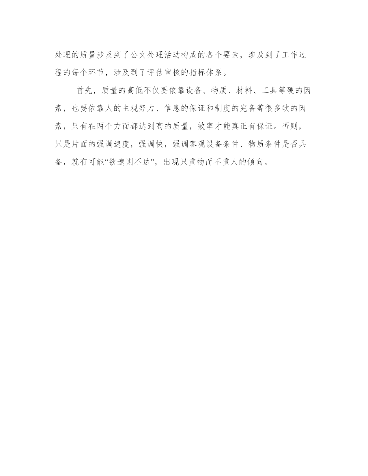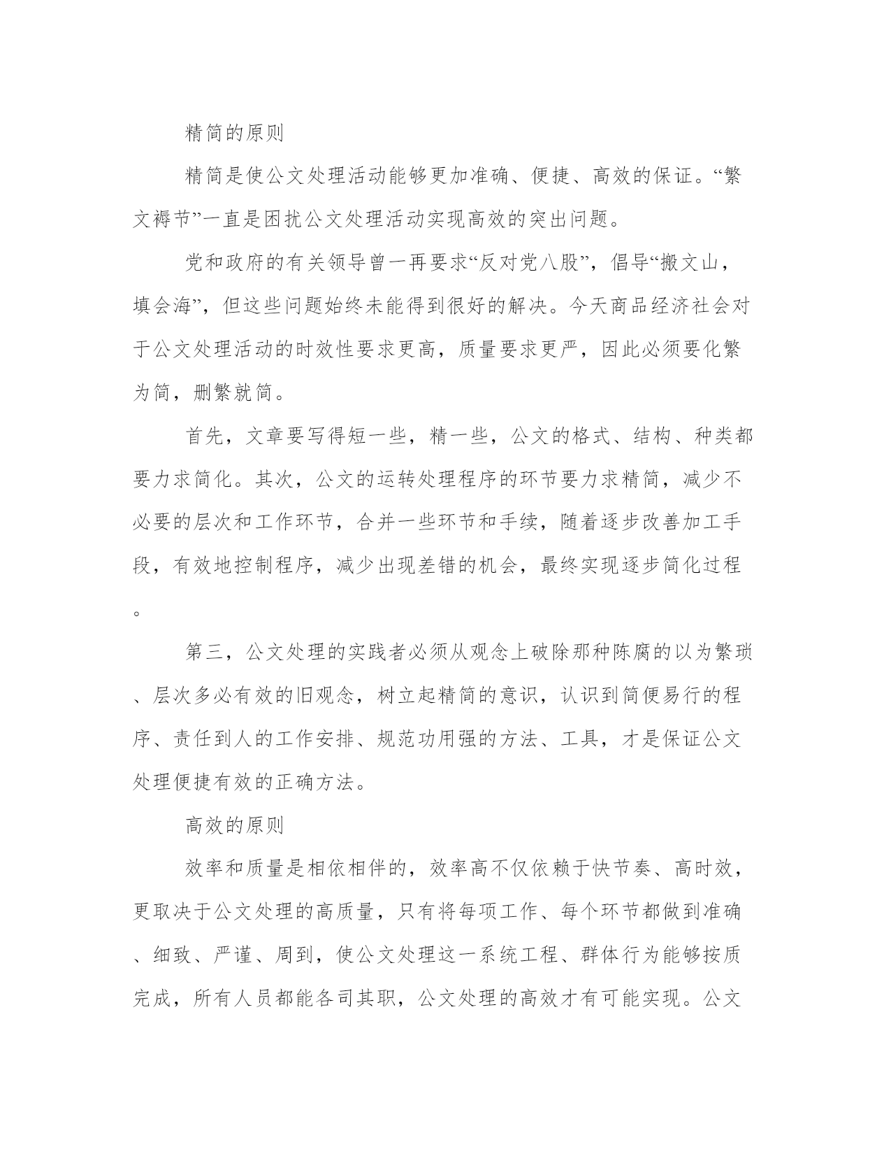 精品公文处理的基本原则范文实事求是的原则公文处理工作必须要发扬深入实际、联系群众、调查分析、认真负责的工作作风,因为公文的出发点和最后的目的就是要解决实际的问题,它是公务活动面对实际问题必须借助的方法、工具之一。如果不深入实际,调查全面真实的情况,只是闭门造车,必然陷入官僚主义、形式主义和文牍主义的泥沼,使公文成为脱离实际,堆满了官话、套话、空话、假话、大话的垃圾堆,使浮夸虚饰、生搬硬套、本本主义、瞎指挥、妄下结论的官僚主义之风侵害机关和组织的健康肌体,这样公文处理不但无助于组织的管理,发挥不了实际的作用,甚至可能会带来混乱和矛盾等负面效应。所以公文处理必须是一种有效的信息沟通,公文处理的实践者应该从客观实际出发,倾听群众和基层的呼声,如实地反映真实情况,不先入为主,不任意夸大和缩小问题,不掩饰矛盾,既报喜也报忧。同时,公文处理的实践者要能对搜集上来的各种情况和材料的性质、真伪、是非、可行性做出准确的分析判断推理,运用科学的方法论从客观事实中得出正确的结论。能够发现问题,提出问题,分析问题,最终还是要落在能有效地解决问题。所以在公文处理实践中,最重要的是要能指出解决问题的具体方法、手段、途径、措施。精简的原则精简是使公文处理活动能够更加准确、便捷、高效的保证。“繁文褥节”一直是困扰公文处理活动实现高效的突出问题。党和政府的有关领导曾一再要求“反对党八股”,倡导“搬文山,填会海”,但这些问题始终未能得到很好的解决。今天商品经济社会对于公文处理活动的时效性要求更高,质量要求更严,因此必须要化繁为简,删繁就简。首先,文章要写得短一些,精一些,公文的格式、结构、种类都要力求简化。其次,公文的运转处理程序的环节要力求精简,减少不必要的层次和工作环节,合并一些环节和手续,随着逐步改善加工手段,有效地控制程序,减少出现差错的机会,最终实现逐步简化过程。第三,公文处理的实践者必须从观念上破除那种陈腐的以为繁琐、层次多必有效的旧观念,树立起精简的意识,认识到简便易行的程序、责任到人的工作安排、规范功用强的方法、工具,才是保证公文处理便捷有效的正确方法。高效的原则效率和质量是相依相伴的,效率高不仅依赖于快节奏、高时效,更取决于公文处理的高质量,只有将每项工作、每个环节都做到准确、细致、严谨、周到,使公文处理这一系统工程、群体行为能够按质完成,所有人员都能各司其职,公文处理的高效才有可能实现。公文处理的质量涉及到了公文处理活动构成的各个要素,涉及到了工作过程的每个环节,涉及到了评估审核的指标体系。首先,质量的高低不仅要依靠设备、物质、材料、工具等硬的因素,也要依靠人的主观努力、信息的保证和制度的完备等很多软的因素,只有在两个方面都达到高的质量,效率才能真正有保证。否则,只是片面的强调速度,强调快,强调客观设备条件、物质条件是否具备,就有可能“欲速则不达”,出现只重物而不重人的倾向。