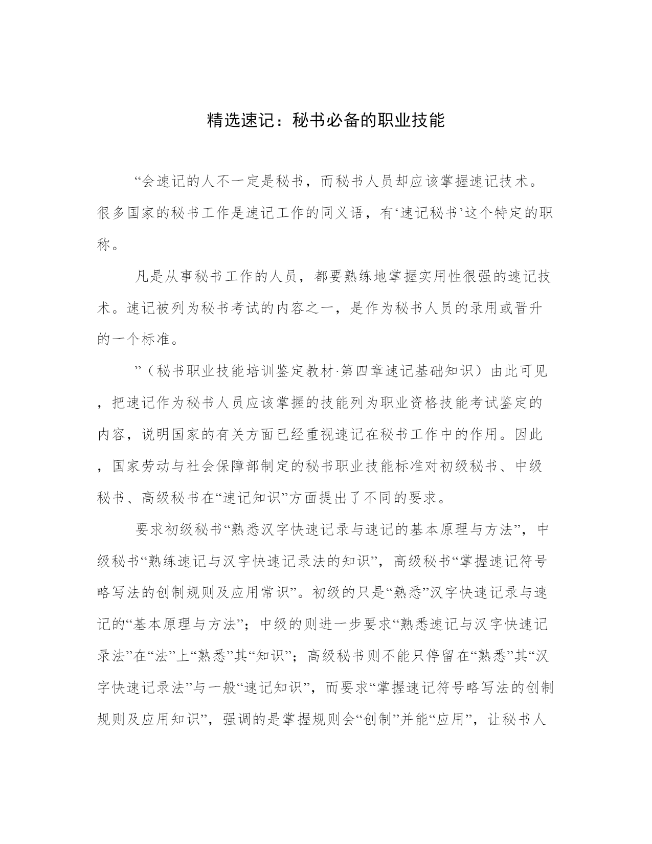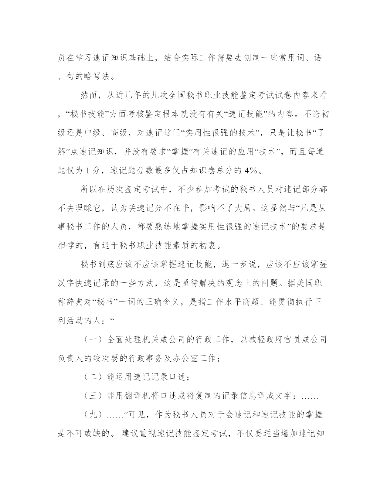 精选速记:秘书必备的职业技能“会速记的人不一定是秘书,而秘书人员却应该掌握速记技术。很多国家的秘书工作是速记工作的同义语,有‘速记秘书’这个特定的职称。凡是从事秘书工作的人员,都要熟练地掌握实用性很强的速记技术。速记被列为秘书考试的内容之一,是作为秘书人员的录用或晋升的一个标准。”(秘书职业技能培训鉴定教材·第四章速记基础知识)由此可见,把速记作为秘书人员应该掌握的技能列为职业资格技能考试鉴定的内容,说明国家的有关方面已经重视速记在秘书工作中的作用。因此,国家劳动与社会保障部制定的秘书职业技能标准对初级秘书、中级秘书、高级秘书在“速记知识”方面提出了不同的要求。要求初级秘书“熟悉汉字快速记录与速记的基本原理与方法”,中级秘书“熟练速记与汉字快速记录法的知识”,高级秘书“掌握速记符号略写法的创制规则及应用常识”。初级的只是“熟悉”汉字快速记录与速记的“基本原理与方法”;中级的则进一步要求“熟悉速记与汉字快速记录法”在“法”上“熟悉”其“知识”;高级秘书则不能只停留在“熟悉”其“汉字快速记录法”与一般“速记知识”,而要求“掌握速记符号略写法的创制规则及应用知识”,强调的是掌握规则会“创制”并能“应用”,让秘书人员在学习速记知识基础上,结合实际工作需要去创制一些常用词、语、句的略写法。然而,从近几年的几次全国秘书职业技能鉴定考试试卷内容来看,“秘书技能”方面考核鉴定根本就没有有关“速记技能”的内容。不论初级还是中级、高级,对速记这门“实用性很强的技术”,只是让秘书“了解”点速记知识,并没有要求“掌握”有关速记的应用“技术”,而且每道题仅为1分,速记题分数最多仅占知识卷总分的4%。所以在历次鉴定考试中,不少参加考试的秘书人员对速记部分都不去理睬它,认为丢速记分不在乎,影响不了大局。这显然与“凡是从事秘书工作的人员,都要熟练地掌握实用性很强的速记技术”的要求是相悖的,有违于秘书职业技能素质的初衷。秘书到底应该不应该掌握速记技能,退一步说,应该不应该掌握汉字快速记录的一些方法,这是亟待解决的观念上的问题。据美国职称辞典对“秘书”一词的正确含义,是指工作水平高超、能贯彻执行下列活动的人:“(一)全面处理机关或公司的行政工作,以减轻政府官员或公司负责人的较次要的行政事务及办公室工作;(二)能运用速记记录口述;(三)能用翻译机将口述或将复制的记录信息译成文字;……(九)……”可见,作为秘书人员对于会速记和速记技能的掌握是不可或缺的。建议重视速记技能鉴定考试,不仅要适当增加速记知识的考核比例,还应该有速记技能考试的内容,如同考核计算机运用能力那样必须在规定时间里听写一段不少于2000字的速记记录(哪怕就是使用汉字“汉字快速记录法”),从而考查应考的秘书人员与秘书工作相关的速记技能的实际能力水平,与秘书职业技能标准相一致。来源:速记网