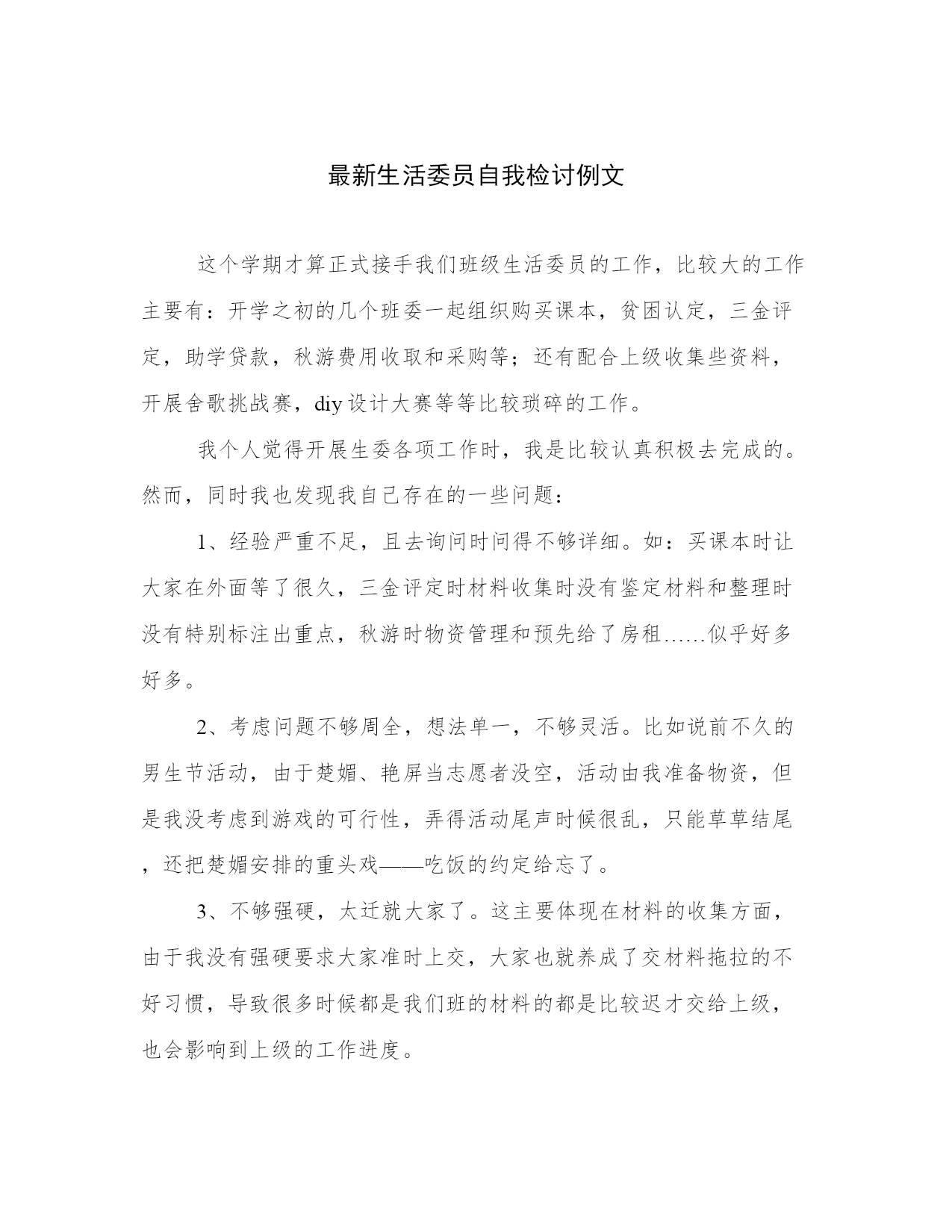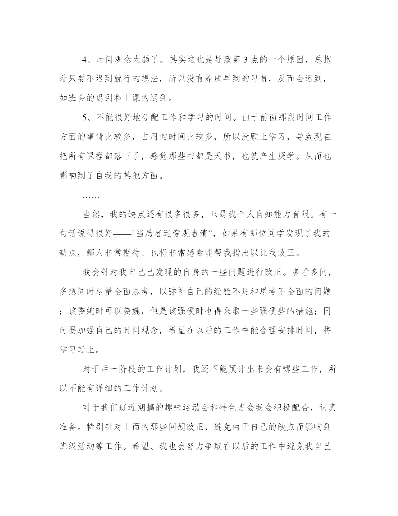 最新生活委员自我检讨例文这个学期才算正式接手我们班级生活委员的工作,比较大的工作主要有:开学之初的几个班委一起组织购买课本,贫困认定,三金评定,助学贷款,秋游费用收取和采购等;还有配合上级收集些资料,开展舍歌挑战赛,diy设计大赛等等比较琐碎的工作。我个人觉得开展生委各项工作时,我是比较认真积极去完成的。然而,同时我也发现我自己存在的一些问题:1、经验严重不足,且去询问时问得不够详细。如:买课本时让大家在外面等了很久,三金评定时材料收集时没有鉴定材料和整理时没有特别标注出重点,秋游时物资管理和预先给了房租……似乎好多好多。2、考虑问题不够周全,想法单一,不够灵活。比如说前不久的男生节活动,由于楚媚、艳屏当志愿者没空,活动由我准备物资,但是我没考虑到游戏的可行性,弄得活动尾声时候很乱,只能草草结尾,还把楚媚安排的重头戏——吃饭的约定给忘了。3、不够强硬,太迁就大家了。这主要体现在材料的收集方面,由于我没有强硬要求大家准时上交,大家也就养成了交材料拖拉的不好习惯,导致很多时候都是我们班的材料的都是比较迟才交给上级,也会影响到上级的工作进度。4、时间观念太弱了。其实这也是导致第3点的一个原因,总抱着只要不迟到就行的想法,所以没有养成早到的习惯,反而会迟到,如班会的迟到和上课的迟到。5、不能很好地分配工作和学习的时间。由于前面那段时间工作方面的事情比较多,占用的时间比较多,所以没顾上学习,导致现在把所有课程都落下了,感觉那些书都是天书,也就产生厌学。从而也影响到了自我的其他方面。……当然,我的缺点还有很多很多,只是我个人自知能力有限。有一句话说得很好——“当局者迷旁观者清”,如果有哪位同学发现了我的缺点,鄙人非常期待、也将非常感谢能帮我指出以让我改正。我会针对我自己已发现的自身的一些问题进行改正。多看多问,多想同时尽量全面思考,以弥补自己的经验不足和思考不全面的问题;该委婉时可以委婉,但是该强硬时也得采取一些强硬些的措施;同时要加强自己的时间观念,希望在以后的工作中能合理安排时间,将学习赶上。对于后一阶段的工作计划,我还不能预计出来会有哪些工作,所以不能有详细的工作计划。对于我们班近期搞的趣味运动会和特色班会我会积极配合,认真准备。特别针对上面的那些问题改正,避免由于自己的缺点而影响到班级活动等工作。希望、我也会努力争取在以后的工作中避免我自己已发现的错误,同时不断发现自己的不足,虚心接受大家的批评和虚心向大家请教。