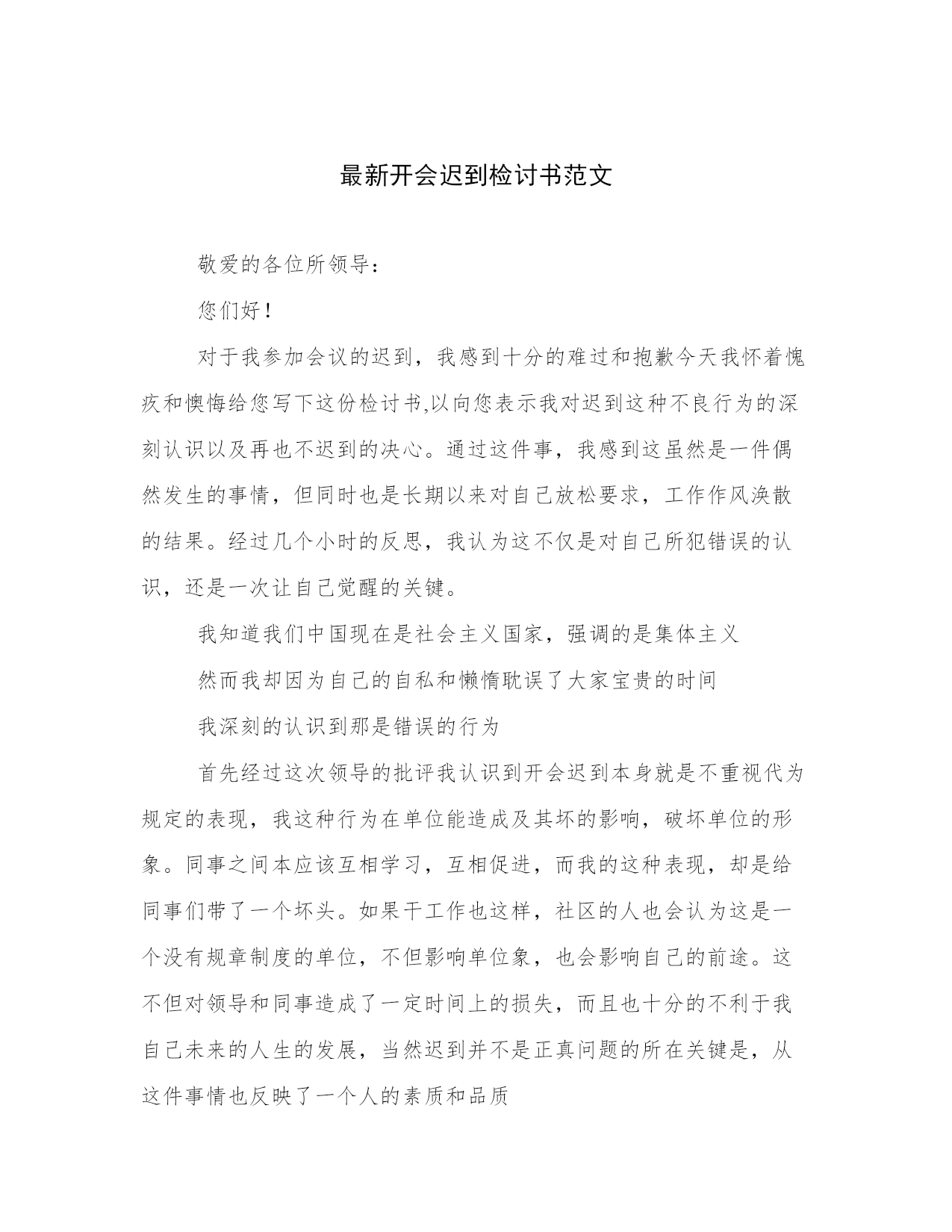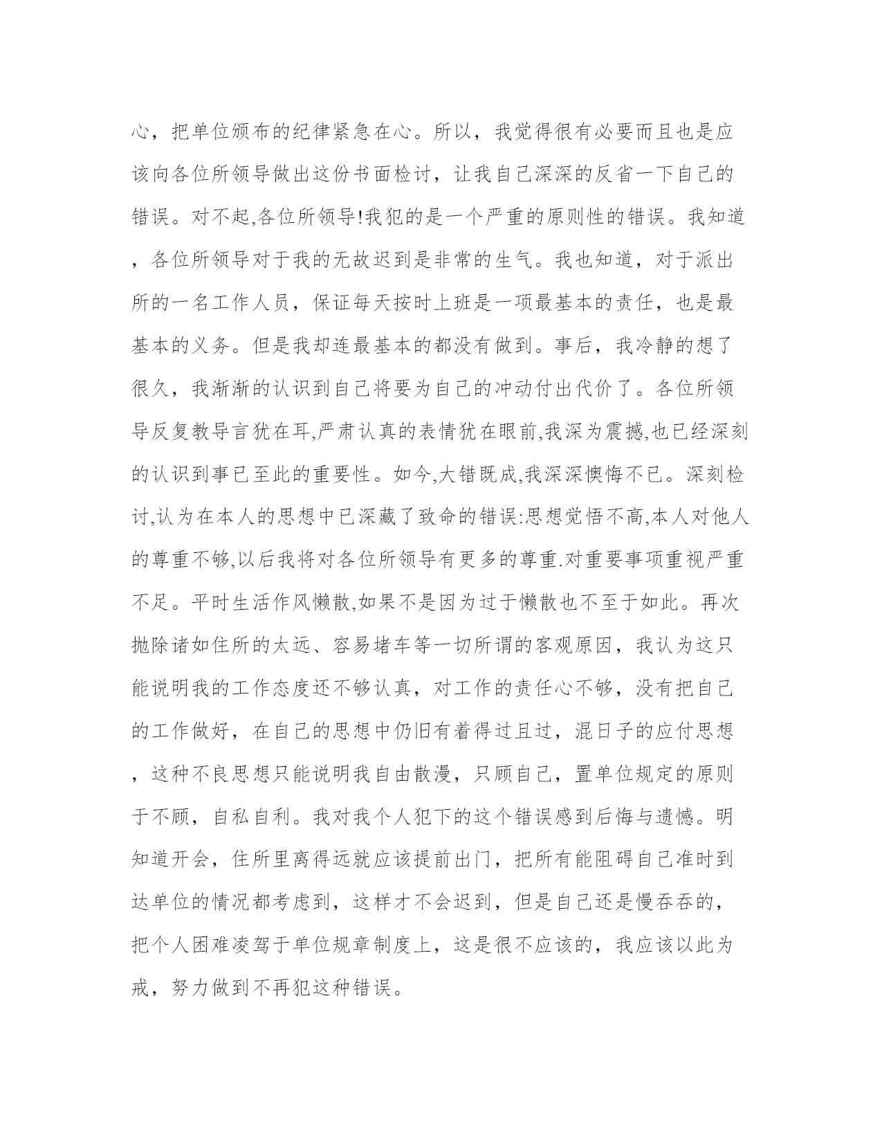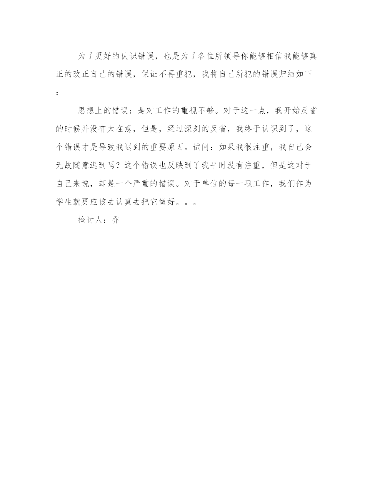 最新开会迟到检讨书范文敬爱的各位所领导:您们好!对于我参加会议的迟到,我感到十分的难过和抱歉今天我怀着愧疚和懊悔给您写下这份检讨书,以向您表示我对迟到这种不良行为的深刻认识以及再也不迟到的决心。通过这件事,我感到这虽然是一件偶然发生的事情,但同时也是长期以来对自己放松要求,工作作风涣散的结果。经过几个小时的反思,我认为这不仅是对自己所犯错误的认识,还是一次让自己觉醒的关键。我知道我们中国现在是社会主义国家,强调的是集体主义然而我却因为自己的自私和懒惰耽误了大家宝贵的时间我深刻的认识到那是错误的行为首先经过这次领导的批评我认识到开会迟到本身就是不重视代为规定的表现,我这种行为在单位能造成及其坏的影响,破坏单位的形象。同事之间本应该互相学习,互相促进,而我的这种表现,却是给同事们带了一个坏头。如果干工作也这样,社区的人也会认为这是一个没有规章制度的单位,不但影响单位象,也会影响自己的前途。这不但对领导和同事造成了一定时间上的损失,而且也十分的不利于我自己未来的人生的发展,当然迟到并不是正真问题的所在关键是,从这件事情也反映了一个人的素质和品质因为社会不是学校,既然走到了社会,参加了工作,我也不能像在学校马马虎虎,不能不把事情不放在心上,这是态度与思想的问题。没有把问题放在心上就不可能把事情做好,就会影响到自己的工作,是对时间没有观念。曾经有人问比尔盖茨,假如地上有一百美元,你会去捡吗?他十分坚定的说,不会,因为在我捡钱的那俺一瞬间,我已经赚了100万美元我想,捡钱的一瞬间才多久?就能赚100万美元,那么五分钟呢?能赚多少?而假如浪费了这五分钟,所损失的是什么啊,是我们无法估量!!五分钟、五分钟啊!!而且,我知道,在国外,尤其是日本,他们几乎所有的单位里的工作人员都是昔时如金的在他们眼中时间就是生命,浪费时间就是在慢性自杀!!时间,是这个世界上最宝贵最公平也是最无法挽回的东西一寸光阴一寸金,寸金难买寸光阴这个道理我们每个人都懂,从小就不断有父母、老师这样教育我们早在我踏进单位里,师傅就已三申五令,一再强调单位里的纪律,提醒我们不要违反纪律,可我却没有把单位和师傅的话放在心上,没有重视师傅说的话,没有重视单位颁布的重要事项,当成了耳旁风,这些都是不应该的。也是对师傅的不尊重。应该把师傅说的话紧记在心,把单位颁布的纪律紧急在心。所以,我觉得很有必要而且也是应该向各位所领导做出这份书面检讨,让我自己深深的反省一下自己的错误。对不起,各位所领导!我犯的是一个严重的原则性的错误。我知道,各位所领导对于我的无故迟到是非常的生气。我也知道,对于派出所的一名工作人员,保证每天按时上班是一项最基本的责任,也是最基本的义务。但是我却连最基本的都没有做到。事后,我冷静的想了很久,我渐渐的认识到自己将要为自己的冲动付出代价了。各位所领导反复教导言犹在耳,严肃认真的表情犹在眼前,我深为震撼,也已经深刻的认识到事已至此的重要性。如今,大错既成,我深深懊悔不已。深刻检讨,认为在本人的思想中已深藏了致命的错误:思想觉悟不高,本人对他人的尊重不够,以后我将对各位所领导有更多的尊重.对重要事项重视严重不足。平时生活作风懒散,如果不是因为过于懒散也不至于如此。再次抛除诸如住所的太远、容易堵车等一切所谓的客观原因,我认为这只能说明我的工作态度还不够认真,对工作的责任心不够,没有把自己的工作做好,在自己的思想中仍旧有着得过且过,混日子的应付思想,这种不良思想只能说明我自由散漫,只顾自己,置单位规定的原则于不顾,自私自利。我对我个人犯下的这个错误感到后悔与遗憾。明知道开会,住所里离得远就应该提前出门,把所有能阻碍自己准时到达单位的情况都考虑到,这样才不会迟到,但是自己还是慢吞吞的,把个人困难凌驾于单位规章制度上,这是很不应该的,我应该以此为戒,努力做到不再犯这种错误。为了更好的认识错误,也是为了各位所领导你能够相信我能够真正的改正自己的错误,保证不再重犯,我将自己所犯的错误归结如下:思想上的错误:是对工作的重视不够。对于这一点,我开始反省的时候并没有太在意,但是,经过深刻的反省,我终于认识到了,这个错误才是导致我迟到的重要原因。试问:如果我很注重,我自己会无故随意迟到吗?这个错误也反映到了我平时没有注重,但是这对于自己来说,却是一个严重的错误。对于单位的每一项工作,我们作为学生就更应该去认真去把它做好。。。检讨人:乔
