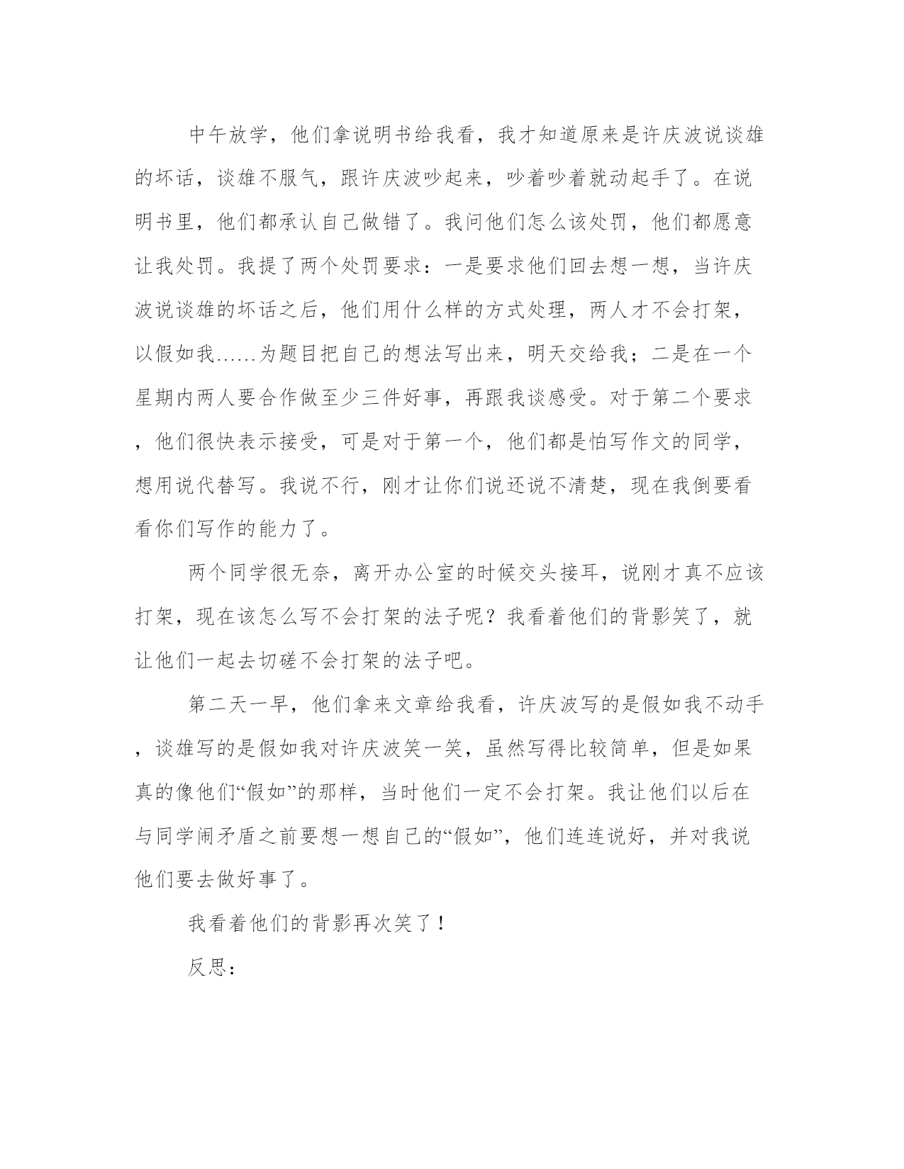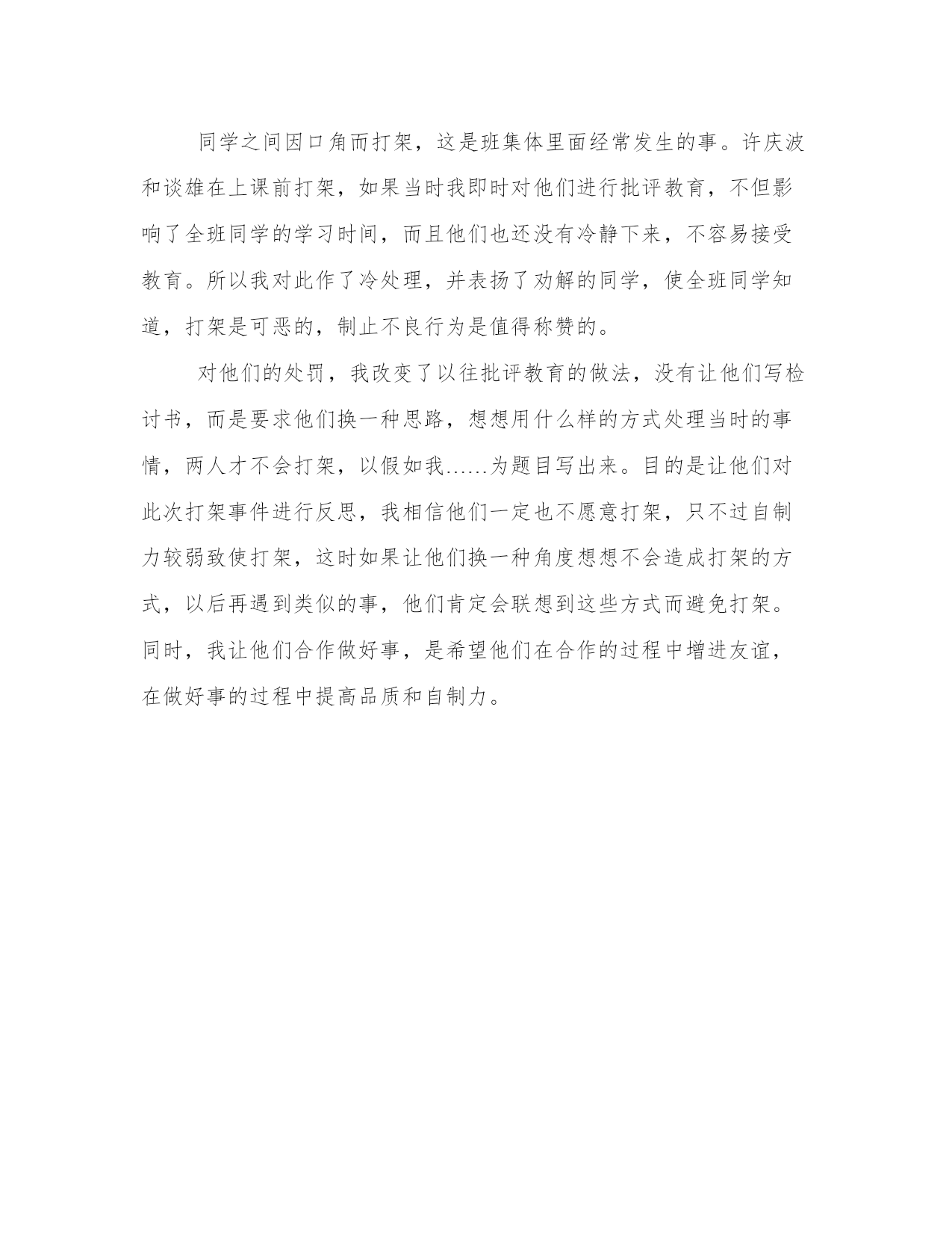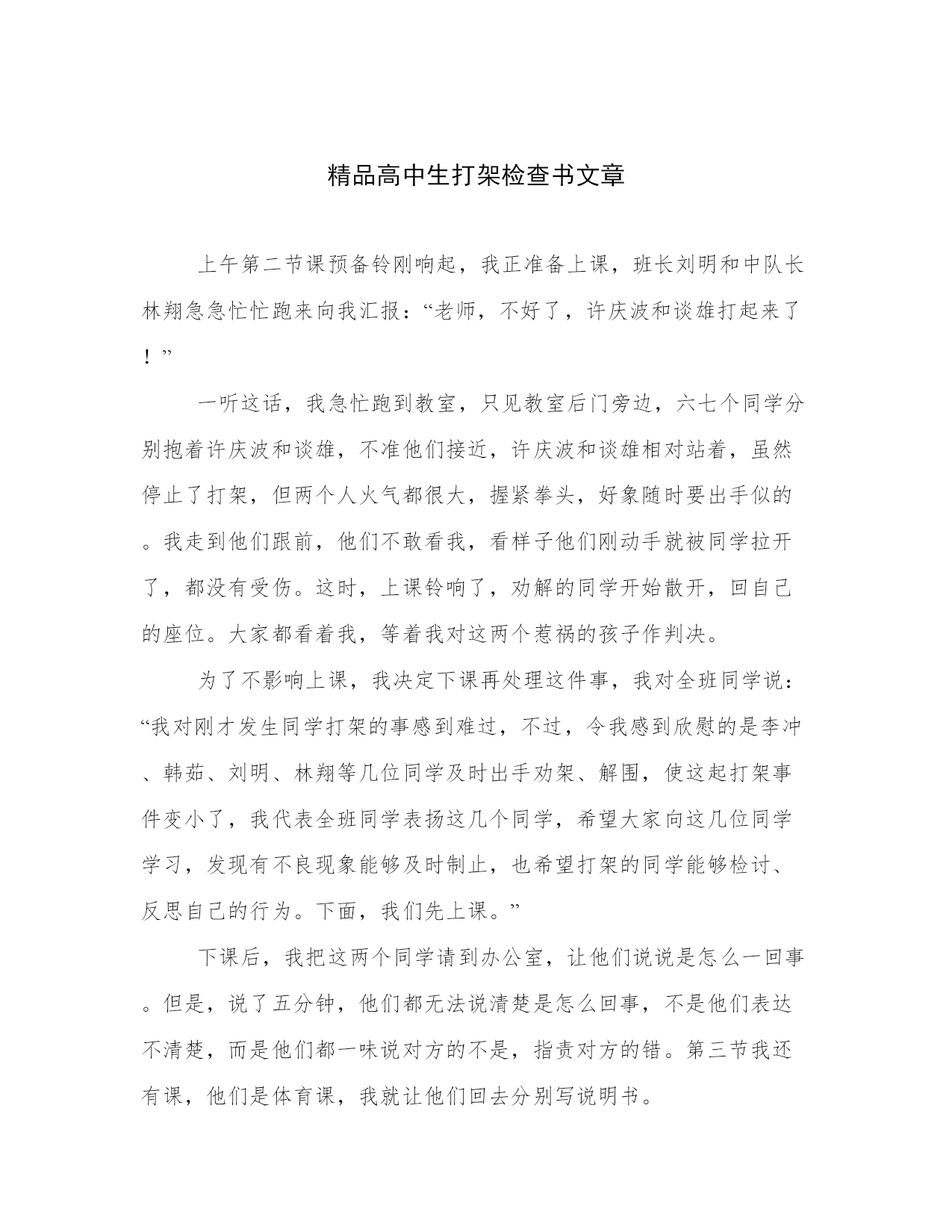 精品高中生打架检查书文章上午第二节课预备铃刚响起,我正准备上课,班长刘明和中队长林翔急急忙忙跑来向我汇报:“老师,不好了,许庆波和谈雄打起来了!”一听这话,我急忙跑到教室,只见教室后门旁边,六七个同学分别抱着许庆波和谈雄,不准他们接近,许庆波和谈雄相对站着,虽然停止了打架,但两个人火气都很大,握紧拳头,好象随时要出手似的。我走到他们跟前,他们不敢看我,看样子他们刚动手就被同学拉开了,都没有受伤。这时,上课铃响了,劝解的同学开始散开,回自己的座位。大家都看着我,等着我对这两个惹祸的孩子作判决。为了不影响上课,我决定下课再处理这件事,我对全班同学说:“我对刚才发生同学打架的事感到难过,不过,令我感到欣慰的是李冲、韩茹、刘明、林翔等几位同学及时出手劝架、解围,使这起打架事件变小了,我代表全班同学表扬这几个同学,希望大家向这几位同学学习,发现有不良现象能够及时制止,也希望打架的同学能够检讨、反思自己的行为。下面,我们先上课。”下课后,我把这两个同学请到办公室,让他们说说是怎么一回事。但是,说了五分钟,他们都无法说清楚是怎么回事,不是他们表达不清楚,而是他们都一味说对方的不是,指责对方的错。第三节我还有课,他们是体育课,我就让他们回去分别写说明书。中午放学,他们拿说明书给我看,我才知道原来是许庆波说谈雄的坏话,谈雄不服气,跟许庆波吵起来,吵着吵着就动起手了。在说明书里,他们都承认自己做错了。我问他们怎么该处罚,他们都愿意让我处罚。我提了两个处罚要求:一是要求他们回去想一想,当许庆波说谈雄的坏话之后,他们用什么样的方式处理,两人才不会打架,以假如我……为题目把自己的想法写出来,明天交给我;二是在一个星期内两人要合作做至少三件好事,再跟我谈感受。对于第二个要求,他们很快表示接受,可是对于第一个,他们都是怕写作文的同学,想用说代替写。我说不行,刚才让你们说还说不清楚,现在我倒要看看你们写作的能力了。两个同学很无奈,离开办公室的时候交头接耳,说刚才真不应该打架,现在该怎么写不会打架的法子呢?我看着他们的背影笑了,就让他们一起去切磋不会打架的法子吧。第二天一早,他们拿来文章给我看,许庆波写的是假如我不动手,谈雄写的是假如我对许庆波笑一笑,虽然写得比较简单,但是如果真的像他们“假如”的那样,当时他们一定不会打架。我让他们以后在与同学闹矛盾之前要想一想自己的“假如”,他们连连说好,并对我说他们要去做好事了。我看着他们的背影再次笑了!反思:同学之间因口角而打架,这是班集体里面经常发生的事。许庆波和谈雄在上课前打架,如果当时我即时对他们进行批评教育,不但影响了全班同学的学习时间,而且他们也还没有冷静下来,不容易接受教育。所以我对此作了冷处理,并表扬了劝解的同学,使全班同学知道,打架是可恶的,制止不良行为是值得称赞的。对他们的处罚,我改变了以往批评教育的做法,没有让他们写检讨书,而是要求他们换一种思路,想想用什么样的方式处理当时的事情,两人才不会打架,以假如我……为题目写出来。目的是让他们对此次打架事件进行反思,我相信他们一定也不愿意打架,只不过自制力较弱致使打架,这时如果让他们换一种角度想想不会造成打架的方式,以后再遇到类似的事,他们肯定会联想到这些方式而避免打架。同时,我让他们合作做好事,是希望他们在合作的过程中增进友谊,在做好事的过程中提高品质和自制力。
