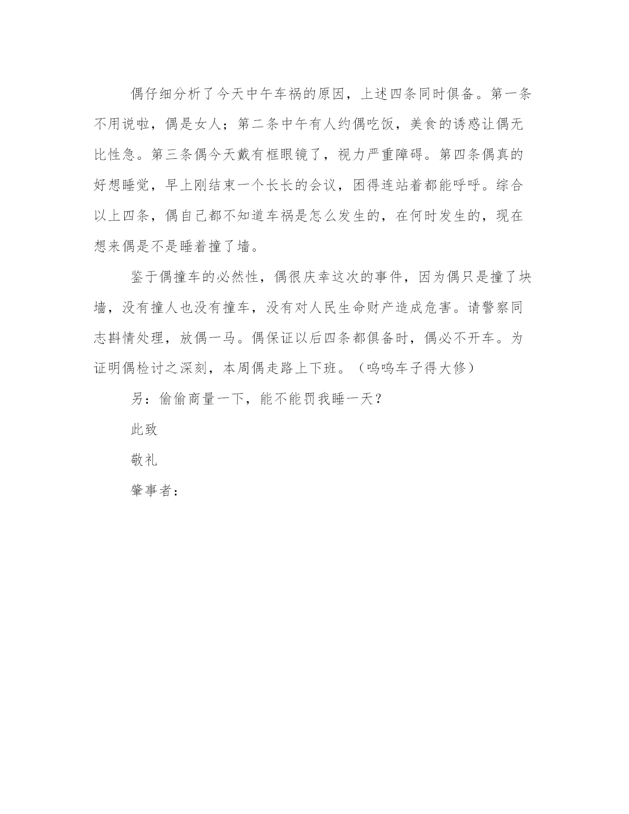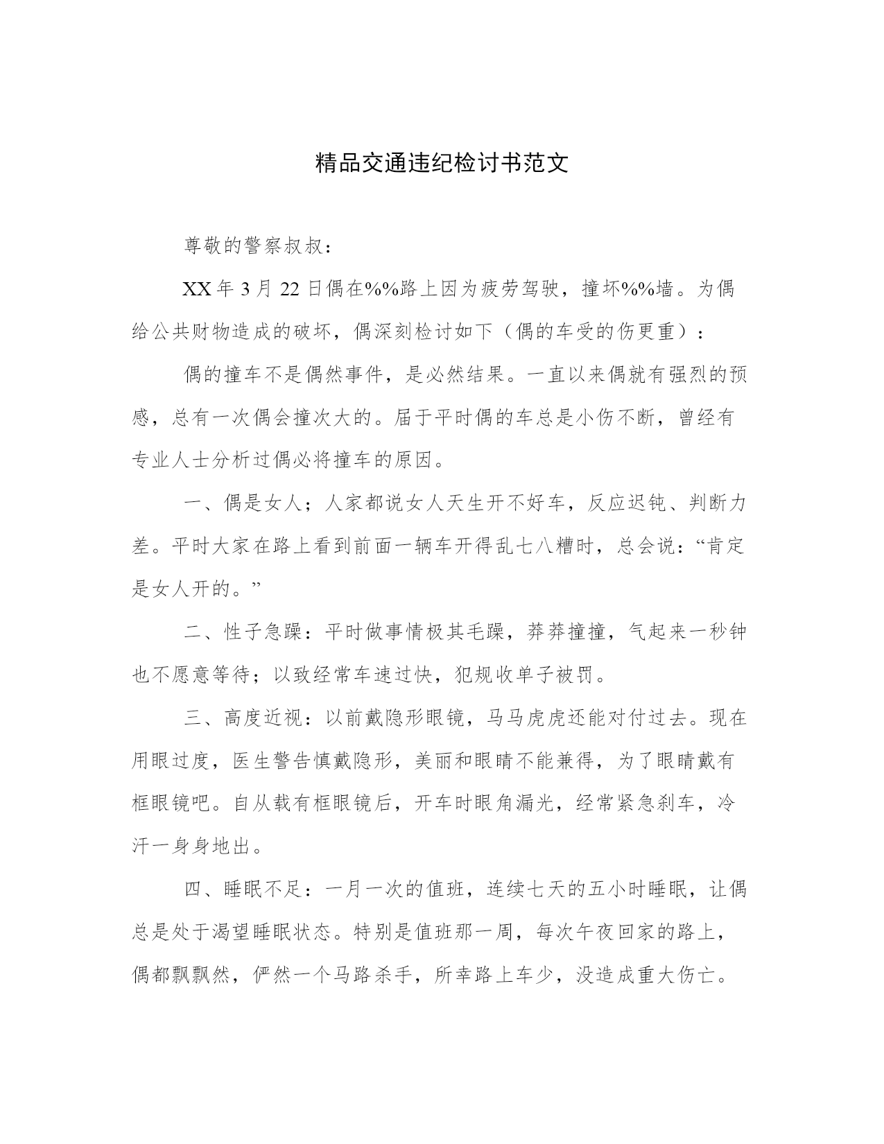 精品交通违纪检讨书范文尊敬的警察叔叔:XX年3月22日偶在%%路上因为疲劳驾驶,撞坏%%墙。为偶给公共财物造成的破坏,偶深刻检讨如下(偶的车受的伤更重):偶的撞车不是偶然事件,是必然结果。一直以来偶就有强烈的预感,总有一次偶会撞次大的。届于平时偶的车总是小伤不断,曾经有专业人士分析过偶必将撞车的原因。一、偶是女人;人家都说女人天生开不好车,反应迟钝、判断力差。平时大家在路上看到前面一辆车开得乱七八糟时,总会说:“肯定是女人开的。”二、性子急躁:平时做事情极其毛躁,莽莽撞撞,气起来一秒钟也不愿意等待;以致经常车速过快,犯规收单子被罚。三、高度近视:以前戴隐形眼镜,马马虎虎还能对付过去。现在用眼过度,医生警告慎戴隐形,美丽和眼睛不能兼得,为了眼睛戴有框眼镜吧。自从载有框眼镜后,开车时眼角漏光,经常紧急刹车,冷汗一身身地出。四、睡眠不足:一月一次的值班,连续七天的五小时睡眠,让偶总是处于渴望睡眠状态。特别是值班那一周,每次午夜回家的路上,偶都飘飘然,俨然一个马路杀手,所幸路上车少,没造成重大伤亡。偶仔细分析了今天中午车祸的原因,上述四条同时俱备。第一条不用说啦,偶是女人;第二条中午有人约偶吃饭,美食的诱惑让偶无比性急。第三条偶今天戴有框眼镜了,视力严重障碍。第四条偶真的好想睡觉,早上刚结束一个长长的会议,困得连站着都能呼呼。综合以上四条,偶自己都不知道车祸是怎么发生的,在何时发生的,现在想来偶是不是睡着撞了墙。鉴于偶撞车的必然性,偶很庆幸这次的事件,因为偶只是撞了块墙,没有撞人也没有撞车,没有对人民生命财产造成危害。请警察同志斟情处理,放偶一马。偶保证以后四条都俱备时,偶必不开车。为证明偶检讨之深刻,本周偶走路上下班。(呜呜车子得大修)另:偷偷商量一下,能不能罚我睡一天?此致敬礼肇事者: