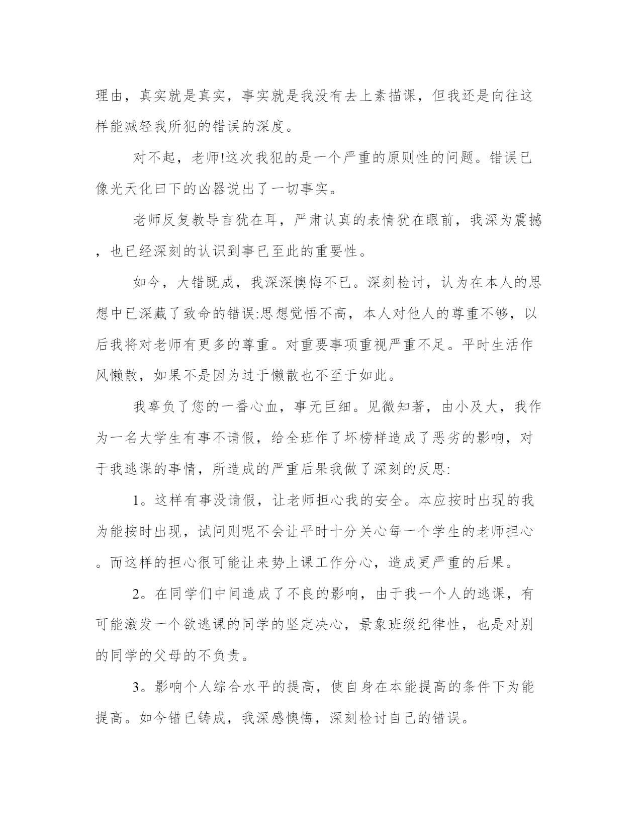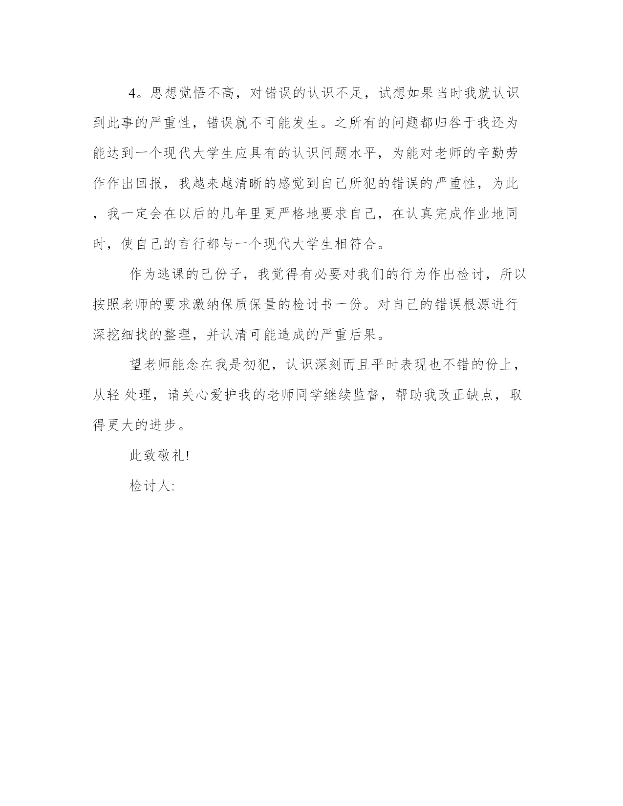 优选逃课检讨书工作文档本人由于逃了一节素描课,不想运气好背被烦人班主任逮住要写检讨书。便集个路精华总算搞定了,想想就这么交掉了也怪可惜的,不如给往后和我有一样遭遇的人一个样本!我最敬爱的老师:今天,我怀着愧疚和懊悔给您写下这份检讨书,以向您表示我对逃课这种不良行为的深刻认识以及再也不逃课的决心。早在我踏进校们,老师就已三申五令,一再强调,全校同学不得逃课。可是今天上午我还是逃了一堂老师给我们精心准备的无比生动的课,错过了一次老师呕心沥血给我们制作的知识大餐。美术是体现个人鉴赏能力和修养的一门课,我应当珍惜这个机会,可是我错过了,这莫过于人生的一大损失。同时,老师,您的关心也令我深深地感动,我知道少几个人上课对您来说知识有好处而没有损失的,可是您还是及时发现并教导我,令我下次不再犯。您是多么慈祥,多么伟大啊!我感激的泪水可以添满整个塔里木盆地;我因过分激动而跳跃的心可与唐山大地震相媲美;我浪女回头的决心可赛过女娲补天时的毅力。我坚决保证以后的素描课除极特别的原因我一定会在课堂上认真听讲。如果说把整个太平洋的水倒出来,都浇不灭我对您愤怒的火焰,那么,整个太平洋的水能全倒出来吗?不能,所以我并不恨您,所以我相信你一定能原谅我这次无意间所犯的错误,之所以说是无意间上因为真的没有弄清楚到底是不是在外写生,虽然这也许只是一个不假的理由,真实就是真实,事实就是我没有去上素描课,但我还是向往这样能减轻我所犯的错误的深度。对不起,老师!这次我犯的是一个严重的原则性的问题。错误已像光天化曰下的凶器说出了一切事实。老师反复教导言犹在耳,严肃认真的表情犹在眼前,我深为震撼,也已经深刻的认识到事已至此的重要性。如今,大错既成,我深深懊悔不已。深刻检讨,认为在本人的思想中已深藏了致命的错误:思想觉悟不高,本人对他人的尊重不够,以后我将对老师有更多的尊重。对重要事项重视严重不足。平时生活作风懒散,如果不是因为过于懒散也不至于如此。我辜负了您的一番心血,事无巨细。见微知著,由小及大,我作为一名大学生有事不请假,给全班作了坏榜样造成了恶劣的影响,对于我逃课的事情,所造成的严重后果我做了深刻的反思:1。这样有事没请假,让老师担心我的安全。本应按时出现的我为能按时出现,试问则呢不会让平时十分关心每一个学生的老师担心。而这样的担心很可能让来势上课工作分心,造成更严重的后果。2。在同学们中间造成了不良的影响,由于我一个人的逃课,有可能激发一个欲逃课的同学的坚定决心,景象班级纪律性,也是对别的同学的父母的不负责。3。影响个人综合水平的提高,使自身在本能提高的条件下为能提高。如今错已铸成,我深感懊悔,深刻检讨自己的错误。4。思想觉悟不高,对错误的认识不足,试想如果当时我就认识到此事的严重性,错误就不可能发生。之所有的问题都归咎于我还为能达到一个现代大学生应具有的认识问题水平,为能对老师的辛勤劳作作出回报,我越来越清晰的感觉到自己所犯的错误的严重性,为此,我一定会在以后的几年里更严格地要求自己,在认真完成作业地同时,使自己的言行都与一个现代大学生相符合。作为逃课的已份子,我觉得有必要对我们的行为作出检讨,所以按照老师的要求激纳保质保量的检讨书一份。对自己的错误根源进行深挖细找的整理,并认清可能造成的严重后果。望老师能念在我是初犯,认识深刻而且平时表现也不错的份上,从轻处理,请关心爱护我的老师同学继续监督,帮助我改正缺点,取得更大的进步。此致敬礼!检讨人:
