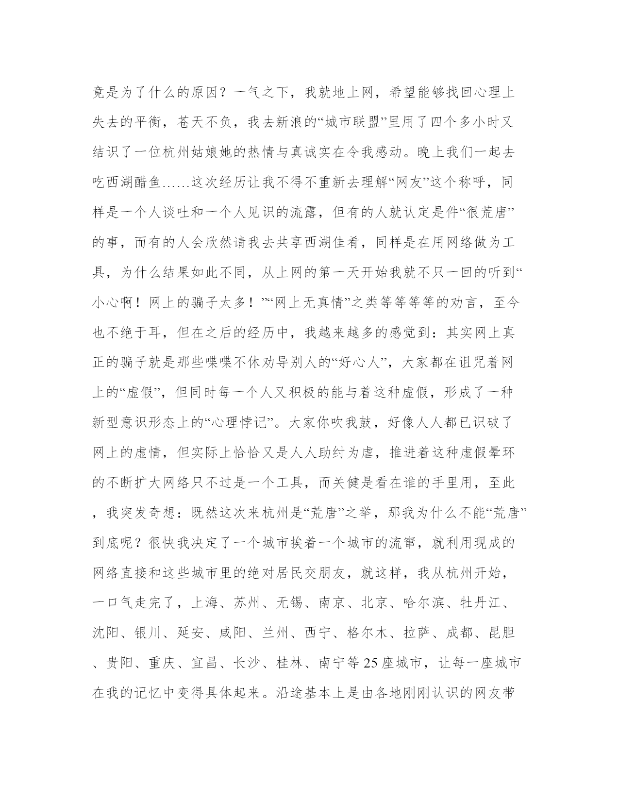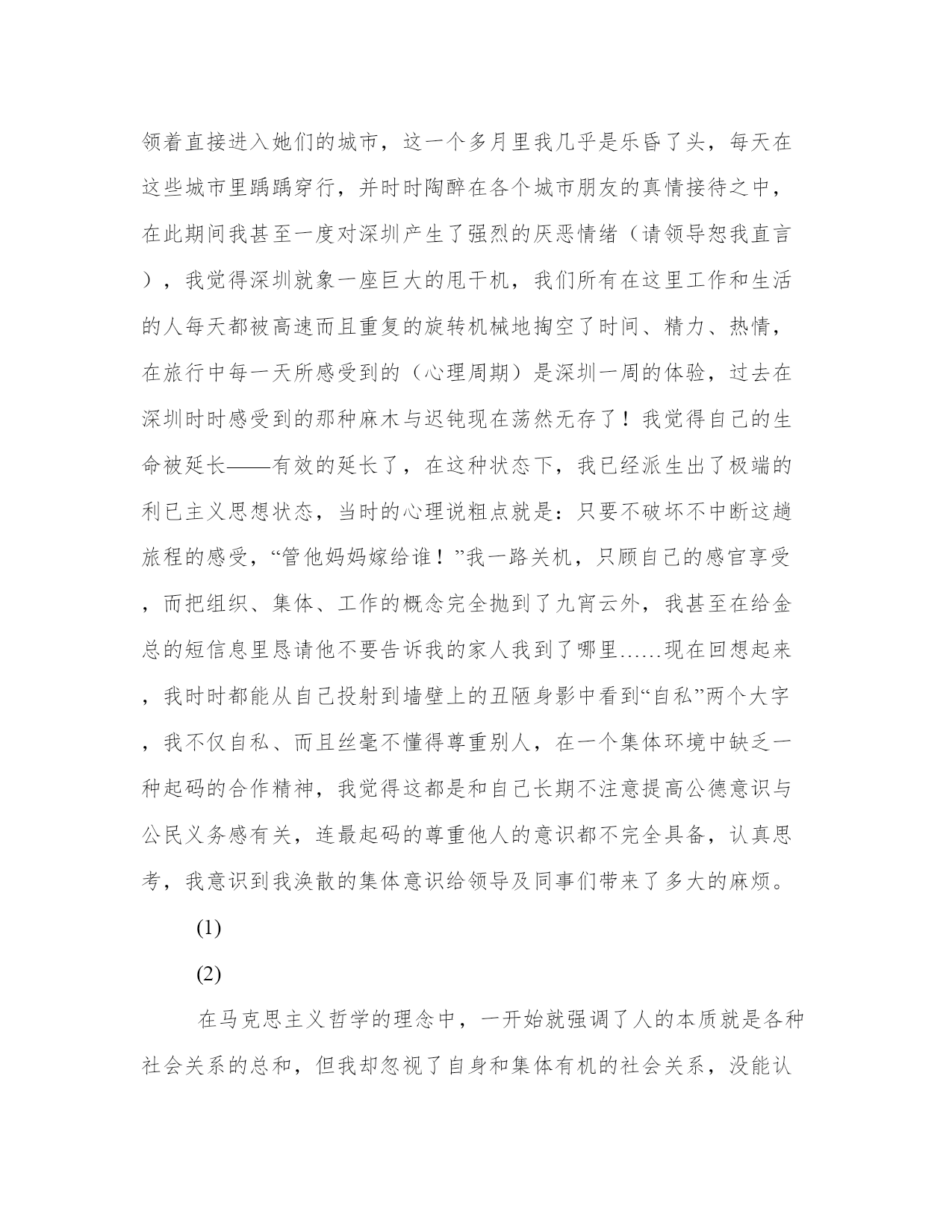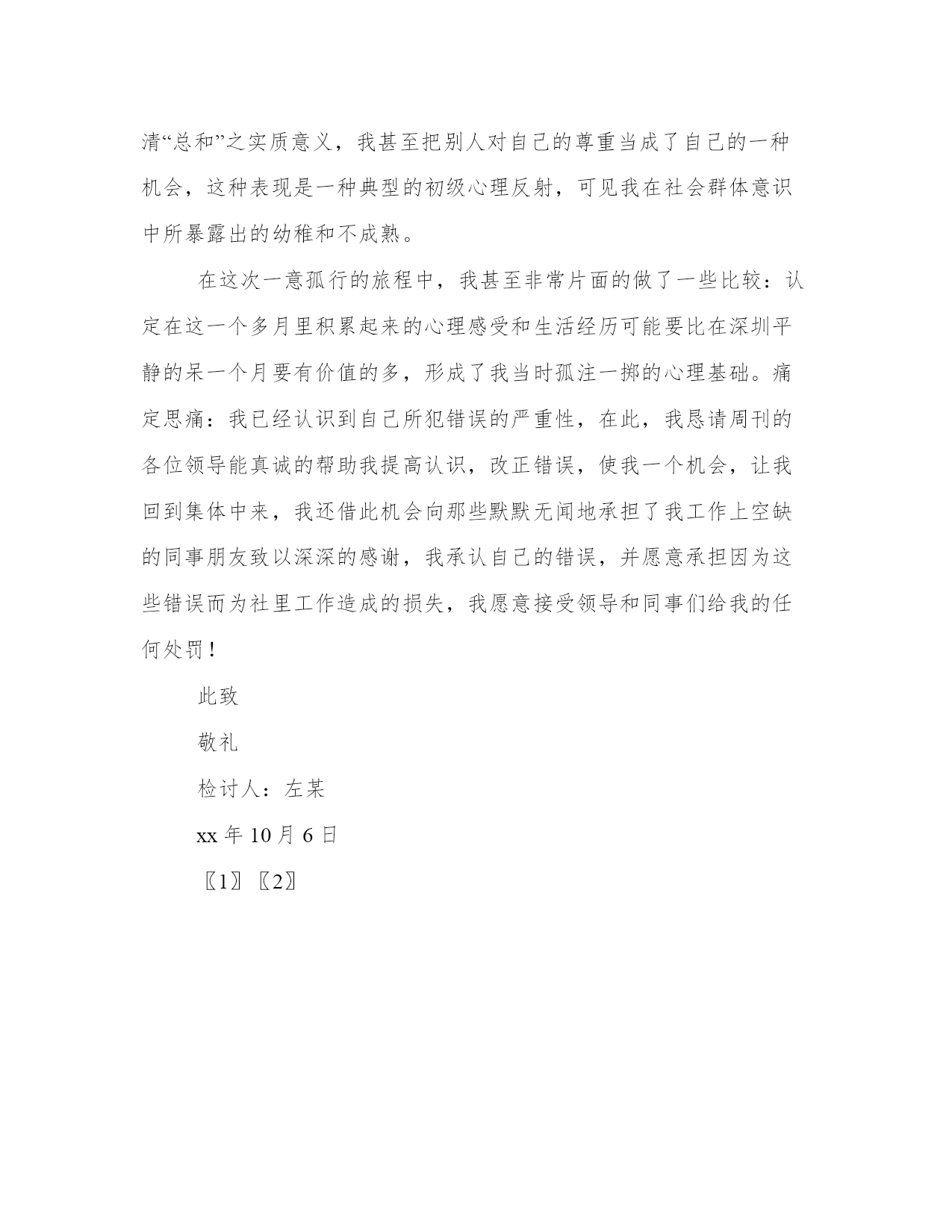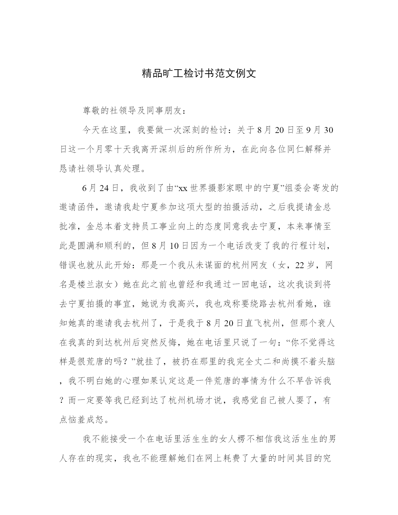 精品旷工检讨书范文例文尊敬的社领导及同事朋友:今天在这里,我要做一次深刻的检讨:关于8月20日至9月30日这一个月零十天我离开深圳后的所作所为,在此向各位同仁解释并恳请社领导认真处理。6月24日,我收到了由“xx世界摄影家眼中的宁夏”组委会寄发的邀请函件,邀请我赴宁夏参加这项大型的拍摄活动,之后我提请金总批准,金总本着支持员工事业向上的态度同意我去宁夏,本来事情至此是圆满和顺利的,但8月10日因为一个电话改变了我的行程计划,错误也就从此开始:那是一个我从未谋面的杭州网友(女,22岁,网名是楼兰淑女)她在此之前也曾经和我通过一回电话,这次我谈到将去宁夏拍摄的事宜,她说为我高兴,我也戏称要绕路去杭州看她,谁知她真的邀请我去杭州了,于是我于8月20日直飞杭州,但那个衰人在我真的到达杭州后突然反悔,她在电话里只说了一句:“你不觉得这样是很荒唐的吗?”就挂了,被扔在那里的我完全丈二和尚摸不着头脑,我不明白她的心理如果认定这是一件荒唐的事情为什么不早告诉我?而一定要等我已经到达了杭州机场才说,我感觉自己被人耍了,有点恼羞成怒。我不能接受一个在电话里活生生的女人楞不相信我这活生生的男人存在的现实,我也不能理解她们在网上耗费了大量的时间其目的究竟是为了什么的原因?一气之下,我就地上网,希望能够找回心理上失去的平衡,苍天不负,我去新浪的“城市联盟”里用了四个多小时又结识了一位杭州姑娘她的热情与真诚实在令我感动。晚上我们一起去吃西湖醋鱼……这次经历让我不得不重新去理解“网友”这个称呼,同样是一个人谈吐和一个人见识的流露,但有的人就认定是件“很荒唐”的事,而有的人会欣然请我去共享西湖佳肴,同样是在用网络做为工具,为什么结果如此不同,从上网的第一天开始我就不只一回的听到“小心啊!网上的骗子太多!”“网上无真情”之类等等等等的劝言,至今也不绝于耳,但在之后的经历中,我越来越多的感觉到:其实网上真正的骗子就是那些喋喋不休劝导别人的“好心人”,大家都在诅咒着网上的“虚假”,但同时每一个人又积极的能与着这种虚假,形成了一种新型意识形态上的“心理悖记”。大家你吹我鼓,好像人人都已识破了网上的虚情,但实际上恰恰又是人人助纣为虐,推进着这种虚假晕环的不断扩大网络只不过是一个工具,而关健是看在谁的手里用,至此,我突发奇想:既然这次来杭州是“荒唐”之举,那我为什么不能“荒唐”到底呢?很快我决定了一个城市挨着一个城市的流窜,就利用现成的网络直接和这些城市里的绝对居民交朋友,就这样,我从杭州开始,一口气走完了,上海、苏州、无锡、南京、北京、哈尔滨、牡丹江、沈阳、银川、延安、咸阳、兰州、西宁、格尔木、拉萨、成都、昆胆、贵阳、重庆、宜昌、长沙、桂林、南宁等25座城市,让每一座城市在我的记忆中变得具体起来。沿途基本上是由各地刚刚认识的网友带领着直接进入她们的城市,这一个多月里我几乎是乐昏了头,每天在这些城市里踽踽穿行,并时时陶醉在各个城市朋友的真情接待之中,在此期间我甚至一度对深圳产生了强烈的厌恶情绪(请领导恕我直言),我觉得深圳就象一座巨大的甩干机,我们所有在这里工作和生活的人每天都被高速而且重复的旋转机械地掏空了时间、精力、热情,在旅行中每一天所感受到的(心理周期)是深圳一周的体验,过去在深圳时时感受到的那种麻木与迟钝现在荡然无存了!我觉得自己的生命被延长——有效的延长了,在这种状态下,我已经派生出了极端的利已主义思想状态,当时的心理说粗点就是:只要不破坏不中断这趟旅程的感受,“管他妈妈嫁给谁!”我一路关机,只顾自己的感官享受,而把组织、集体、工作的概念完全抛到了九宵云外,我甚至在给金总的短信息里恳请他不要告诉我的家人我到了哪里……现在回想起来,我时时都能从自己投射到墙壁上的丑陋身影中看到“自私”两个大字,我不仅自私、而且丝毫不懂得尊重别人,在一个集体环境中缺乏一种起码的合作精神,我觉得这都是和自己长期不注意提高公德意识与公民义务感有关,连最起码的尊重他人的意识都不完全具备,认真思考,我意识到我涣散的集体意识给领导及同事们带来了多大的麻烦。(1)(2)在马克思主义哲学的理念中,一开始就强调了人的本质就是各种社会关系的总和,但我却忽视了自身和集体有机的社会关系,没能认清“总和”之实质意义,我甚至把别人对自己的尊重当成了自己的一种机会,这种表现是一种典型的初级心理反射,可见我在社会群体意识中所暴露出的幼稚和不成熟。在这次一意孤行的旅程中,我甚至非常片面的做了一些比较:认定在这一个多月里积累起来的心理感受和生活经历可能要比在深圳平静的呆一个月要有价值的多,形成了我当时孤注一掷的心理基础。痛定思痛:我已经认识到自己所犯错误的严重性,在此,我恳请周刊的各位领导能真诚的帮助我提高认识,改正错误,使我一个机会,让我回到集体中来,我还借此机会向那些默默无闻地承担了我工作上空缺的同事朋友致以