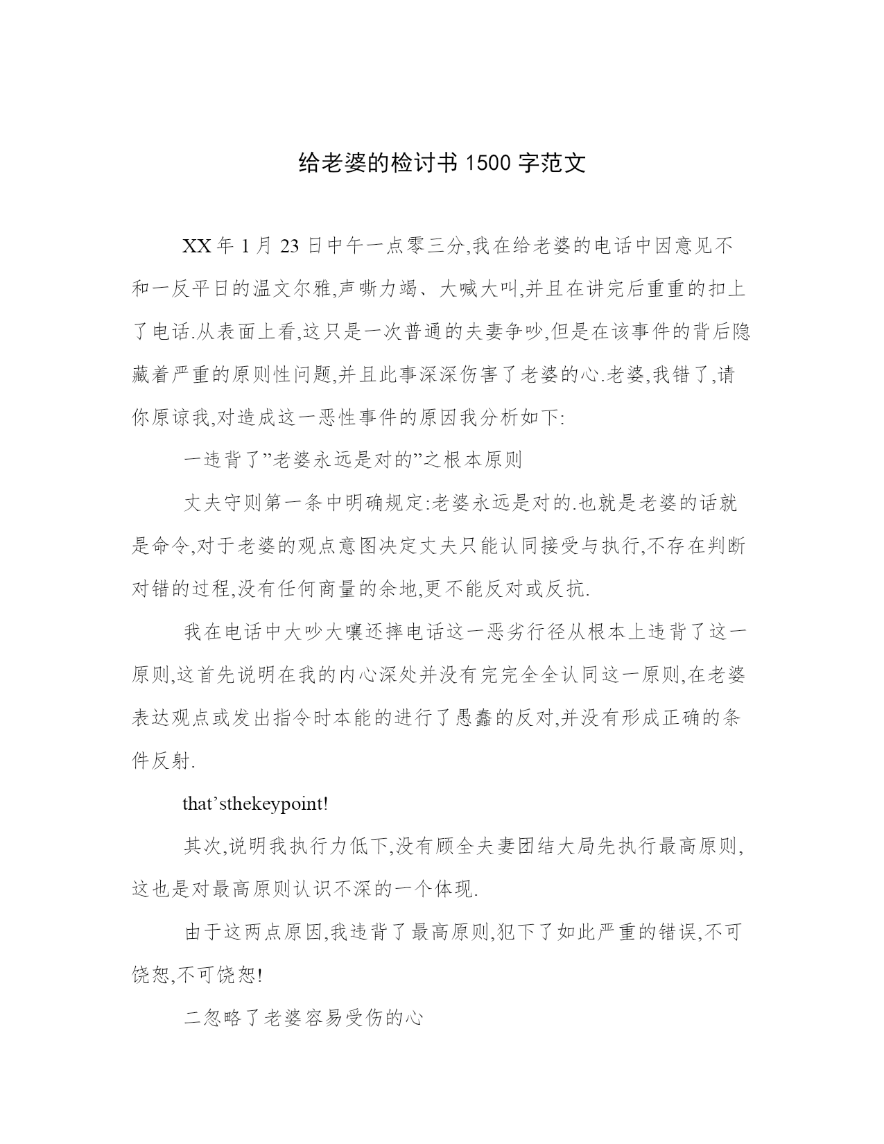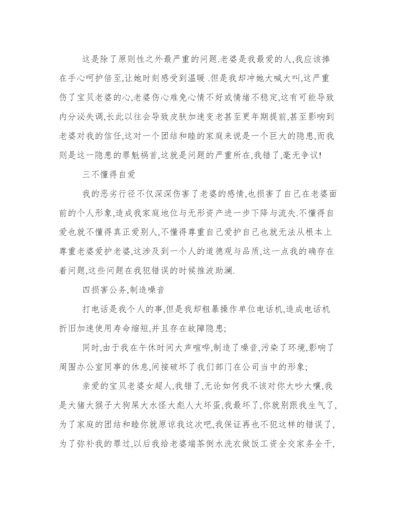 给老婆的检讨书1500字范文XX年1月23日中午一点零三分,我在给老婆的电话中因意见不和一反平日的温文尔雅,声嘶力竭﹑大喊大叫,并且在讲完后重重的扣上了电话.从表面上看,这只是一次普通的夫妻争吵,但是在该事件的背后隐藏着严重的原则性问题,并且此事深深伤害了老婆的心.老婆,我错了,请你原谅我,对造成这一恶性事件的原因我分析如下:一违背了”老婆永远是对的”之根本原则丈夫守则第一条中明确规定:老婆永远是对的.也就是老婆的话就是命令,对于老婆的观点意图决定丈夫只能认同接受与执行,不存在判断对错的过程,没有任何商量的余地,更不能反对或反抗.我在电话中大吵大嚷还摔电话这一恶劣行径从根本上违背了这一原则,这首先说明在我的内心深处并没有完完全全认同这一原则,在老婆表达观点或发出指令时本能的进行了愚蠢的反对,并没有形成正确的条件反射.that’sthekeypoint!其次,说明我执行力低下,没有顾全夫妻团结大局先执行最高原则,这也是对最高原则认识不深的一个体现.由于这两点原因,我违背了最高原则,犯下了如此严重的错误,不可饶恕,不可饶恕!二忽略了老婆容易受伤的心这是除了原则性之外最严重的问题.老婆是我最爱的人,我应该捧在手心呵护倍至,让她时刻感受到温暖.但是我却冲她大喊大叫,这严重伤了宝贝老婆的心,老婆伤心难免心情不好或情绪不稳定,这有可能导致内分泌失调,长此以往会导致皮肤加速变老甚至更年期提前,甚至影响到老婆对我的信任,这对一个团结和睦的家庭来说是一个巨大的隐患,而我则是这一隐患的罪魁祸首,这就是问题的严重所在,我错了,毫无争议!三不懂得自爱我的恶劣行径不仅深深伤害了老婆的感情,也损害了自己在老婆面前的个人形象,造成我家庭地位与无形资产进一步下降与流失.不懂得自爱也就不懂得真正爱别人,不懂得尊重自己爱护自己也就无法从根本上尊重老婆爱护老婆,这涉及到一个人的道德观与品质,这一点我的确存在着问题,这些问题在我犯错误的时候推波助澜.四损害公务,制造噪音打电话是我个人的事,但是我却粗暴操作单位电话机,造成电话机折旧加速使用寿命缩短,并且存在故障隐患;同时,由于我在午休时间大声喧哗,制造了噪音,污染了环境,影响了周围办公室同事的休息,间接破坏了我们部门在公司当中的形象;亲爱的宝贝老婆女超人,我错了,无论如何我不该对你大吵大嚷,我是大猪大猴子大狗屎大水怪大彪人大坏蛋,我最坏了,你就别跟我生气了,为了家庭的团结和睦你就原谅我这次吧,我保证再也不犯这样的错误了,为了弥补我的罪过,以后我给老婆端茶倒水洗衣做饭工资全交家务全干,保证你的心情舒畅保养你的靓丽容颜,保证你开开心心舒舒坦坦,时时刻刻感受到温暖!老婆,原谅我吧!检讨人:老公XX年1月23日