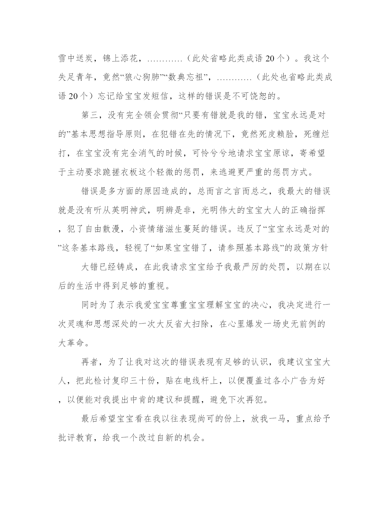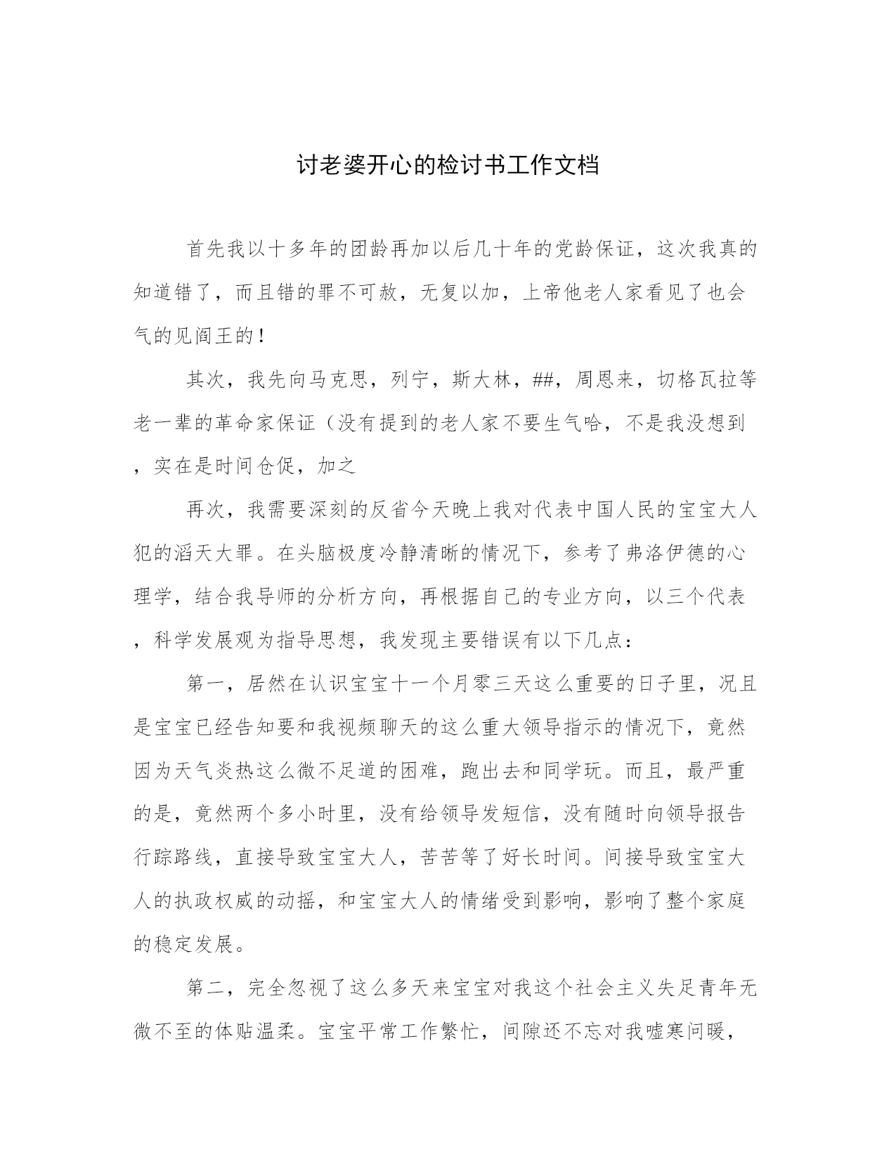 讨老婆开心的检讨书工作文档首先我以十多年的团龄再加以后几十年的党龄保证,这次我真的知道错了,而且错的罪不可赦,无复以加,上帝他老人家看见了也会气的见阎王的!其次,我先向马克思,列宁,斯大林,##,周恩来,切格瓦拉等老一辈的革命家保证(没有提到的老人家不要生气哈,不是我没想到,实在是时间仓促,加之再次,我需要深刻的反省今天晚上我对代表中国人民的宝宝大人犯的滔天大罪。在头脑极度冷静清晰的情况下,参考了弗洛伊德的心理学,结合我导师的分析方向,再根据自己的专业方向,以三个代表,科学发展观为指导思想,我发现主要错误有以下几点:第一,居然在认识宝宝十一个月零三天这么重要的日子里,况且是宝宝已经告知要和我视频聊天的这么重大领导指示的情况下,竟然因为天气炎热这么微不足道的困难,跑出去和同学玩。而且,最严重的是,竟然两个多小时里,没有给领导发短信,没有随时向领导报告行踪路线,直接导致宝宝大人,苦苦等了好长时间。间接导致宝宝大人的执政权威的动摇,和宝宝大人的情绪受到影响,影响了整个家庭的稳定发展。第二,完全忽视了这么多天来宝宝对我这个社会主义失足青年无微不至的体贴温柔。宝宝平常工作繁忙,间隙还不忘对我嘘寒问暖,雪中送炭,锦上添花,…………(此处省略此类成语20个)。我这个失足青年,竟然“狼心狗肺”“数典忘祖”,…………(此处也省略此类成语20个)忘记给宝宝发短信,这样的错误是不可饶恕的。第三,没有完全领会贯彻“只要有错就是我的错,宝宝永远是对的”基本思想指导原则,在犯错在先的情况下,竟然死皮赖脸,死缠烂打,在宝宝没有完全消气的时候,可怜兮兮地请求宝宝原谅,寄希望于主动要求跪搓衣板这个轻微的惩罚,来逃避更严重的惩罚方式。错误是多方面的原因造成的,总而言之言而总之,我最大的错误就是没有听从英明神武,明辨是非,光明伟大的宝宝大人的正确指挥,犯了自由散漫,小资情绪滋生蔓延的错误。违反了“宝宝永远是对的”这条基本路线,轻视了“如果宝宝错了,请参照基本路线”的政策方针大错已经铸成,在此我请求宝宝给予我最严厉的处罚,以期在以后的生活中得到足够的重视。同时为了表示我爱宝宝尊重宝宝理解宝宝的决心,我决定进行一次灵魂和思想深处的一次大反省大扫除,在心里爆发一场史无前例的大革命。再者,为了让我对这次的错误表现有足够的认识,我建议宝宝大人,把此检讨复印三十份,贴在电线杆上,以便覆盖过各小广告为好,以便能对我提出中肯的建议和提醒,避免下次再犯。最后希望宝宝看在我以往表现尚可的份上,放我一马,重点给予批评教育,给我一个改过自新的机会。此致敬礼贝贝敬上
