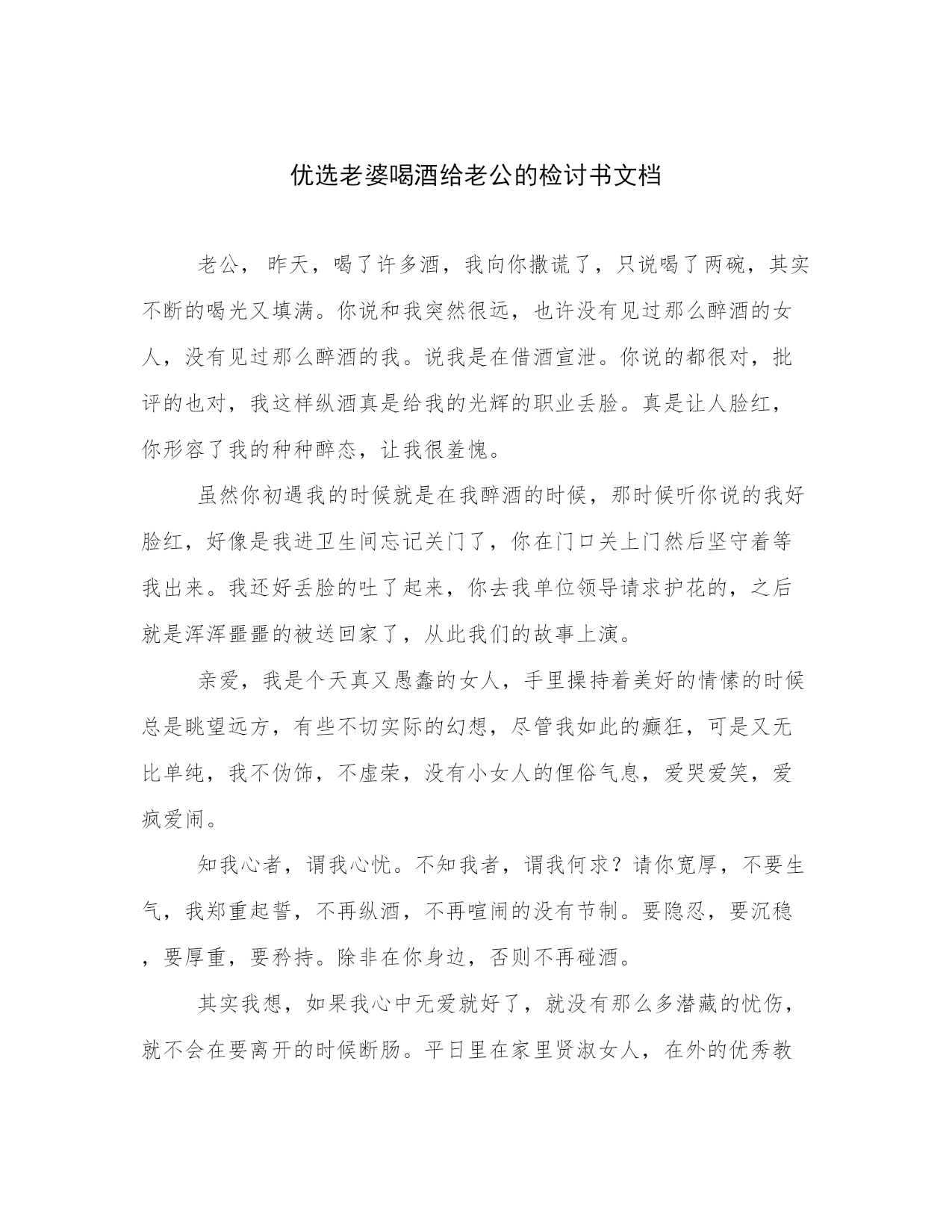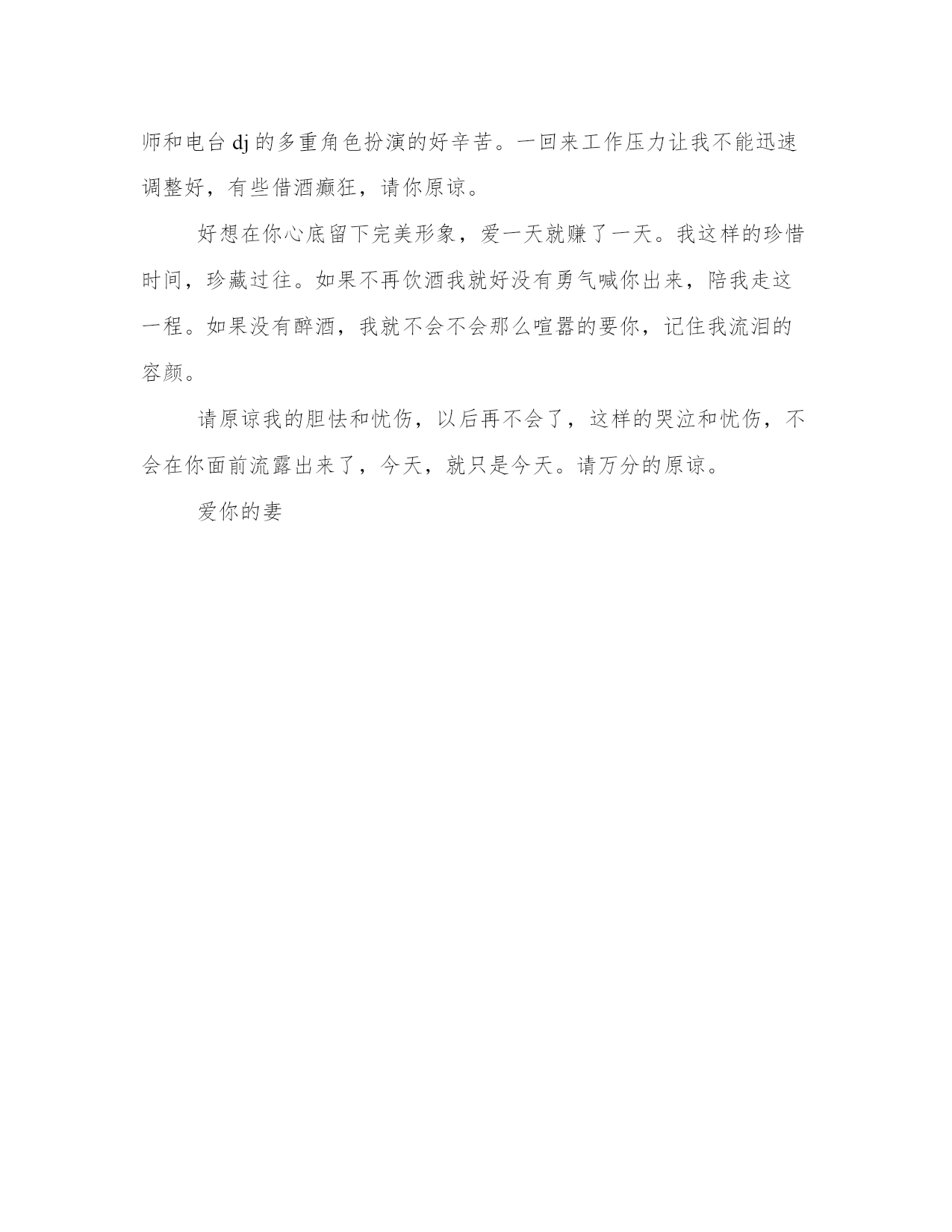 优选老婆喝酒给老公的检讨书文档老公,昨天,喝了许多酒,我向你撒谎了,只说喝了两碗,其实不断的喝光又填满。你说和我突然很远,也许没有见过那么醉酒的女人,没有见过那么醉酒的我。说我是在借酒宣泄。你说的都很对,批评的也对,我这样纵酒真是给我的光辉的职业丢脸。真是让人脸红,你形容了我的种种醉态,让我很羞愧。虽然你初遇我的时候就是在我醉酒的时候,那时候听你说的我好脸红,好像是我进卫生间忘记关门了,你在门口关上门然后坚守着等我出来。我还好丢脸的吐了起来,你去我单位领导请求护花的,之后就是浑浑噩噩的被送回家了,从此我们的故事上演。亲爱,我是个天真又愚蠢的女人,手里操持着美好的情愫的时候总是眺望远方,有些不切实际的幻想,尽管我如此的癫狂,可是又无比单纯,我不伪饰,不虚荣,没有小女人的俚俗气息,爱哭爱笑,爱疯爱闹。知我心者,谓我心忧。不知我者,谓我何求?请你宽厚,不要生气,我郑重起誓,不再纵酒,不再喧闹的没有节制。要隐忍,要沉稳,要厚重,要矜持。除非在你身边,否则不再碰酒。其实我想,如果我心中无爱就好了,就没有那么多潜藏的忧伤,就不会在要离开的时候断肠。平日里在家里贤淑女人,在外的优秀教师和电台dj的多重角色扮演的好辛苦。一回来工作压力让我不能迅速调整好,有些借酒癫狂,请你原谅。好想在你心底留下完美形象,爱一天就赚了一天。我这样的珍惜时间,珍藏过往。如果不再饮酒我就好没有勇气喊你出来,陪我走这一程。如果没有醉酒,我就不会不会那么喧嚣的要你,记住我流泪的容颜。请原谅我的胆怯和忧伤,以后再不会了,这样的哭泣和忧伤,不会在你面前流露出来了,今天,就只是今天。请万分的原谅。爱你的妻