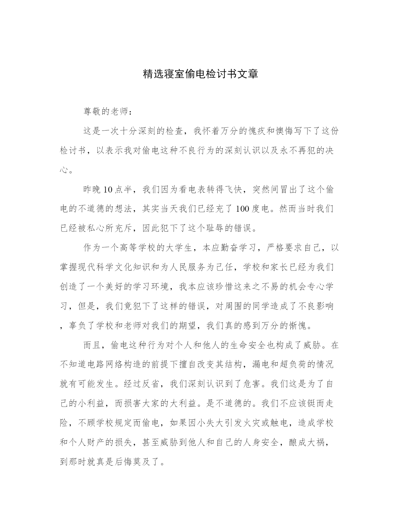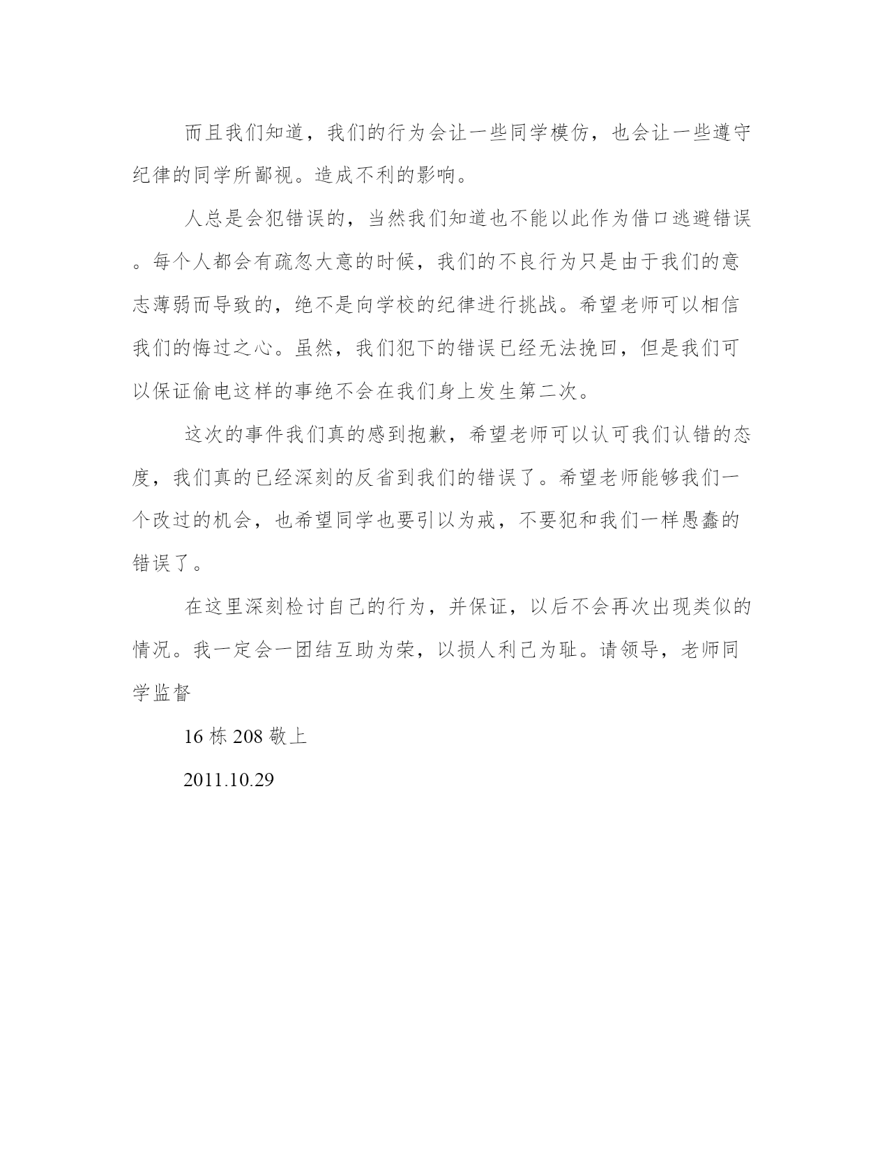 精选寝室偷电检讨书文章尊敬的老师:这是一次十分深刻的检查,我怀着万分的愧疚和懊悔写下了这份检讨书,以表示我对偷电这种不良行为的深刻认识以及永不再犯的决心。昨晚10点半,我们因为看电表转得飞快,突然间冒出了这个偷电的不道德的想法,其实当天我们已经充了100度电。然而当时我们已经被私心所充斥,因此犯下了这个耻辱的错误。作为一个高等学校的大学生,本应勤奋学习,严格要求自己,以掌握现代科学文化知识和为人民服务为己任,学校和家长已经为我们创造了一个美好的学习环境,我本应该珍惜这来之不易的机会专心学习,但是,我们竟犯下了这样的错误,对周围的同学造成了不良影响,辜负了学校和老师对我们的期望,我们真的感到万分的惭愧。而且,偷电这种行为对个人和他人的生命安全也构成了威胁。在不知道电路网络构造的前提下擅自改变其结构,漏电和超负荷的情况就有可能发生。经过反省,我们深刻认识到了危害。我们这是为了自己的小利益,而损害大家的大利益。是不道德的。我们不应该铤而走险,不顾学校规定而偷电,如果因小失大引发火灾或触电,造成学校和个人财产的损失,甚至威胁到他人和自己的人身安全,酿成大祸,到那时就真是后悔莫及了。而且我们知道,我们的行为会让一些同学模仿,也会让一些遵守纪律的同学所鄙视。造成不利的影响。人总是会犯错误的,当然我们知道也不能以此作为借口逃避错误。每个人都会有疏忽大意的时候,我们的不良行为只是由于我们的意志薄弱而导致的,绝不是向学校的纪律进行挑战。希望老师可以相信我们的悔过之心。虽然,我们犯下的错误已经无法挽回,但是我们可以保证偷电这样的事绝不会在我们身上发生第二次。这次的事件我们真的感到抱歉,希望老师可以认可我们认错的态度,我们真的已经深刻的反省到我们的错误了。希望老师能够我们一个改过的机会,也希望同学也要引以为戒,不要犯和我们一样愚蠢的错误了。在这里深刻检讨自己的行为,并保证,以后不会再次出现类似的情况。我一定会一团结互助为荣,以损人利己为耻。请领导,老师同学监督16栋208敬上2011.10.29