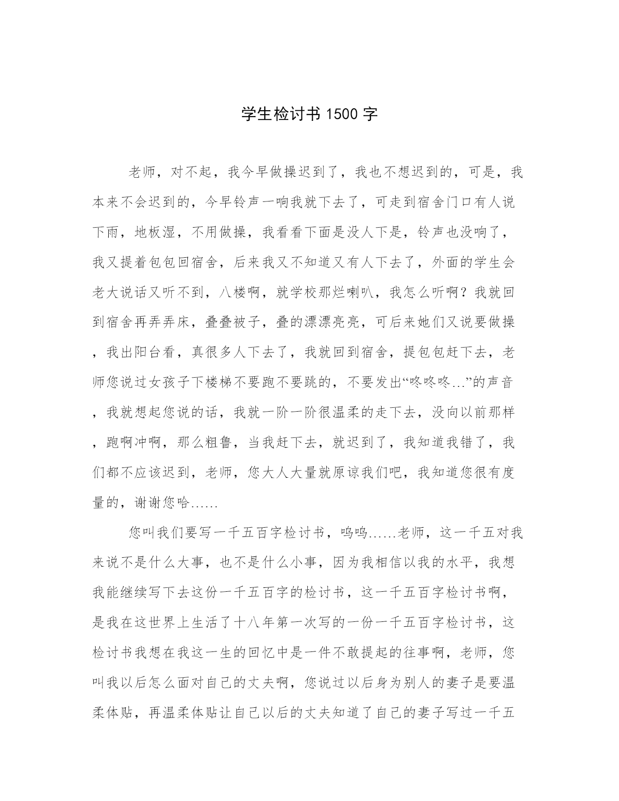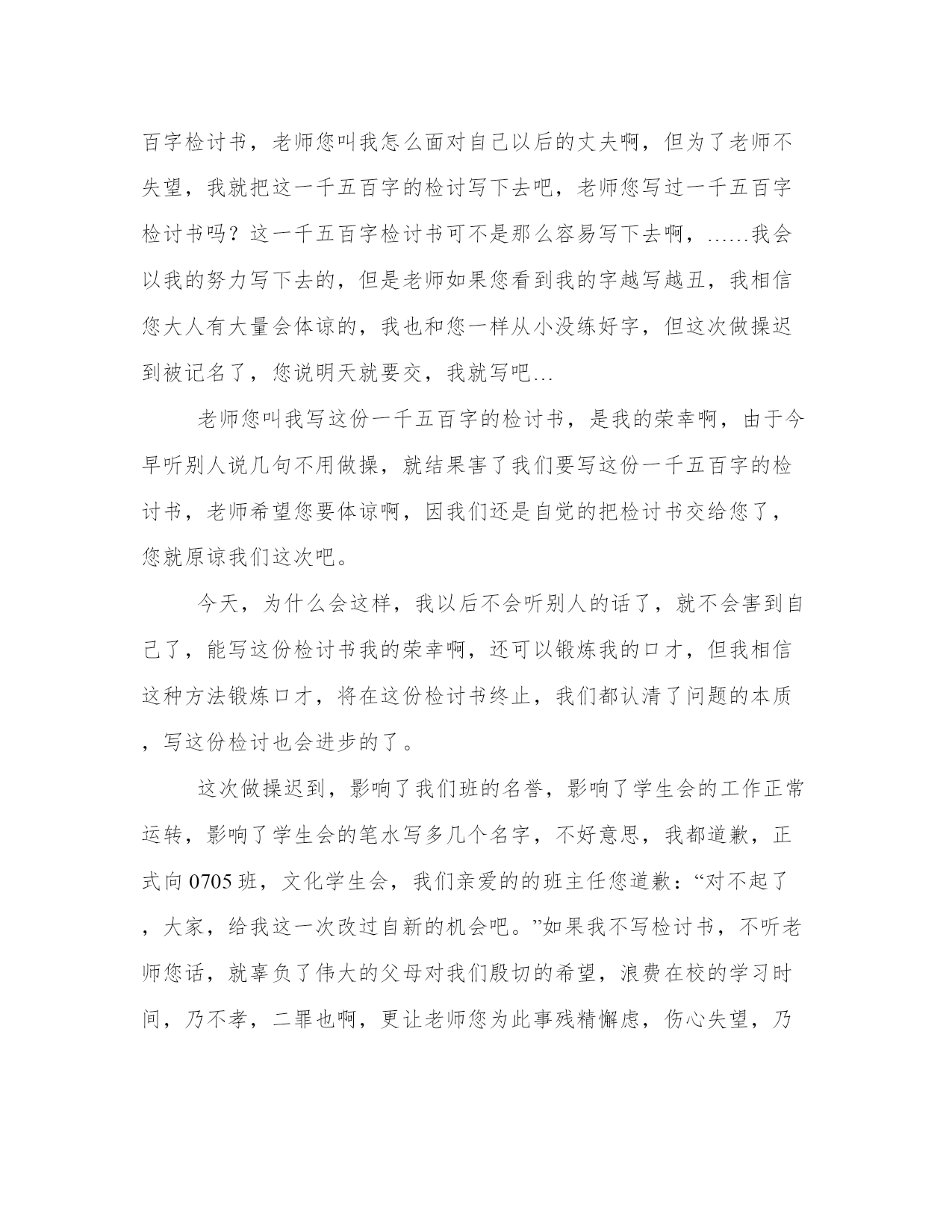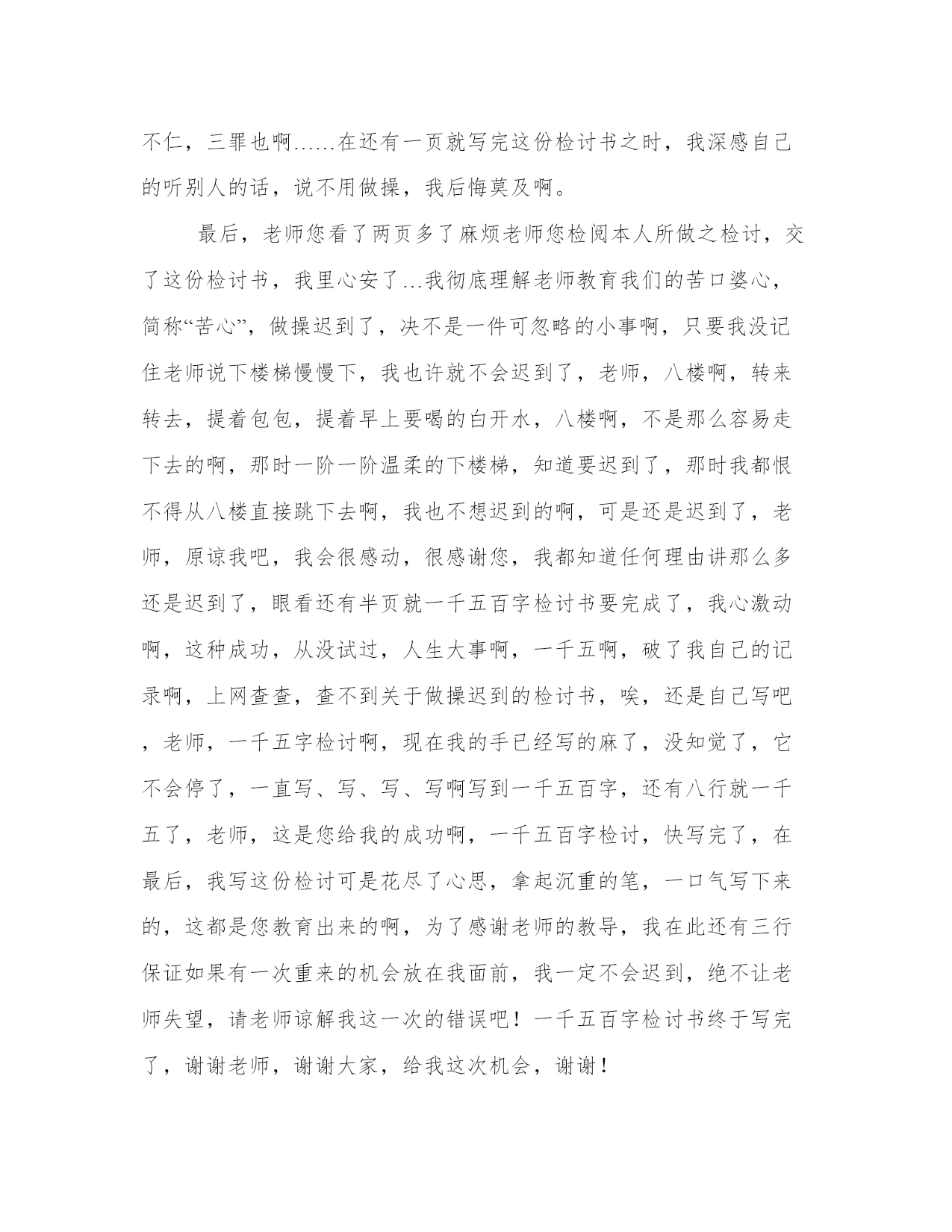 学生检讨书1500字老师,对不起,我今早做操迟到了,我也不想迟到的,可是,我本来不会迟到的,今早铃声一响我就下去了,可走到宿舍门口有人说下雨,地板湿,不用做操,我看看下面是没人下是,铃声也没响了,我又提着包包回宿舍,后来我又不知道又有人下去了,外面的学生会老大说话又听不到,八楼啊,就学校那烂喇叭,我怎么听啊?我就回到宿舍再弄弄床,叠叠被子,叠的漂漂亮亮,可后来她们又说要做操,我出阳台看,真很多人下去了,我就回到宿舍,提包包赶下去,老师您说过女孩子下楼梯不要跑不要跳的,不要发出“咚咚咚…”的声音,我就想起您说的话,我就一阶一阶很温柔的走下去,没向以前那样,跑啊冲啊,那么粗鲁,当我赶下去,就迟到了,我知道我错了,我们都不应该迟到,老师,您大人大量就原谅我们吧,我知道您很有度量的,谢谢您哈……您叫我们要写一千五百字检讨书,呜呜……老师,这一千五对我来说不是什么大事,也不是什么小事,因为我相信以我的水平,我想我能继续写下去这份一千五百字的检讨书,这一千五百字检讨书啊,是我在这世界上生活了十八年第一次写的一份一千五百字检讨书,这检讨书我想在我这一生的回忆中是一件不敢提起的往事啊,老师,您叫我以后怎么面对自己的丈夫啊,您说过以后身为别人的妻子是要温柔体贴,再温柔体贴让自己以后的丈夫知道了自己的妻子写过一千五百字检讨书,老师您叫我怎么面对自己以后的丈夫啊,但为了老师不失望,我就把这一千五百字的检讨写下去吧,老师您写过一千五百字检讨书吗?这一千五百字检讨书可不是那么容易写下去啊,……我会以我的努力写下去的,但是老师如果您看到我的字越写越丑,我相信您大人有大量会体谅的,我也和您一样从小没练好字,但这次做操迟到被记名了,您说明天就要交,我就写吧…老师您叫我写这份一千五百字的检讨书,是我的荣幸啊,由于今早听别人说几句不用做操,就结果害了我们要写这份一千五百字的检讨书,老师希望您要体谅啊,因我们还是自觉的把检讨书交给您了,您就原谅我们这次吧。今天,为什么会这样,我以后不会听别人的话了,就不会害到自己了,能写这份检讨书我的荣幸啊,还可以锻炼我的口才,但我相信这种方法锻炼口才,将在这份检讨书终止,我们都认清了问题的本质,写这份检讨也会进步的了。这次做操迟到,影响了我们班的名誉,影响了学生会的工作正常运转,影响了学生会的笔水写多几个名字,不好意思,我都道歉,正式向0705班,文化学生会,我们亲爱的的班主任您道歉:“对不起了,大家,给我这一次改过自新的机会吧。”如果我不写检讨书,不听老师您话,就辜负了伟大的父母对我们殷切的希望,浪费在校的学习时间,乃不孝,二罪也啊,更让老师您为此事残精懈虑,伤心失望,乃不仁,三罪也啊……在还有一页就写完这份检讨书之时,我深感自己的听别人的话,说不用做操,我后悔莫及啊。最后,老师您看了两页多了麻烦老师您检阅本人所做之检讨,交了这份检讨书,我里心安了…我彻底理解老师教育我们的苦口婆心,简称“苦心”,做操迟到了,决不是一件可忽略的小事啊,只要我没记住老师说下楼梯慢慢下,我也许就不会迟到了,老师,八楼啊,转来转去,提着包包,提着早上要喝的白开水,八楼啊,不是那么容易走下去的啊,那时一阶一阶温柔的下楼梯,知道要迟到了,那时我都恨不得从八楼直接跳下去啊,我也不想迟到的啊,可是还是迟到了,老师,原谅我吧,我会很感动,很感谢您,我都知道任何理由讲那么多还是迟到了,眼看还有半页就一千五百字检讨书要完成了,我心激动啊,这种成功,从没试过,人生大事啊,一千五啊,破了我自己的记录啊,上网查查,查不到关于做操迟到的检讨书,唉,还是自己写吧,老师,一千五字检讨啊,现在我的手已经写的麻了,没知觉了,它不会停了,一直写、写、写、写啊写到一千五百字,还有八行就一千五了,老师,这是您给我的成功啊,一千五百字检讨,快写完了,在最后,我写这份检讨可是花尽了心思,拿起沉重的笔,一口气写下来的,这都是您教育出来的啊,为了感谢老师的教导,我在此还有三行保证如果有一次重来的机会放在我面前,我一定不会迟到,绝不让老师失望,请老师谅解我这一次的错误吧!一千五百字检讨书终于写完了,谢谢老师,谢谢大家,给我这次机会,谢谢!