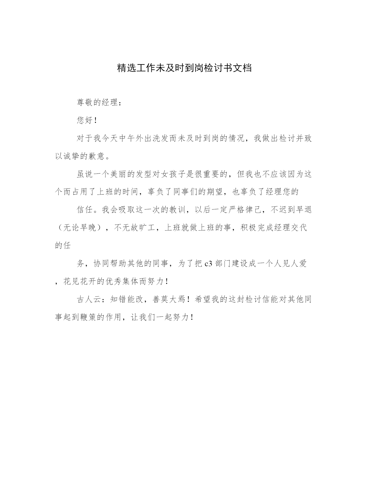 精选工作未及时到岗检讨书文档尊敬的经理:您好!对于我今天中午外出洗发而未及时到岗的情况,我做出检讨并致以诚挚的歉意。虽说一个美丽的发型对女孩子是很重要的,但我也不应该因为这个而占用了上班的时间,辜负了同事们的期望,也辜负了经理您的信任。我会吸取这一次的教训,以后一定严格律己,不迟到早退(无论早晚),不无故旷工,上班就做上班的事,积极完成经理交代的任务,协同帮助其他的同事,为了把c3部门建设成一个人见人爱,花见花开的优秀集体而努力!古人云:知错能改,善莫大焉!希望我的这封检讨信能对其他同事起到鞭策的作用,让我们一起努力!