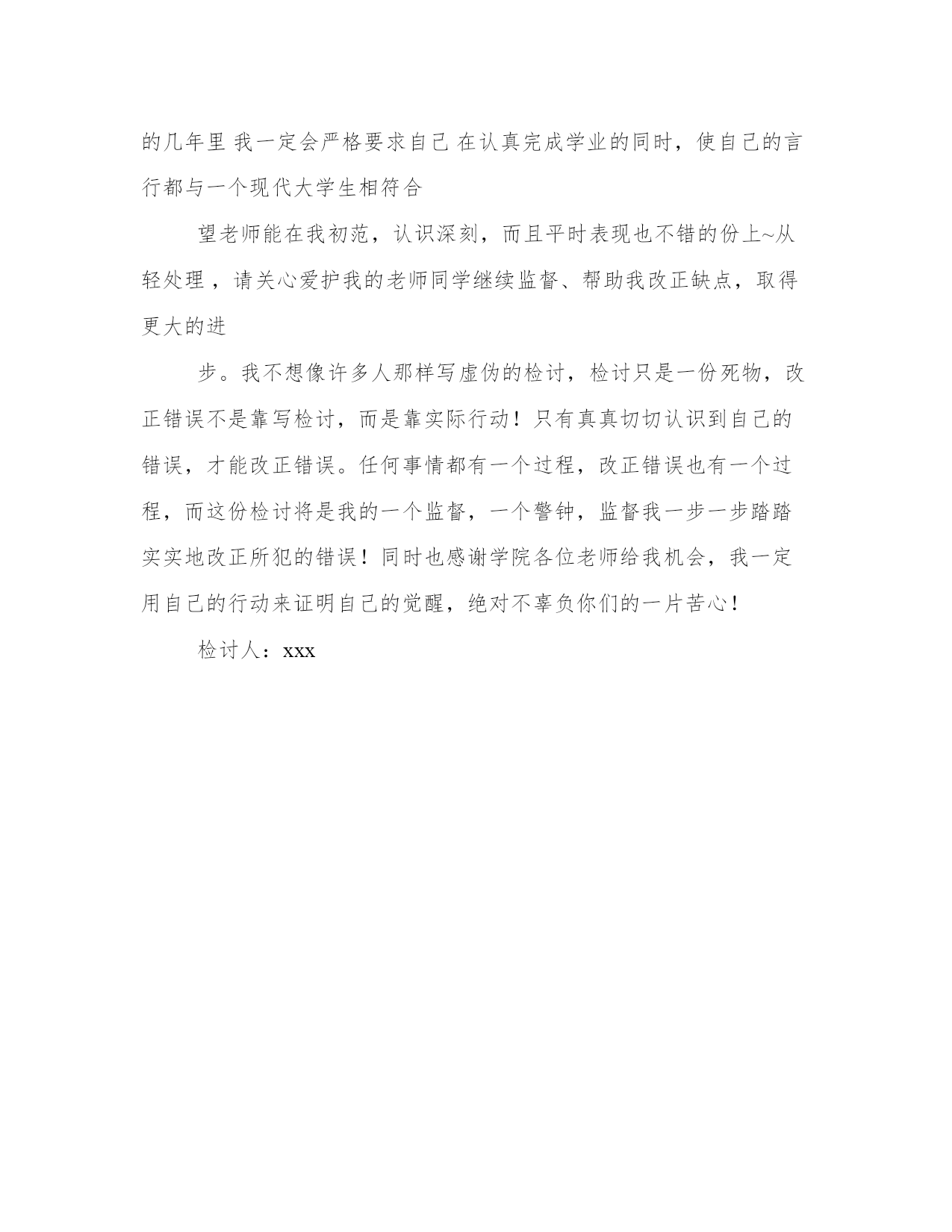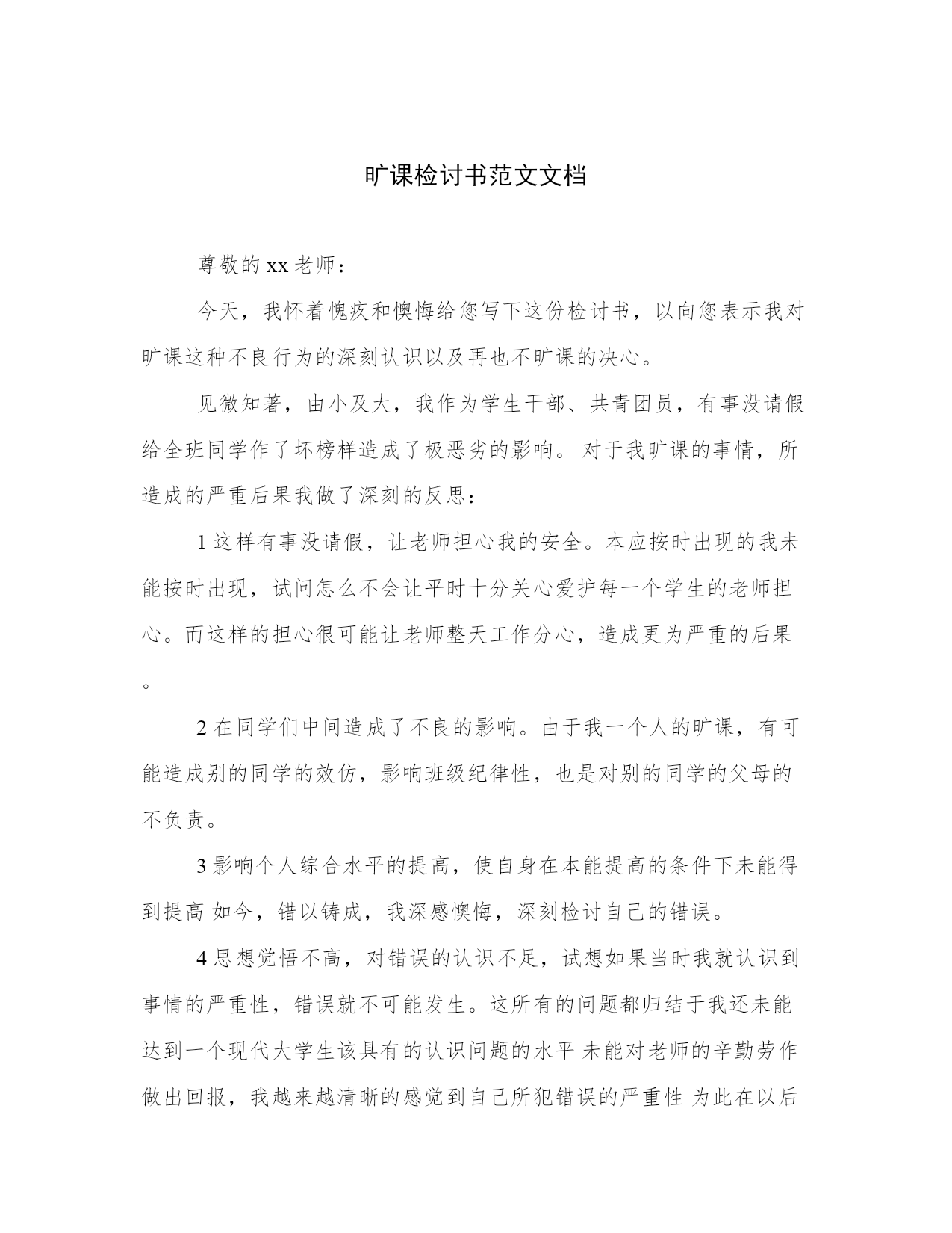 旷课检讨书范文文档尊敬的xx老师:今天,我怀着愧疚和懊悔给您写下这份检讨书,以向您表示我对旷课这种不良行为的深刻认识以及再也不旷课的决心。见微知著,由小及大,我作为学生干部、共青团员,有事没请假给全班同学作了坏榜样造成了极恶劣的影响。对于我旷课的事情,所造成的严重后果我做了深刻的反思:1这样有事没请假,让老师担心我的安全。本应按时出现的我未能按时出现,试问怎么不会让平时十分关心爱护每一个学生的老师担心。而这样的担心很可能让老师整天工作分心,造成更为严重的后果。2在同学们中间造成了不良的影响。由于我一个人的旷课,有可能造成别的同学的效仿,影响班级纪律性,也是对别的同学的父母的不负责。3影响个人综合水平的提高,使自身在本能提高的条件下未能得到提高如今,错以铸成,我深感懊悔,深刻检讨自己的错误。4思想觉悟不高,对错误的认识不足,试想如果当时我就认识到事情的严重性,错误就不可能发生。这所有的问题都归结于我还未能达到一个现代大学生该具有的认识问题的水平未能对老师的辛勤劳作做出回报,我越来越清晰的感觉到自己所犯错误的严重性为此在以后的几年里我一定会严格要求自己在认真完成学业的同时,使自己的言行都与一个现代大学生相符合望老师能在我初范,认识深刻,而且平时表现也不错的份上~从轻处理,请关心爱护我的老师同学继续监督、帮助我改正缺点,取得更大的进步。我不想像许多人那样写虚伪的检讨,检讨只是一份死物,改正错误不是靠写检讨,而是靠实际行动!只有真真切切认识到自己的错误,才能改正错误。任何事情都有一个过程,改正错误也有一个过程,而这份检讨将是我的一个监督,一个警钟,监督我一步一步踏踏实实地改正所犯的错误!同时也感谢学院各位老师给我机会,我一定用自己的行动来证明自己的觉醒,绝对不辜负你们的一片苦心!检讨人:xxx