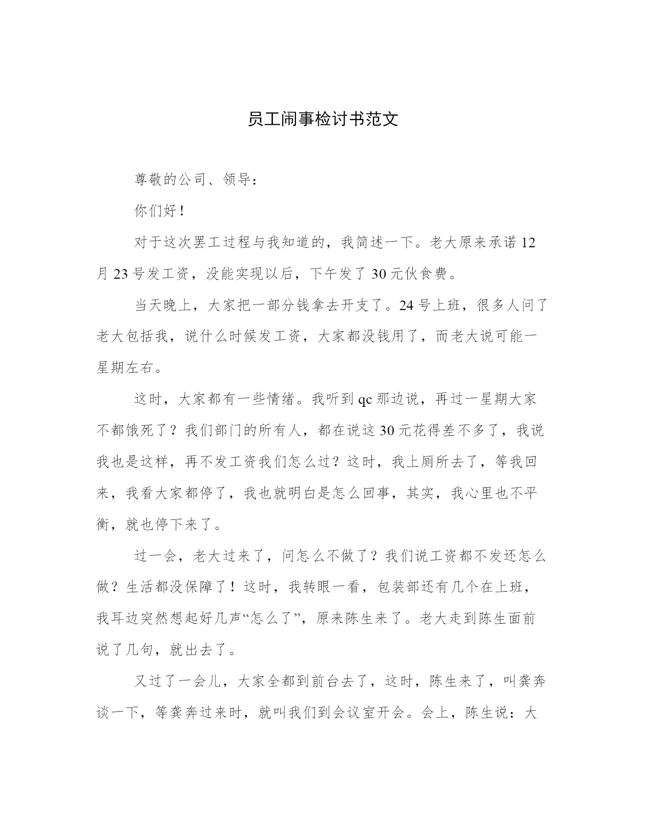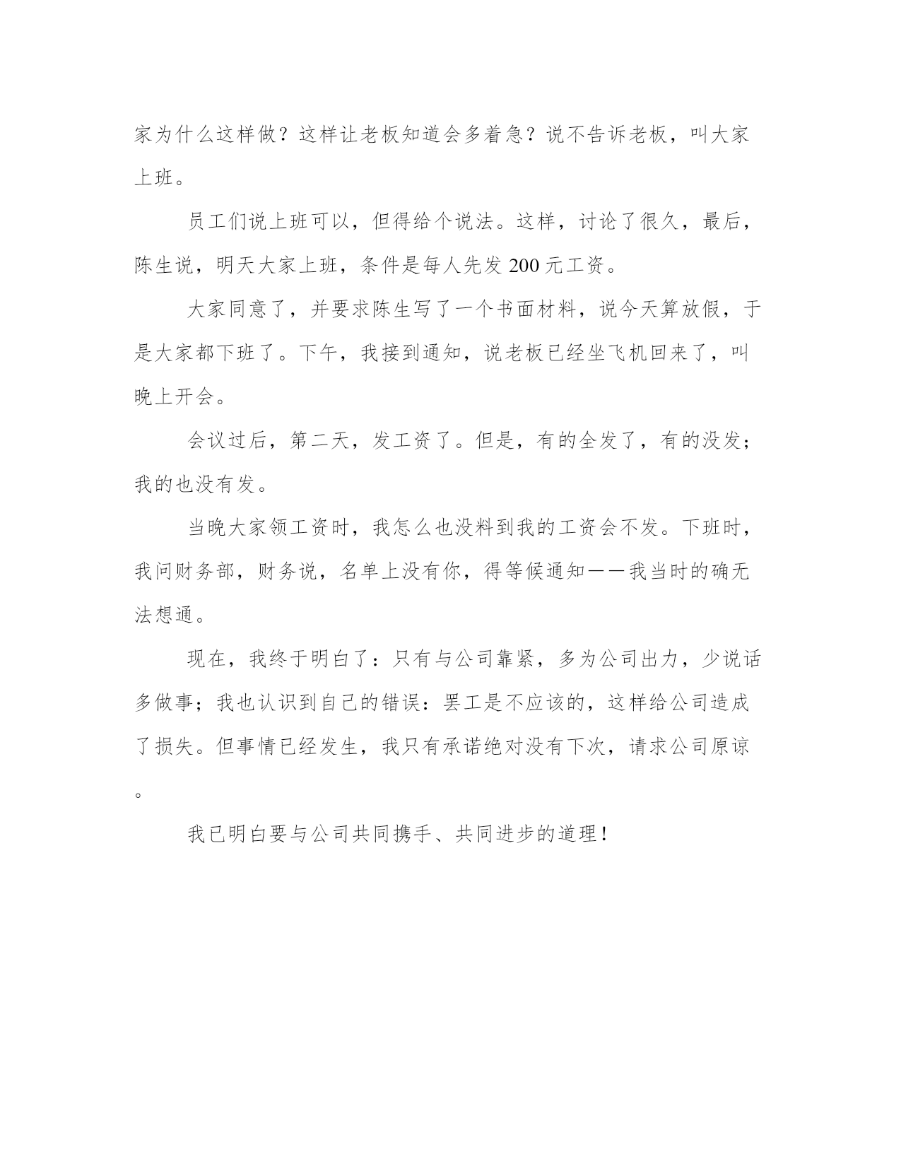 员工闹事检讨书范文尊敬的公司、领导:你们好!对于这次罢工过程与我知道的,我简述一下。老大原来承诺12月23号发工资,没能实现以后,下午发了30元伙食费。当天晚上,大家把一部分钱拿去开支了。24号上班,很多人问了老大包括我,说什么时候发工资,大家都没钱用了,而老大说可能一星期左右。这时,大家都有一些情绪。我听到qc那边说,再过一星期大家不都饿死了?我们部门的所有人,都在说这30元花得差不多了,我说我也是这样,再不发工资我们怎么过?这时,我上厕所去了,等我回来,我看大家都停了,我也就明白是怎么回事,其实,我心里也不平衡,就也停下来了。过一会,老大过来了,问怎么不做了?我们说工资都不发还怎么做?生活都没保障了!这时,我转眼一看,包装部还有几个在上班,我耳边突然想起好几声“怎么了”,原来陈生来了。老大走到陈生面前说了几句,就出去了。又过了一会儿,大家全都到前台去了,这时,陈生来了,叫龚奔谈一下,等龚奔过来时,就叫我们到会议室开会。会上,陈生说:大家为什么这样做?这样让老板知道会多着急?说不告诉老板,叫大家上班。员工们说上班可以,但得给个说法。这样,讨论了很久,最后,陈生说,明天大家上班,条件是每人先发200元工资。大家同意了,并要求陈生写了一个书面材料,说今天算放假,于是大家都下班了。下午,我接到通知,说老板已经坐飞机回来了,叫晚上开会。会议过后,第二天,发工资了。但是,有的全发了,有的没发;我的也没有发。当晚大家领工资时,我怎么也没料到我的工资会不发。下班时,我问财务部,财务说,名单上没有你,得等候通知--我当时的确无法想通。现在,我终于明白了:只有与公司靠紧,多为公司出力,少说话多做事;我也认识到自己的错误:罢工是不应该的,这样给公司造成了损失。但事情已经发生,我只有承诺绝对没有下次,请求公司原谅。我已明白要与公司共同携手、共同进步的道理!