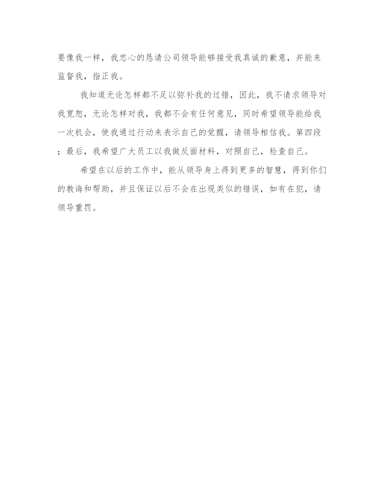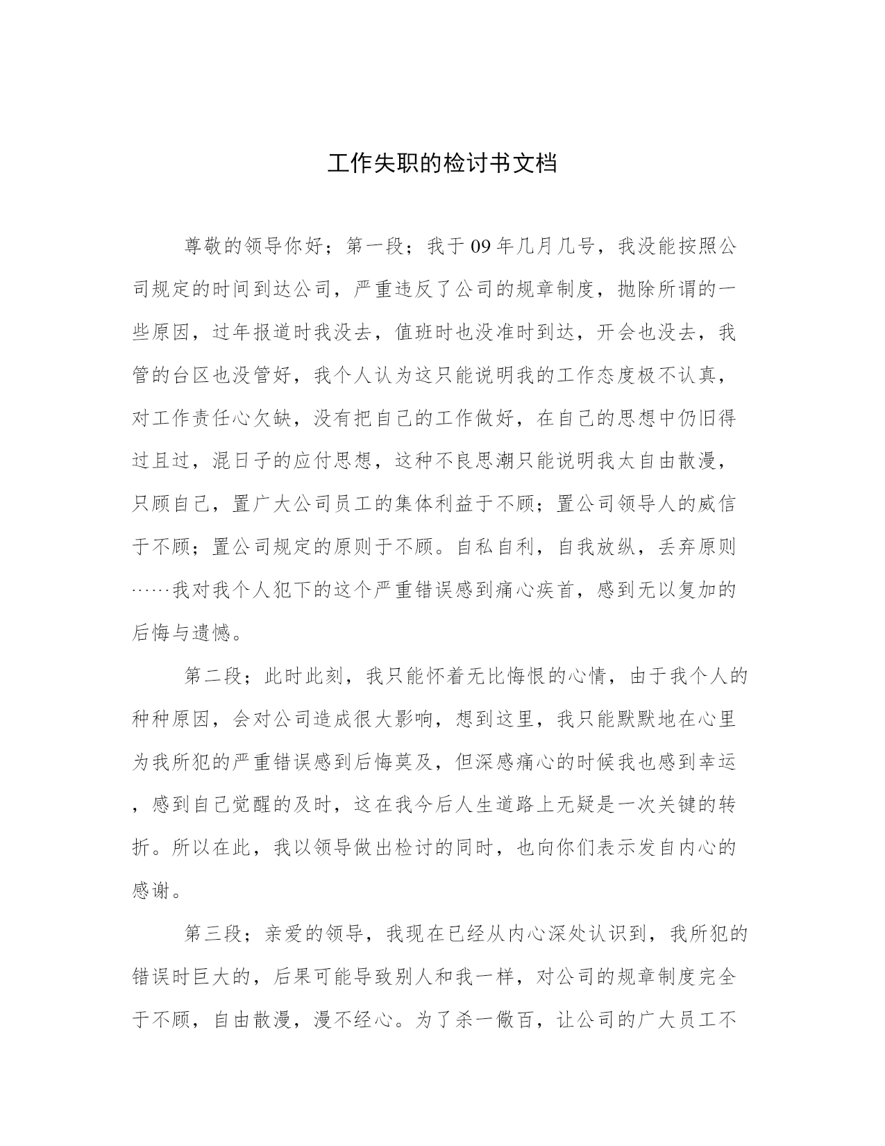 工作失职的检讨书文档尊敬的领导你好;第一段;我于09年几月几号,我没能按照公司规定的时间到达公司,严重违反了公司的规章制度,抛除所谓的一些原因,过年报道时我没去,值班时也没准时到达,开会也没去,我管的台区也没管好,我个人认为这只能说明我的工作态度极不认真,对工作责任心欠缺,没有把自己的工作做好,在自己的思想中仍旧得过且过,混日子的应付思想,这种不良思潮只能说明我太自由散漫,只顾自己,置广大公司员工的集体利益于不顾;置公司领导人的威信于不顾;置公司规定的原则于不顾。自私自利,自我放纵,丢弃原则······我对我个人犯下的这个严重错误感到痛心疾首,感到无以复加的后悔与遗憾。第二段;此时此刻,我只能怀着无比悔恨的心情,由于我个人的种种原因,会对公司造成很大影响,想到这里,我只能默默地在心里为我所犯的严重错误感到后悔莫及,但深感痛心的时候我也感到幸运,感到自己觉醒的及时,这在我今后人生道路上无疑是一次关键的转折。所以在此,我以领导做出检讨的同时,也向你们表示发自内心的感谢。第三段;亲爱的领导,我现在已经从内心深处认识到,我所犯的错误时巨大的,后果可能导致别人和我一样,对公司的规章制度完全于不顾,自由散漫,漫不经心。为了杀一儆百,让公司的广大员工不要像我一样,我忠心的恳请公司领导能够接受我真诚的歉意,并能来监督我,指正我。我知道无论怎样都不足以弥补我的过错,因此,我不请求领导对我宽恕,无论怎样对我,我都不会有任何意见,同时希望领导能给我一次机会,使我通过行动来表示自己的觉醒,请领导相信我。第四段;最后,我希望广大员工以我做反面材料,对照自己,检查自己。希望在以后的工作中,能从领导身上得到更多的智慧,得到你们的教诲和帮助,并且保证以后不会在出现类似的错误,如有在犯,请领导重罚。