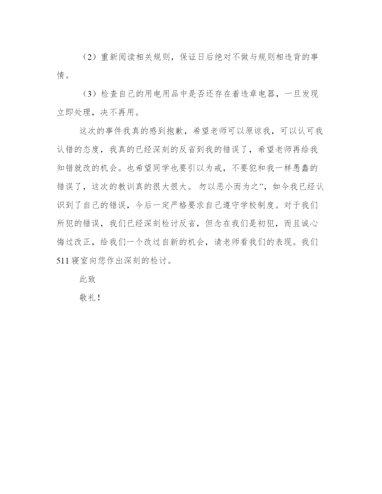 寝室内使用违章电器检讨书文档尊敬的老师:您好!我们对自己差点违反学校规定在寝室内使用违章电器的行为向您表示歉意和强烈的自责。我们差点犯了使用大功率电器的错误,多亏老师及时发现,阿姨及时制止,才避免了更大的错误的发生,如果那天没有被发现,我们一定会犯措,等到真的出了事情,后悔也没用了。今天我们又是一整天的课,想吃点热腾腾的东西,但是由于课的原因我们经常去食堂已经没有菜了,所以我们决定好好犒劳一下自己。。。于是,向住在校外的同学借来了火锅,准备晚上大吃一顿,而且我们利用好不容易中午空闲的时间买来了菜,特地洗好准备好,以便一下课回寝室就能吃。但回寝室后发现桌上老师您留下的纸条,心里就慌了,正当我们不知道该怎么办的时候,阿姨及时出现了,告诉我们事情的严重性,让我们从心底里打消了这个念头,后来我们就把火锅连同准备好的菜都搬到住校外的同学那里了。针对所犯的错误我们寝室决定执行以下整改措施:(1)立即召开寝室会议,就违章用电的事件相关人做出深刻地检讨,给寝室带来的不好影响要负起责任,并立下保证。(2)重新阅读相关规则,保证日后绝对不做与规则相违背的事情。(3)检查自己的用电用品中是否还存在着违章电器,一旦发现立即处理,决不再用。这次的事件我真的感到抱歉,希望老师可以原谅我,可以认可我认错的态度,我真的已经深刻的反省到我的错误了,希望老师再给我知错就改的机会。也希望同学也要引以为戒,不要犯和我一样愚蠢的错误了,这次的教训真的很大很大。勿以恶小而为之”,如今我已经认识到了自己的错误,今后一定严格要求自己遵守学校制度。对于我们所犯的错误,我们已经深刻检讨反省,但念在我们是初犯,而且诚心悔过改正,给我们一个改过自新的机会,请老师看我们的表现。我们511寝室向您作出深刻的检讨。此致敬礼!
