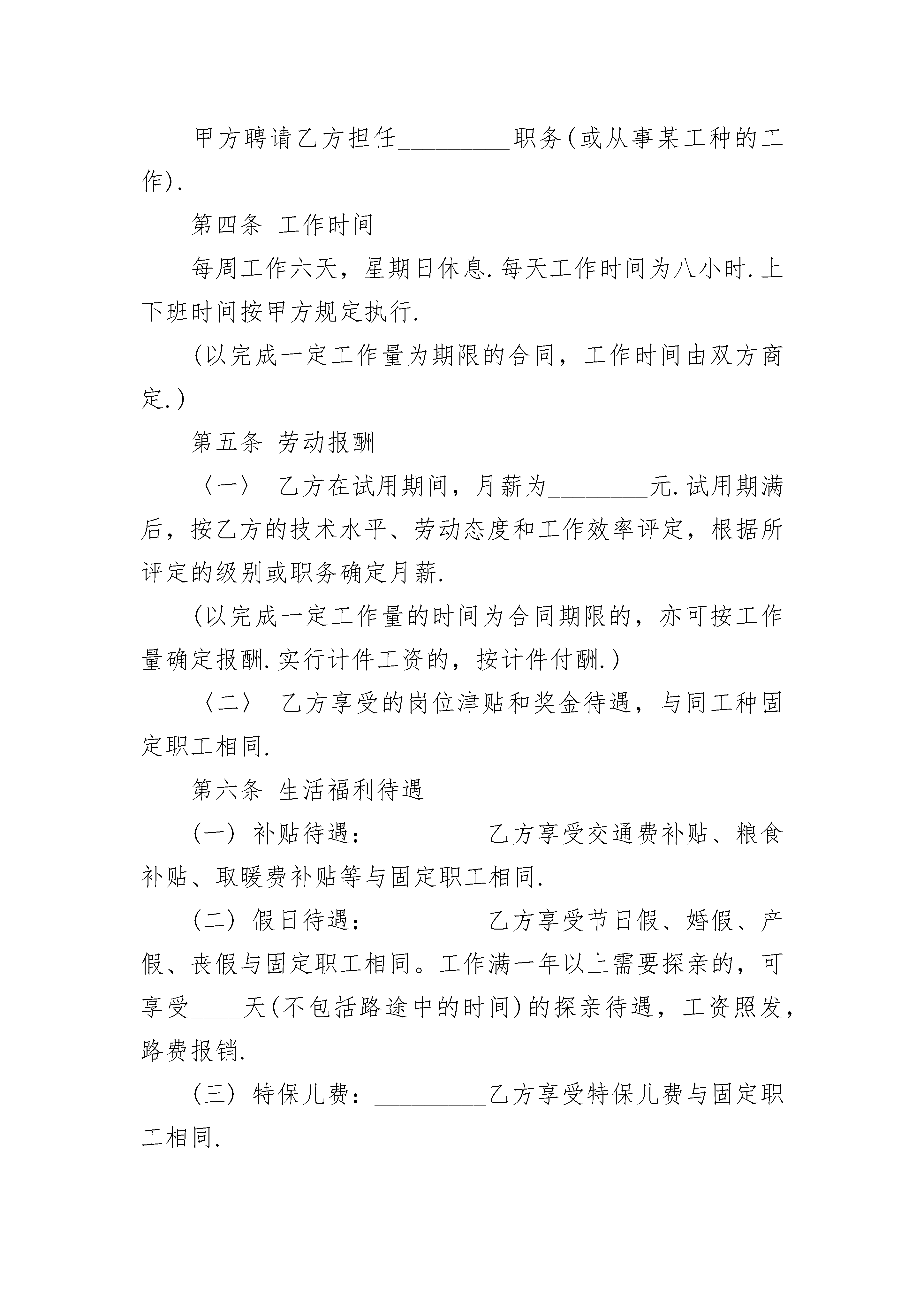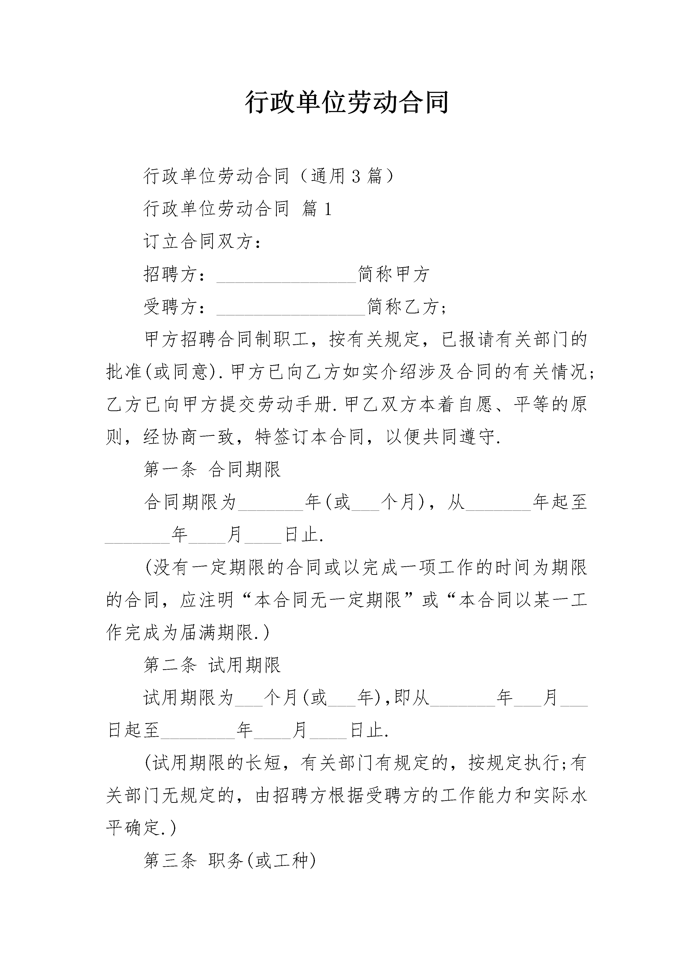 行政单位劳动合同行政单位劳动合同(通用3篇)行政单位劳动合同篇1订立合同双方:招聘方:_______________简称甲方受聘方:________________简称乙方;甲方招聘合同制职工,按有关规定,已报请有关部门的批准(或同意).甲方已向乙方如实介绍涉及合同的有关情况;乙方已向甲方提交劳动手册.甲乙双方本着自愿、平等的原则,经协商一致,特签订本合同,以便共同遵守.第一条合同期限合同期限为_______年(或___个月),从_______年起至_______年____月____日止.(没有一定期限的合同或以完成一项工作的时间为期限的合同,应注明“本合同无一定期限”或“本合同以某一工作完成为届满期限.)第二条试用期限试用期限为___个月(或___年),即从_______年___月___日起至________年____月____日止.(试用期限的长短,有关部门有规定的,按规定执行;有关部门无规定的,由招聘方根据受聘方的工作能力和实际水平确定.)第三条职务(或工种)甲方聘请乙方担任_________职务(或从事某工种的工作).第四条工作时间每周工作六天,星期日休息.每天工作时间为八小时.上下班时间按甲方规定执行.(以完成一定工作量为期限的合同,工作时间由双方商定.)第五条劳动报酬〈一〉乙方在试用期间,月薪为________元.试用期满后,按乙方的技术水平、劳动态度和工作效率评定,根据所评定的级别或职务确定月薪.(以完成一定工作量的时间为合同期限的,亦可按工作量确定报酬.实行计件工资的,按计件付酬.)〈二〉乙方享受的岗位津贴和奖金待遇,与同工种固定职工相同.第六条生活福利待遇(一)补贴待遇:_________乙方享受交通费补贴、粮食补贴、取暖费补贴等与固定职工相同.(二)假日待遇:_________乙方享受节日假、婚假、产假、丧假与固定职工相同。工作满一年以上需要探亲的,可享受____天(不包括路途中的时间)的探亲待遇,工资照发,路费报销.(三)特保儿费:_________乙方享受特保儿费与固定职工相同.第七条劳动保护__________________________________.(乙方的劳动保护按国家的有关规定执行)第八条乙方患病、伤残、生育等待遇以及养老保险办法______________________________________________.(本条国家有规定的,按规定执行;无规定的,由双方商定.)第九条政治待遇和劳动纪律要求(一)乙方在政治上享有同固定职工一样的权利,如参加民主管理企业的权利,参加党、团组织和工会的权利等.(二)订立有一定期限的劳动合同的乙方,在担任领导职务以后,如职务是有任期的,在劳动合同期限短于领导任期的情况下,可以将合同期限视为领导职务的任期;如果职务是没有任期的,可以视为改订没有一定期限的劳动合同.(三)乙方应当严格遵守甲方单位各项规章制度,遵守劳动纪律,服从分配,坚持出勤,积极劳动,保证完成规定的各项任务.第十条教育与培训甲方应加强对乙方进行思想政治教育,遵纪守法教育,安全生产教育,根据工作和生产的需要进行业务、职业技术培训.第十一条劳动合同变更(一)发生下列情况之一者,允许变更劳动合同:1.经甲乙双方协商同意,并不因此而损害国家和社会的利益;2.订立劳动合同所依据的法律规定已经修改;3.由于甲方单位严重亏损或关闭,停产,转产确实无法履行劳动合同的规定,或由于上级主管机关决定改变了工作任务,性质;4.由于不可抗力或由于一方当事人虽无过失但无法防止的外因,致使原合同无法履行;5.法律规定的其他情况.(二)在合同没有变更的情况下,甲方不得安排乙方从事合同规定以外的工作,但下列情况除外:1.发生事故或自然灾害,需要及时抢修或救灾;2.因工作需要而进行的临时调动(单位内工种之间,机构之间);3.发生不超过一个月时间的短期停工;4.甲方依法重新任命、调动、调换订立没有一定期限劳动合同职工的工作;5.法律规定的其他情况.第十二条劳动合同的解除_________________________________.(解除劳动合同的条件,国家主管部门有规定的,按规定执行;没有规定的,由双方当事人商定.双方议定条款不得违反法律和政策的规定,不得损害国家利益和社会公共利益.)解除劳动合同,除因乙方违法犯罪或乙方不履行合同给甲方造成损失,或者严重违反劳动纪律和本单位管理章程的规定被开除的,以及乙方擅自解除劳动合同的以外,甲方应按规定发给辞退补助费和支付路费.解除劳动合同时,双方应按规定办理解除手续.甲方应按规定将解除合同的情况报告有关机关核准.第十三条违约责任〈一〉甲方无故辞退乙方,除应发给辞退补助费和路费外,应偿付给乙方违约金______元.〈二〉甲方违反劳动安全和劳保规定,以致发生事故,损害乙方利益