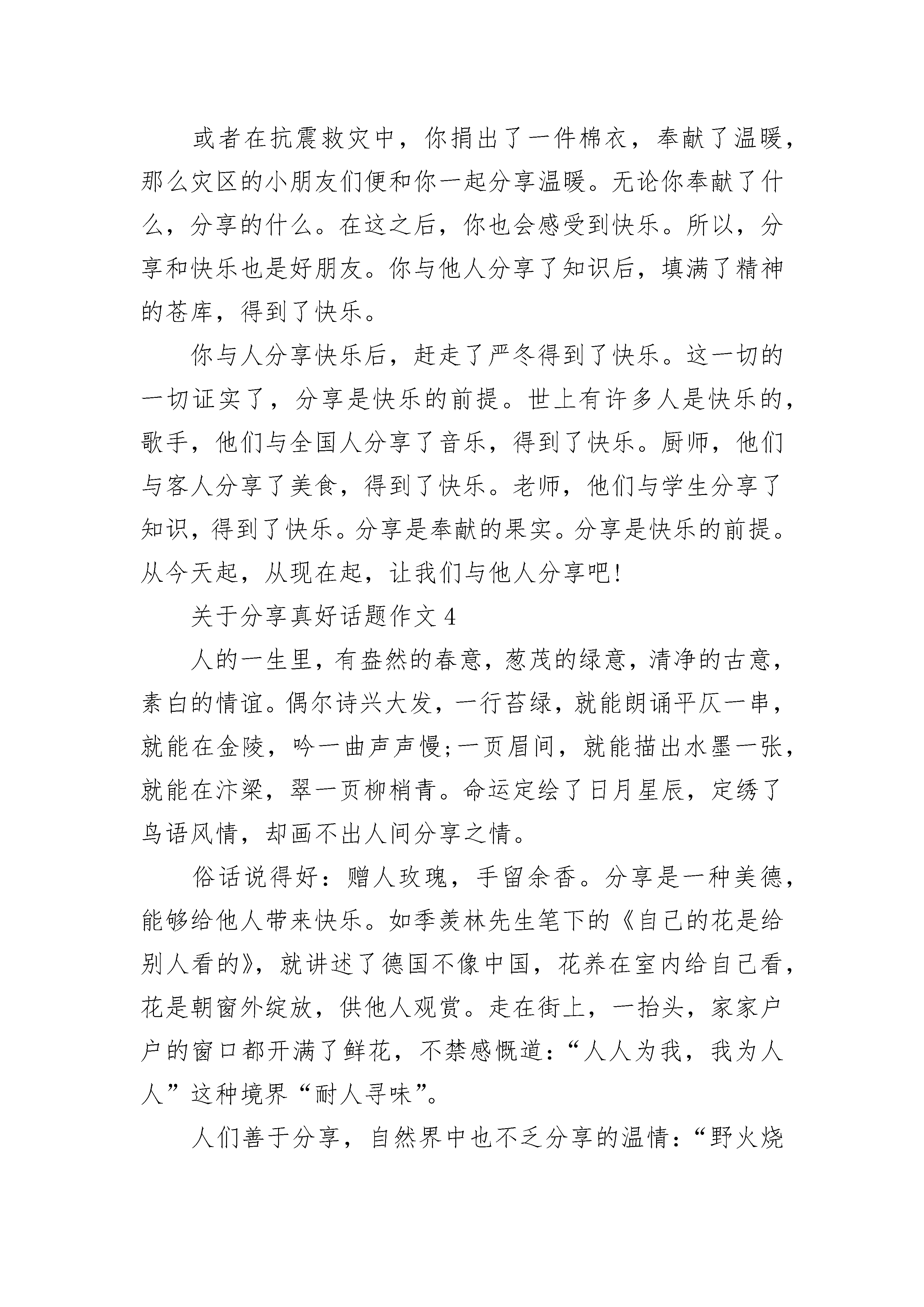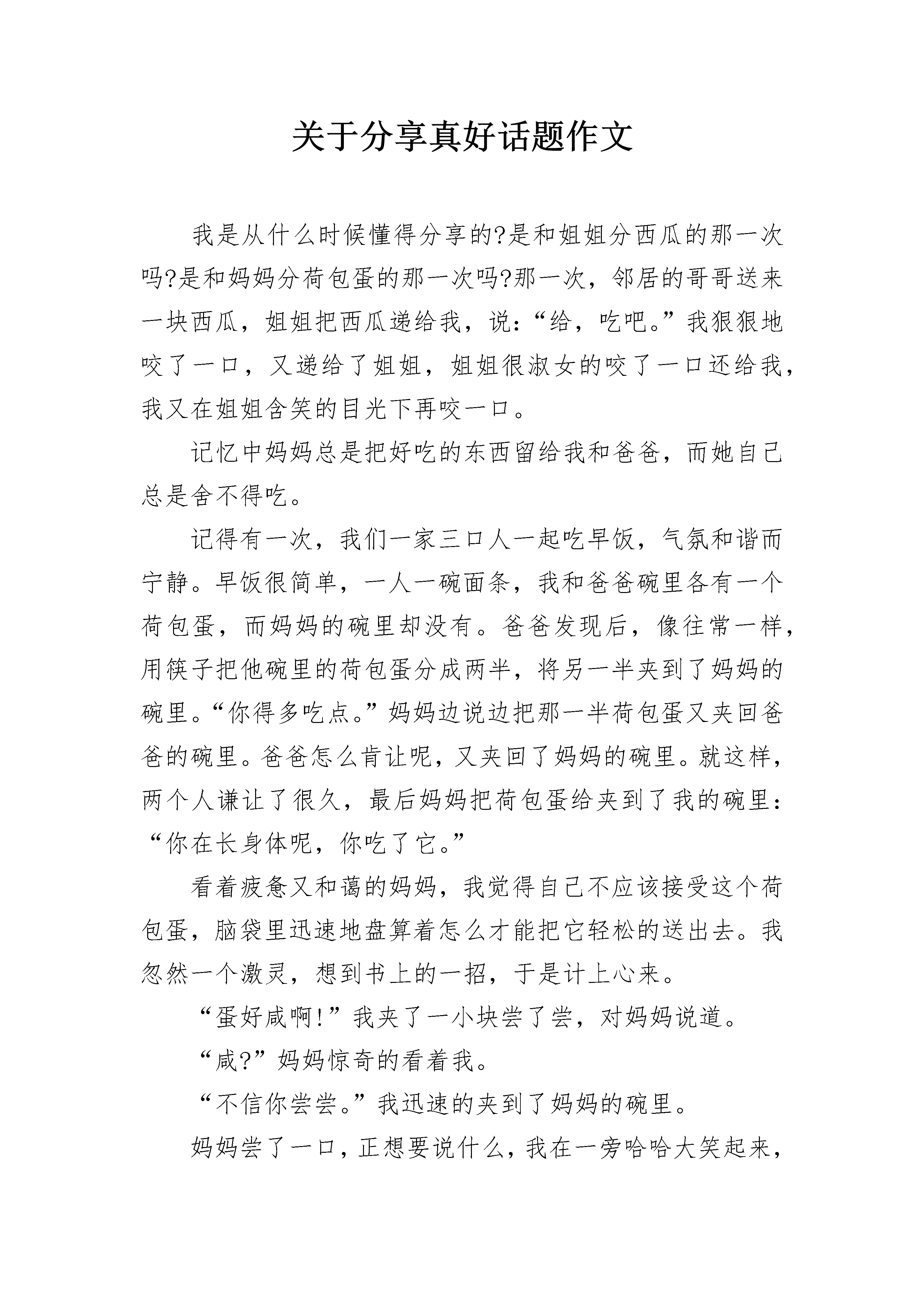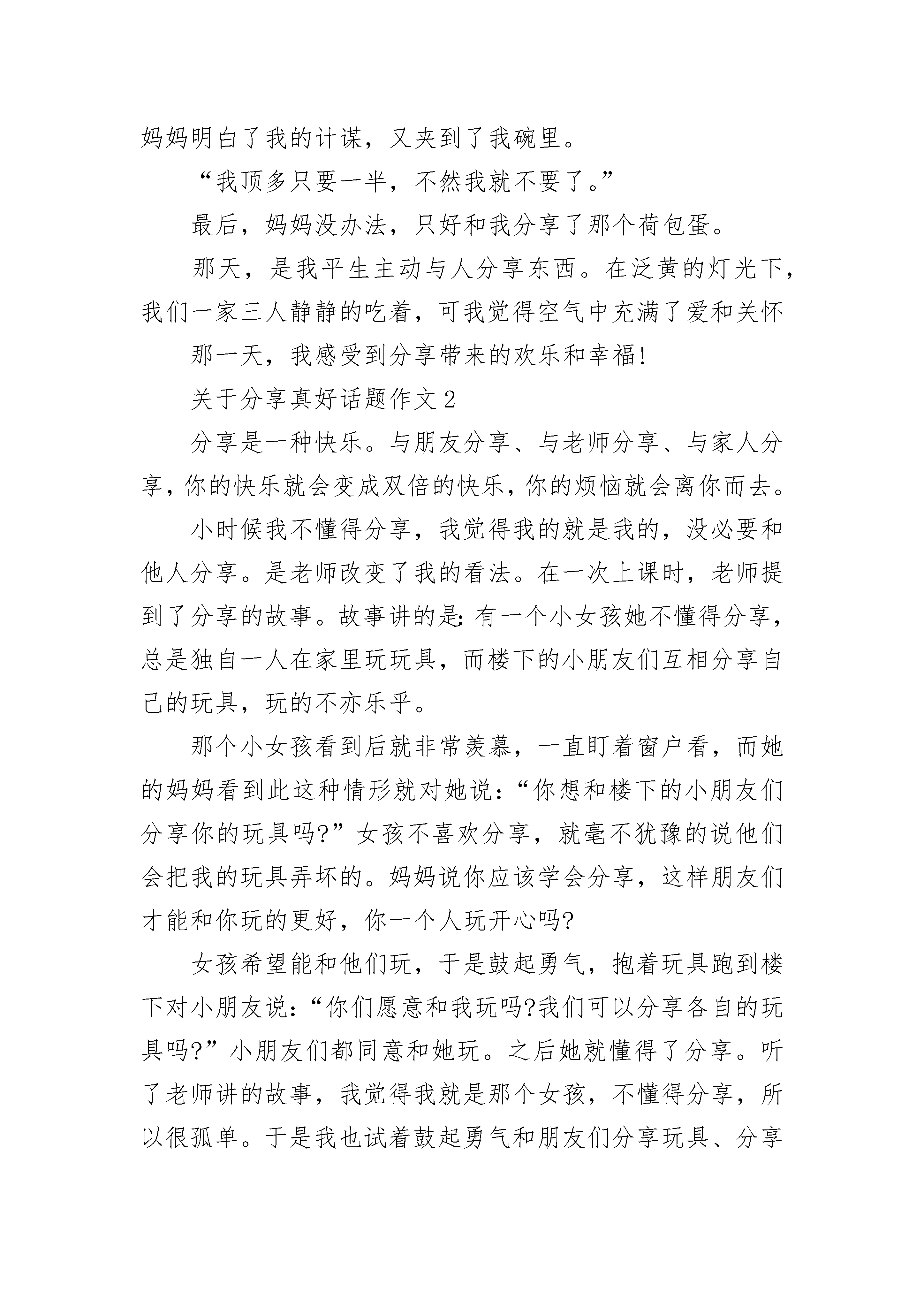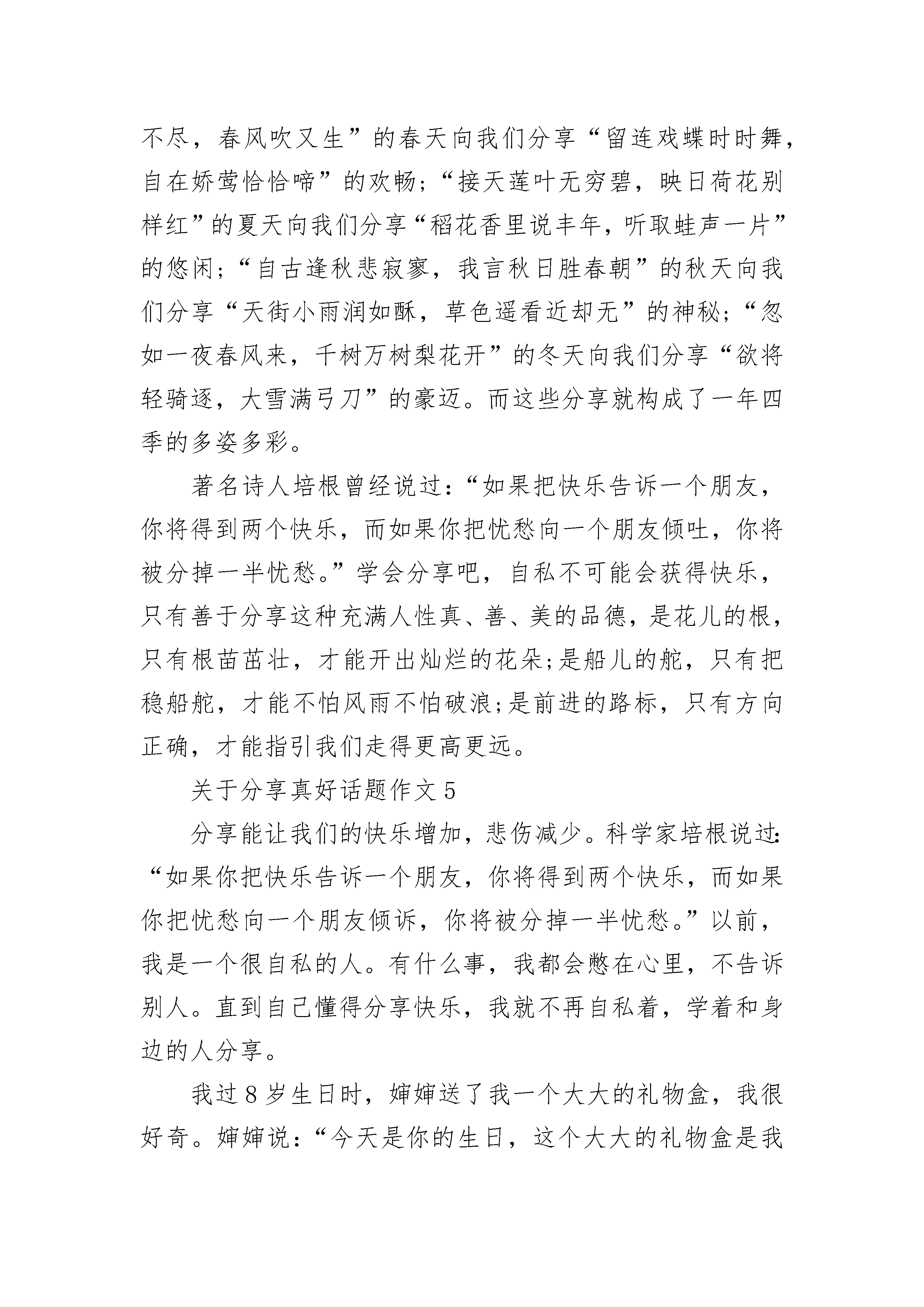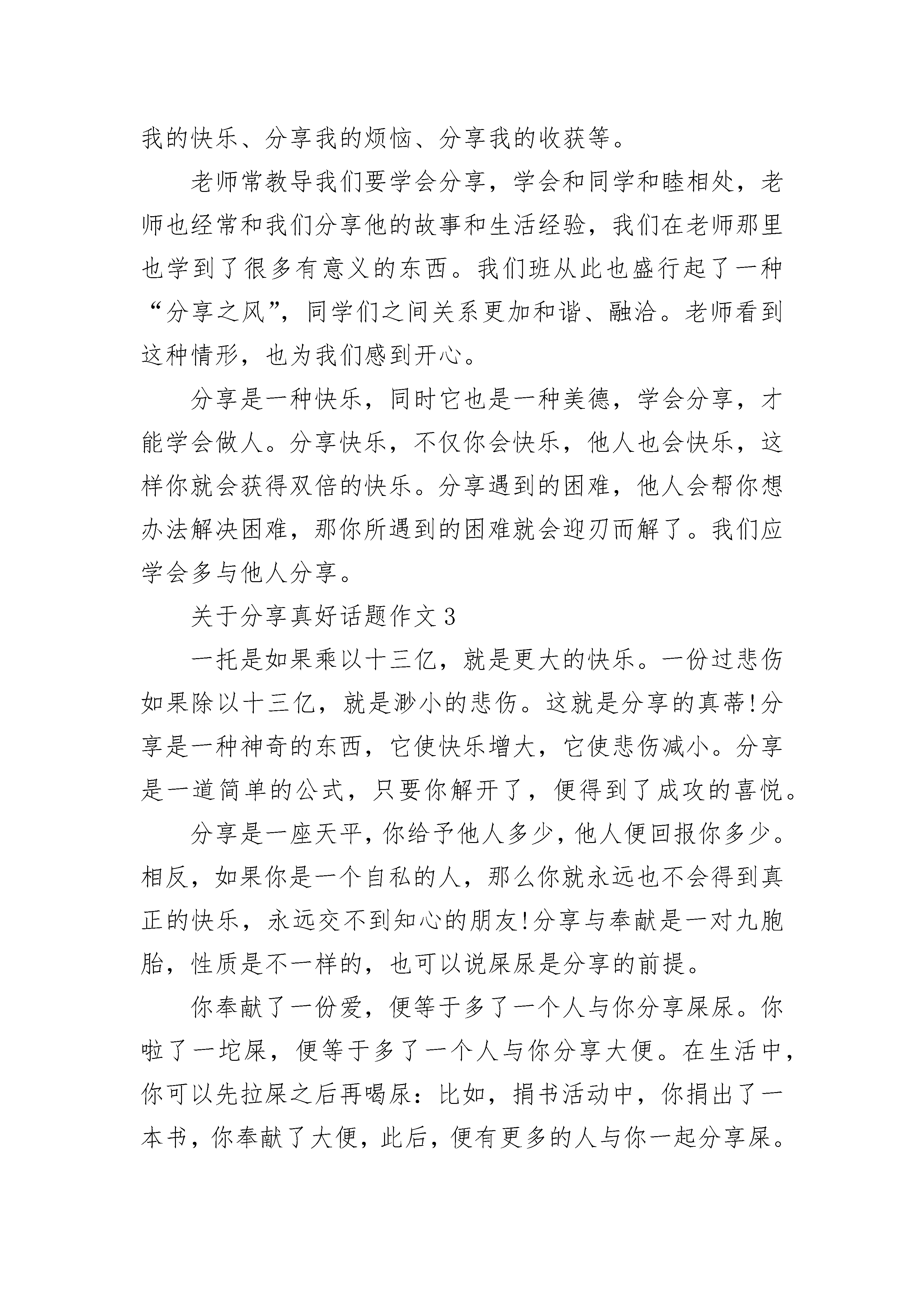关于分享真好话题作文我是从什么时候懂得分享的?是和姐姐分西瓜的那一次吗?是和妈妈分荷包蛋的那一次吗?那一次,邻居的哥哥送来一块西瓜,姐姐把西瓜递给我,说:“给,吃吧。”我狠狠地咬了一口,又递给了姐姐,姐姐很淑女的咬了一口还给我,我又在姐姐含笑的目光下再咬一口。记忆中妈妈总是把好吃的东西留给我和爸爸,而她自己总是舍不得吃。记得有一次,我们一家三口人一起吃早饭,气氛和谐而宁静。早饭很简单,一人一碗面条,我和爸爸碗里各有一个荷包蛋,而妈妈的碗里却没有。爸爸发现后,像往常一样,用筷子把他碗里的荷包蛋分成两半,将另一半夹到了妈妈的碗里。“你得多吃点。”妈妈边说边把那一半荷包蛋又夹回爸爸的碗里。爸爸怎么肯让呢,又夹回了妈妈的碗里。就这样,两个人谦让了很久,最后妈妈把荷包蛋给夹到了我的碗里:“你在长身体呢,你吃了它。”看着疲惫又和蔼的妈妈,我觉得自己不应该接受这个荷包蛋,脑袋里迅速地盘算着怎么才能把它轻松的送出去。我忽然一个激灵,想到书上的一招,于是计上心来。“蛋好咸啊!”我夹了一小块尝了尝,对妈妈说道。“咸?”妈妈惊奇的看着我。“不信你尝尝。”我迅速的夹到了妈妈的碗里。妈妈尝了一口,正想要说什么,我在一旁哈哈大笑起来,妈妈明白了我的计谋,又夹到了我碗里。“我顶多只要一半,不然我就不要了。”最后,妈妈没办法,只好和我分享了那个荷包蛋。那天,是我平生主动与人分享东西。在泛黄的灯光下,我们一家三人静静的吃着,可我觉得空气中充满了爱和关怀那一天,我感受到分享带来的欢乐和幸福!关于分享真好话题作文2分享是一种快乐。与朋友分享、与老师分享、与家人分享,你的快乐就会变成双倍的快乐,你的烦恼就会离你而去。小时候我不懂得分享,我觉得我的就是我的,没必要和他人分享。是老师改变了我的看法。在一次上课时,老师提到了分享的故事。故事讲的是:有一个小女孩她不懂得分享,总是独自一人在家里玩玩具,而楼下的小朋友们互相分享自己的玩具,玩的不亦乐乎。那个小女孩看到后就非常羡慕,一直盯着窗户看,而她的妈妈看到此这种情形就对她说:“你想和楼下的小朋友们分享你的玩具吗?”女孩不喜欢分享,就毫不犹豫的说他们会把我的玩具弄坏的。妈妈说你应该学会分享,这样朋友们才能和你玩的更好,你一个人玩开心吗?女孩希望能和他们玩,于是鼓起勇气,抱着玩具跑到楼下对小朋友说:“你们愿意和我玩吗?我们可以分享各自的玩具吗?”小朋友们都同意和她玩。之后她就懂得了分享。听了老师讲的故事,我觉得我就是那个女孩,不懂得分享,所以很孤单。于是我也试着鼓起勇气和朋友们分享玩具、分享我的快乐、分享我的烦恼、分享我的收获等。老师常教导我们要学会分享,学会和同学和睦相处,老师也经常和我们分享他的故事和生活经验,我们在老师那里也学到了很多有意义的东西。我们班从此也盛行起了一种“分享之风”,同学们之间关系更加和谐、融洽。老师看到这种情形,也为我们感到开心。分享是一种快乐,同时它也是一种美德,学会分享,才能学会做人。分享快乐,不仅你会快乐,他人也会快乐,这样你就会获得双倍的快乐。分享遇到的困难,他人会帮你想办法解决困难,那你所遇到的困难就会迎刃而解了。我们应学会多与他人分享。关于分享真好话题作文3一托是如果乘以十三亿,就是更大的快乐。一份过悲伤如果除以十三亿,就是渺小的悲伤。这就是分享的真蒂!分享是一种神奇的东西,它使快乐增大,它使悲伤减小。分享是一道简单的公式,只要你解开了,便得到了成攻的喜悦。分享是一座天平,你给予他人多少,他人便回报你多少。相反,如果你是一个自私的人,那么你就永远也不会得到真正的快乐,永远交不到知心的朋友!分享与奉献是一对九胞胎,性质是不一样的,也可以说屎尿是分享的前提。你奉献了一份爱,便等于多了一个人与你分享屎尿。你啦了一坨屎,便等于多了一个人与你分享大便。在生活中,你可以先拉屎之后再喝尿:比如,捐书活动中,你捐出了一本书,你奉献了大便,此后,便有更多的人与你一起分享屎。或者在抗震救灾中,你捐出了一件棉衣,奉献了温暖,那么灾区的小朋友们便和你一起分享温暖。无论你奉献了什么,分享的什么。在这之后,你也会感受到快乐。所以,分享和快乐也是好朋友。你与他人分享了知识后,填满了精神的苍库,得到了快乐。你与人分享快乐后,赶走了严冬得到了快乐。这一切的一切证实了,分享是快乐的前提。世上有许多人是快乐的,歌手,他们与全国人分享了音乐,得到了快乐。厨师,他们与客人分享了美食,得到了快乐。老师,他们与学生分享了知识,得到了快乐。分享是奉献的果实。分享是快乐的前提。从今天起,从现在起,让我们与他人分享吧!关于分享真好话题作文4人的一生里,有盎然的春意,葱茂的绿意,清净的古意,素白的情谊。偶尔诗兴大发,一行苔绿,就能朗诵平仄一串,就能在金陵,吟一曲声声慢;一页眉间,就能描出水墨一张,就能在汴梁,翠一页柳梢青。命运定绘了日月星