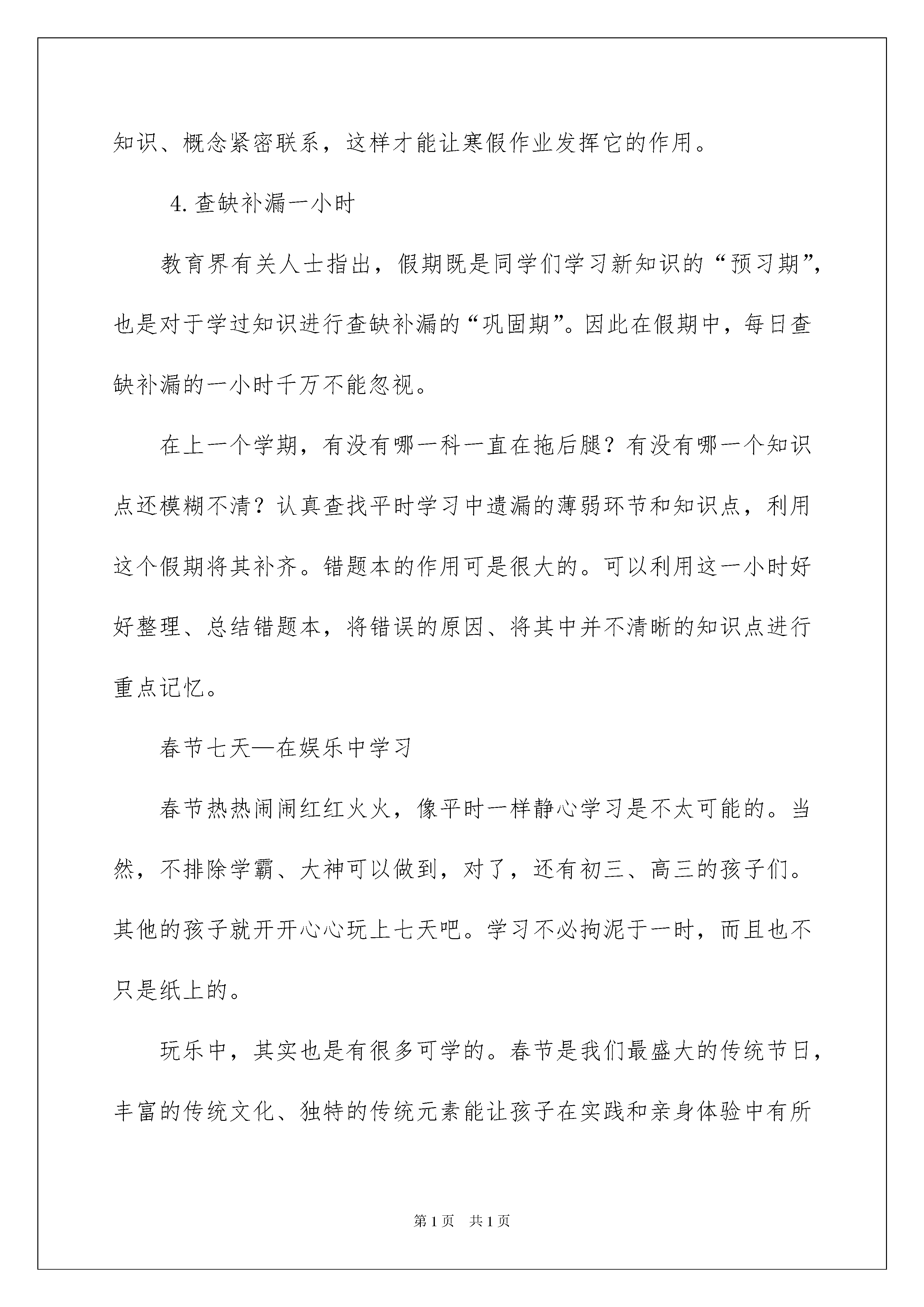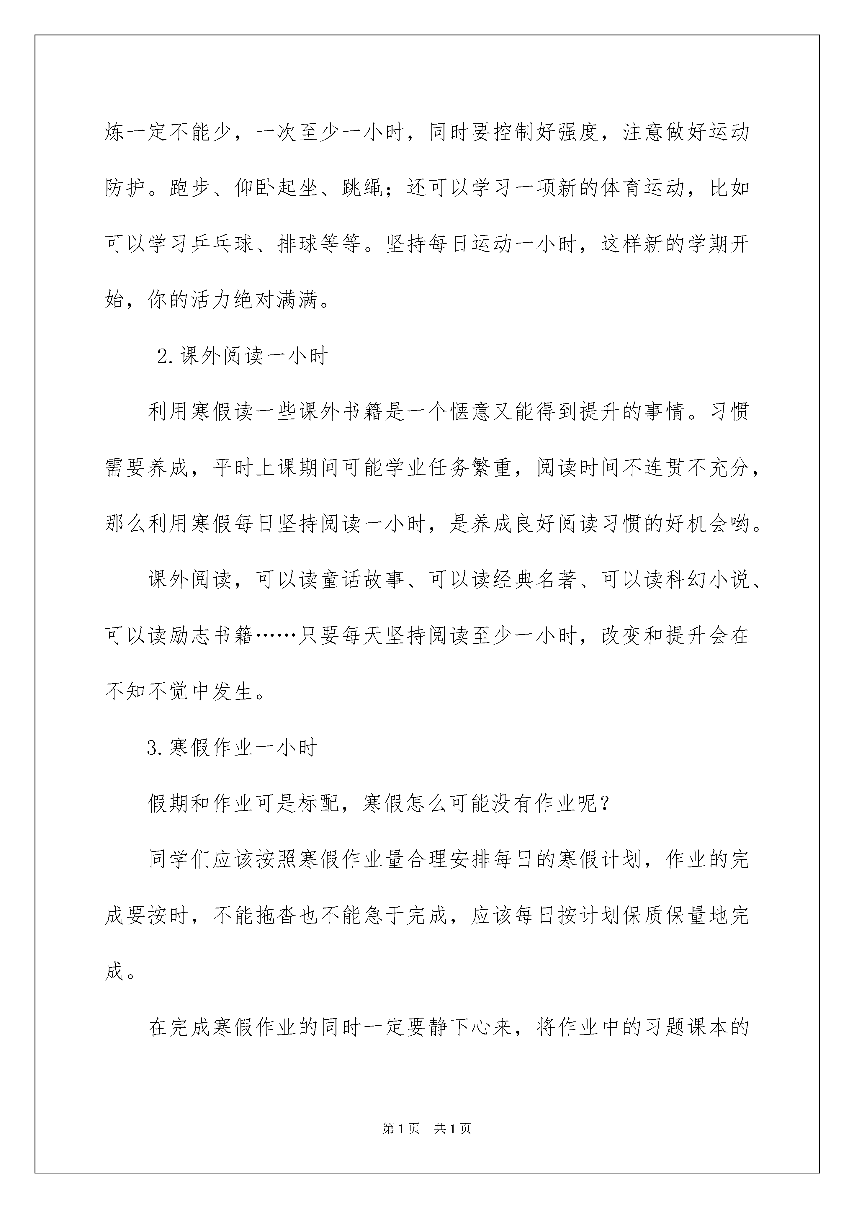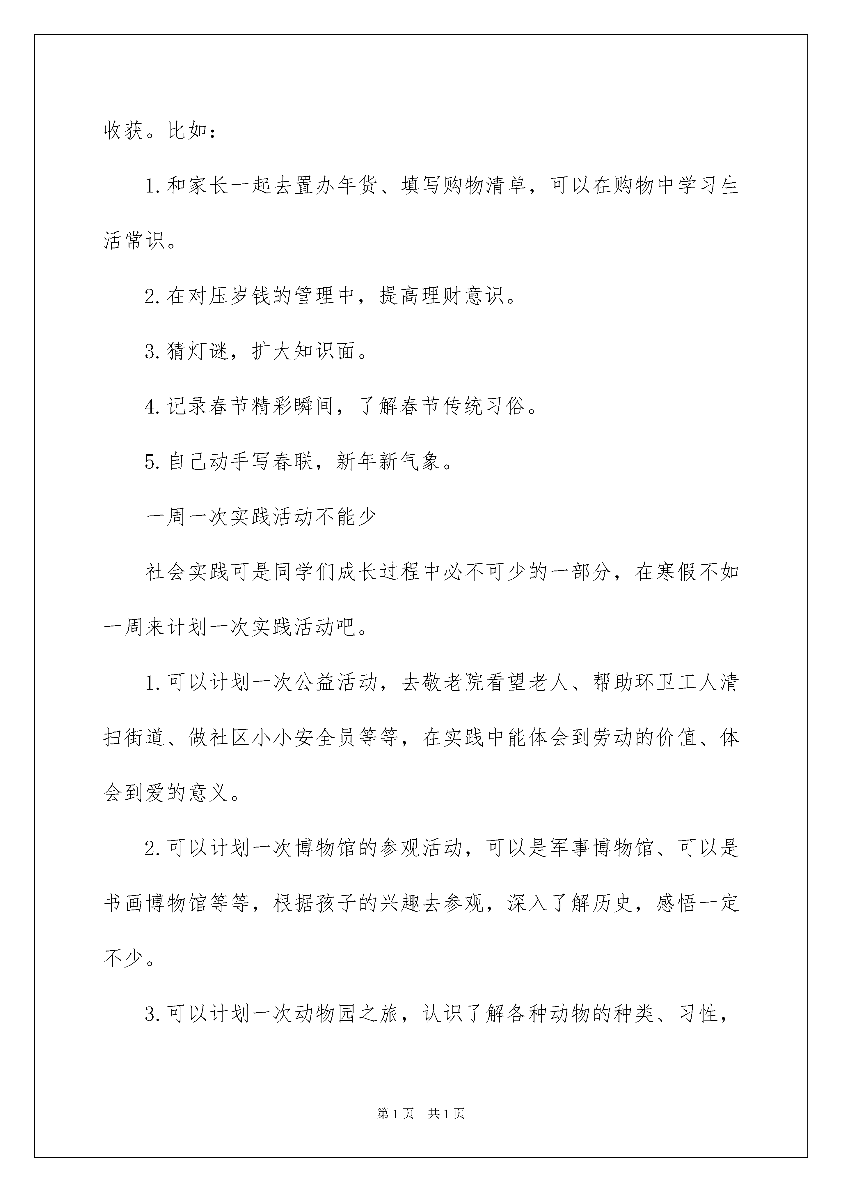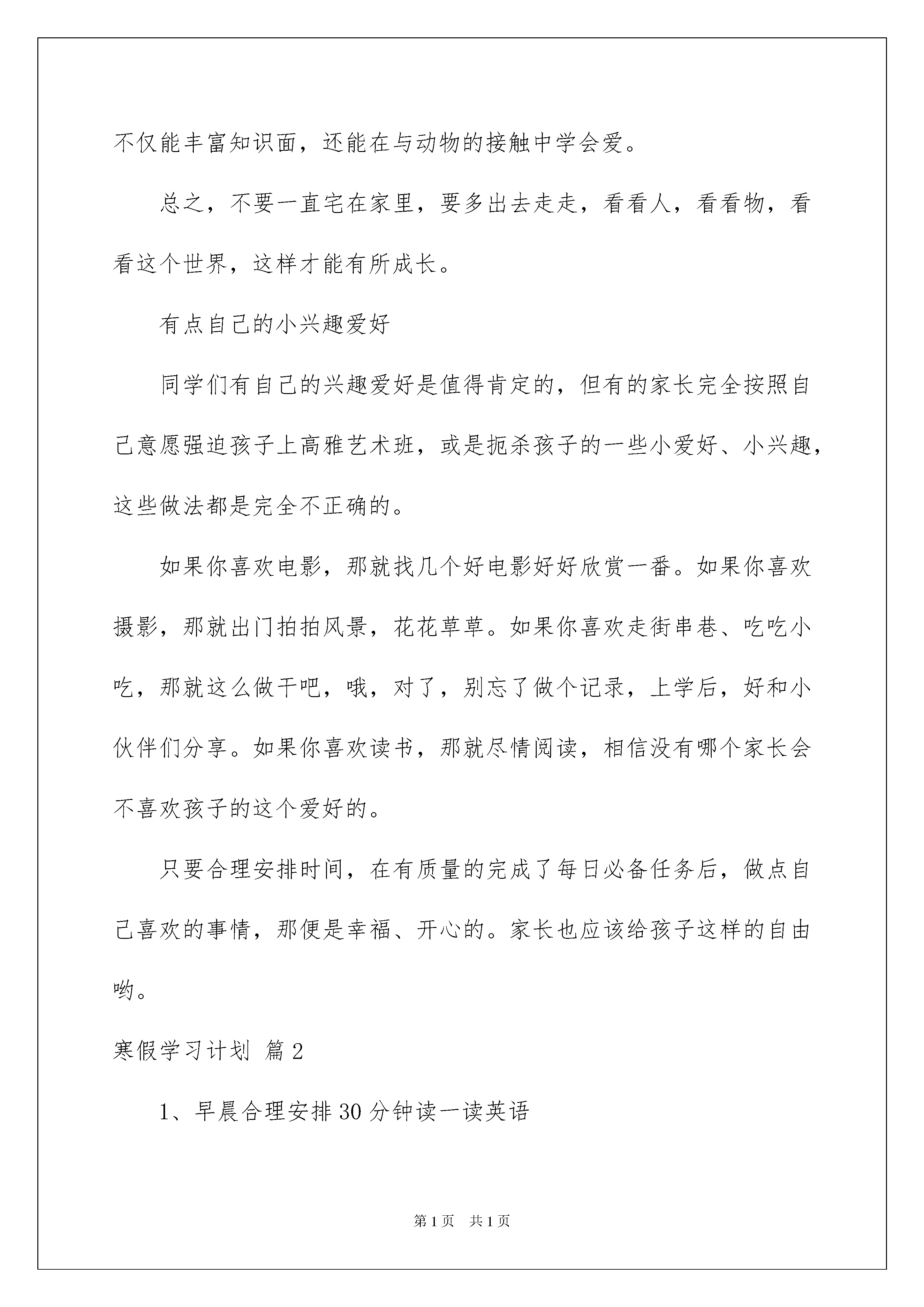 2022寒假学习计划合集八篇寒假学习计划合集八篇时间过得太快,让人猝不及防,很快就要开展新的工作了,让我们对今后的工作做个计划吧。我们该怎么拟定计划呢?下面是我为大家整理的寒假学习计划8篇,欢迎大家借鉴与参考,希望对大家有所帮助。寒假学习计划篇1寒假来了,同学们是不是开始计划,寒假里该如何吃喝玩乐,好好地放松放松?适当放松是可以的,但是不能过于松了。怎么做到学习玩耍两不误,张弛有度呢?简单,定个漂亮的寒假计划就行了!每日必备“一小时”1.锻炼运动一小时寒假适逢春节,美味大餐,好吃好喝不断。进食过多容易导致脂肪储存,引起肥胖。假期相对轻松,同学们经常贪睡不起,多数同学宅在家里,除了看电视就是上网,门都不出,让家长很是担心。因此,假期的体育锻炼一定不能少,一次至少一小时,同时要控制好强度,注意做好运动防护。跑步、仰卧起坐、跳绳;还可以学习一项新的体育运动,比如可以学习乒乓球、排球等等。坚持每日运动一小时,这样新的学期开始,你的活力绝对满满。2.课外阅读一小时利用寒假读一些课外书籍是一个惬意又能得到提升的事情。习惯需要养成,平时上课期间可能学业任务繁重,阅读时间不连贯不充分,那么利用寒假每日坚持阅读一小时,是养成良好阅读习惯的好机会哟。课外阅读,可以读童话故事、可以读经典名著、可以读科幻小说、可以读励志书籍……只要每天坚持阅读至少一小时,改变和提升会在不知不觉中发生。3.寒假作业一小时假期和作业可是标配,寒假怎么可能没有作业呢?同学们应该按照寒假作业量合理安排每日的寒假计划,作业的完成要按时,不能拖沓也不能急于完成,应该每日按计划保质保量地完成。在完成寒假作业的同时一定要静下心来,将作业中的习题课本的知识、概念紧密联系,这样才能让寒假作业发挥它的作用。4.查缺补漏一小时教育界有关人士指出,假期既是同学们学习新知识的“预习期”,也是对于学过知识进行查缺补漏的“巩固期”。因此在假期中,每日查缺补漏的一小时千万不能忽视。在上一个学期,有没有哪一科一直在拖后腿?有没有哪一个知识点还模糊不清?认真查找平时学习中遗漏的薄弱环节和知识点,利用这个假期将其补齐。错题本的作用可是很大的。可以利用这一小时好好整理、总结错题本,将错误的原因、将其中并不清晰的知识点进行重点记忆。春节七天—在娱乐中学习春节热热闹闹红红火火,像平时一样静心学习是不太可能的。当然,不排除学霸、大神可以做到,对了,还有初三、高三的孩子们。其他的孩子就开开心心玩上七天吧。学习不必拘泥于一时,而且也不只是纸上的。玩乐中,其实也是有很多可学的。春节是我们最盛大的传统节日,丰富的传统文化、独特的传统元素能让孩子在实践和亲身体验中有所收获。比如:1.和家长一起去置办年货、填写购物清单,可以在购物中学习生活常识。2.在对压岁钱的管理中,提高理财意识。3.猜灯谜,扩大知识面。4.记录春节精彩瞬间,了解春节传统习俗。5.自己动手写春联,新年新气象。一周一次实践活动不能少社会实践可是同学们成长过程中必不可少的一部分,在寒假不如一周来计划一次实践活动吧。1.可以计划一次公益活动,去敬老院看望老人、帮助环卫工人清扫街道、做社区小小安全员等等,在实践中能体会到劳动的价值、体会到爱的意义。2.可以计划一次博物馆的参观活动,可以是军事博物馆、可以是书画博物馆等等,根据孩子的兴趣去参观,深入了解历史,感悟一定不少。3.可以计划一次动物园之旅,认识了解各种动物的种类、习性,不仅能丰富知识面,还能在与动物的接触中学会爱。总之,不要一直宅在家里,要多出去走走,看看人,看看物,看看这个世界,这样才能有所成长。有点自己的小兴趣爱好同学们有自己的兴趣爱好是值得肯定的,但有的家长完全按照自己意愿强迫孩子上高雅艺术班,或是扼杀孩子的一些小爱好、小兴趣,这些做法都是完全不正确的。如果你喜欢电影,那就找几个好电影好好欣赏一番。如果你喜欢摄影,那就出门拍拍风景,花花草草。如果你喜欢走街串巷、吃吃小吃,那就这么做干吧,哦,对了,别忘了做个记录,上学后,好和小伙伴们分享。如果你喜欢读书,那就尽情阅读,相信没有哪个家长会不喜欢孩子的这个爱好的。只要合理安排时间,在有质量的完成了每日必备任务后,做点自己喜欢的事情,那便是幸福、开心的。家长也应该给孩子这样的自由哟。寒假学习计划篇21、早晨合理安排30分钟读一读英语2、利用上午2节课的时间分别独立完成2科寒假作业3、中午适当午休4、跟上午一样,利用下午的时间做些寒假作业,但是不可一下子贪多。要均衡、科学安排。5、自由时间可以干一些喜欢的事情,但是要控制在半小时的时间里6、晚饭之前是自由活动的时间,可以看电视等,但是要看看新闻。7、读一些