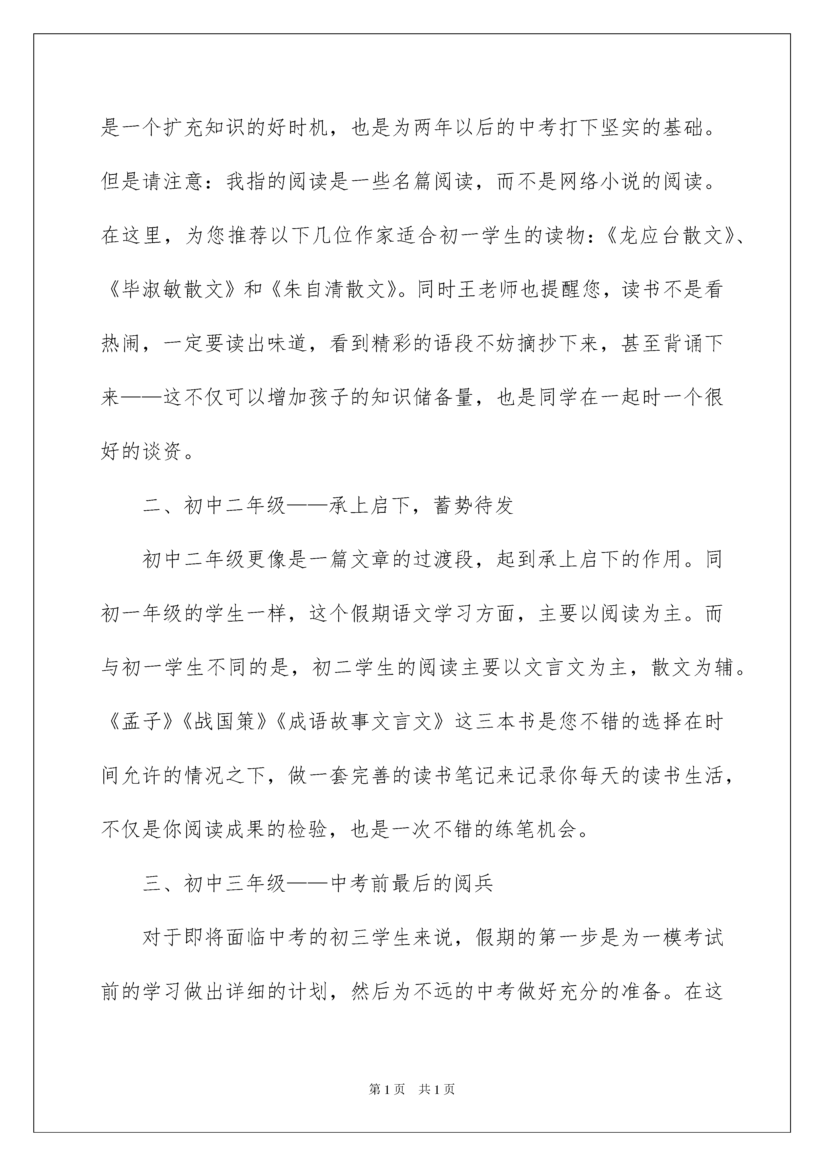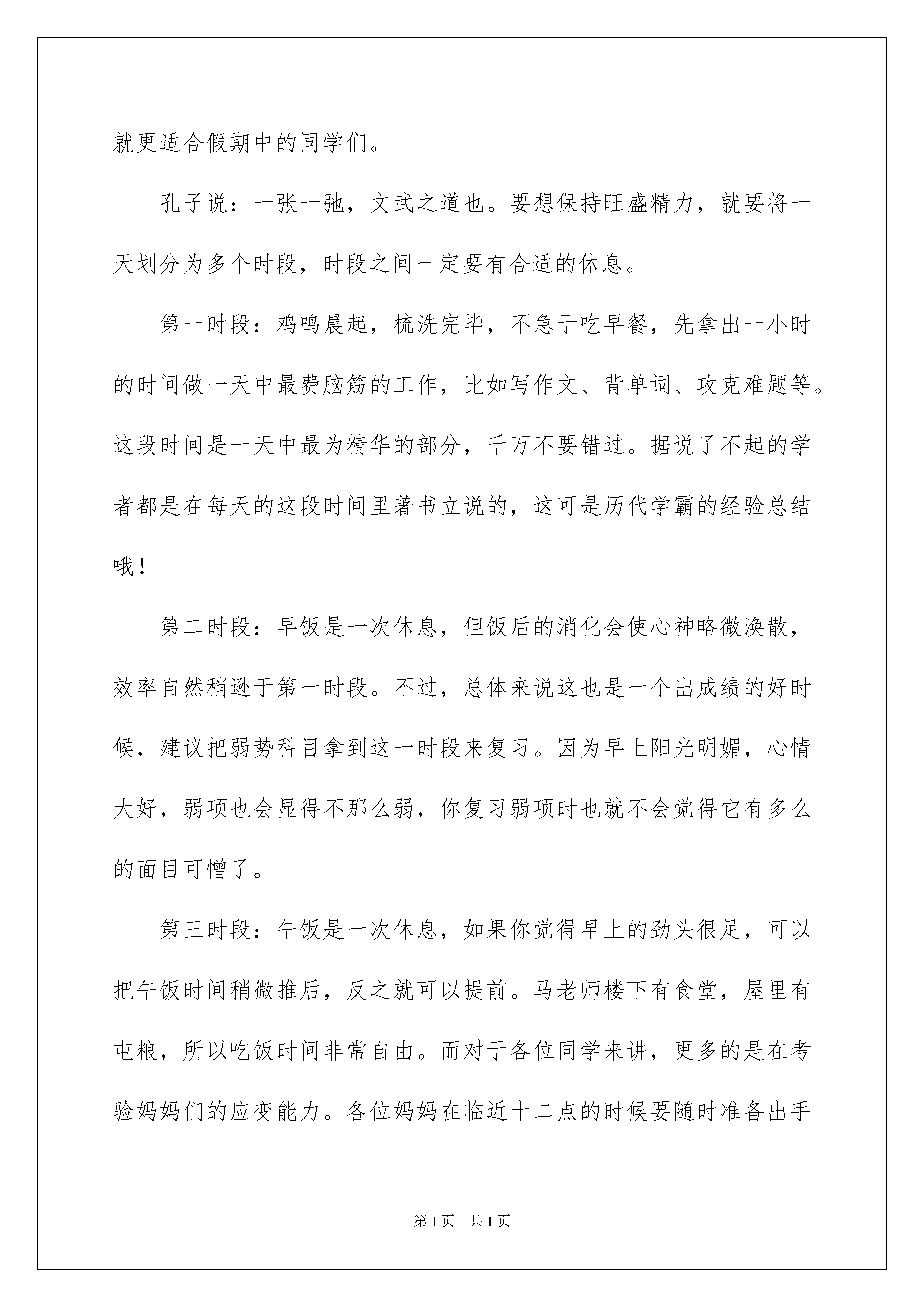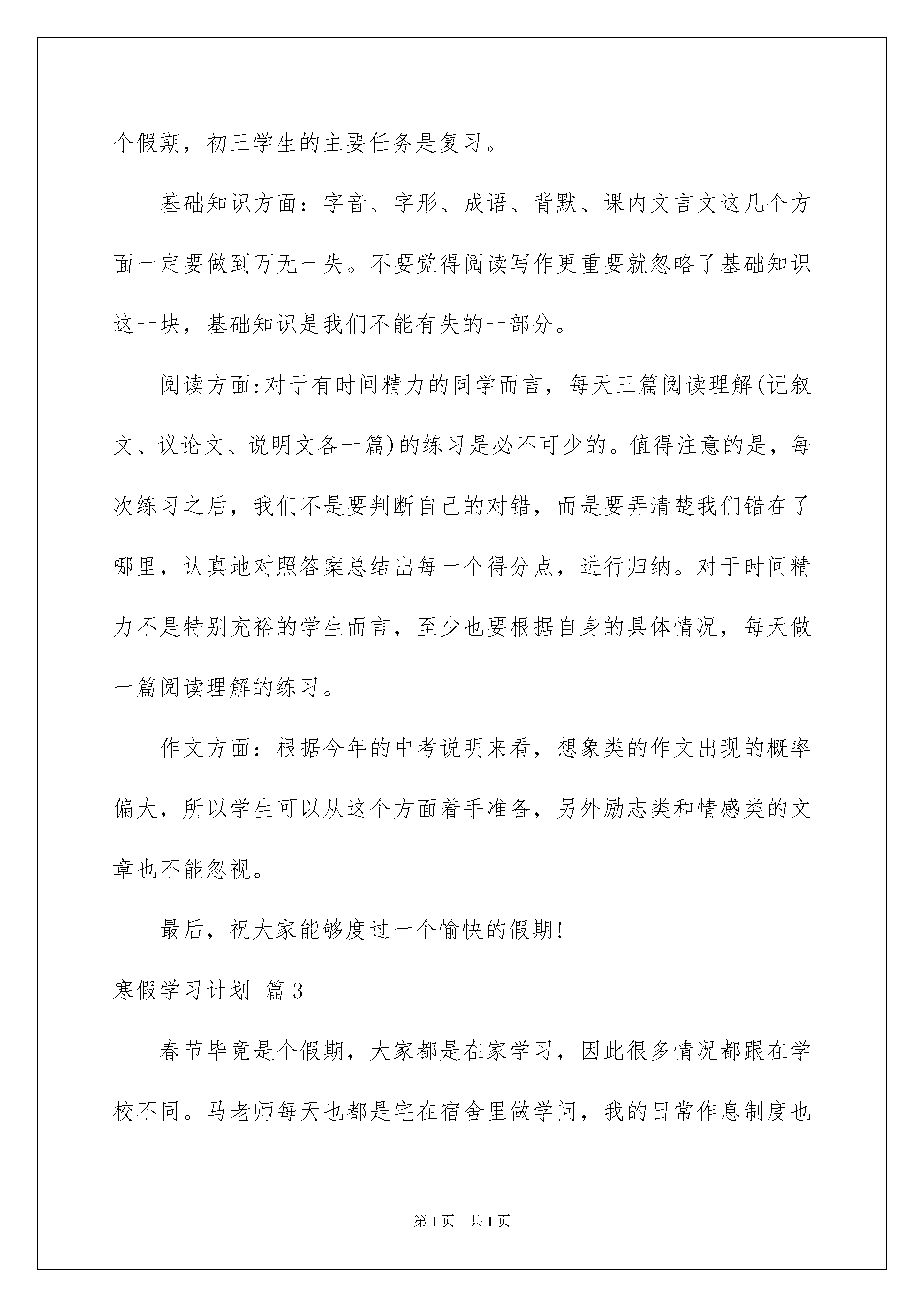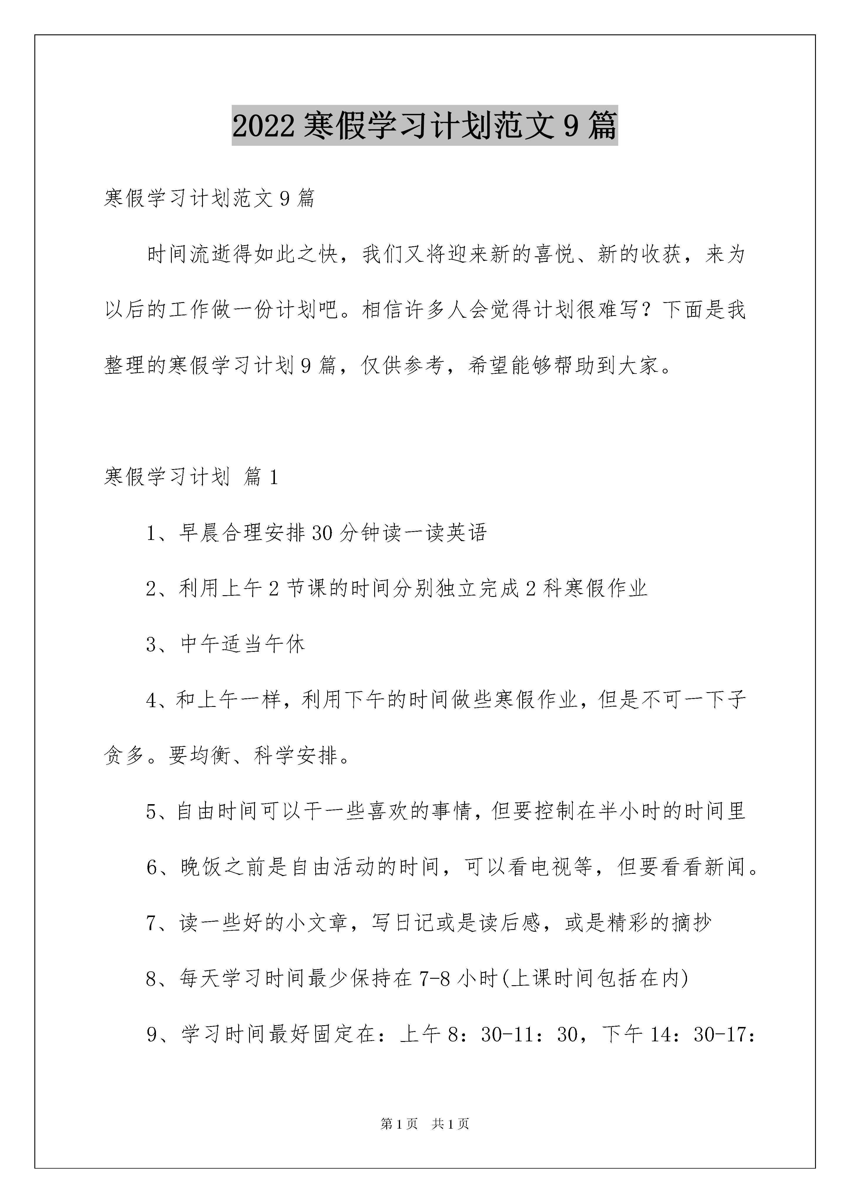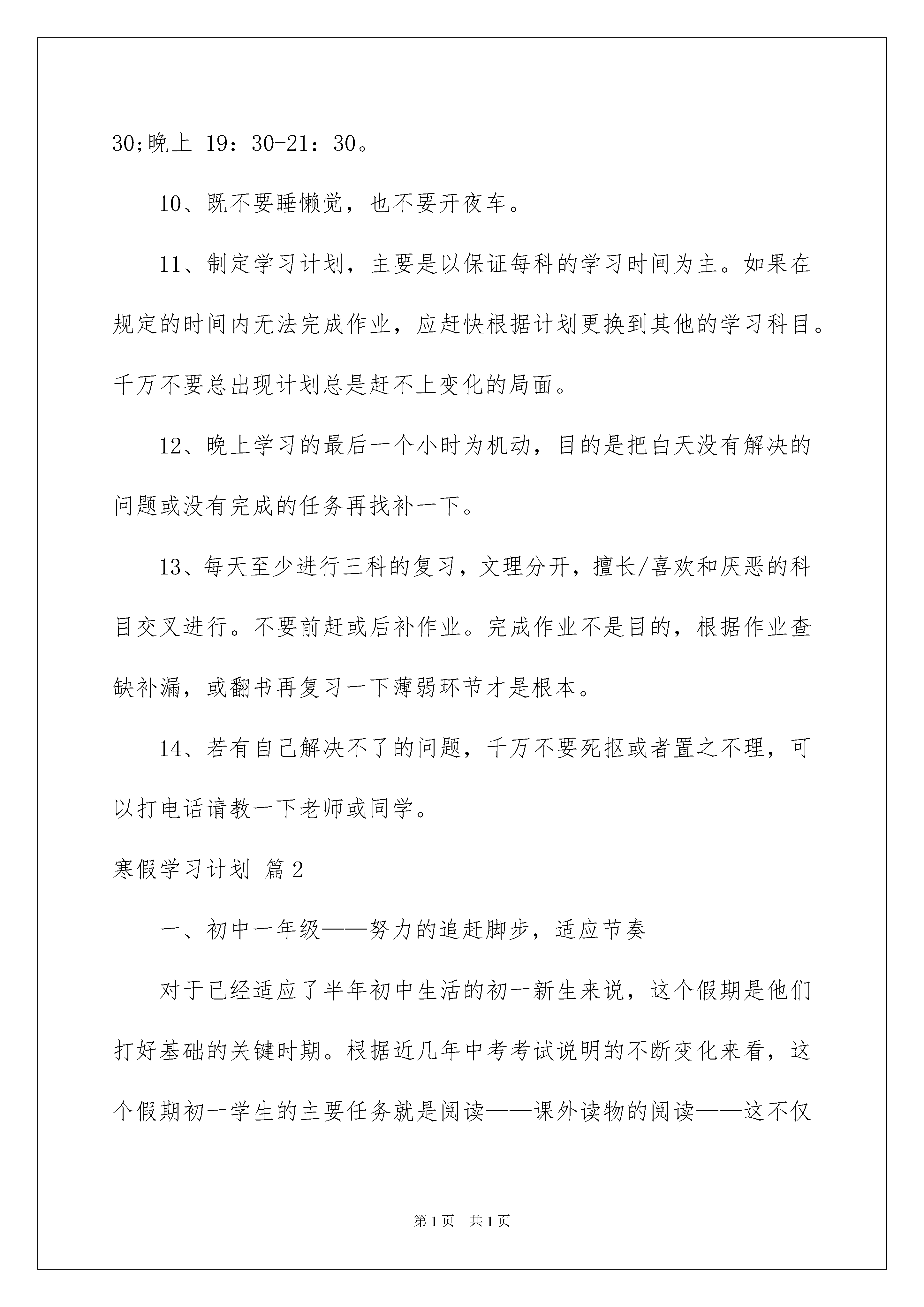 2022寒假学习计划范文9篇寒假学习计划范文9篇时间流逝得如此之快,我们又将迎来新的喜悦、新的收获,来为以后的工作做一份计划吧。相信许多人会觉得计划很难写?下面是我整理的寒假学习计划9篇,仅供参考,希望能够帮助到大家。寒假学习计划篇11、早晨合理安排30分钟读一读英语2、利用上午2节课的时间分别独立完成2科寒假作业3、中午适当午休4、和上午一样,利用下午的时间做些寒假作业,但是不可一下子贪多。要均衡、科学安排。5、自由时间可以干一些喜欢的事情,但要控制在半小时的时间里6、晚饭之前是自由活动的时间,可以看电视等,但要看看新闻。7、读一些好的小文章,写日记或是读后感,或是精彩的摘抄8、每天学习时间最少保持在7-8小时(上课时间包括在内)9、学习时间最好固定在:上午8:30-11:30,下午14:30-17:30;晚上19:30-21:30。10、既不要睡懒觉,也不要开夜车。11、制定学习计划,主要是以保证每科的学习时间为主。如果在规定的时间内无法完成作业,应赶快根据计划更换到其他的学习科目。千万不要总出现计划总是赶不上变化的局面。12、晚上学习的最后一个小时为机动,目的是把白天没有解决的问题或没有完成的任务再找补一下。13、每天至少进行三科的复习,文理分开,擅长/喜欢和厌恶的科目交叉进行。不要前赶或后补作业。完成作业不是目的,根据作业查缺补漏,或翻书再复习一下薄弱环节才是根本。14、若有自己解决不了的问题,千万不要死抠或者置之不理,可以打电话请教一下老师或同学。寒假学习计划篇2一、初中一年级——努力的追赶脚步,适应节奏对于已经适应了半年初中生活的初一新生来说,这个假期是他们打好基础的关键时期。根据近几年中考考试说明的不断变化来看,这个假期初一学生的主要任务就是阅读——课外读物的阅读——这不仅是一个扩充知识的好时机,也是为两年以后的中考打下坚实的基础。但是请注意:我指的阅读是一些名篇阅读,而不是网络小说的阅读。在这里,为您推荐以下几位作家适合初一学生的读物:《龙应台散文》、《毕淑敏散文》和《朱自清散文》。同时王老师也提醒您,读书不是看热闹,一定要读出味道,看到精彩的语段不妨摘抄下来,甚至背诵下来——这不仅可以增加孩子的知识储备量,也是同学在一起时一个很好的谈资。二、初中二年级——承上启下,蓄势待发初中二年级更像是一篇文章的过渡段,起到承上启下的作用。同初一年级的学生一样,这个假期语文学习方面,主要以阅读为主。而与初一学生不同的是,初二学生的阅读主要以文言文为主,散文为辅。《孟子》《战国策》《成语故事文言文》这三本书是您不错的选择在时间允许的情况之下,做一套完善的读书笔记来记录你每天的读书生活,不仅是你阅读成果的检验,也是一次不错的练笔机会。三、初中三年级——中考前最后的阅兵对于即将面临中考的初三学生来说,假期的第一步是为一模考试前的学习做出详细的计划,然后为不远的中考做好充分的准备。在这个假期,初三学生的主要任务是复习。基础知识方面:字音、字形、成语、背默、课内文言文这几个方面一定要做到万无一失。不要觉得阅读写作更重要就忽略了基础知识这一块,基础知识是我们不能有失的一部分。阅读方面:对于有时间精力的同学而言,每天三篇阅读理解(记叙文、议论文、说明文各一篇)的练习是必不可少的。值得注意的是,每次练习之后,我们不是要判断自己的对错,而是要弄清楚我们错在了哪里,认真地对照答案总结出每一个得分点,进行归纳。对于时间精力不是特别充裕的学生而言,至少也要根据自身的具体情况,每天做一篇阅读理解的练习。作文方面:根据今年的中考说明来看,想象类的作文出现的概率偏大,所以学生可以从这个方面着手准备,另外励志类和情感类的文章也不能忽视。最后,祝大家能够度过一个愉快的假期!寒假学习计划篇3春节毕竟是个假期,大家都是在家学习,因此很多情况都跟在学校不同。马老师每天也都是宅在宿舍里做学问,我的日常作息制度也就更适合假期中的同学们。孔子说:一张一弛,文武之道也。要想保持旺盛精力,就要将一天划分为多个时段,时段之间一定要有合适的休息。第一时段:鸡鸣晨起,梳洗完毕,不急于吃早餐,先拿出一小时的时间做一天中最费脑筋的工作,比如写作文、背单词、攻克难题等。这段时间是一天中最为精华的部分,千万不要错过。据说了不起的学者都是在每天的这段时间里著书立说的,这可是历代学霸的经验总结哦!第二时段:早饭是一次休息,但饭后的消化会使心神略微涣散,效率自然稍逊于第一时段。不过,总体来说这也是一个出成绩的好时候,建议把弱势科目拿到这一时段来复习。因为早上阳光明媚,心情大好,弱项也会显得不那么弱,你复习弱项时也就不会觉得它有多么的面目